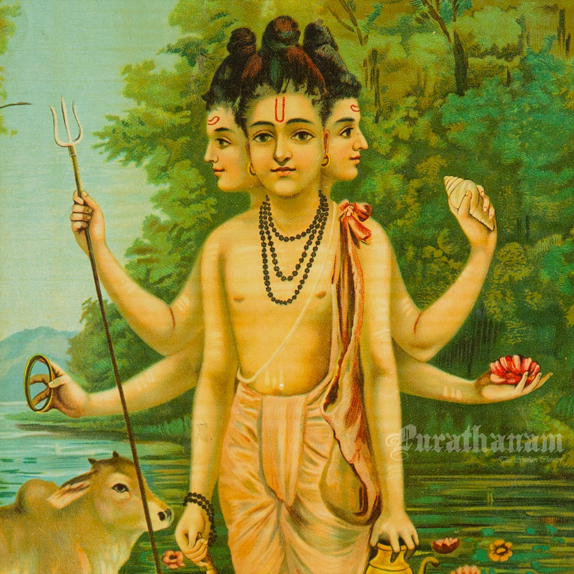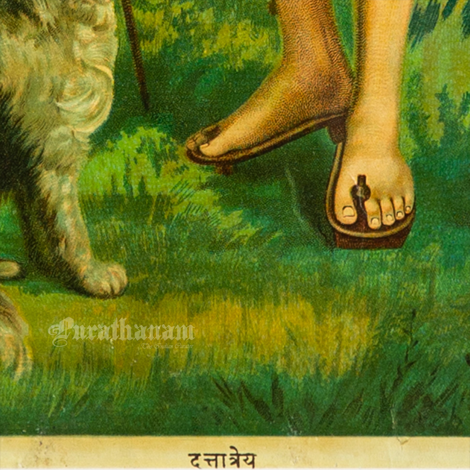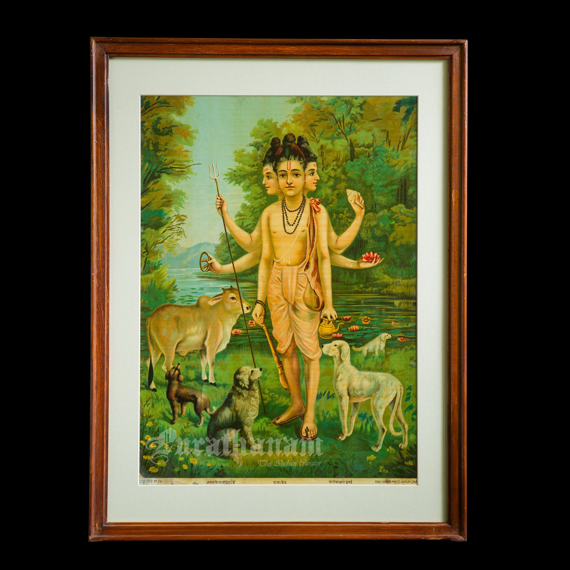 This is an oleograph print from 1920s of Duttatreya by Ravi Varma an Indian who achieved recognition for his depiction of scenes from the epics of the Mahabharata and Ramayana.