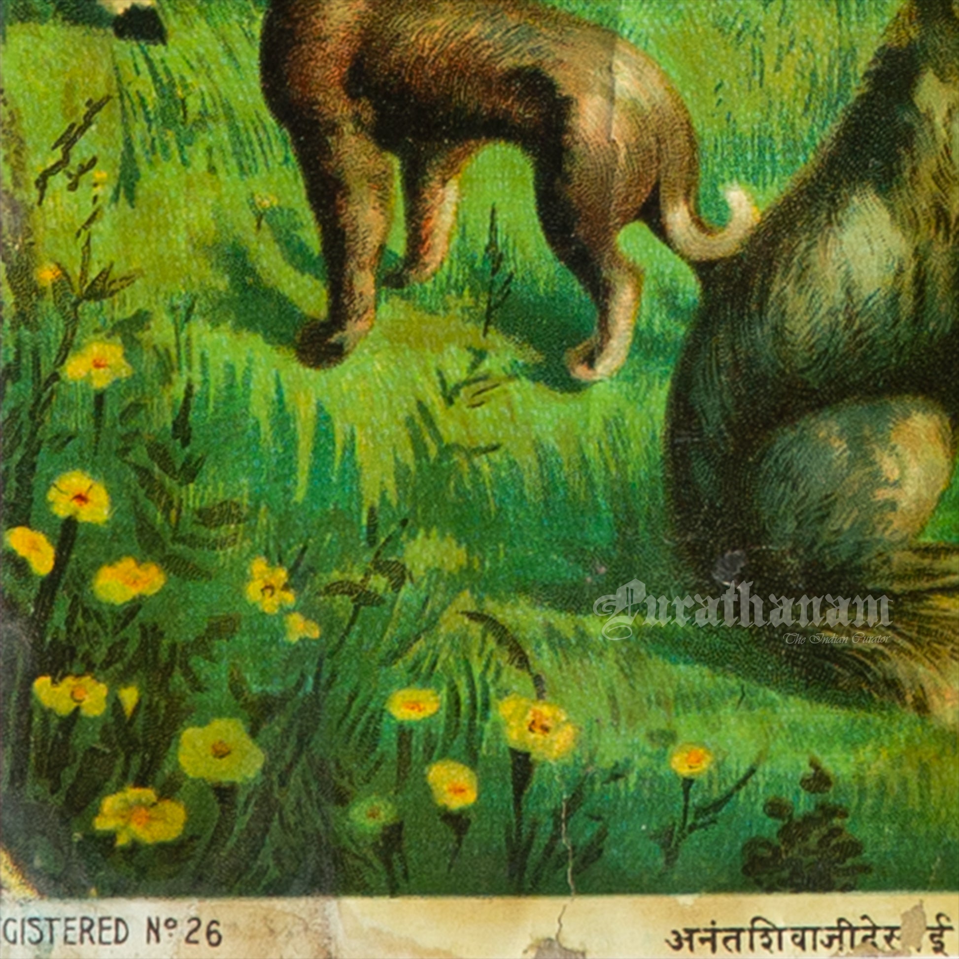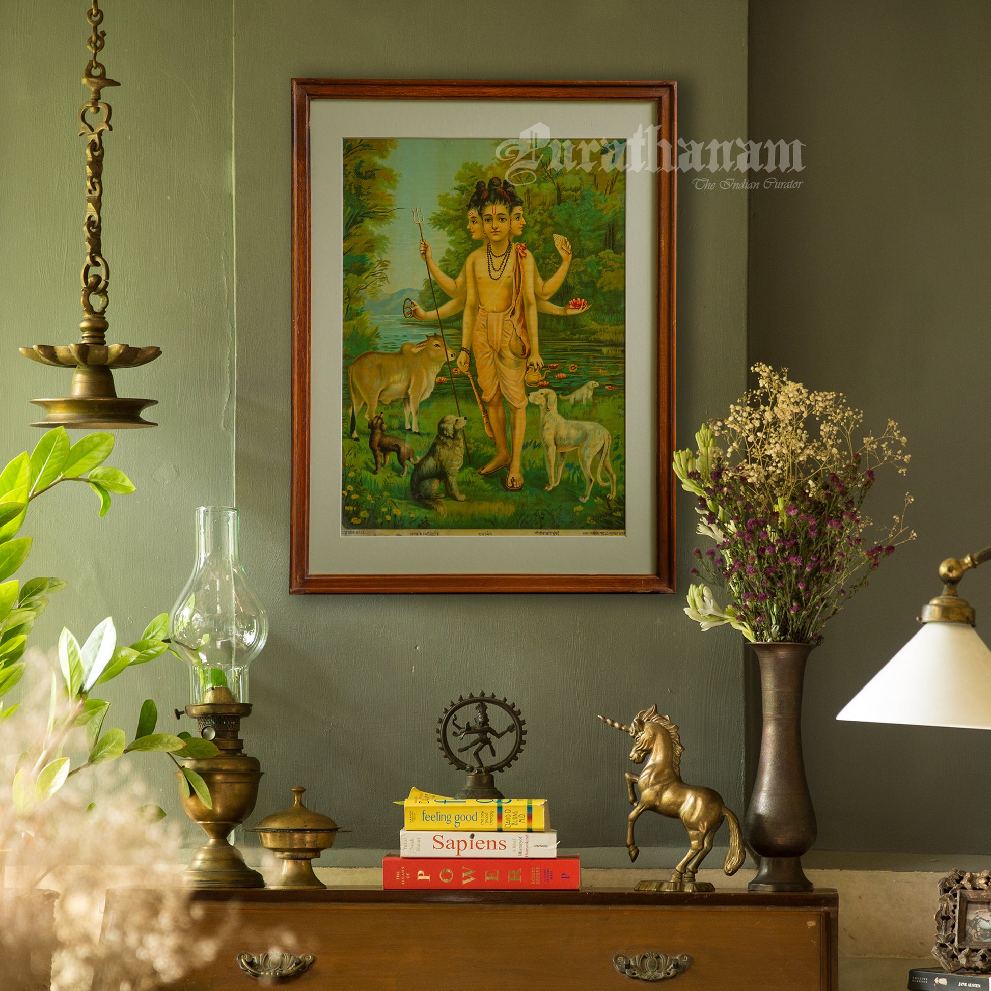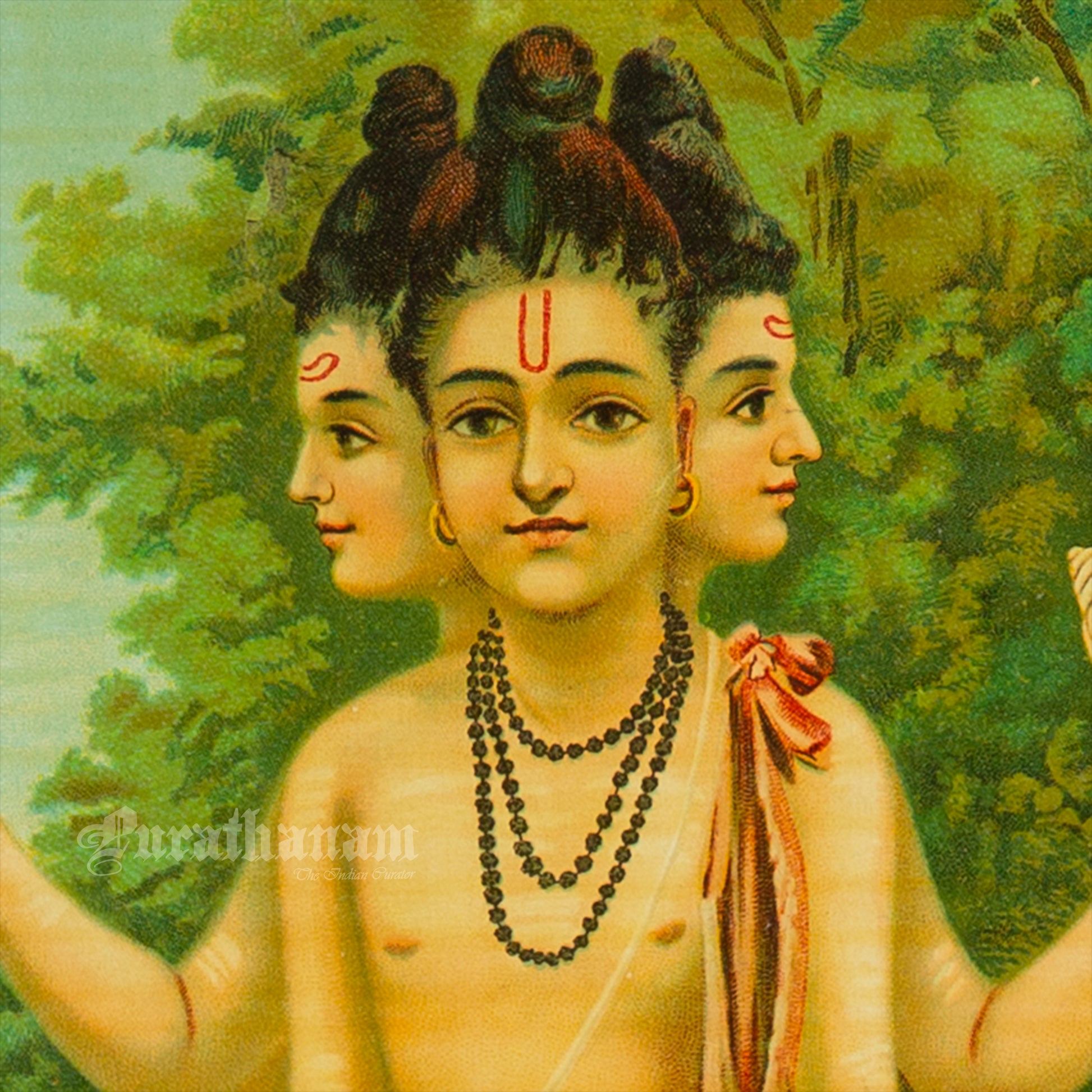 This is an oleograph print from 1920s of Duttatreya by Ravi Varma an Indian who achieved recognition for his depiction of scenes from the epics of the Mahabharata and Ramayana.