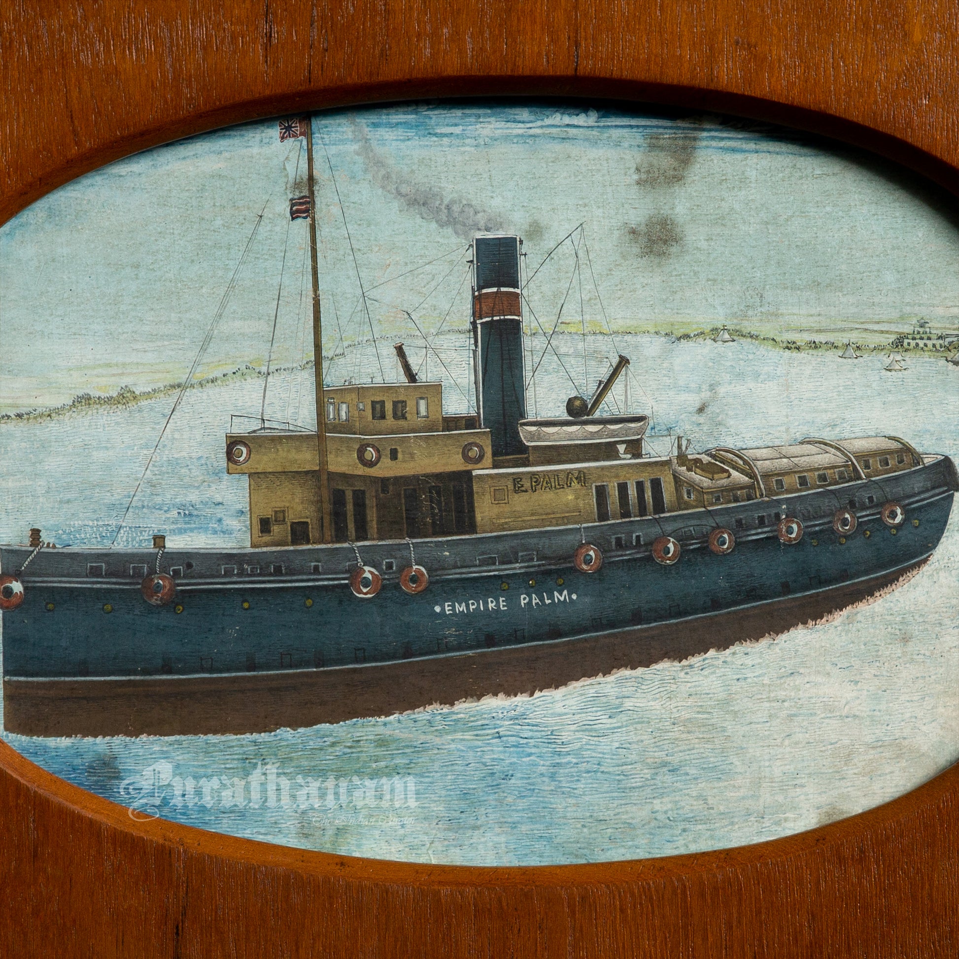 This framed watercolor painting, titled “Empire Palm-Ship”, evokes the maritime spirit of 1940s Britain, a time when naval power was both a symbol of national pride and a lifeline during global conflict.