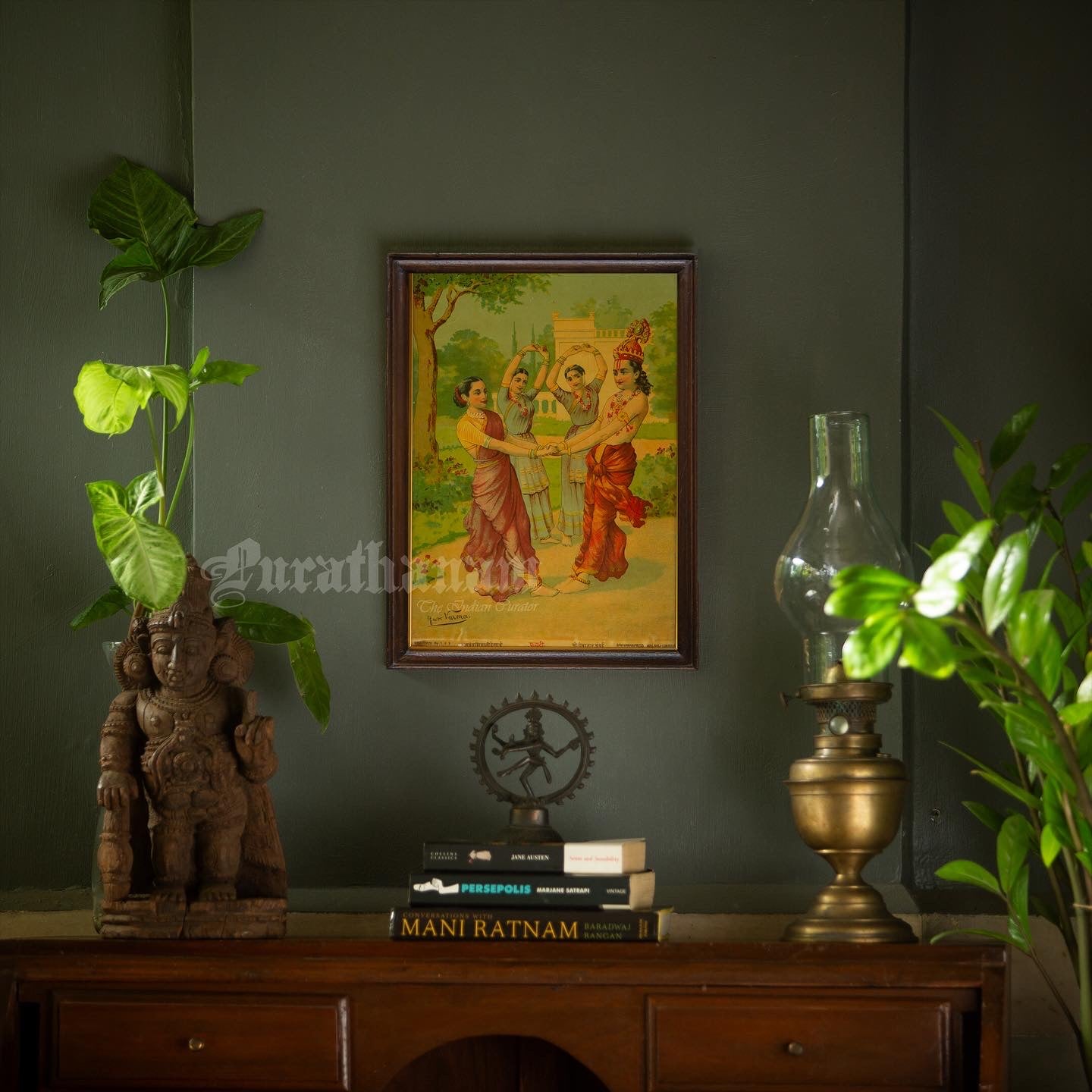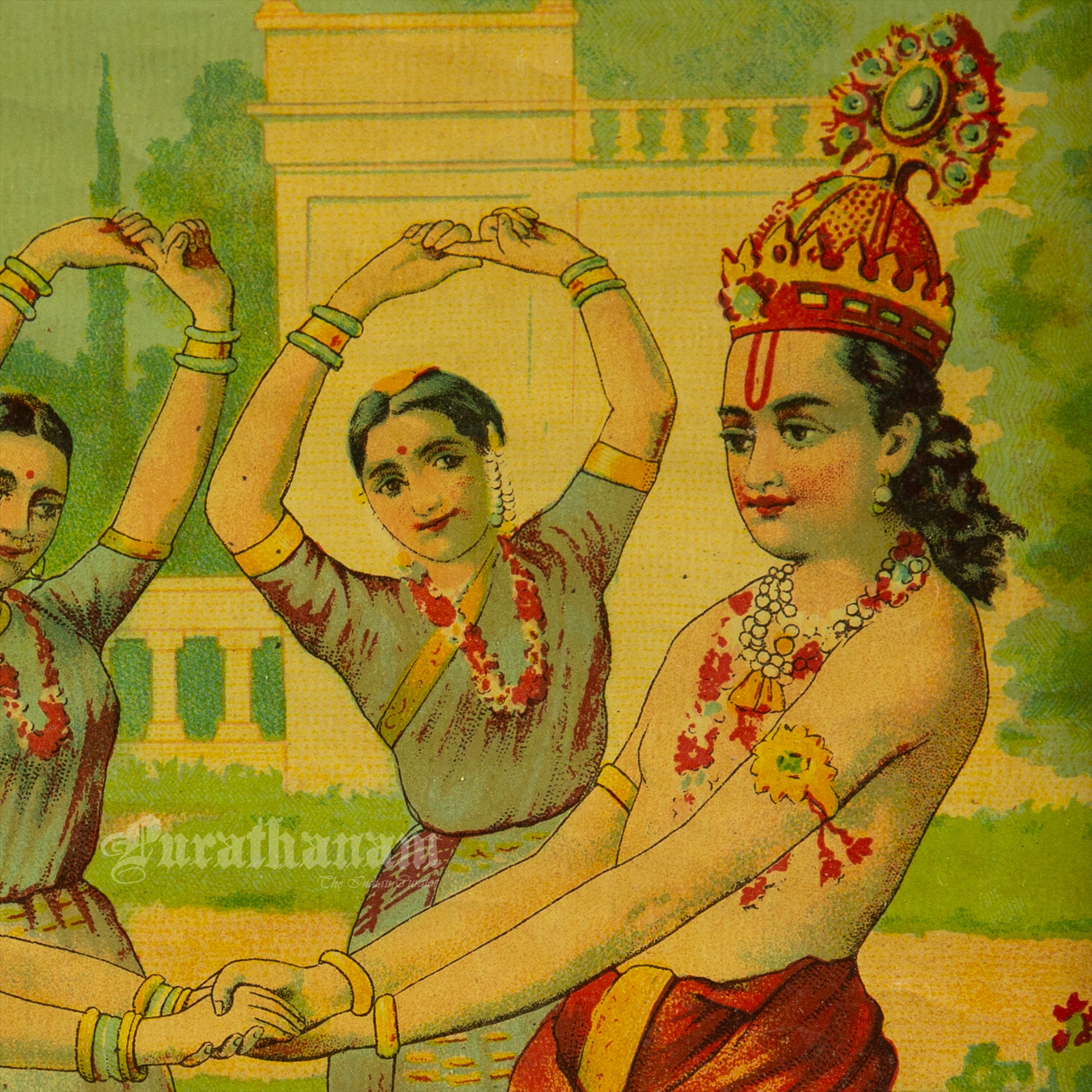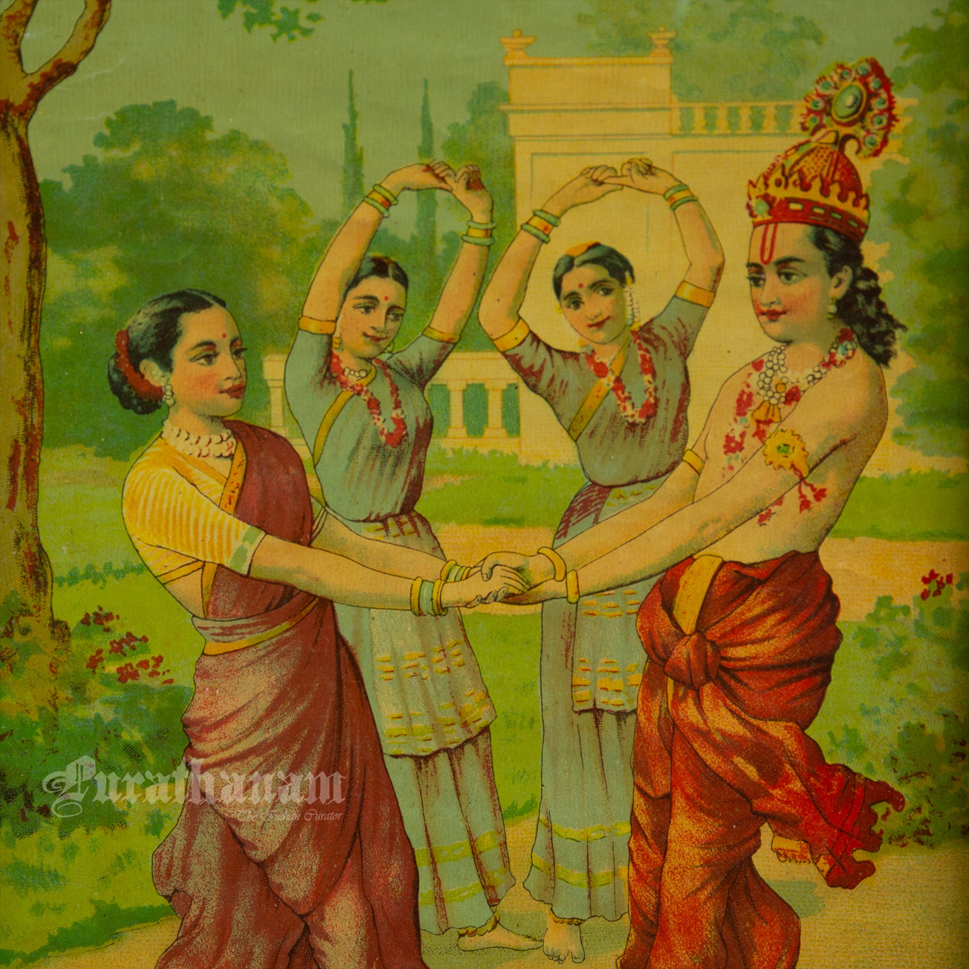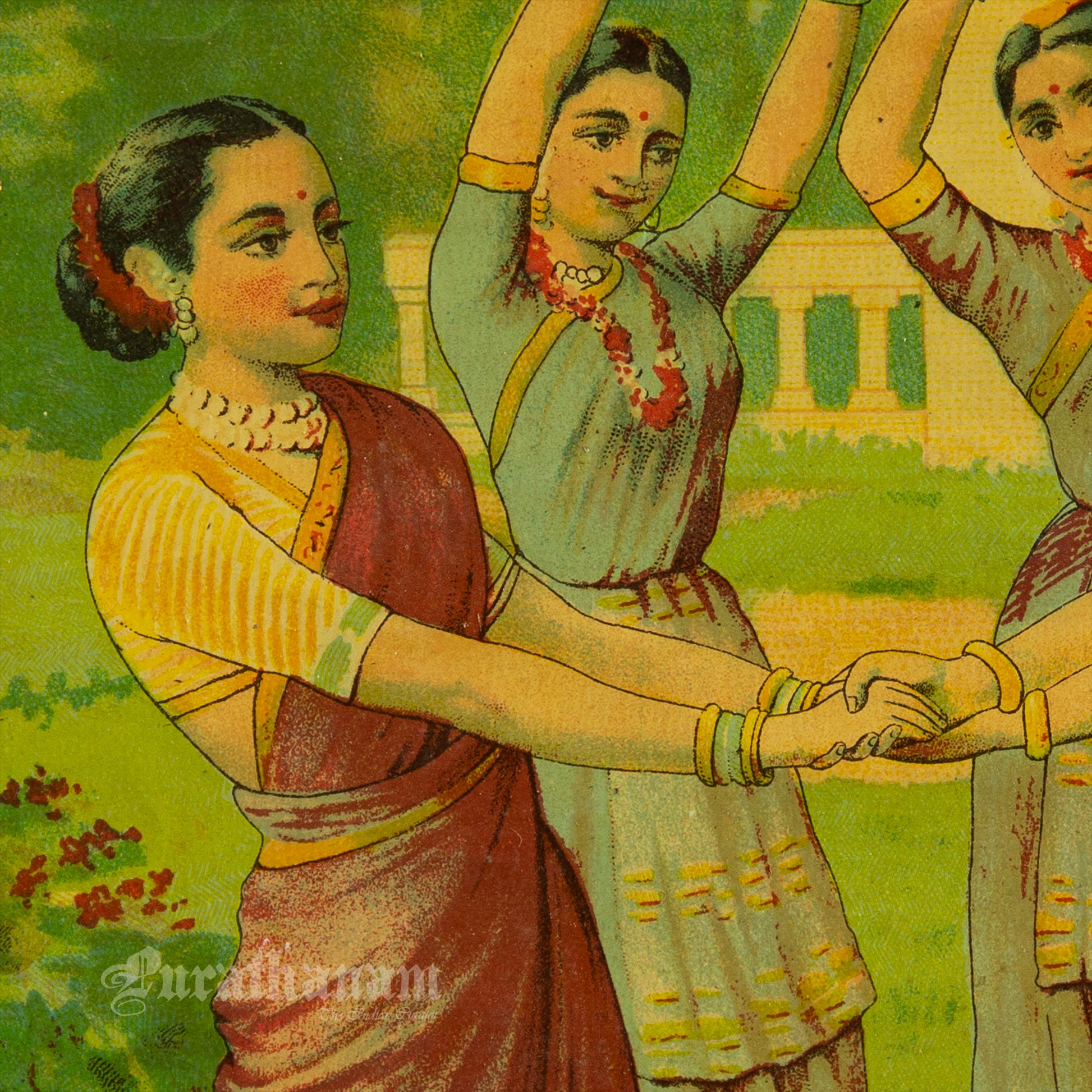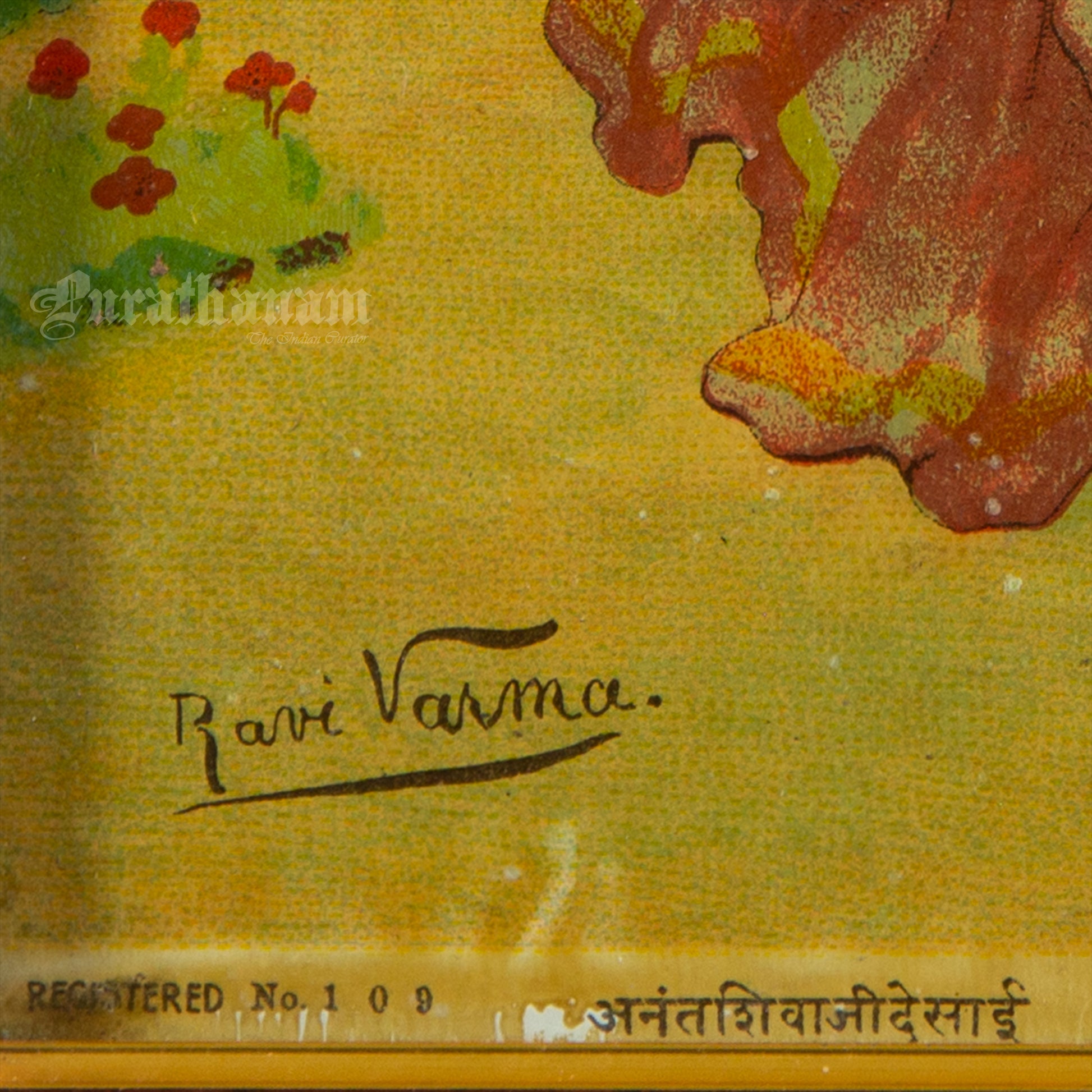 This is an oleograph print from 1920s of Fugadi by Ravi Varma an Indian who achieved recognition for his depiction of scenes from the epics of the Mahabharata and Ramayana.