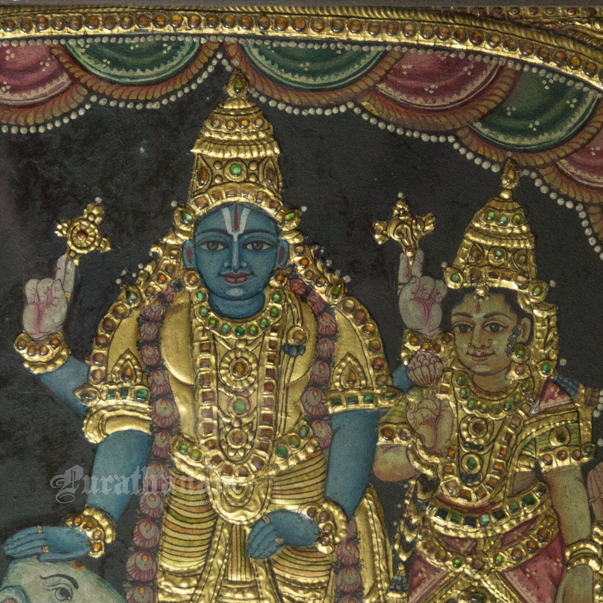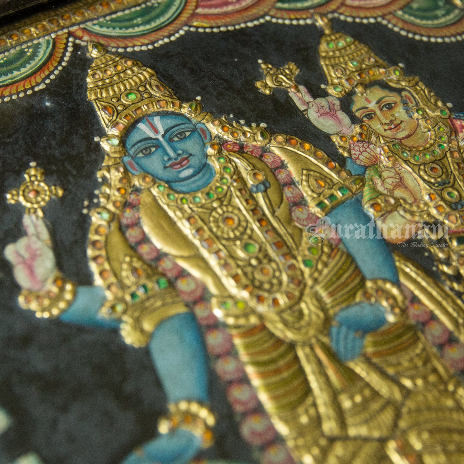- Natural Colors: The color medium used in early Tanjavur paintings was made from organic vegetable dyes, resulting in lighter shades compared to modern-day Tanjore paintings. These natural colors were not affected by light exposure at the time, as the paintings were mostly kept indoors and lit by dim traditional lamps. However, with the invention of electricity and the use of brighter lighting, it became harder for these colors to survive over time.