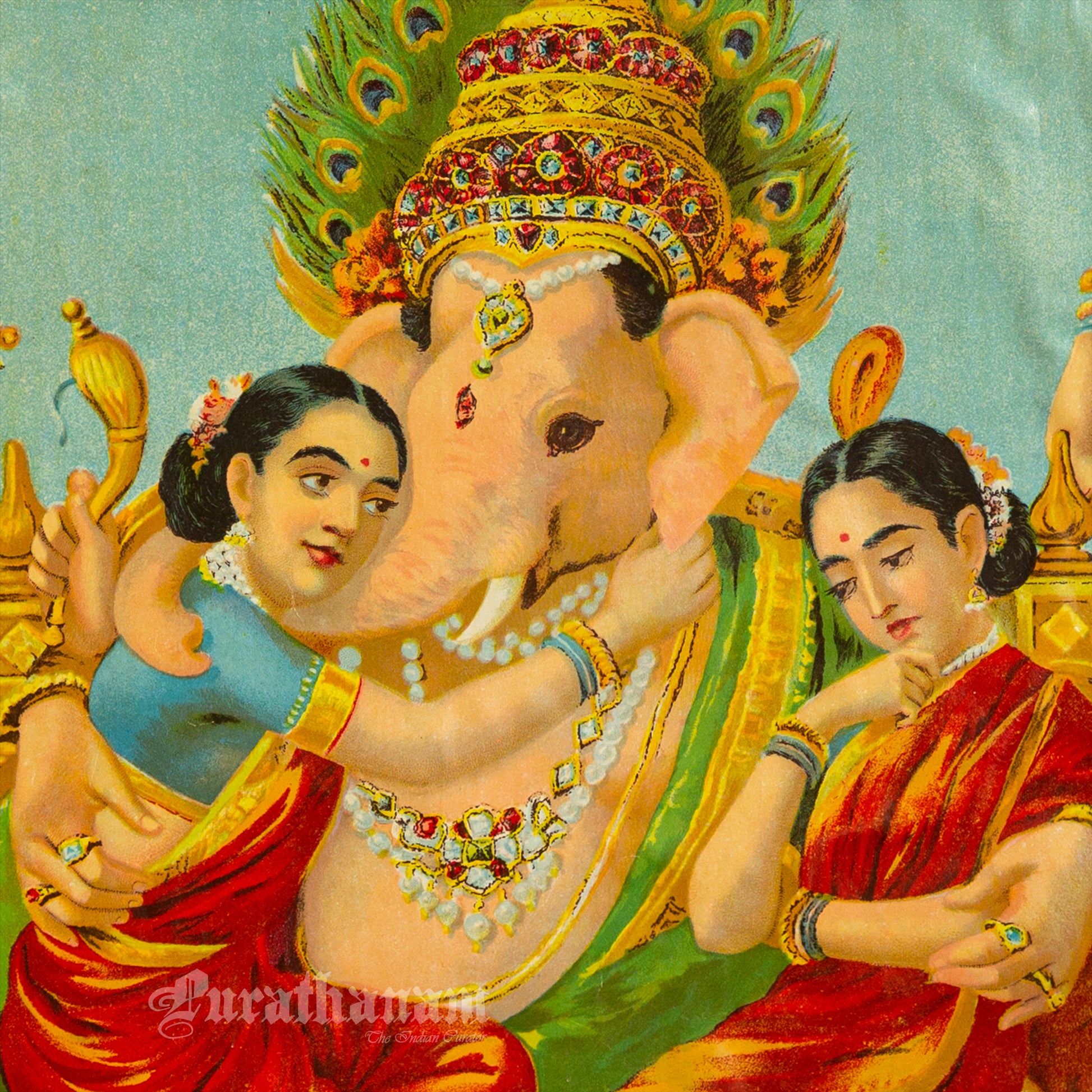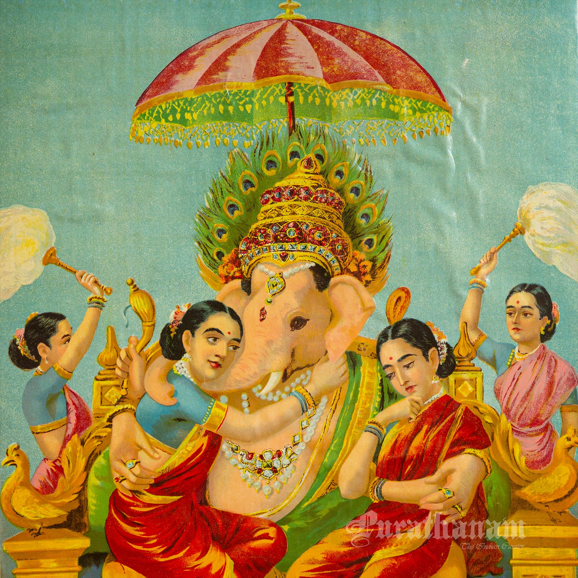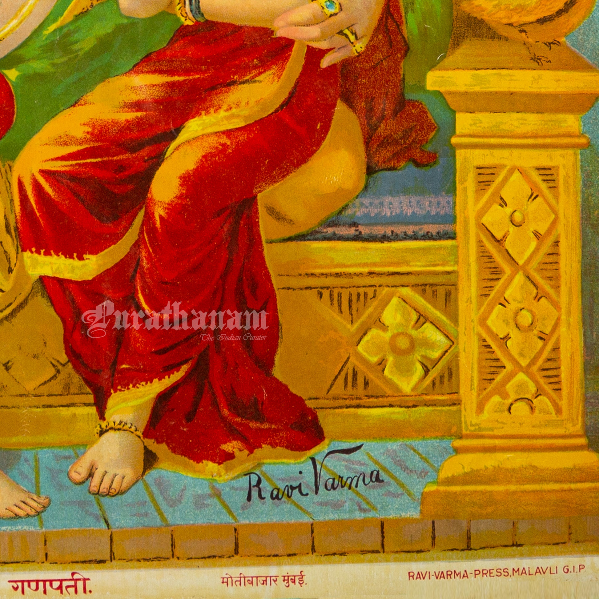 This is an oleograph print from 1920s of Ganapati by Ravi Varma an Indian who achieved recognition for his depiction of scenes from the epics of the Mahabharata and Ramayana.
