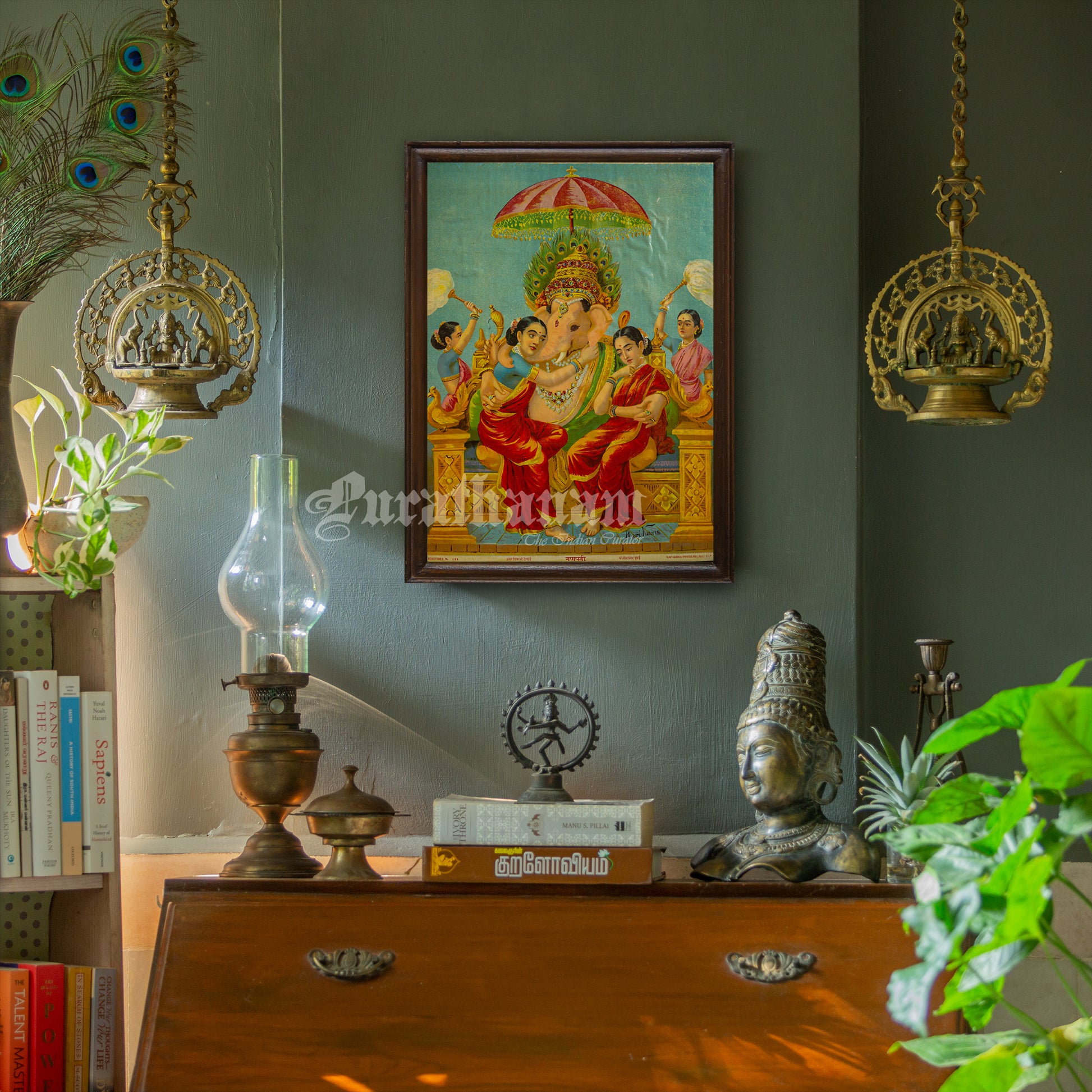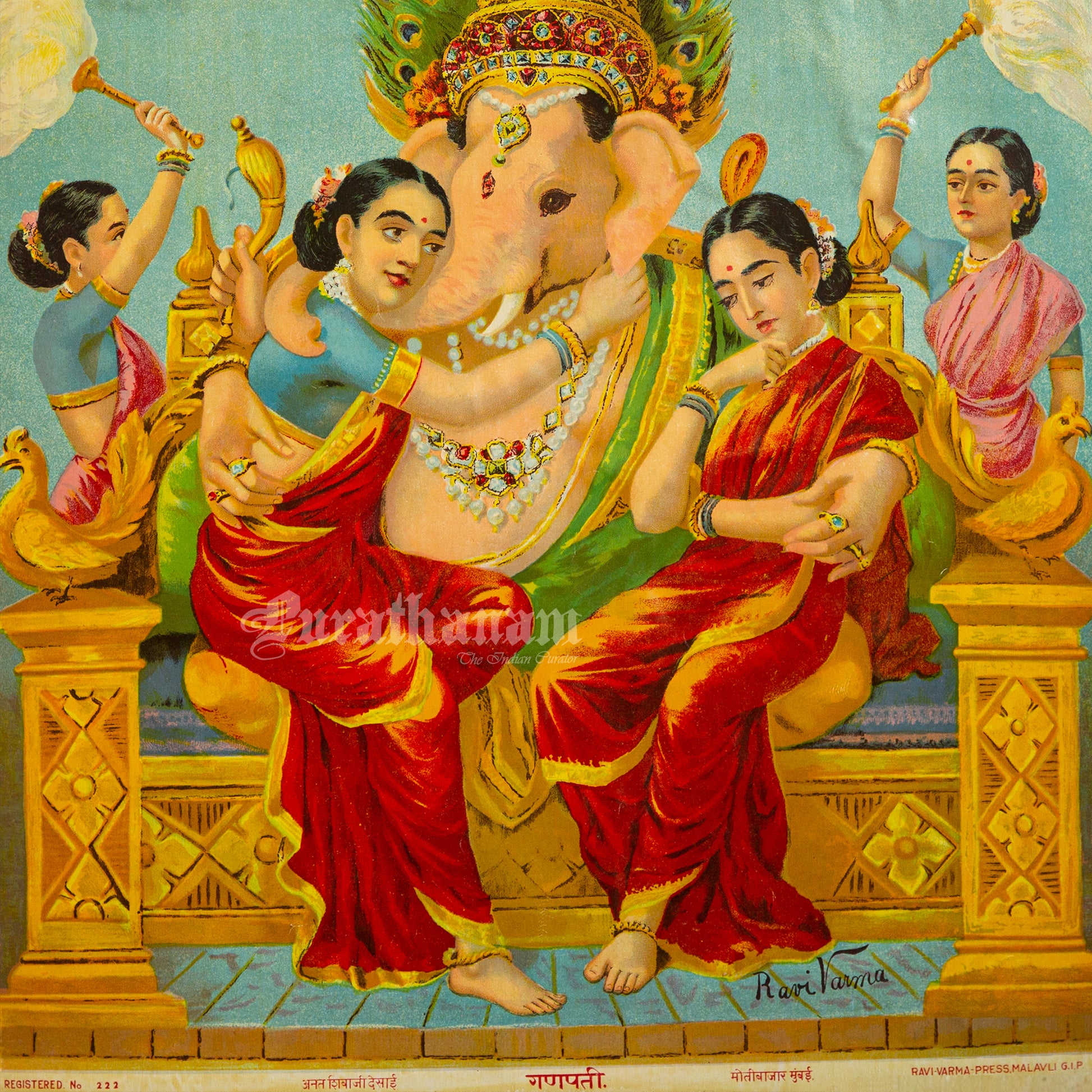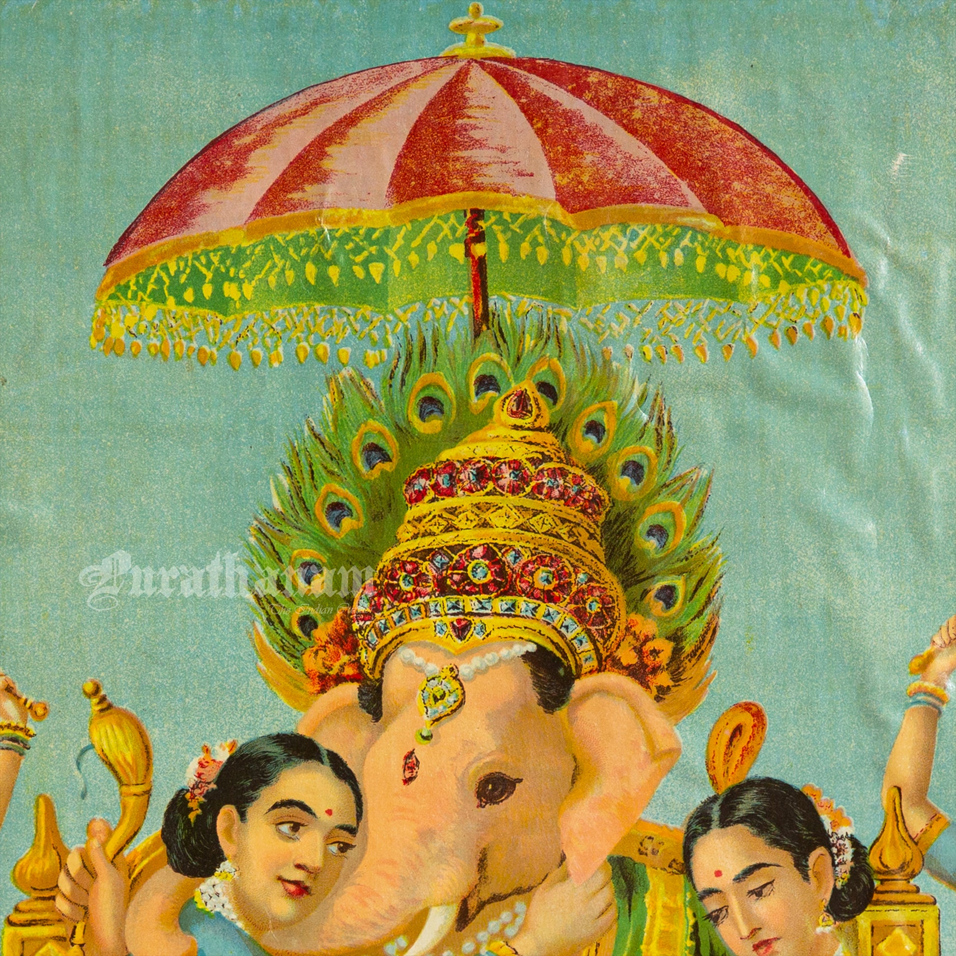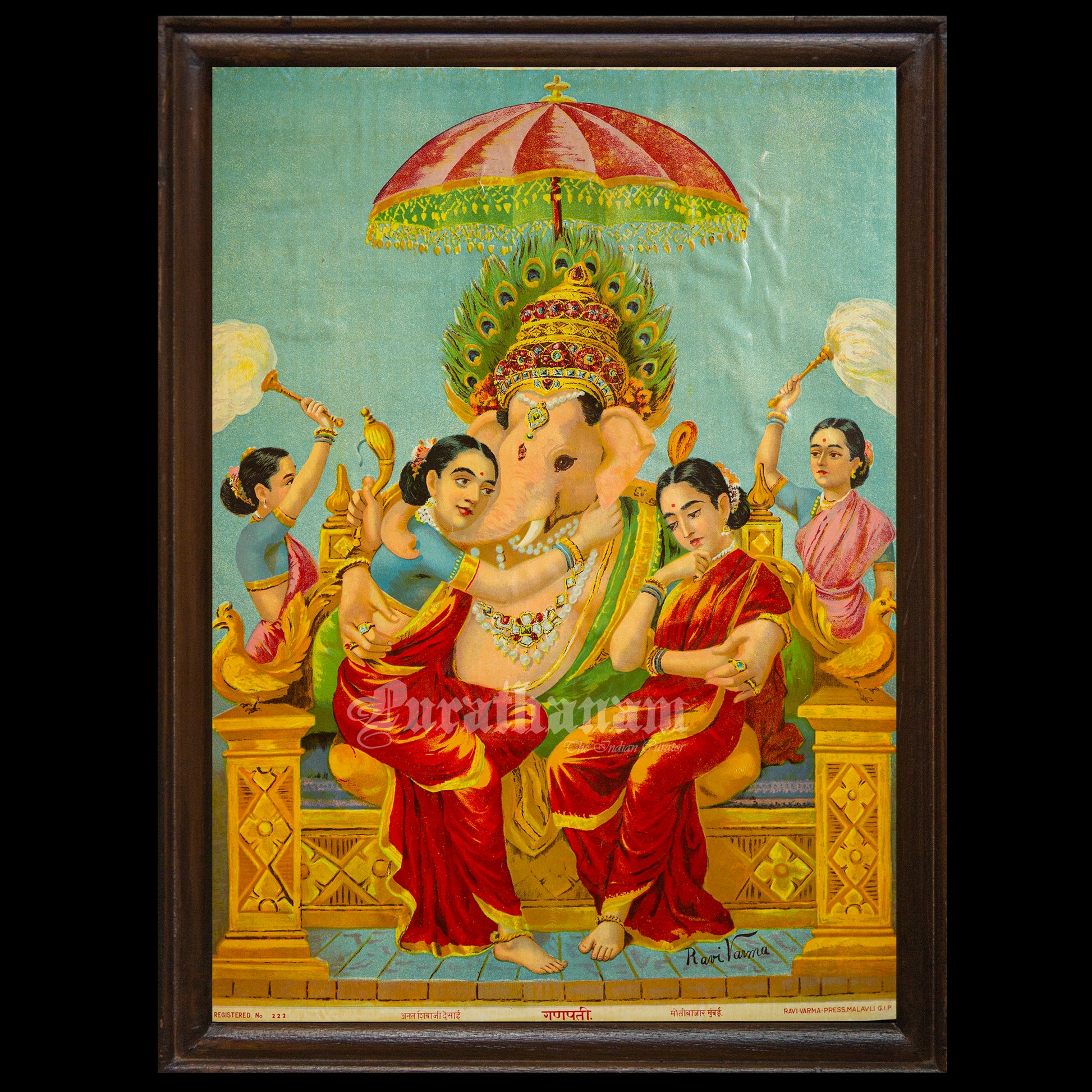 This is an oleograph print from 1920s of Ganapati by Ravi Varma an Indian who achieved recognition for his depiction of scenes from the epics of the Mahabharata and Ramayana.
