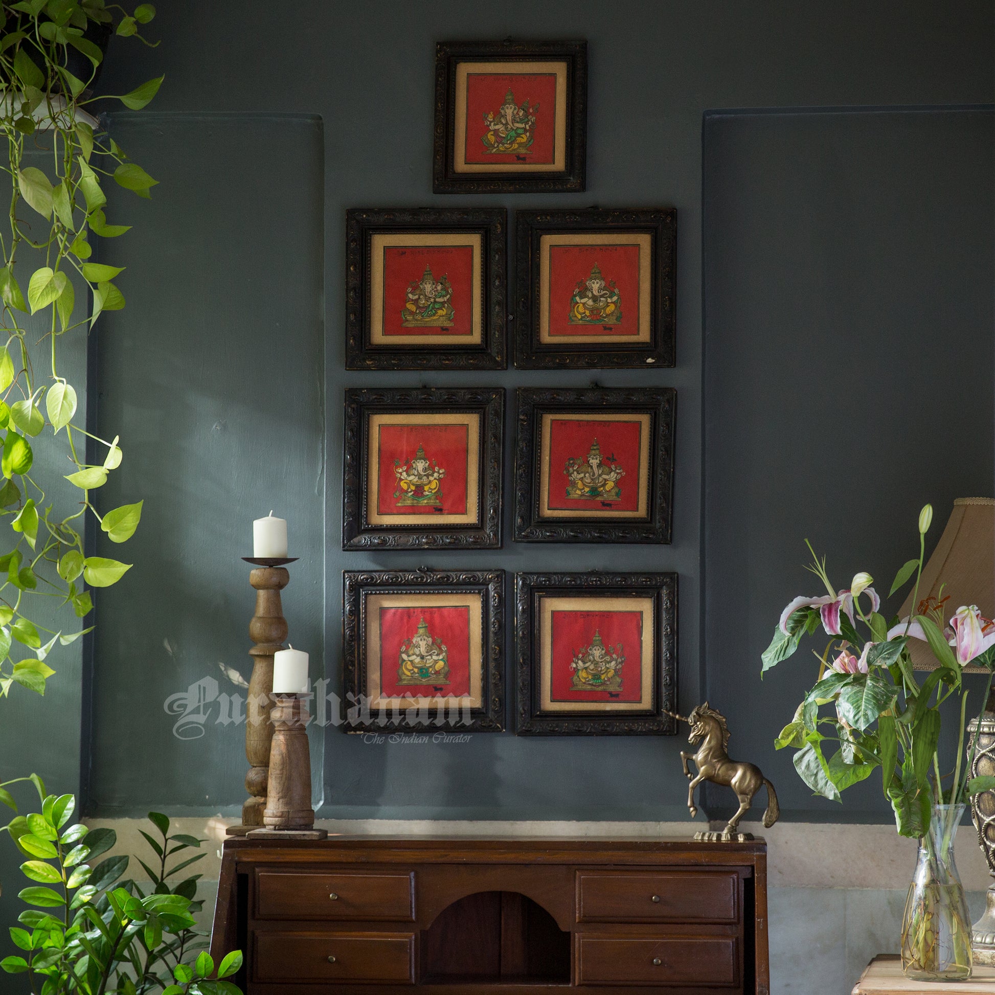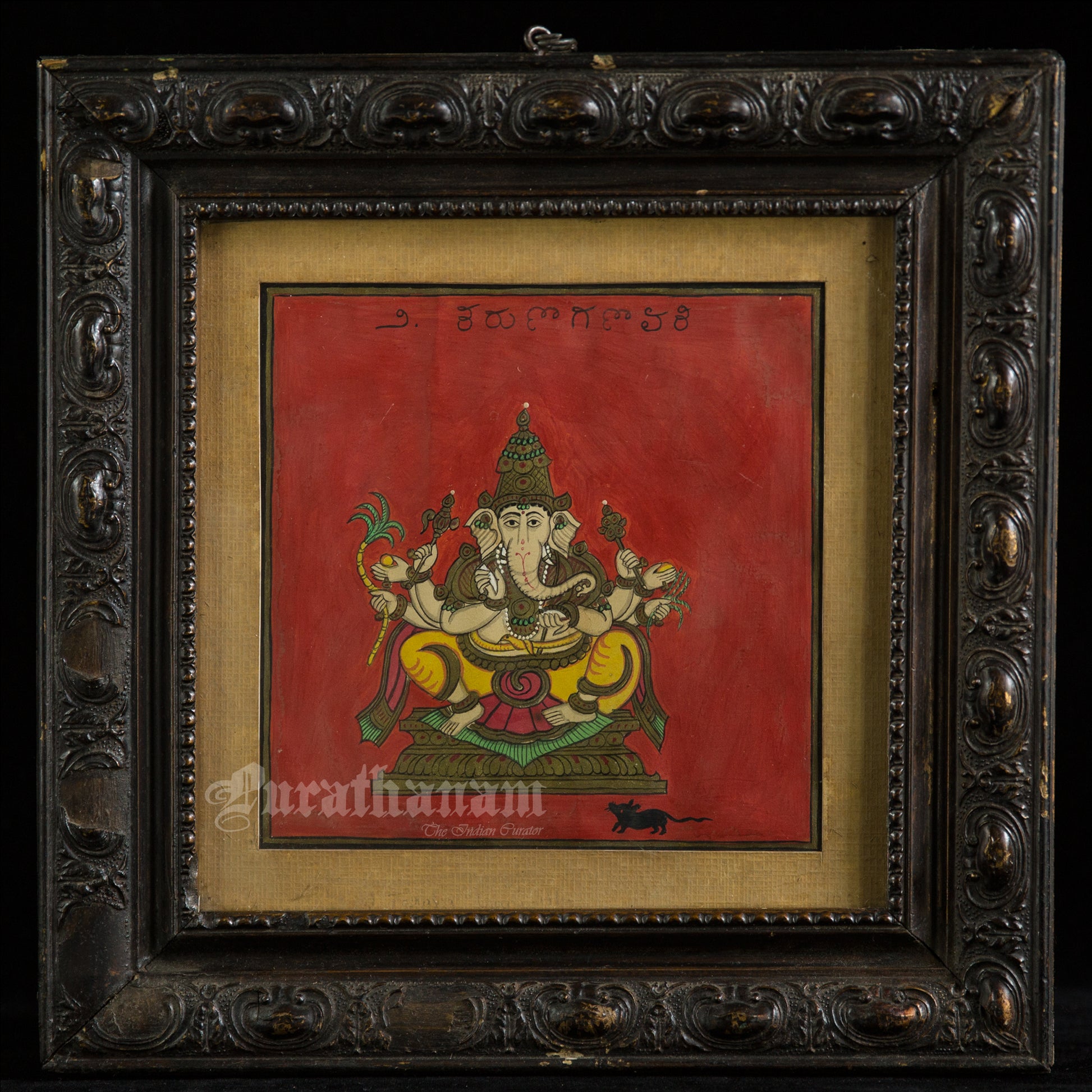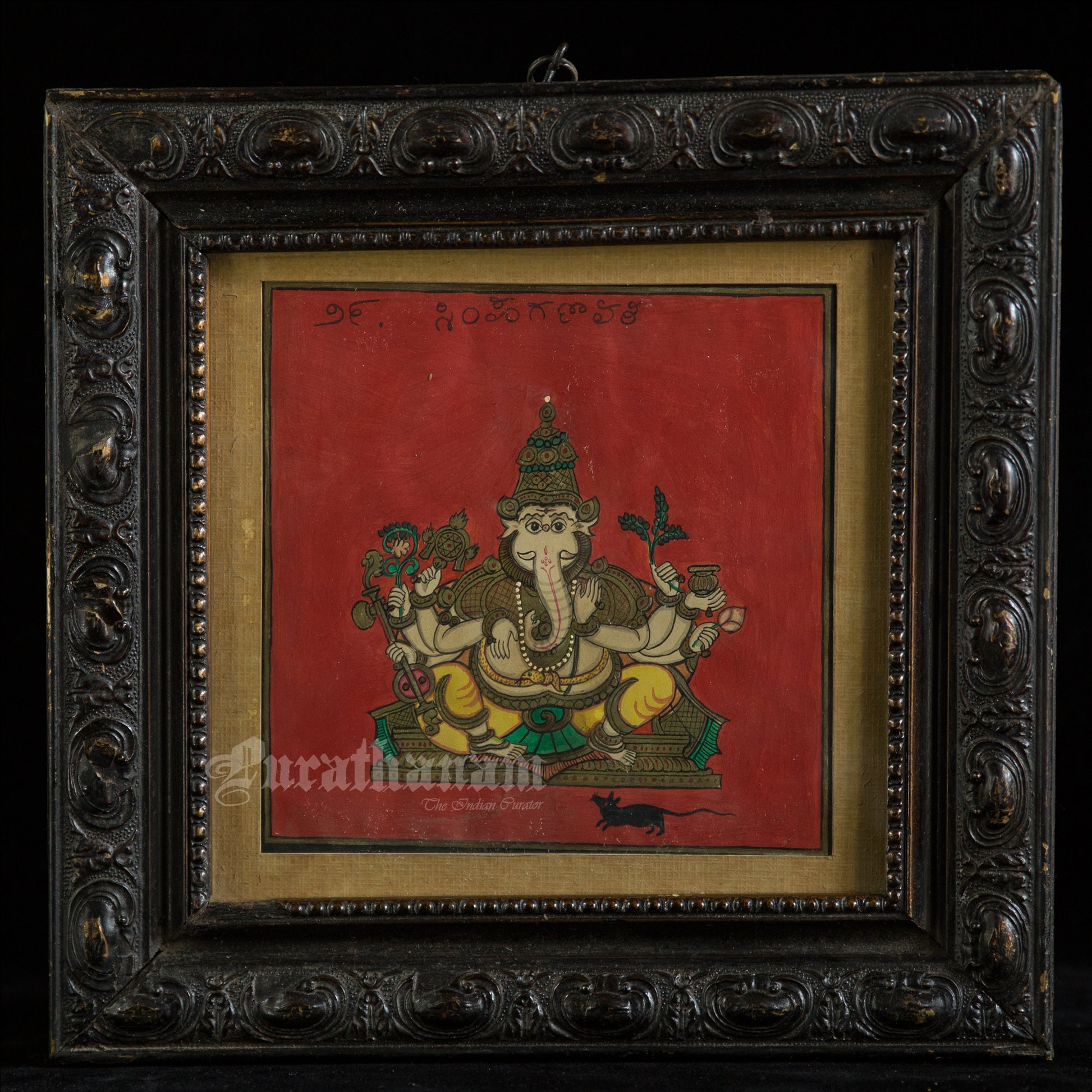 There are 32 forms of Ganesha mentioned frequently in devotional literature related to the Hindu Deity Ganesha. The Ganesha-centric scripture Mudgala Puranam is the first to list them. Here we have 7 forms of rare Ganapatis in the form of Mysore painting. These are 40 years old all the way from Mysore, India.