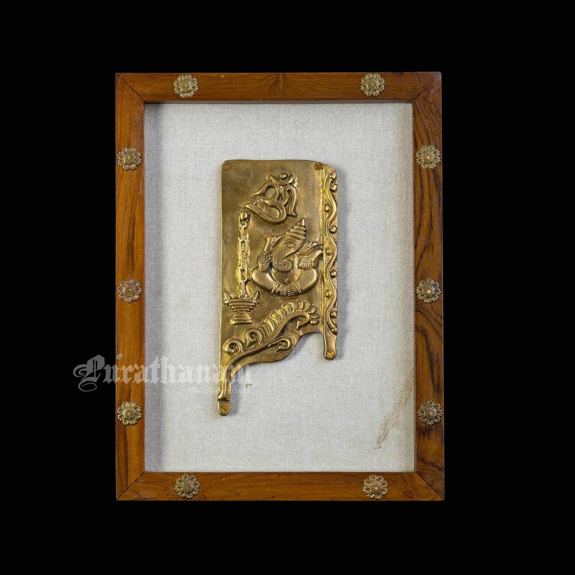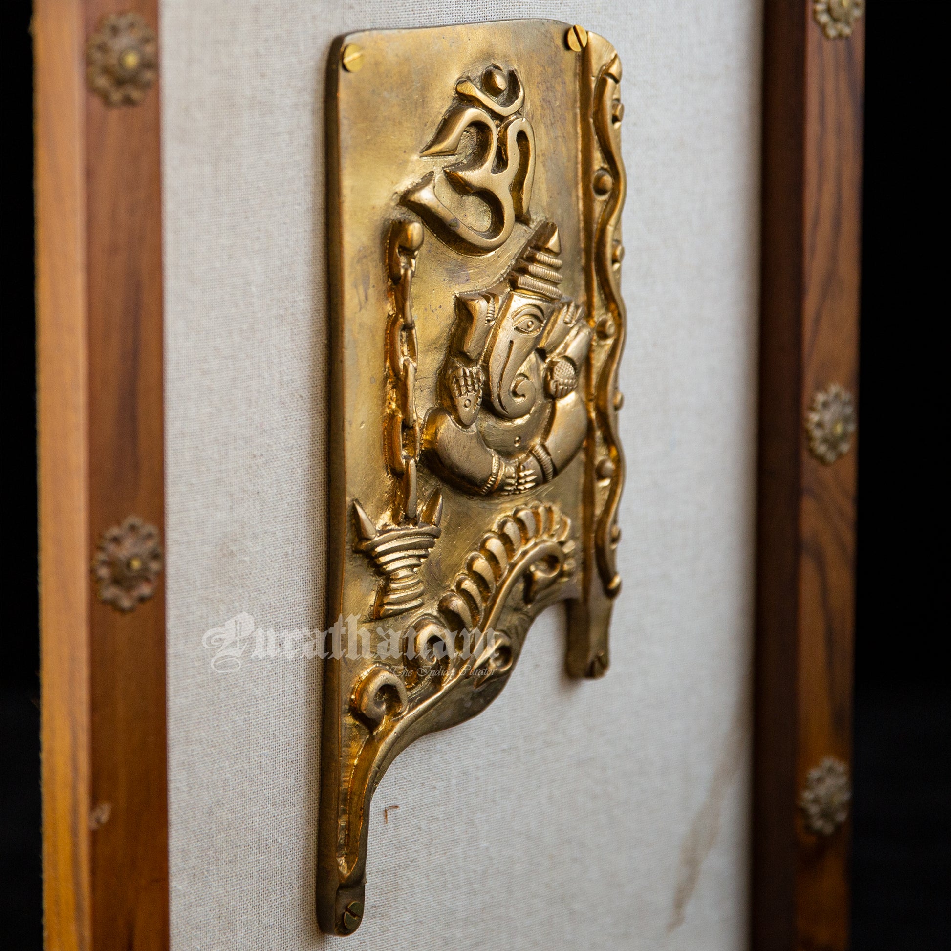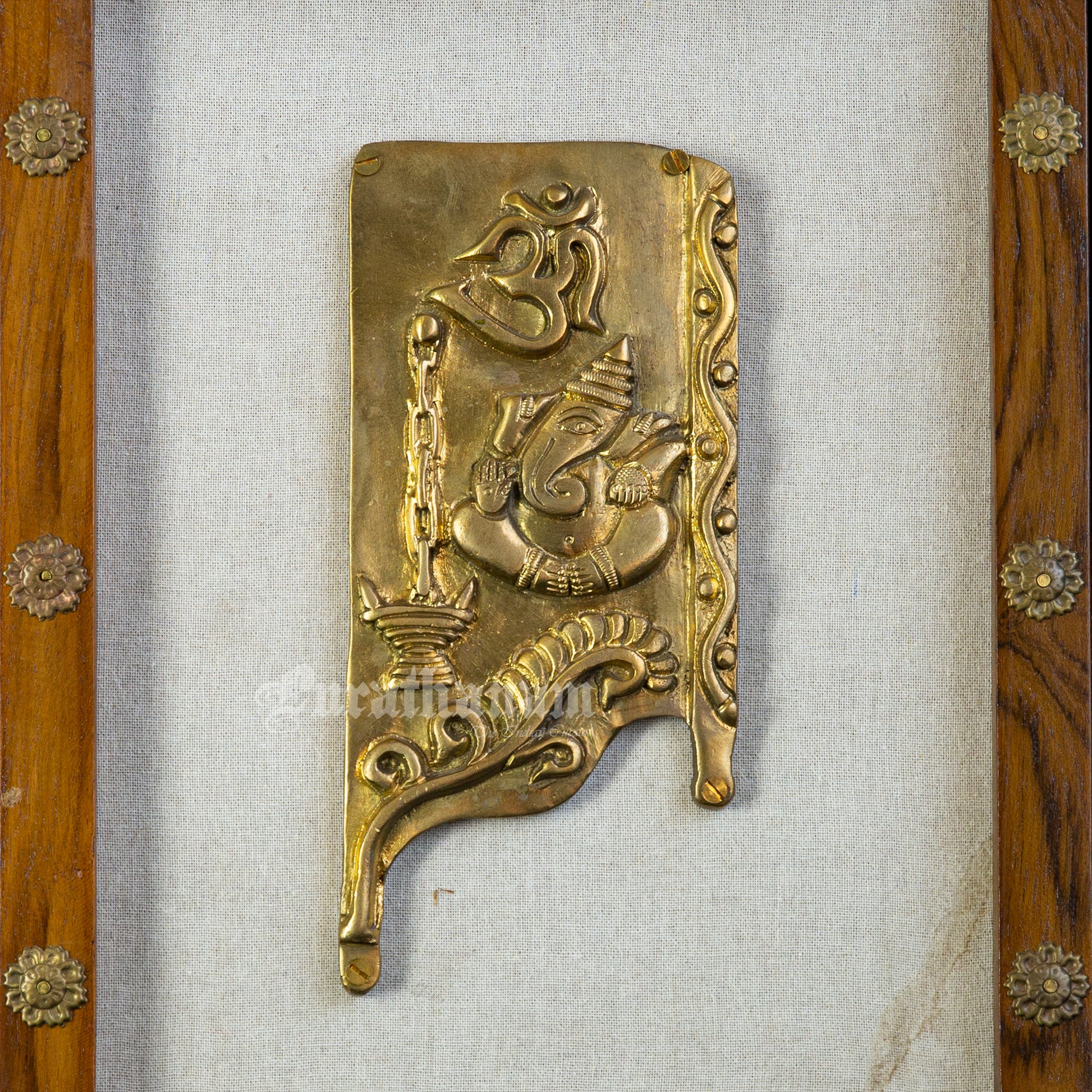 Presenting brass Ganapati affixed to a teak wooden frame.