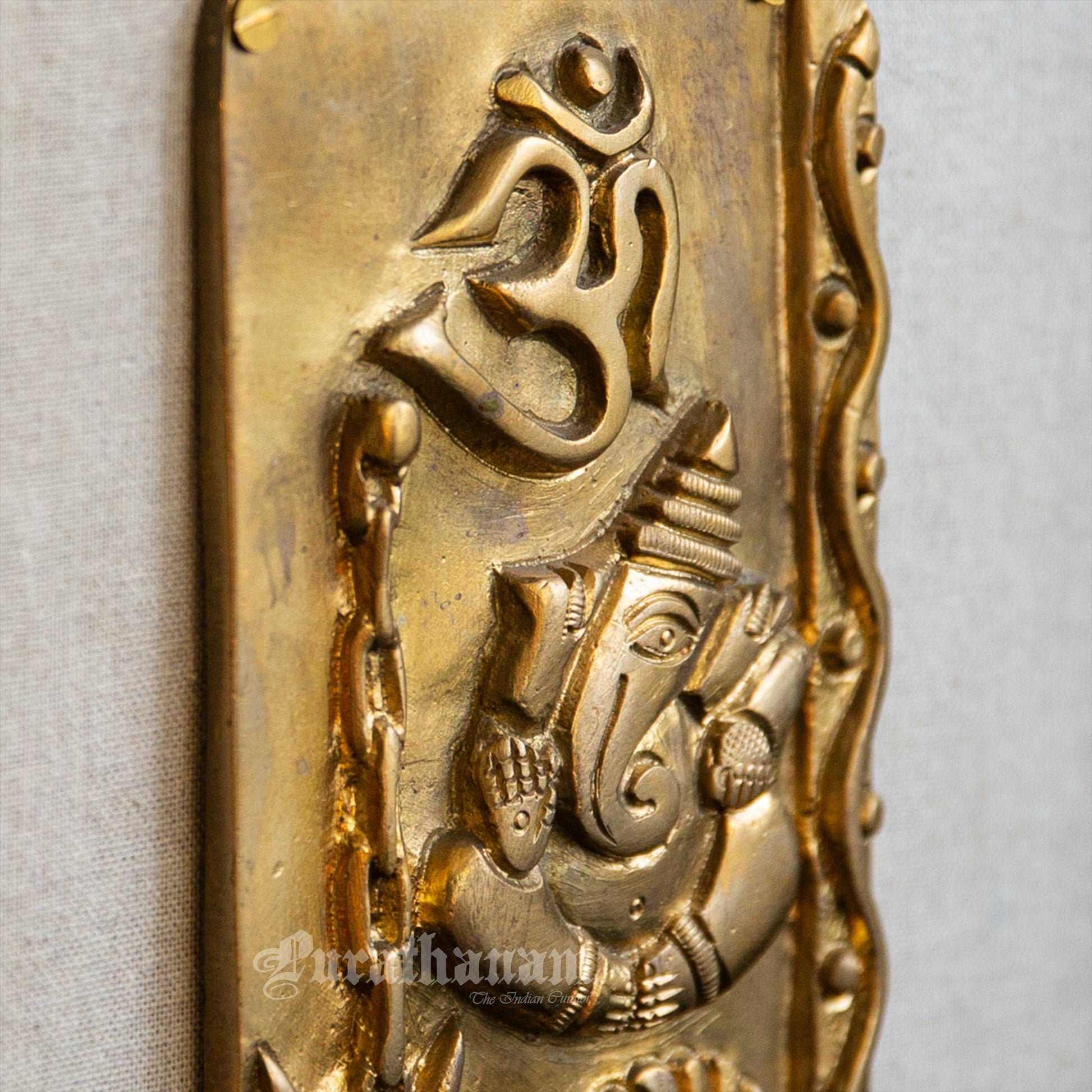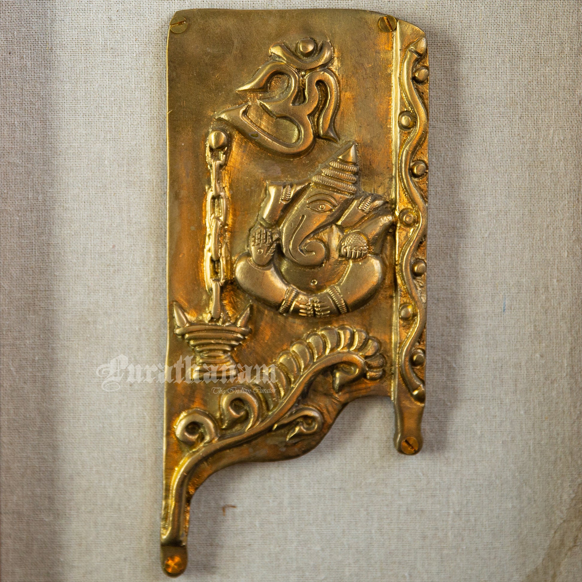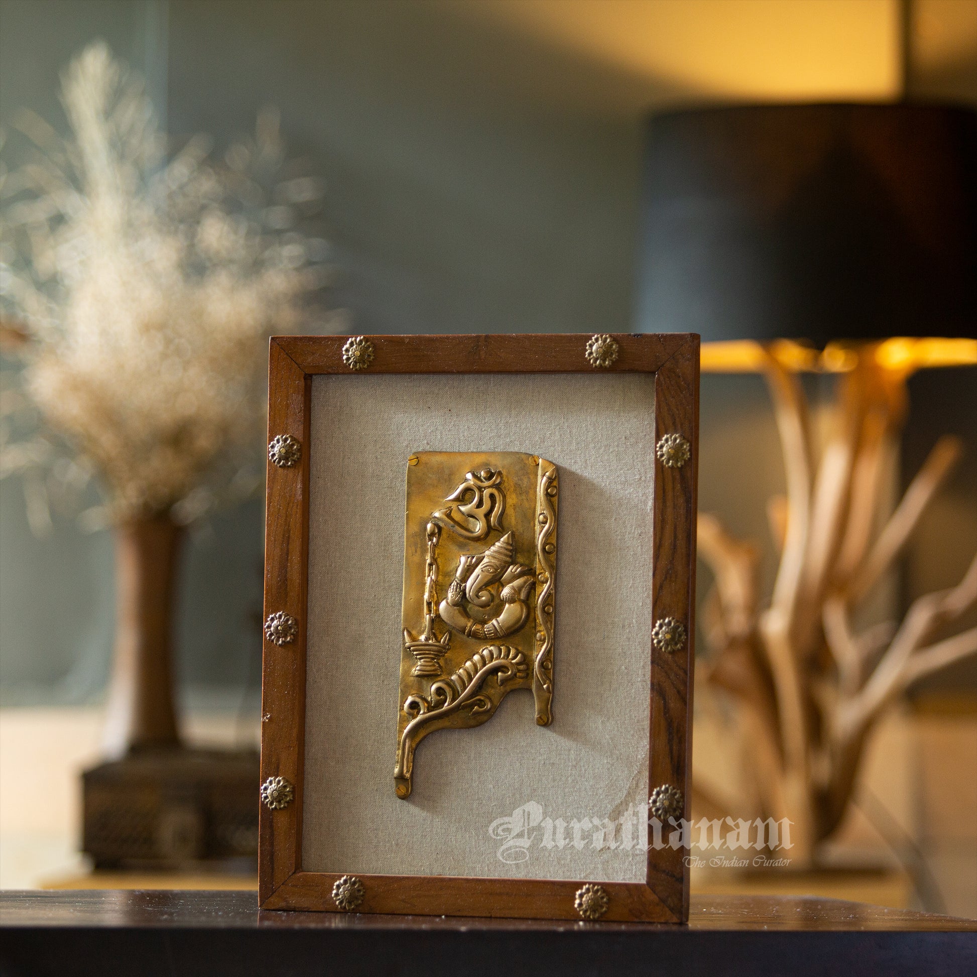 Presenting brass Ganapati affixed to a teak wooden frame.