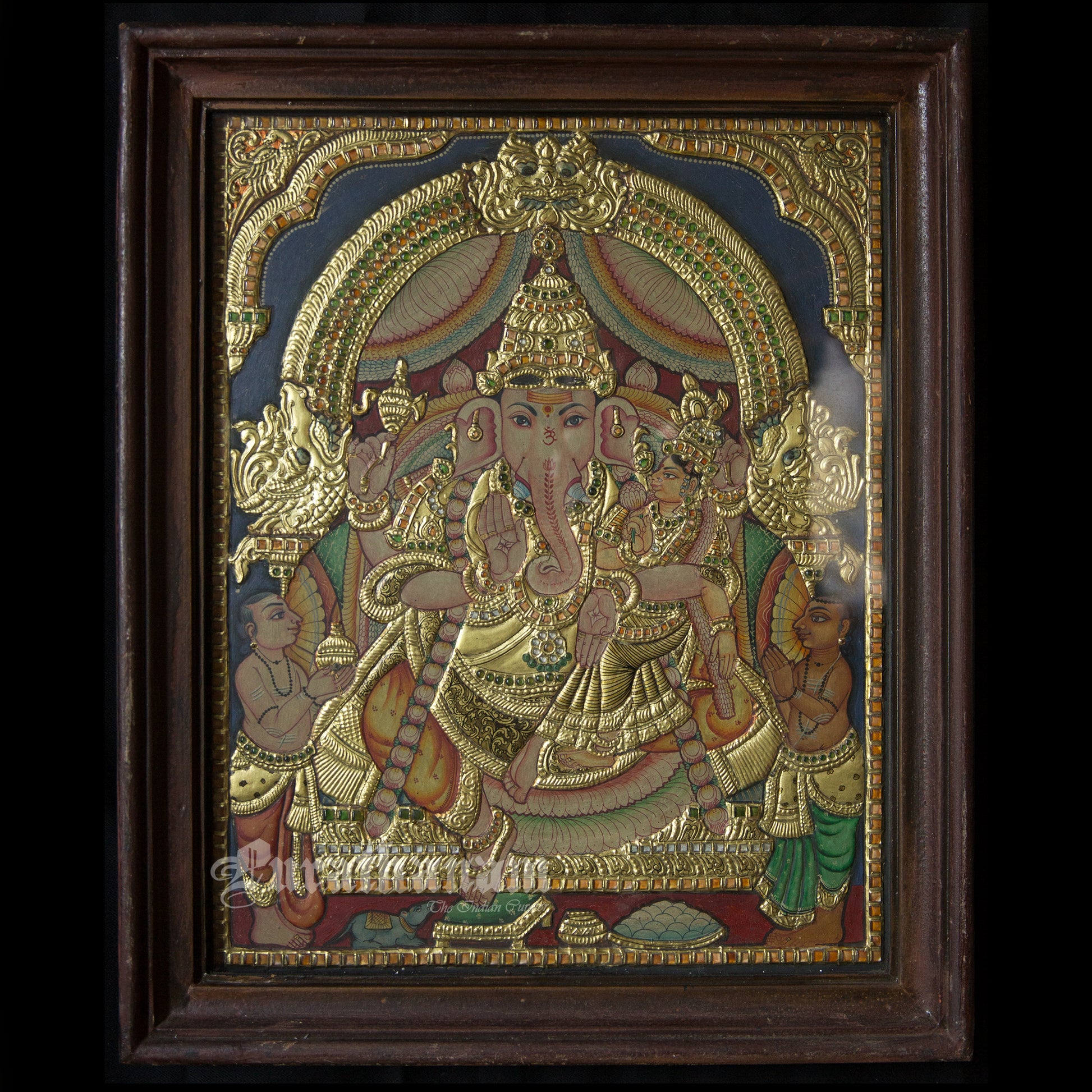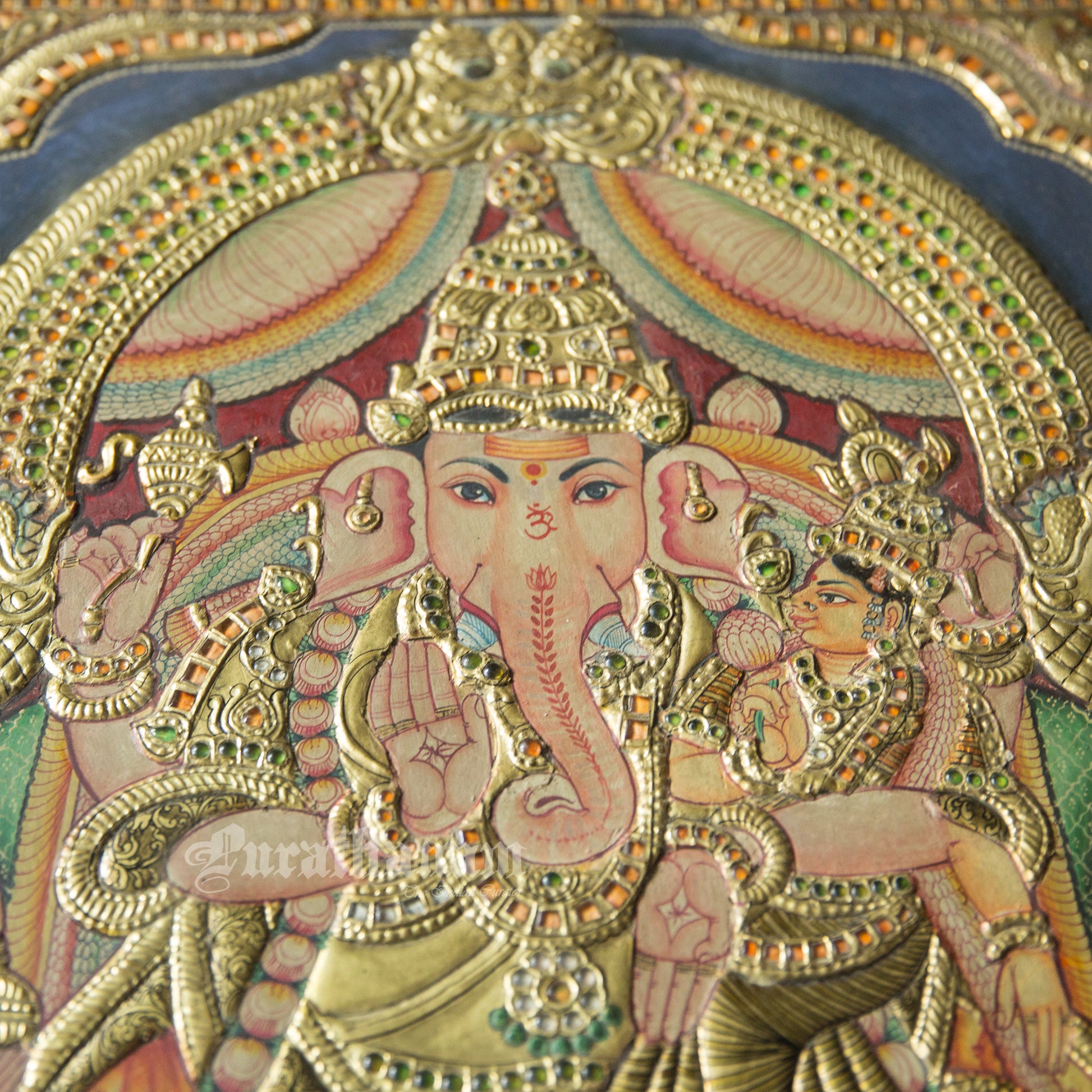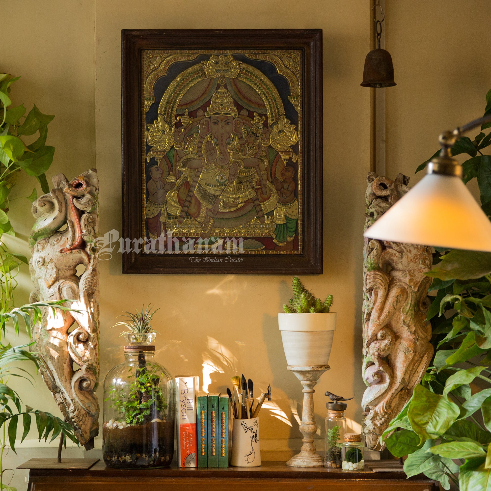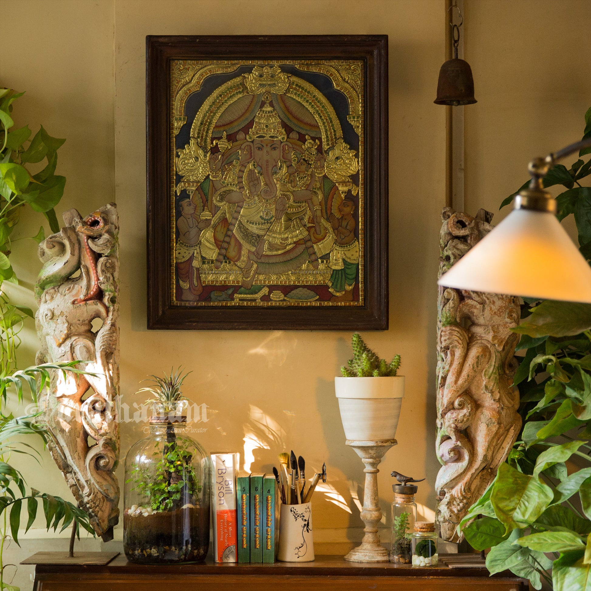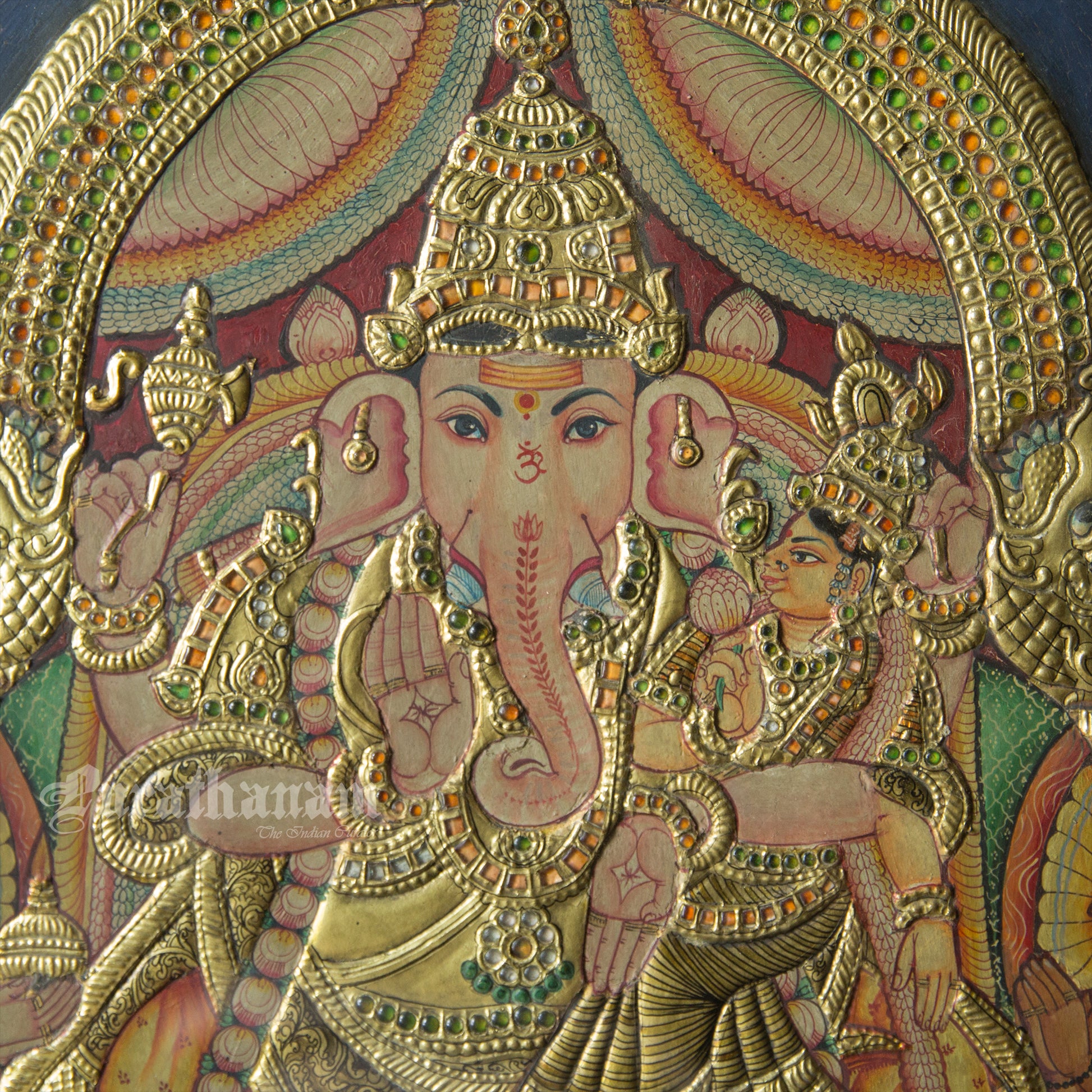 Here is a beautiful Ganapati Tanjore painting. Ganapati is called by many names like Pillayar, Ganesan and Vinayagar. As the god of beginnings, he is honored at the start of rites and ceremonies. People believe beginning of anywork under his name brings auspiciousness. That is the reason why in wedding invitations or when writing an important letter people start with a pillayar suzhi. The usage of pillaiyar suzhi is most commonly found in the state of Tamilnadu.