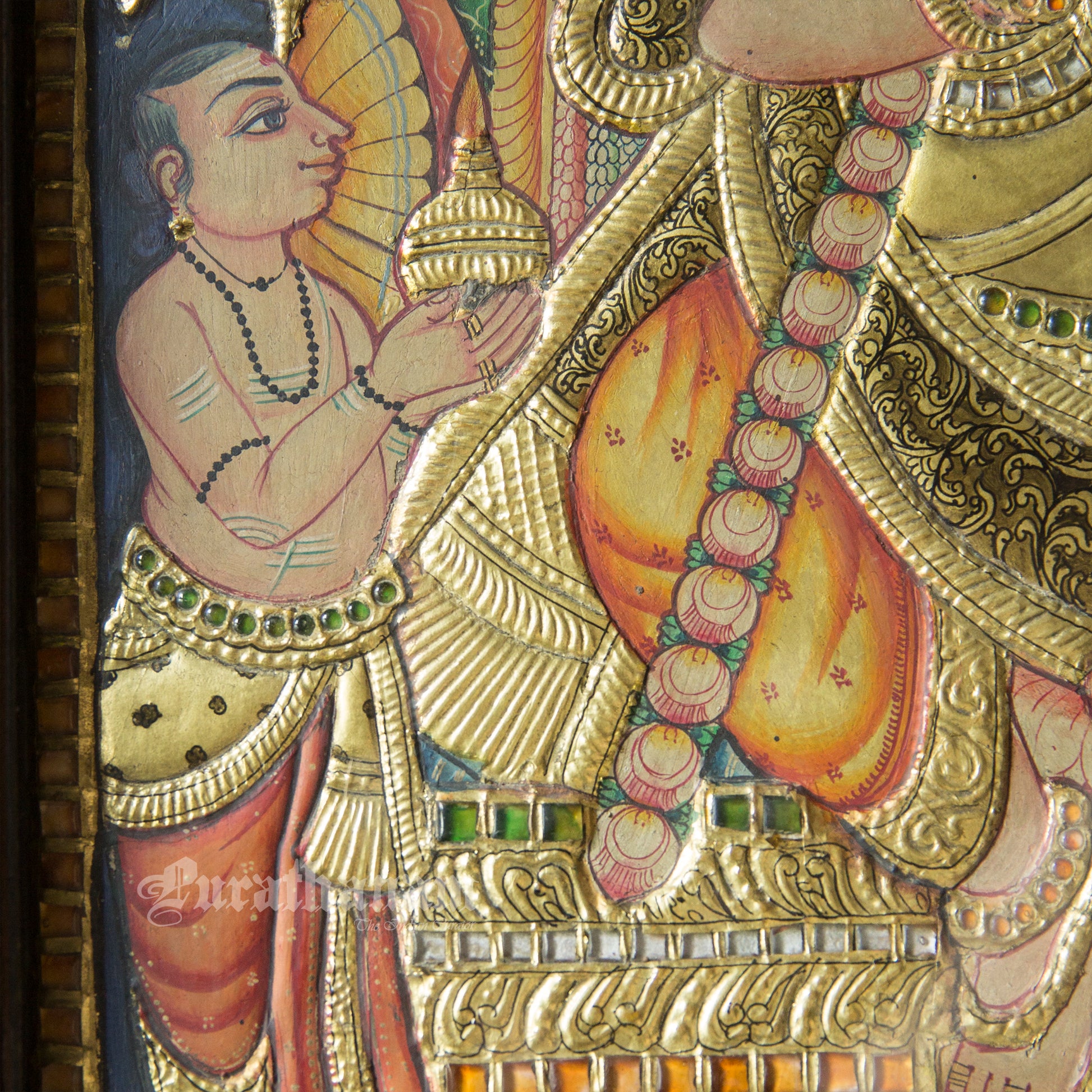 - Unsigned Artworks: Tanjore paintings were never signed by the artists. The reason often shared by the artisans is that the focus is always on the deity, not the creator. These paintings were seen as offerings or acts of devotion, dedicated completely to the gods. Since Tanjore paintings were mostly meant for temples or pooja rooms, signing them was not considered important, the divine presence in the art mattered more than personal credit.