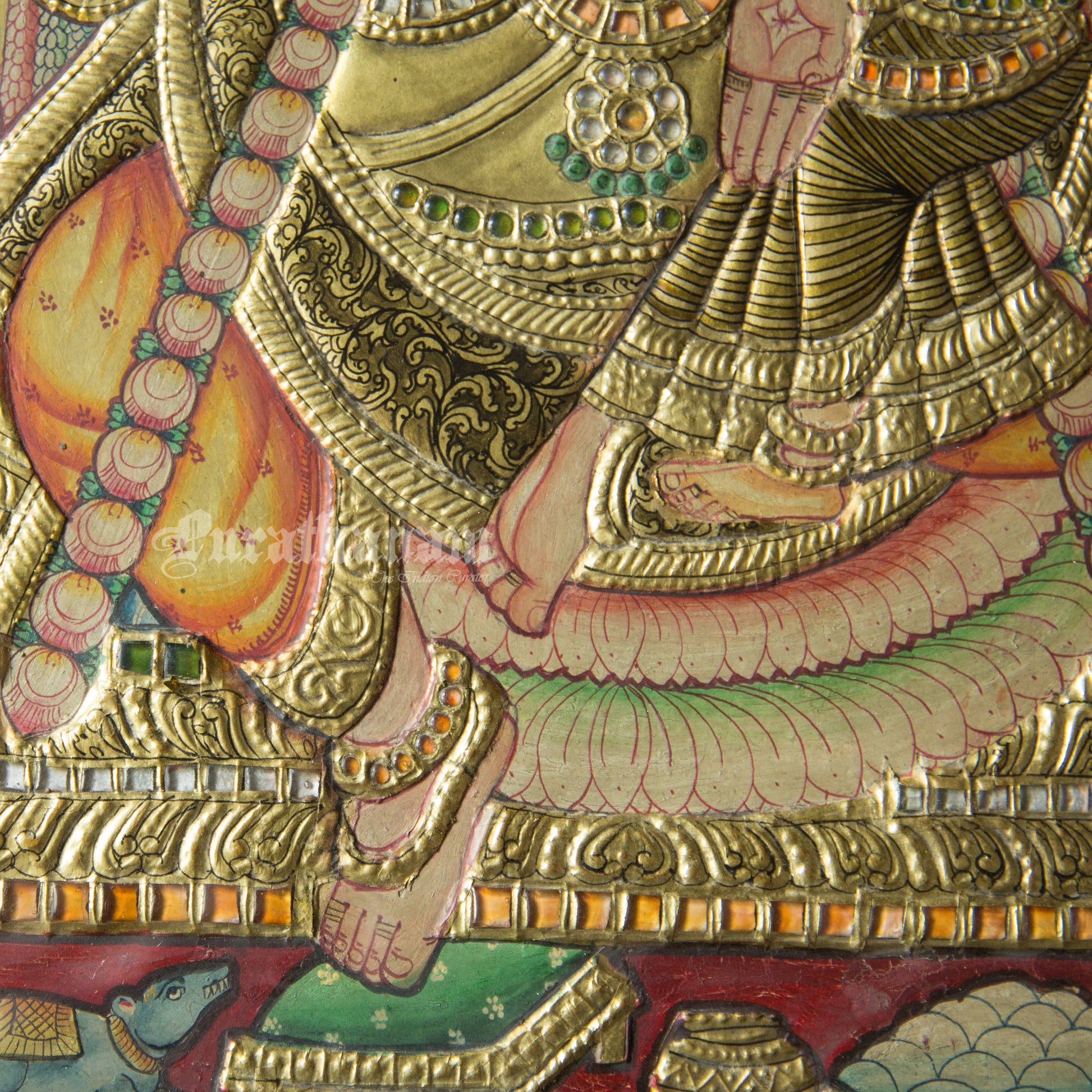 - Natural Colors: The color medium used in early Tanjavur paintings was made from organic vegetable dyes, resulting in lighter shades compared to modern-day Tanjore paintings. These natural colors were not affected by light exposure at the time, as the paintings were mostly kept indoors and lit by dim traditional lamps. However, with the invention of electricity and the use of brighter lighting, it became harder for these colors to survive over time.