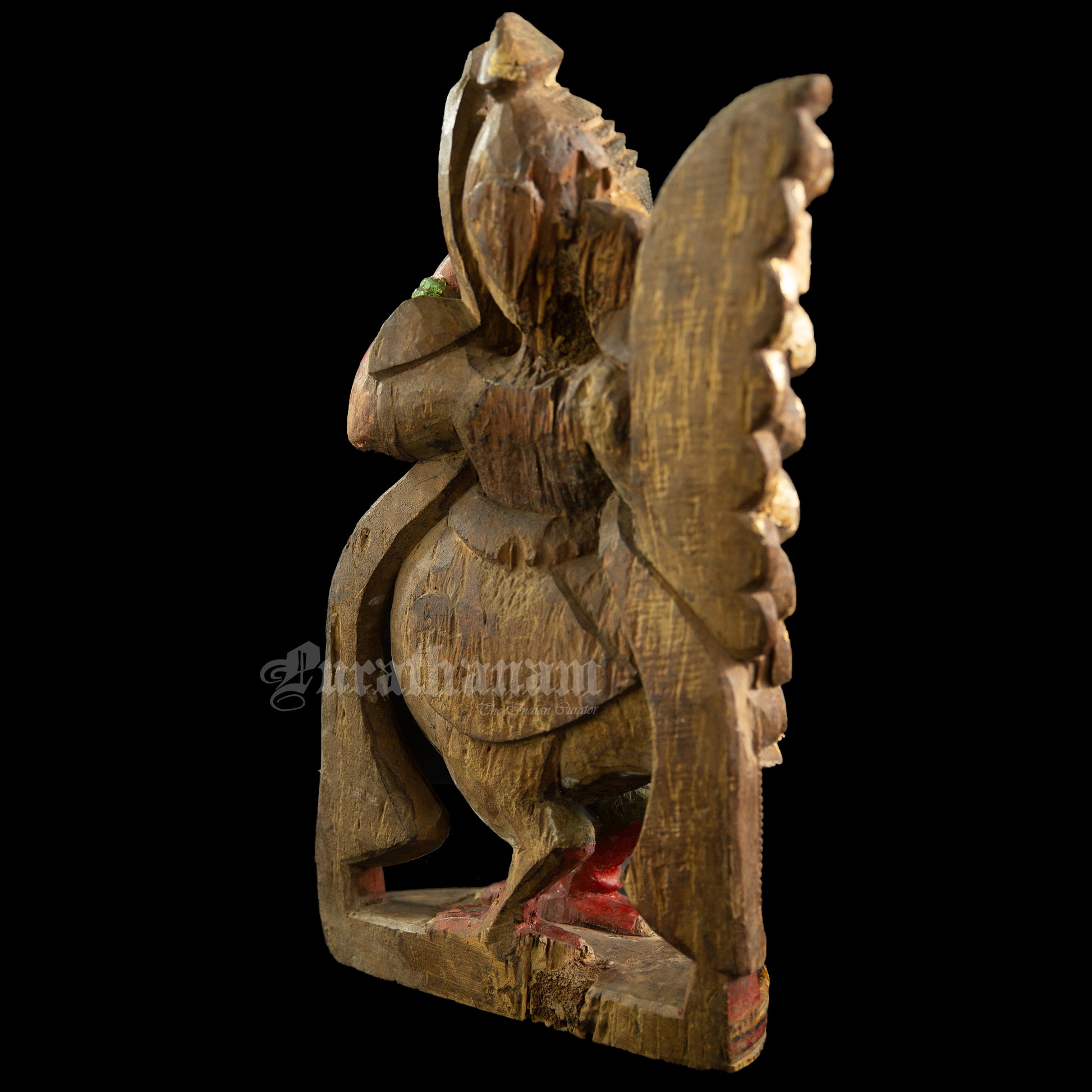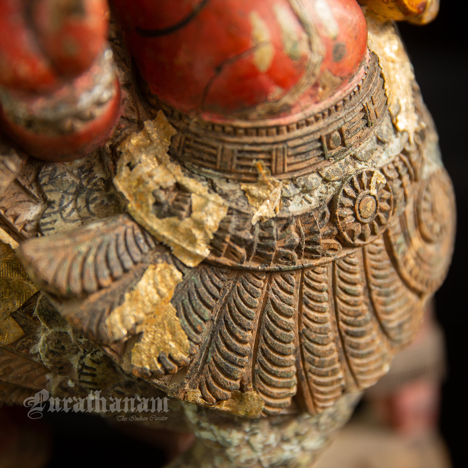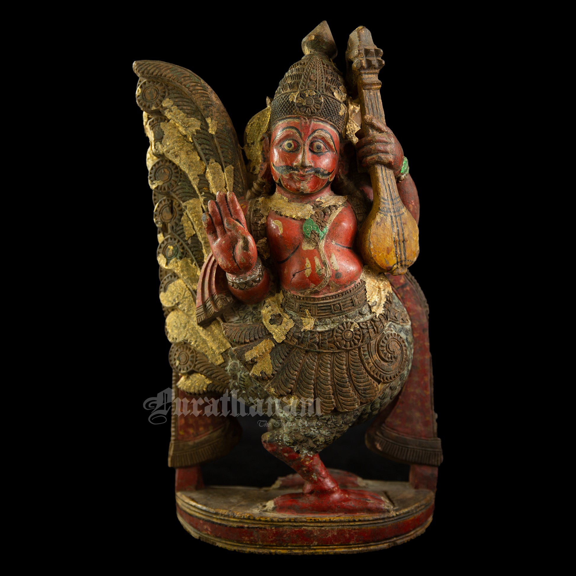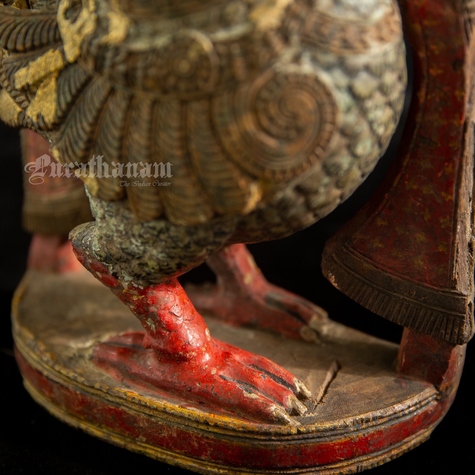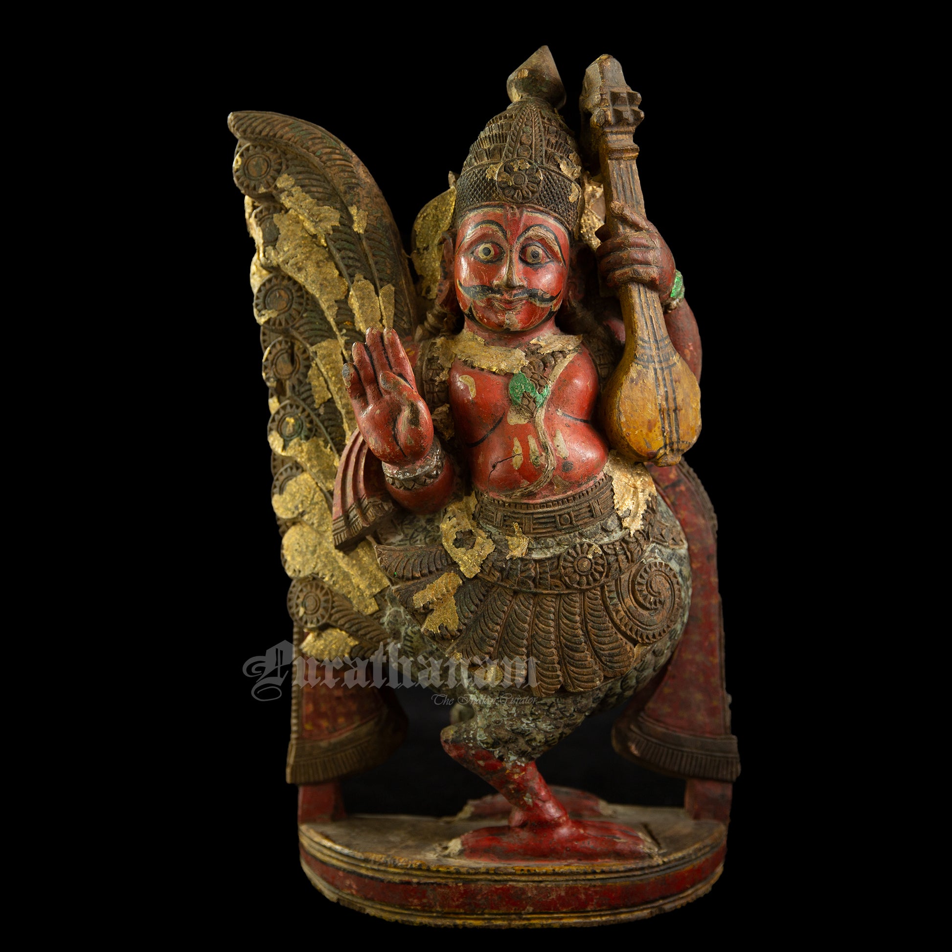 Here we have an unique and a rare wooden sculpture of Ghandharva from Tamizhnadu, South of India which is more than hundred years old. The colors on the sculpture looks bright and the feathers are embellished in gold paper to add grandness to the sculpture as a statement. This is really a rare find.