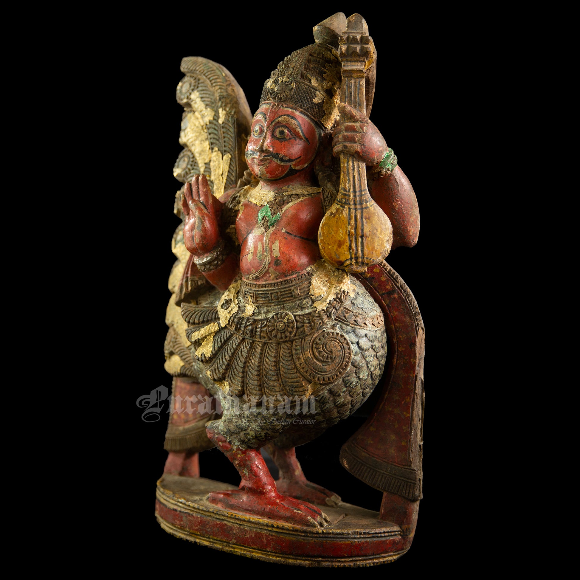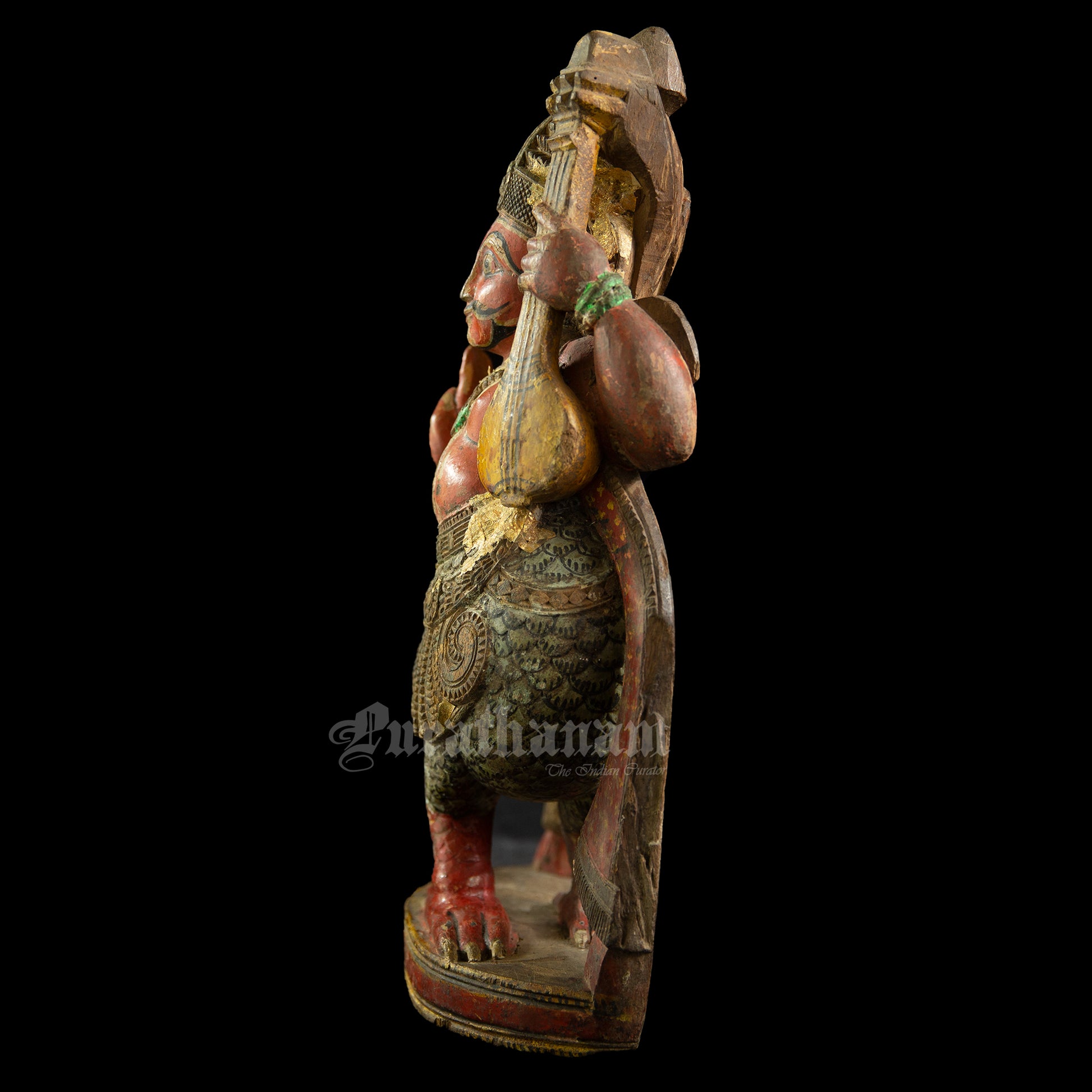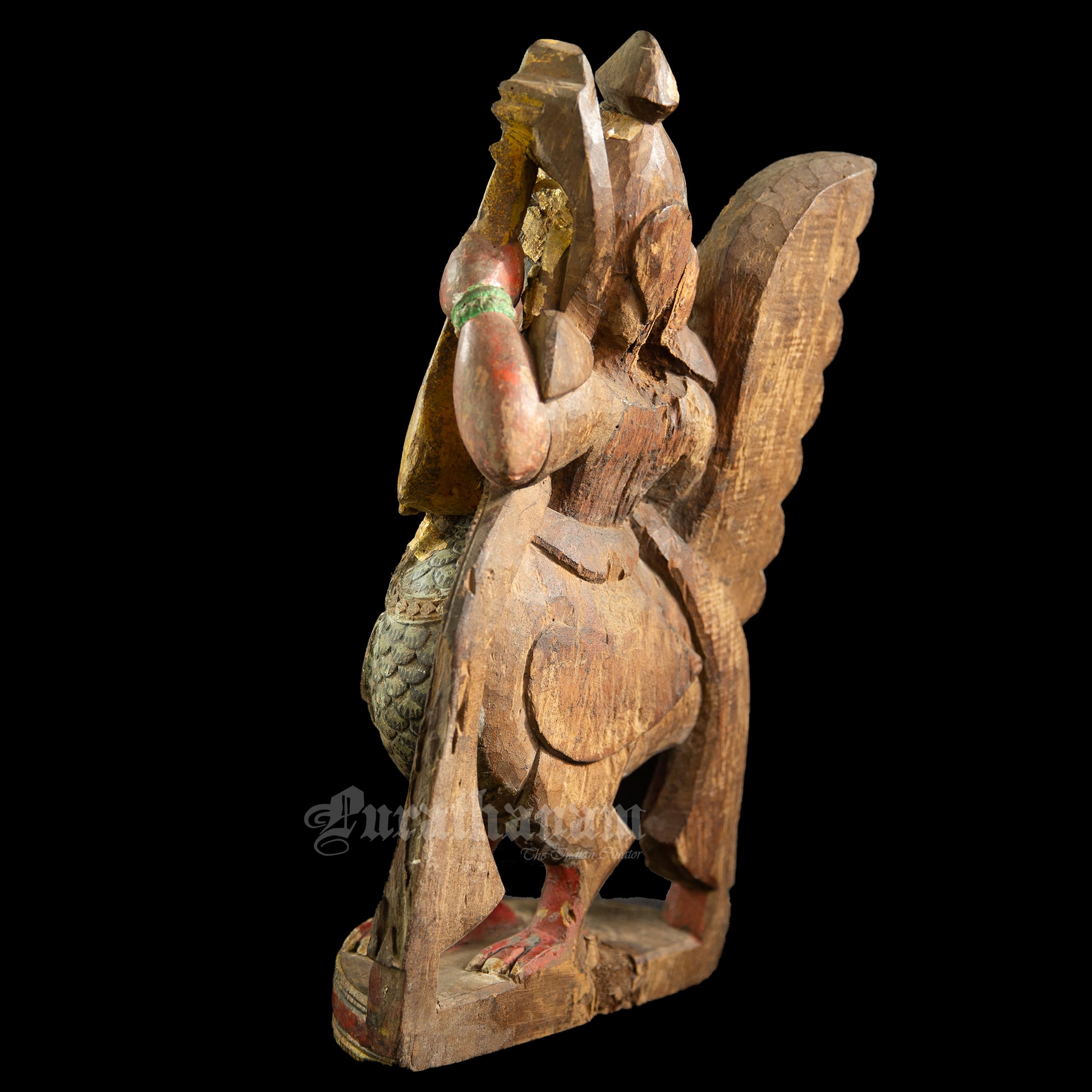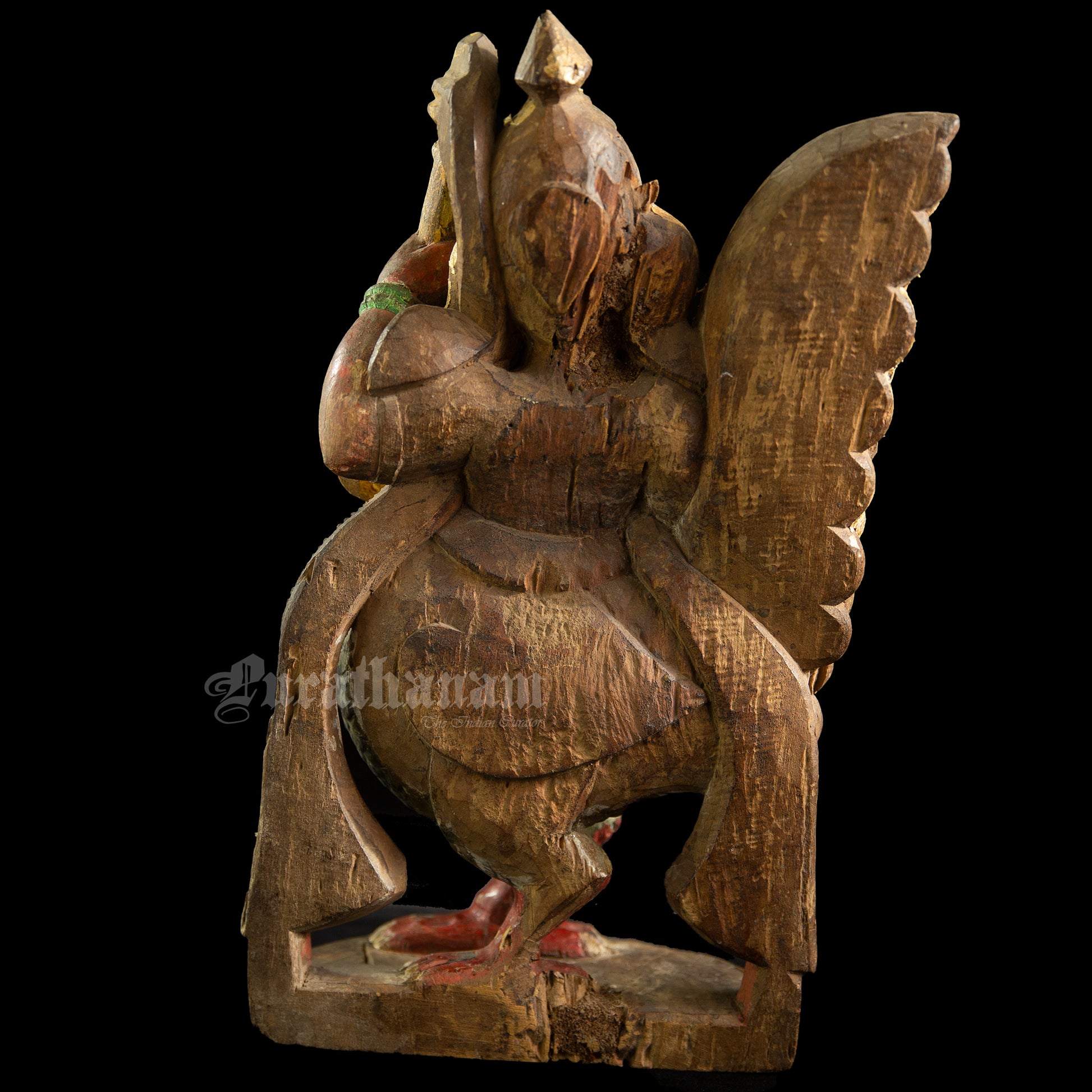 Here we have an unique and a rare wooden sculpture of Ghandharva from Tamizhnadu, South of India which is more than hundred years old. The colors on the sculpture looks bright and the feathers are embellished in gold paper to add grandness to the sculpture as a statement. This is really a rare find.