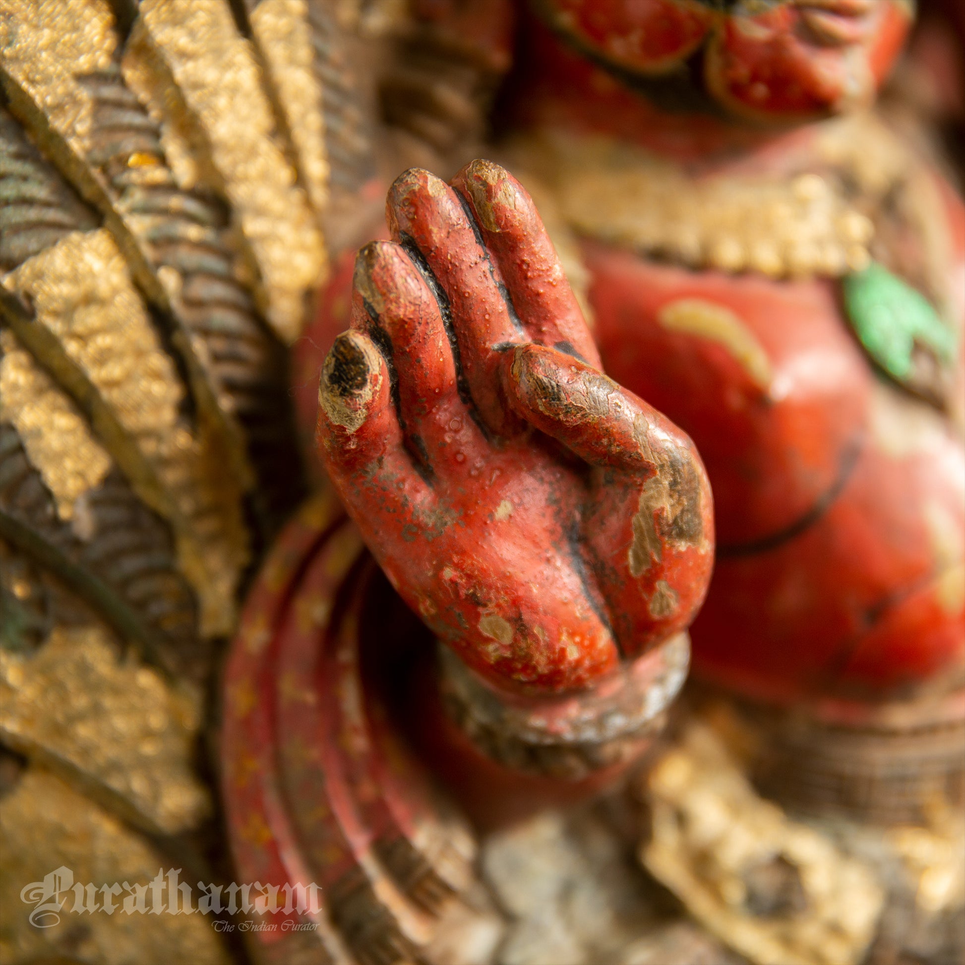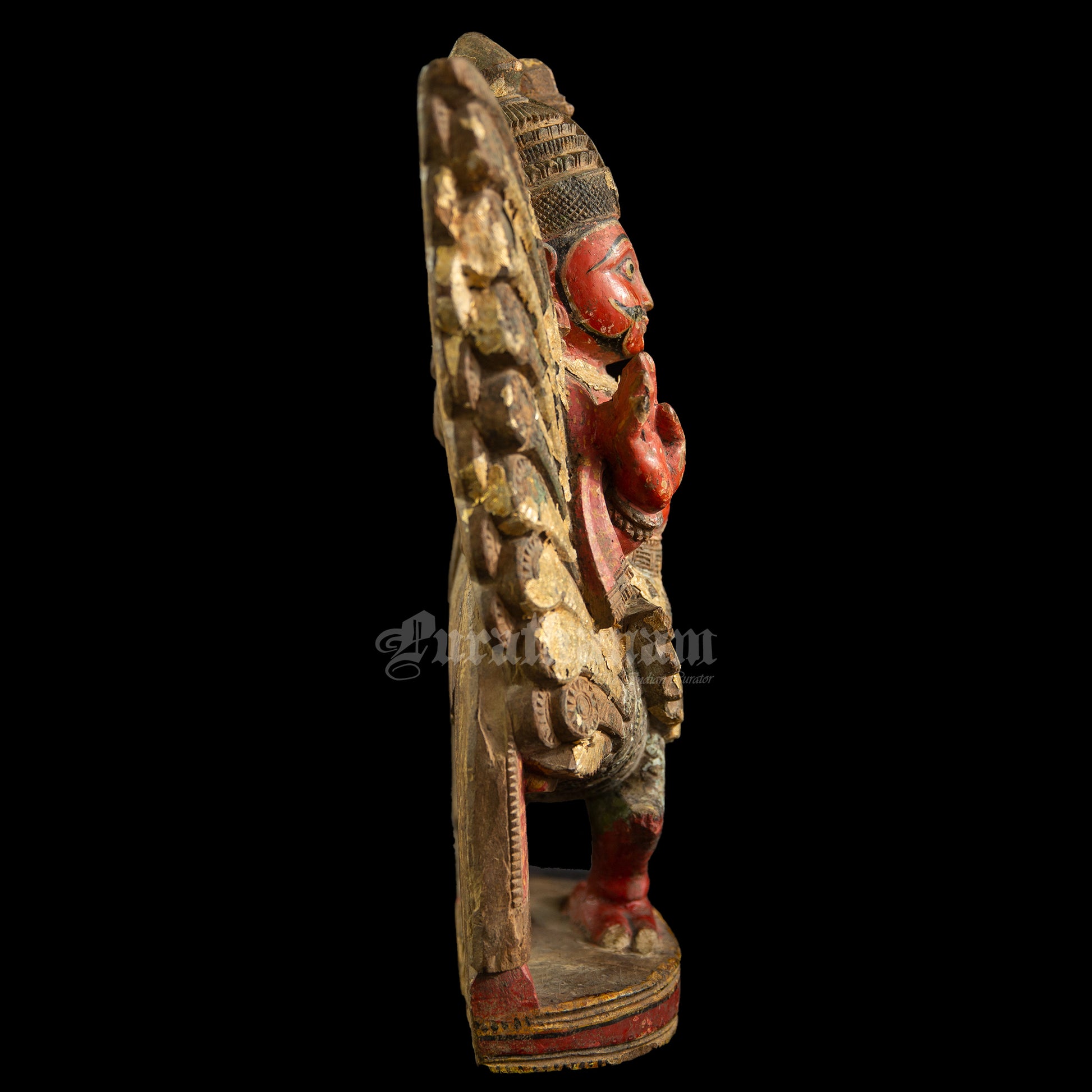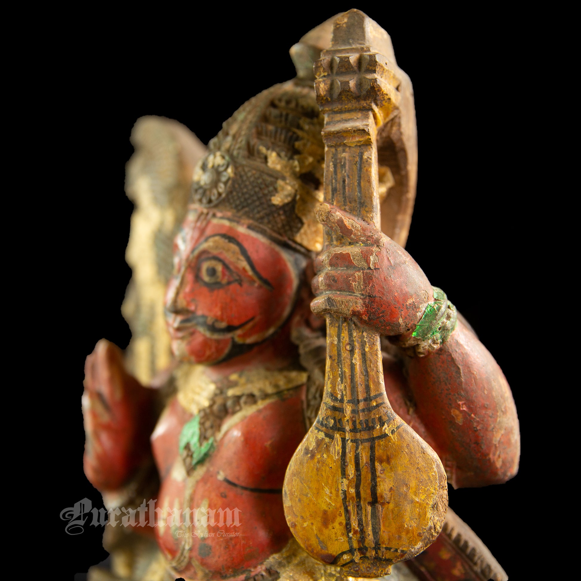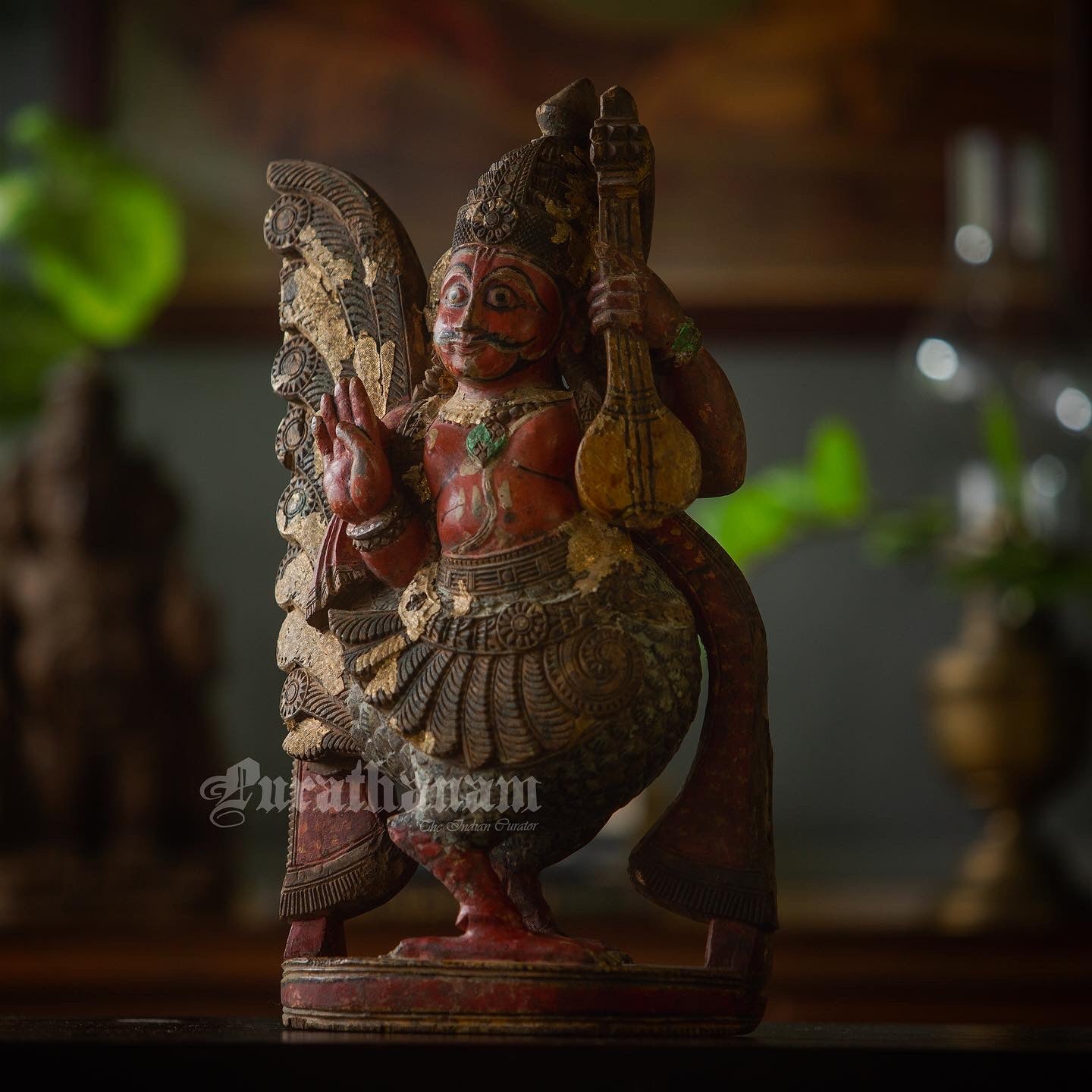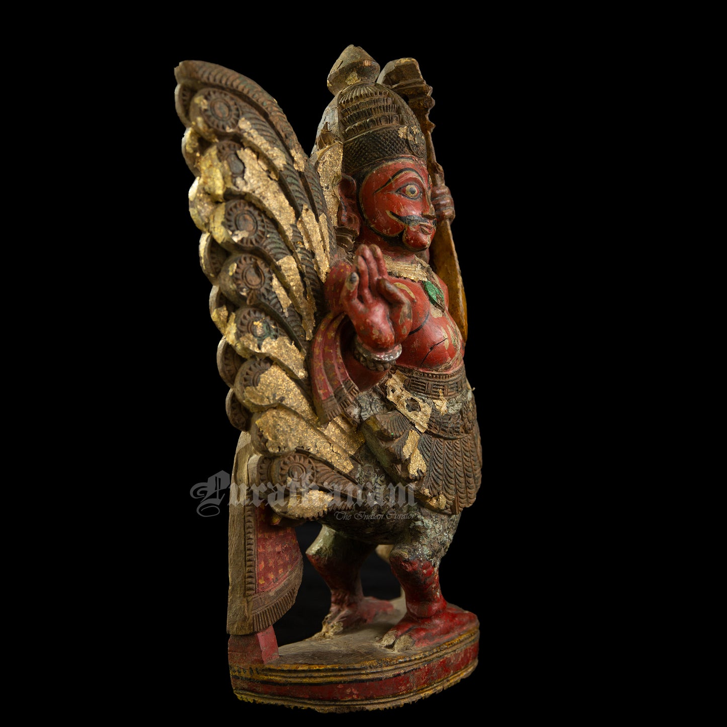 Here we have an unique and a rare wooden sculpture of Ghandharva from Tamizhnadu, South of India which is more than hundred years old. The colors on the sculpture looks bright and the feathers are embellished in gold paper to add grandness to the sculpture as a statement. This is really a rare find.