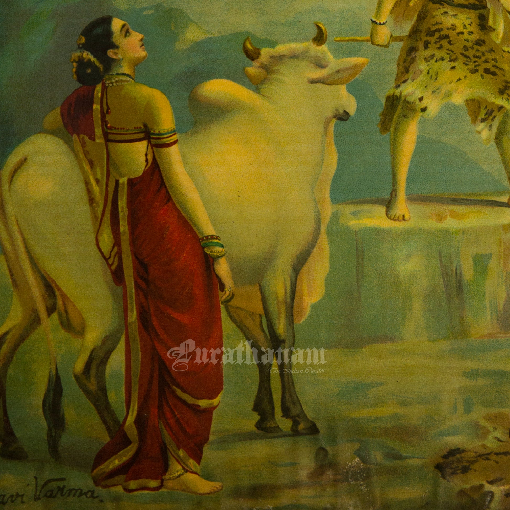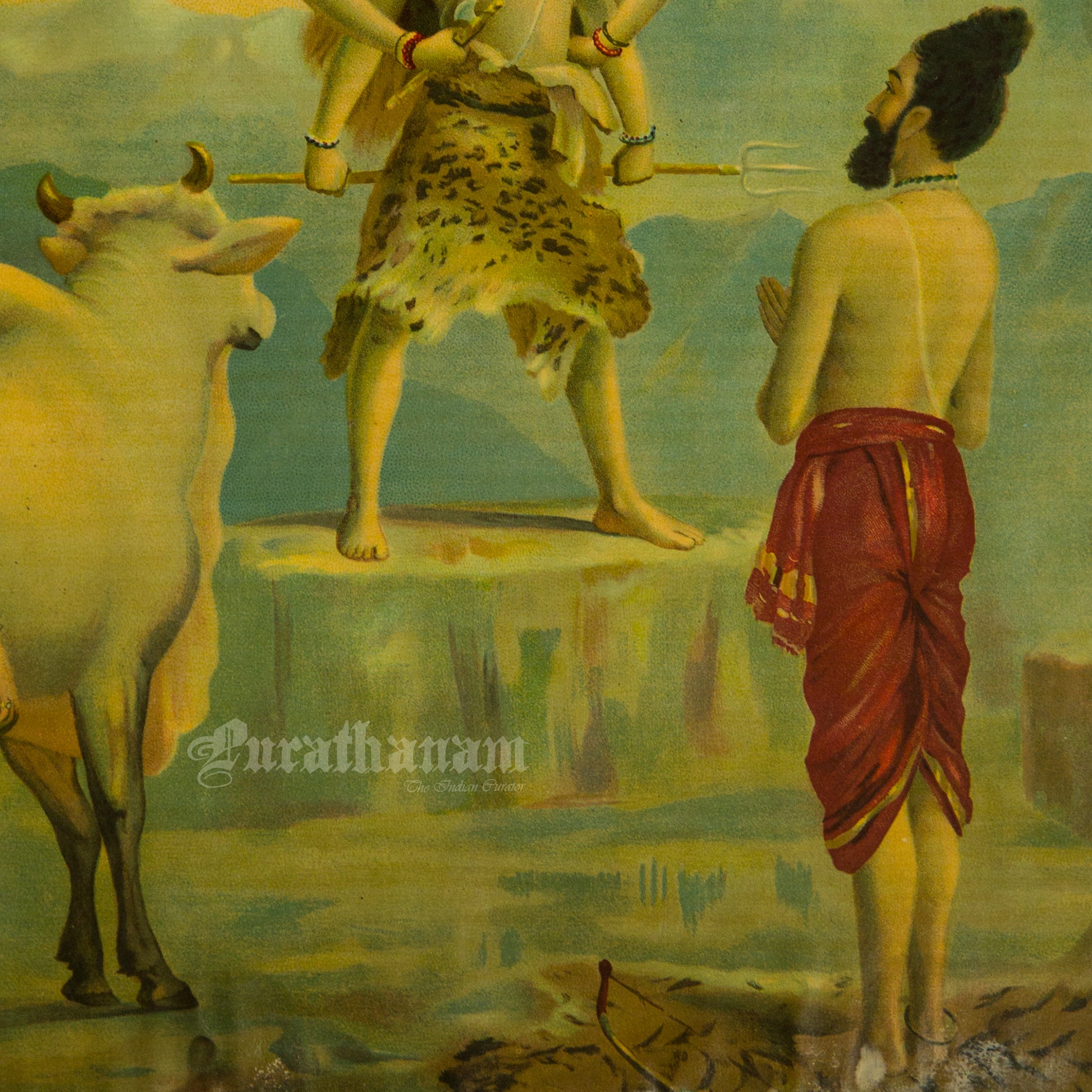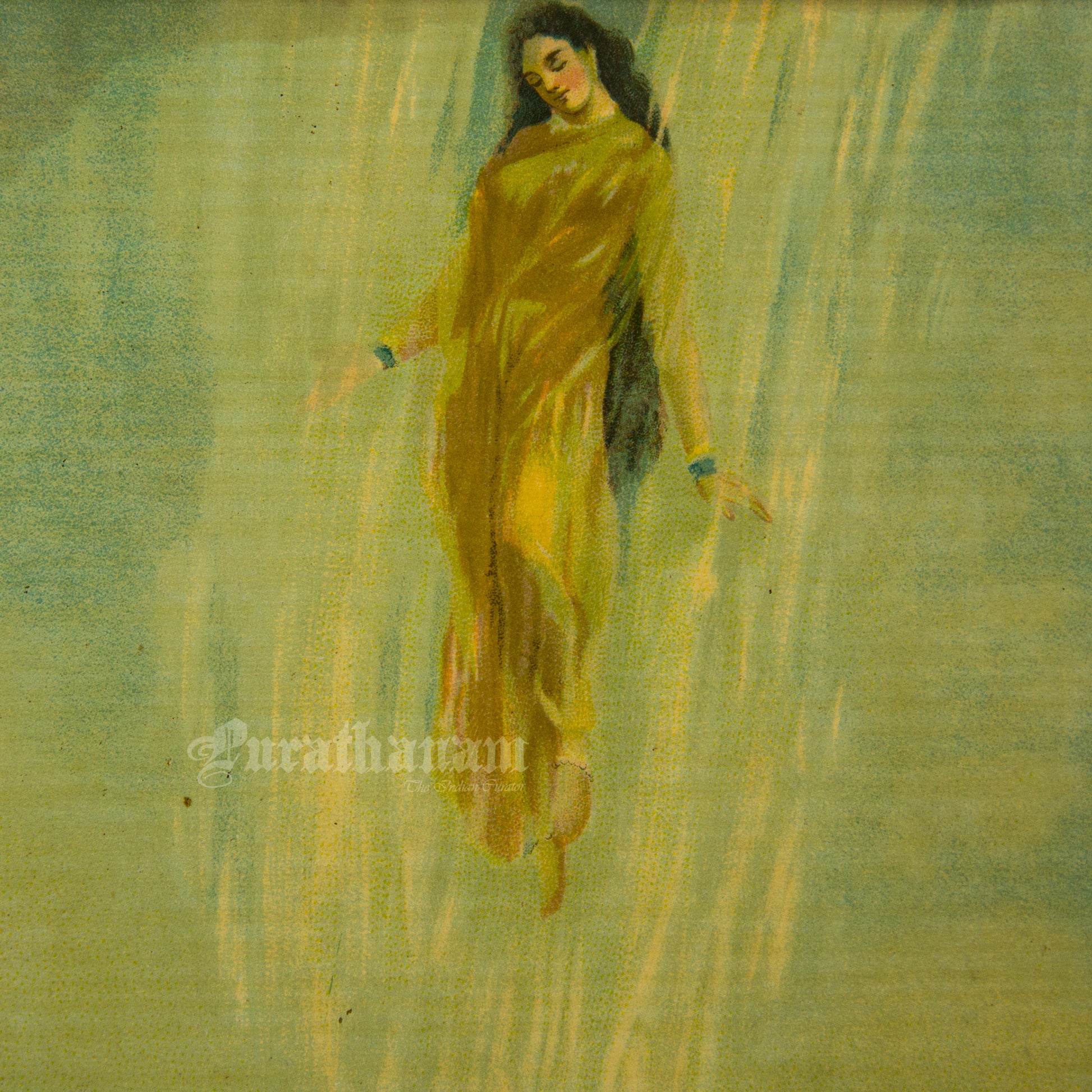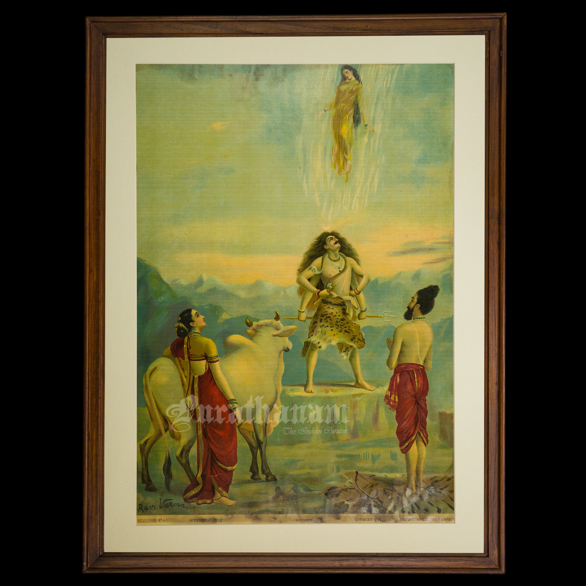 This is an oleograph print from 1920s of Gangavataran by Ravi varma an Indian who achieved recognition for his depiction of scenes from the epics of the Mahabharata and Ramayana.