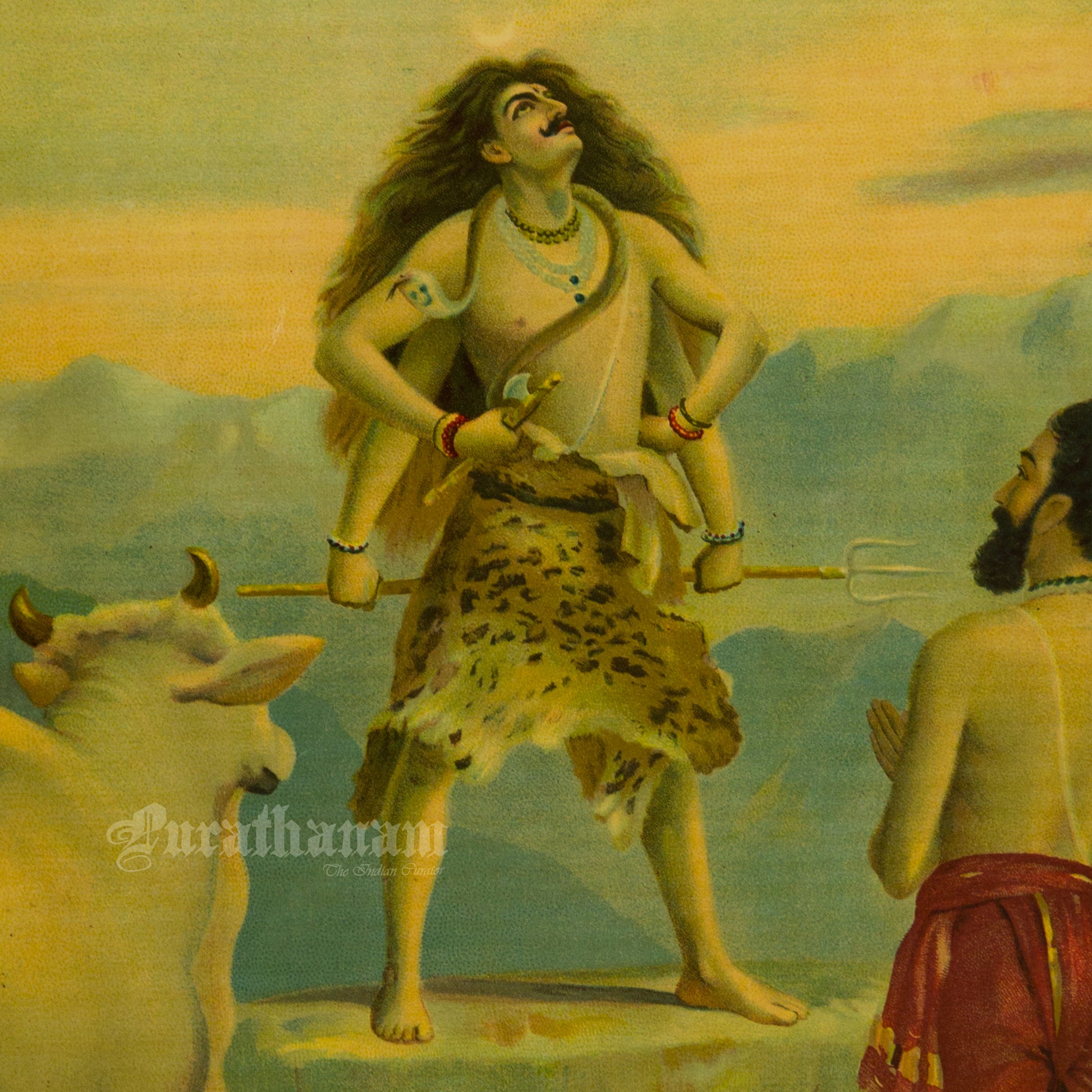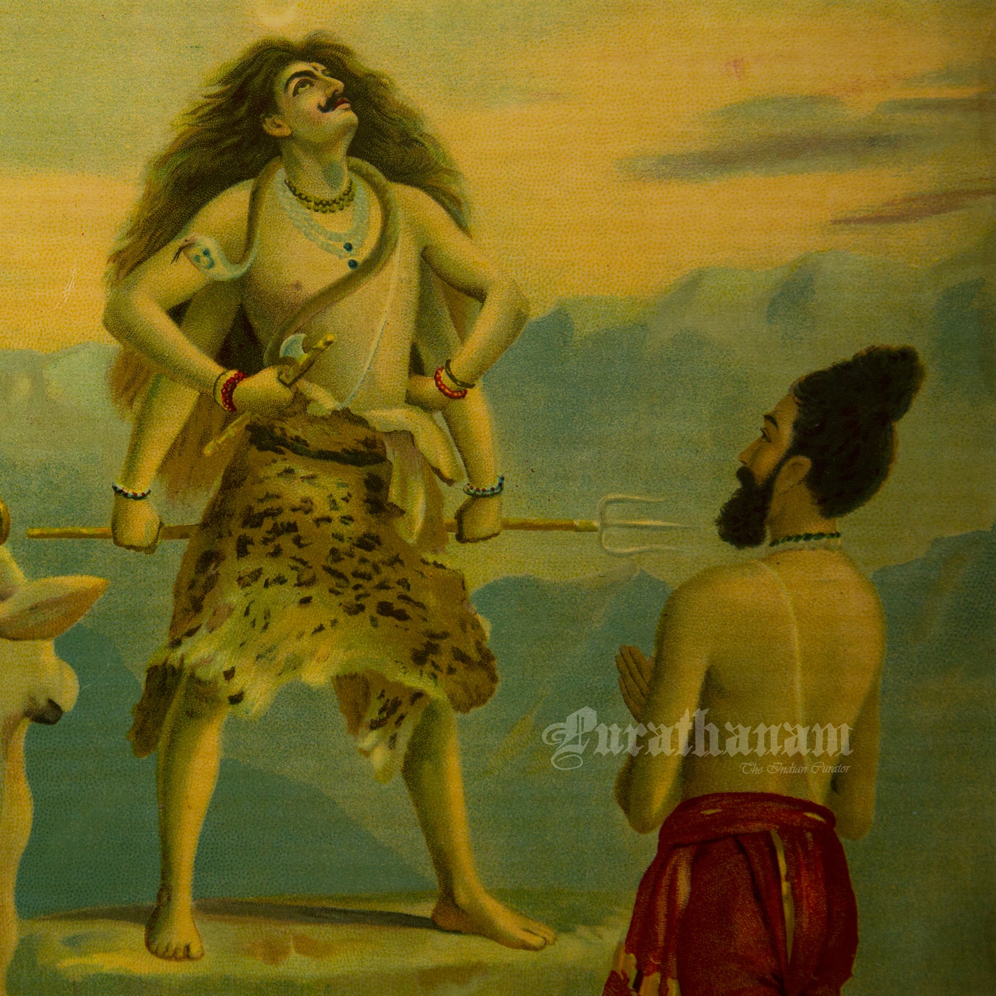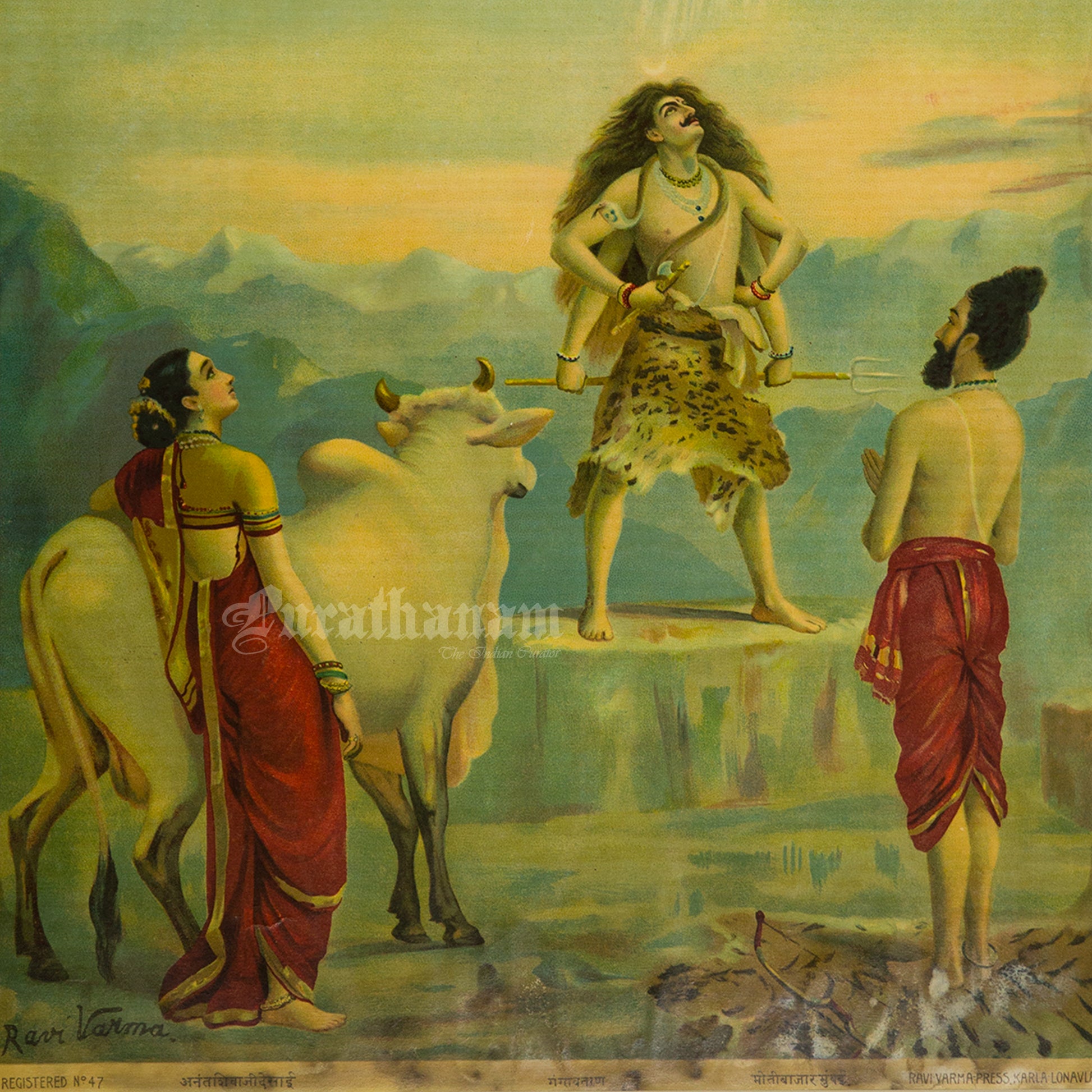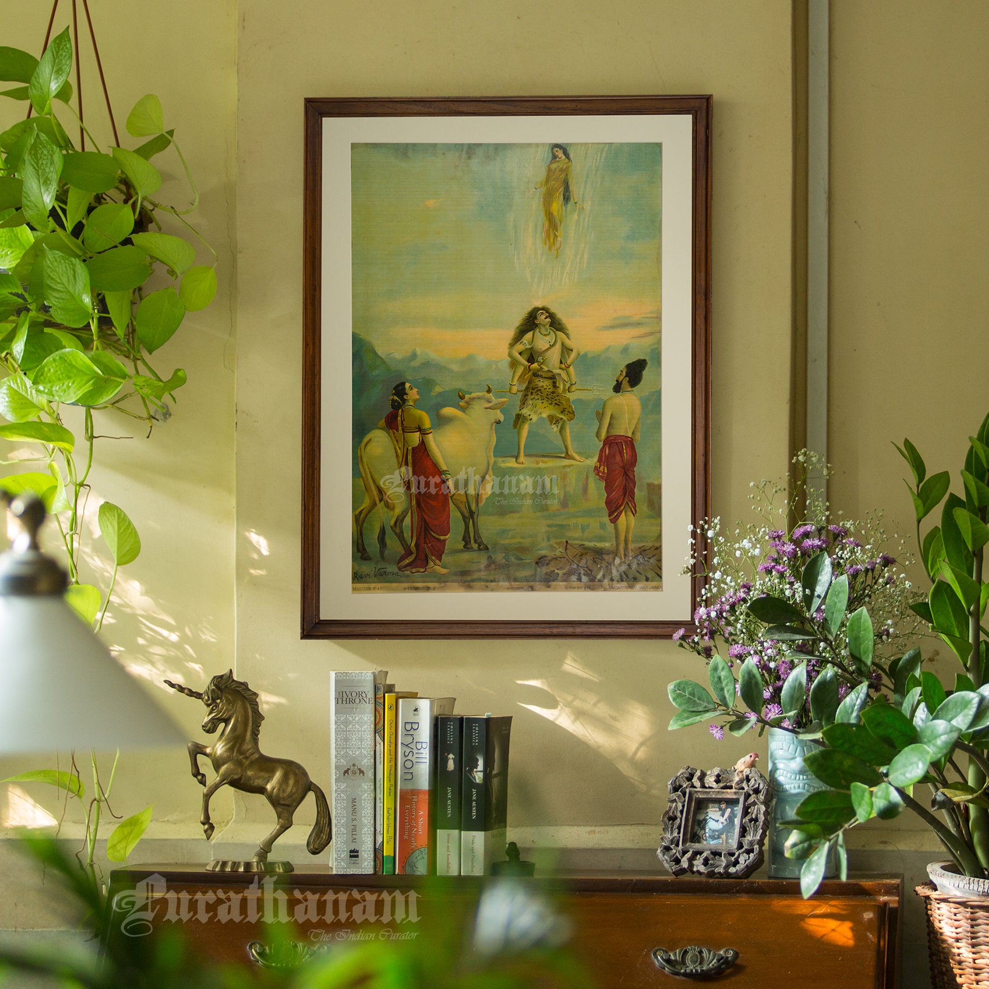 This is an oleograph print from 1920s of Gangavataran by Ravi varma an Indian who achieved recognition for his depiction of scenes from the epics of the Mahabharata and Ramayana.