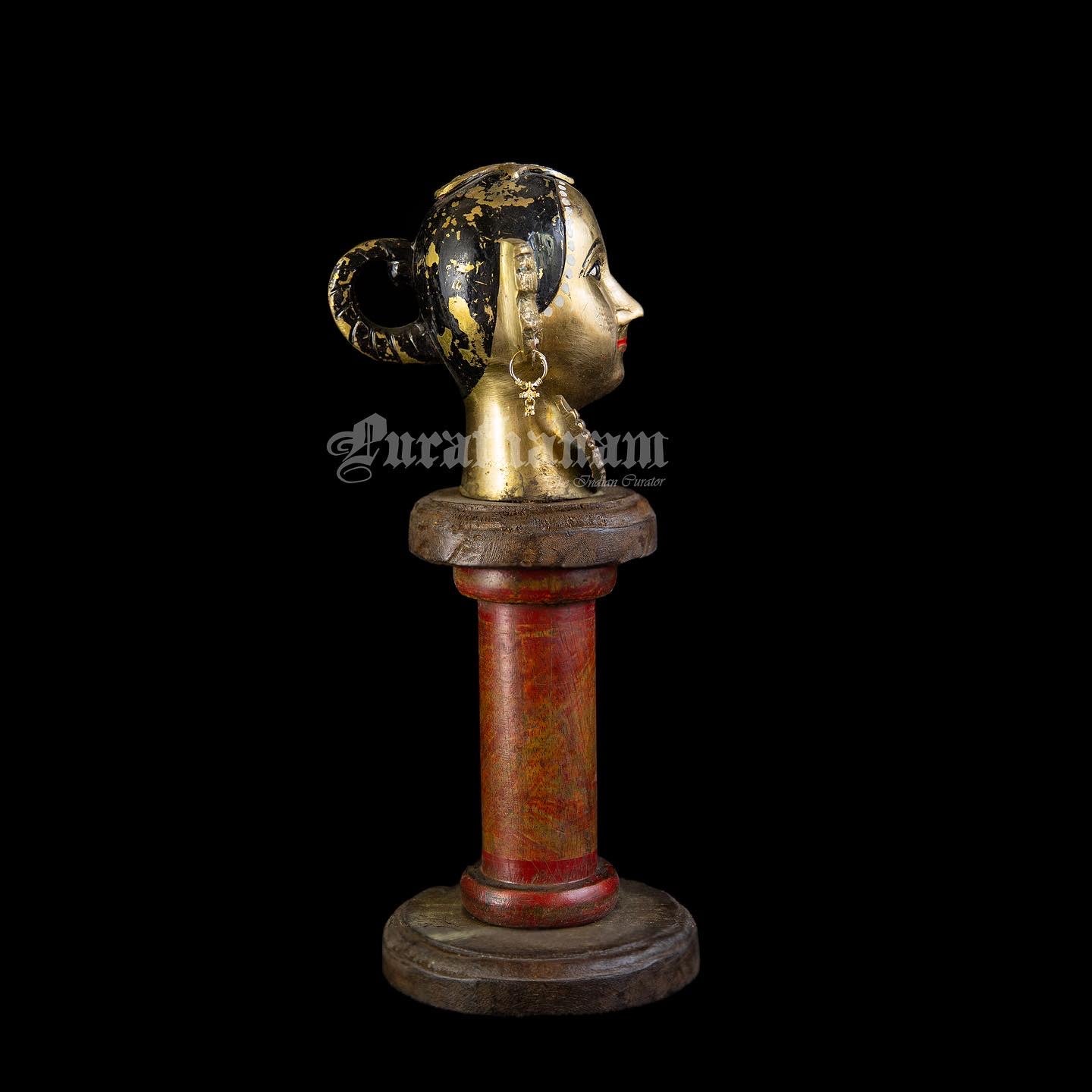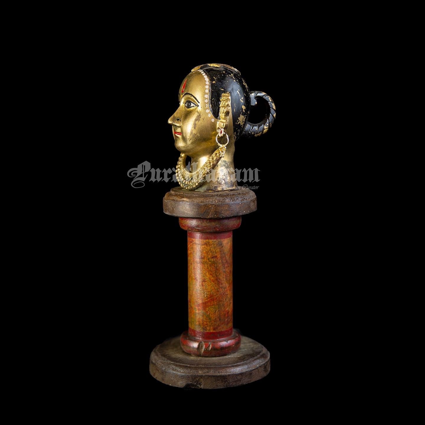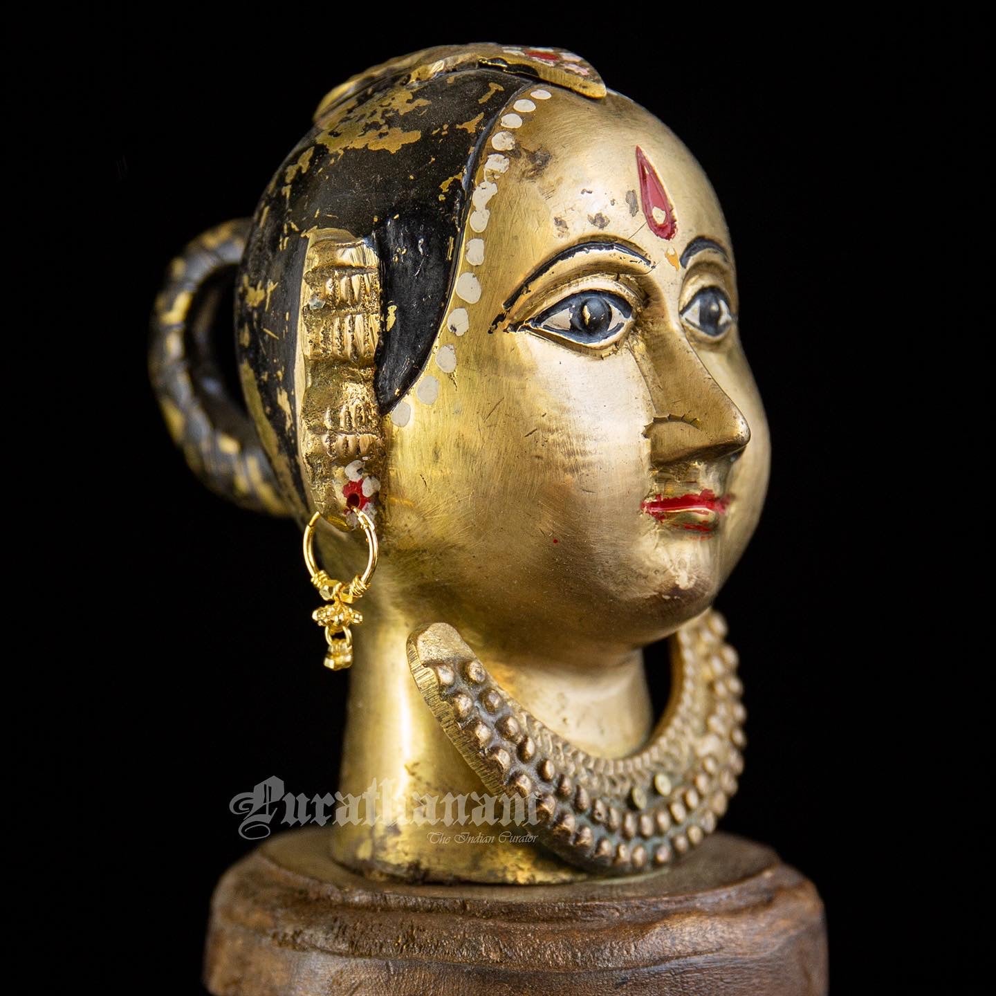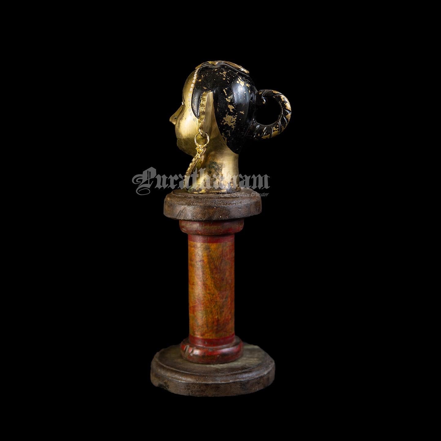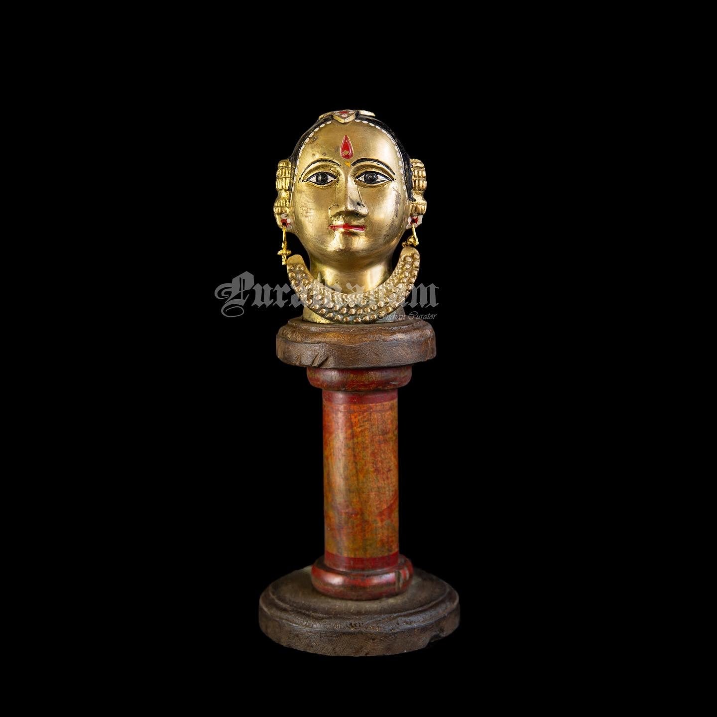 Gauri head made of solid brass using a cast. This method was first used in the 70's but very prevalent in the 80's. This Gauri head is 30-40 years old from Maharashtra.