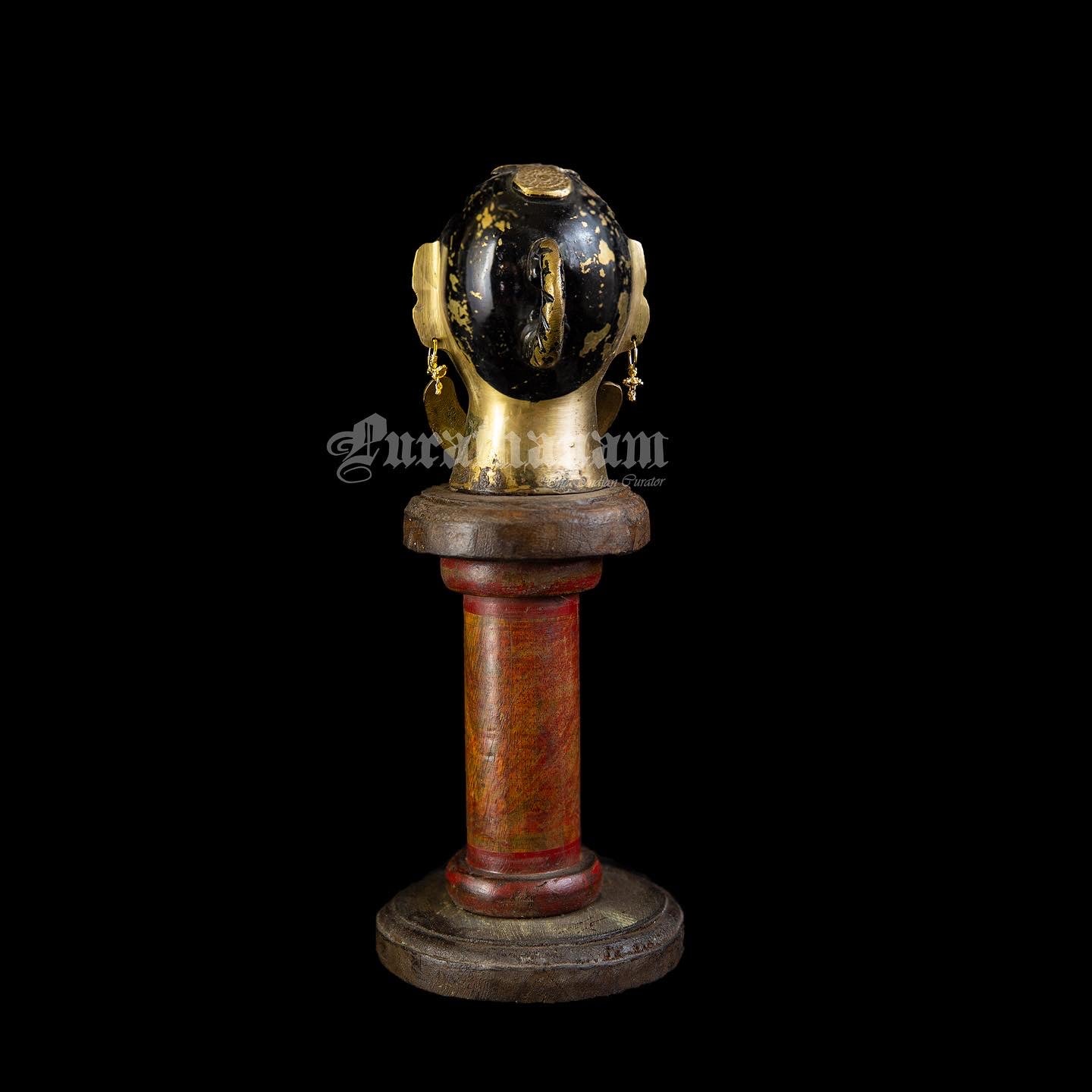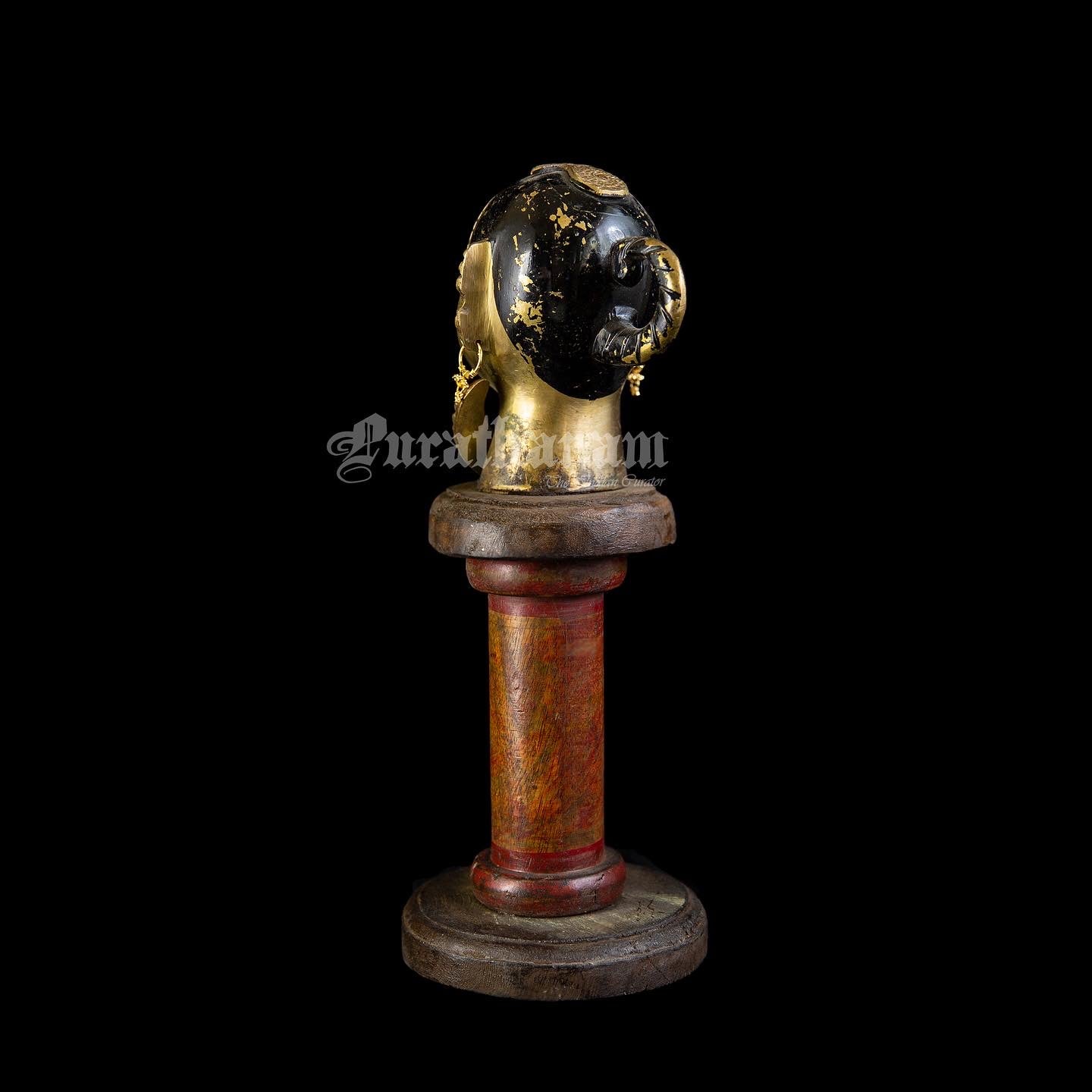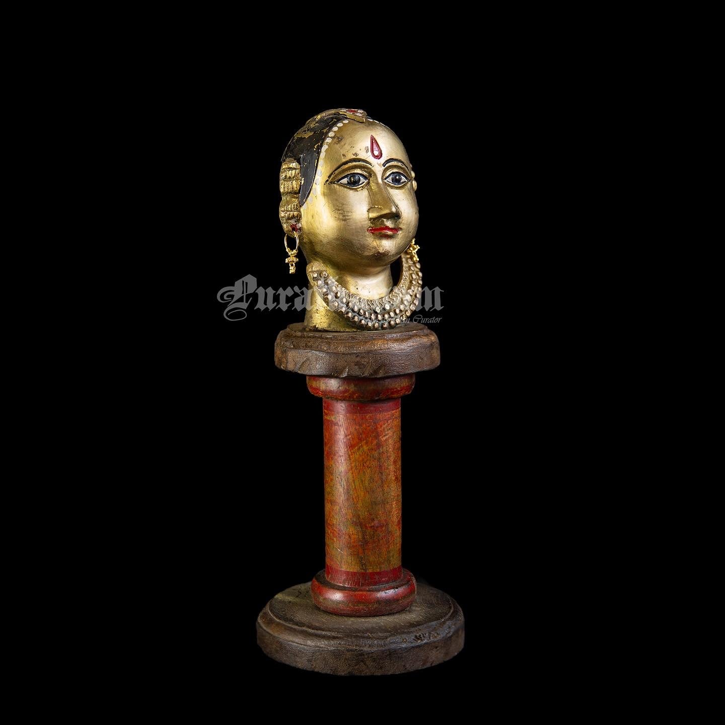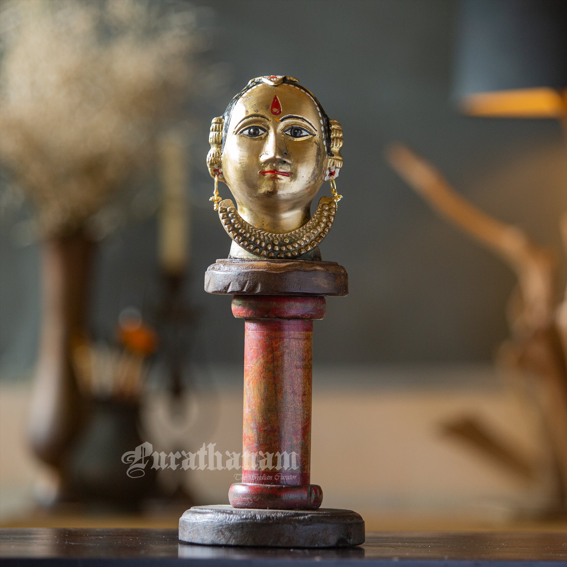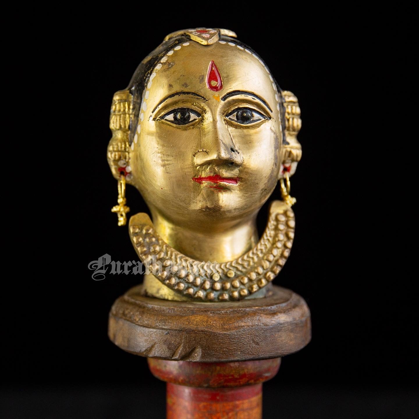 Gauri head made of solid brass using a cast. This method was first used in the 70's but very prevalent in the 80's. This Gauri head is 30-40 years old from Maharashtra.