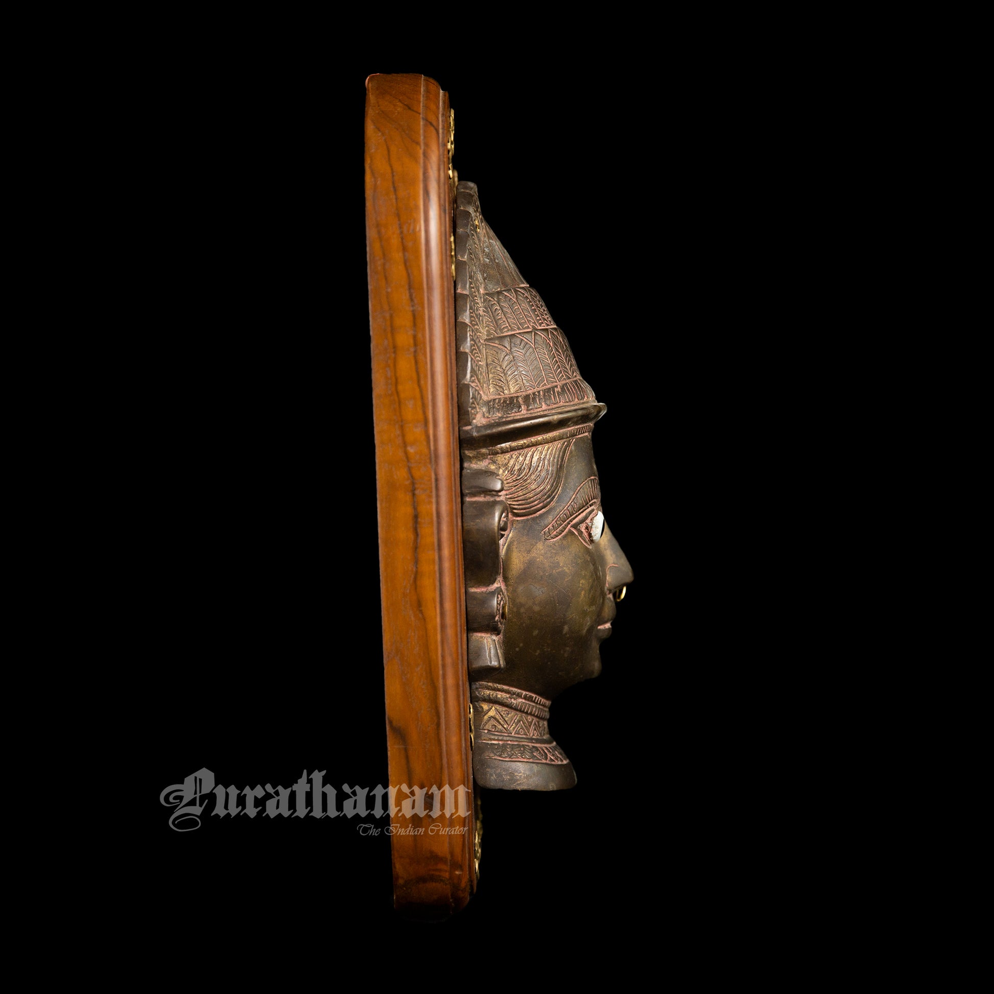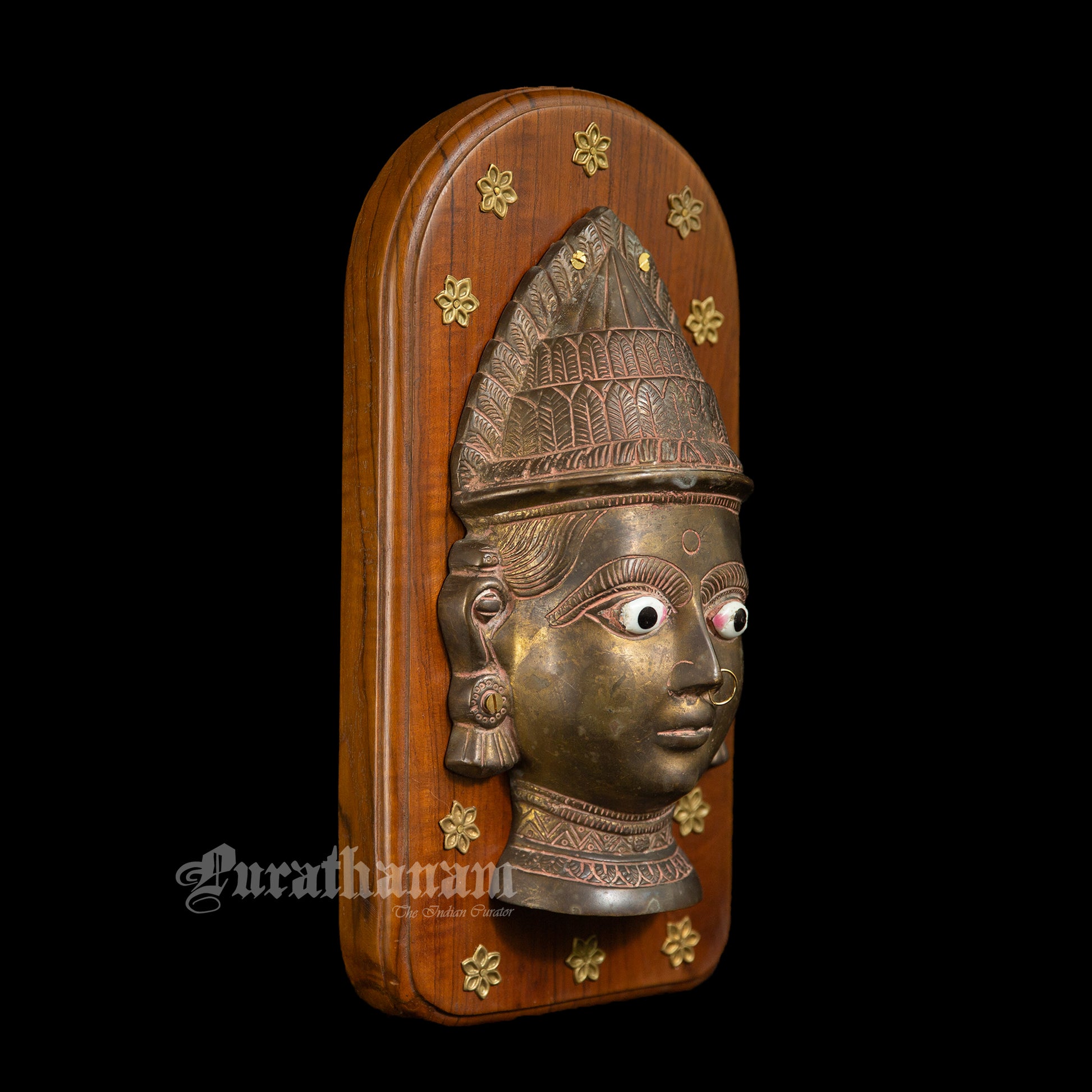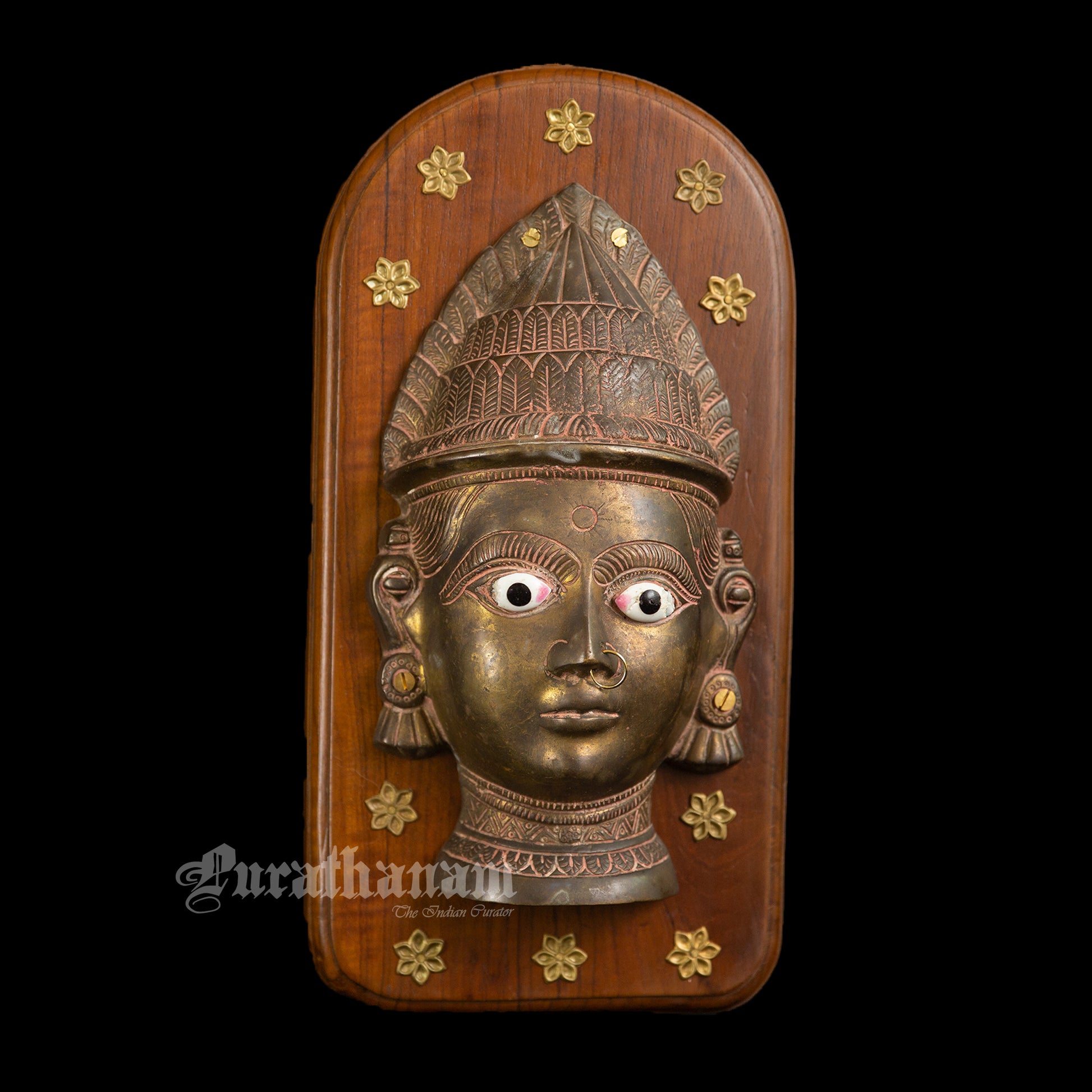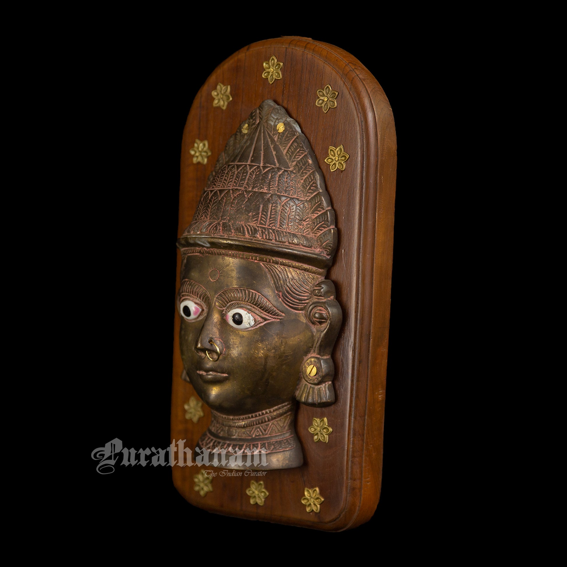 Presenting this gorgeous vintage Gauri Head, crafted from solid brass showcasing impeccable craftsmanship. The vintage Gauri Head has been mounted on a teak wood plaque to create a wall hanging. The head, cast in brass is around 40 years and originates from the Maharashtra-Karnataka border in India.