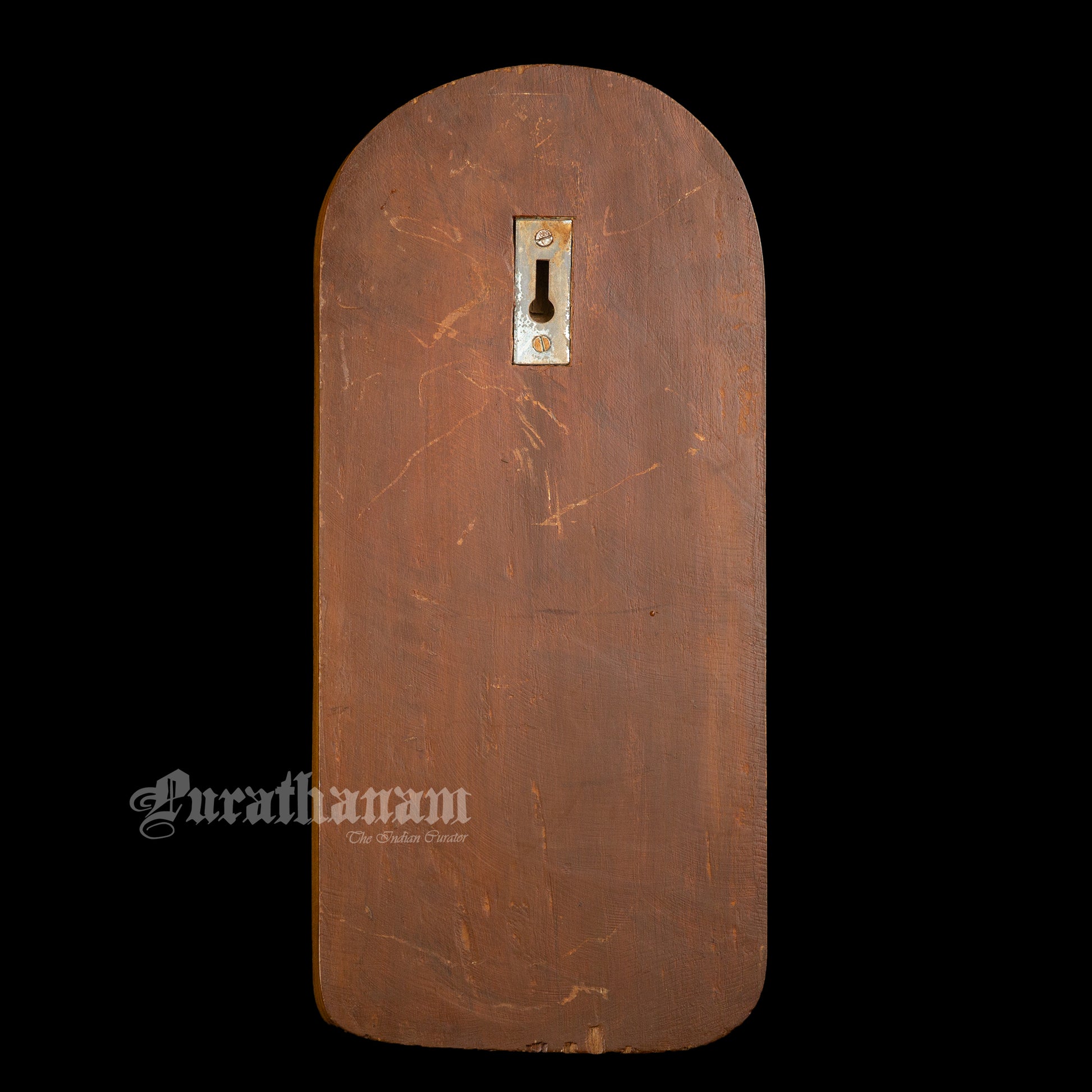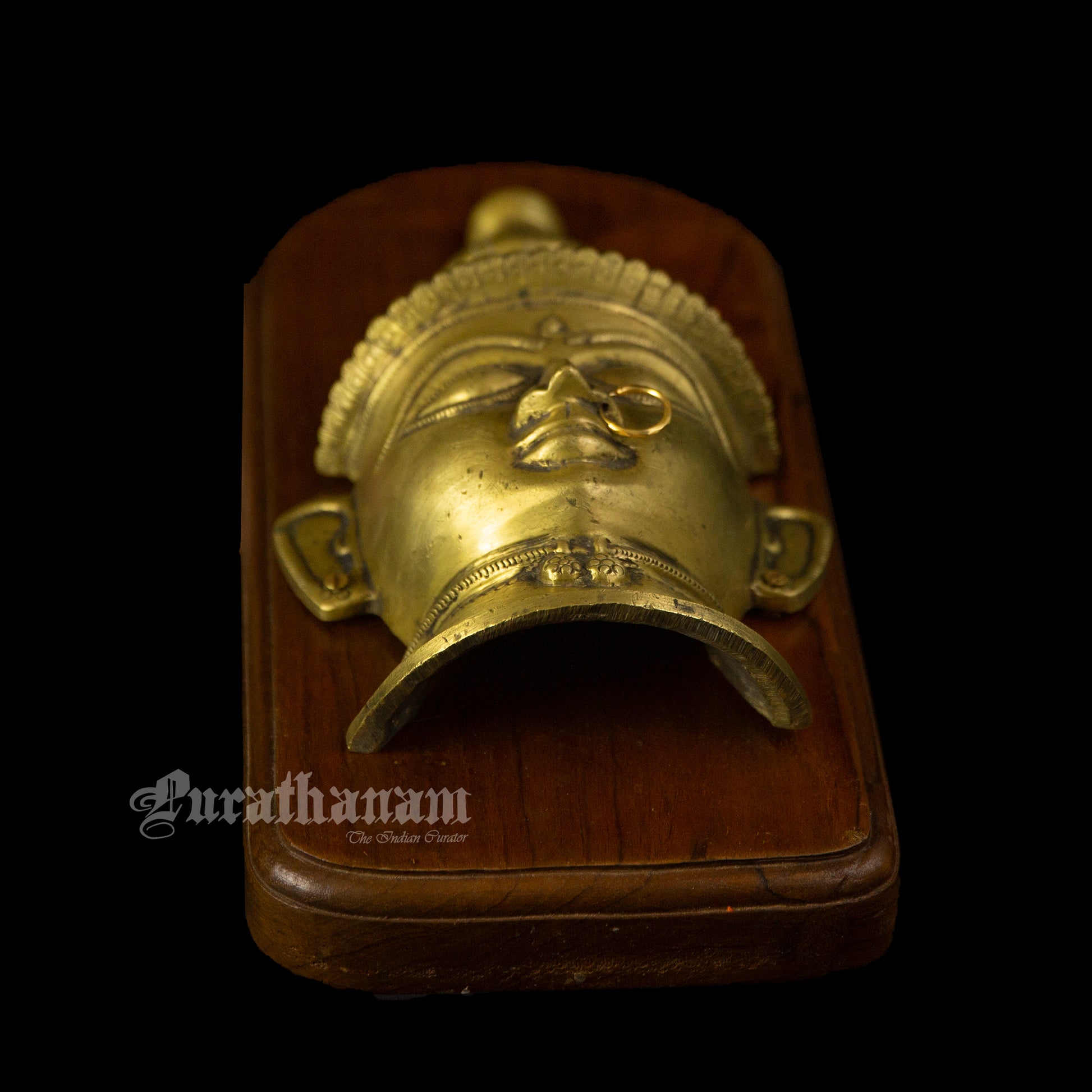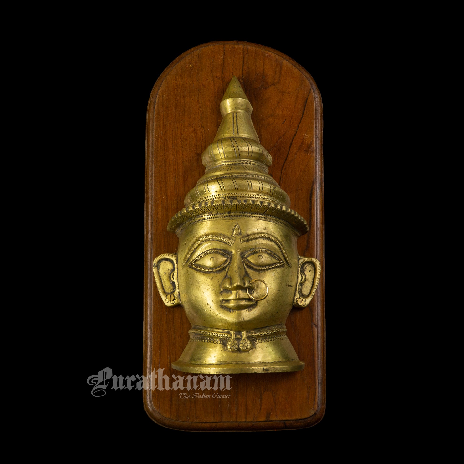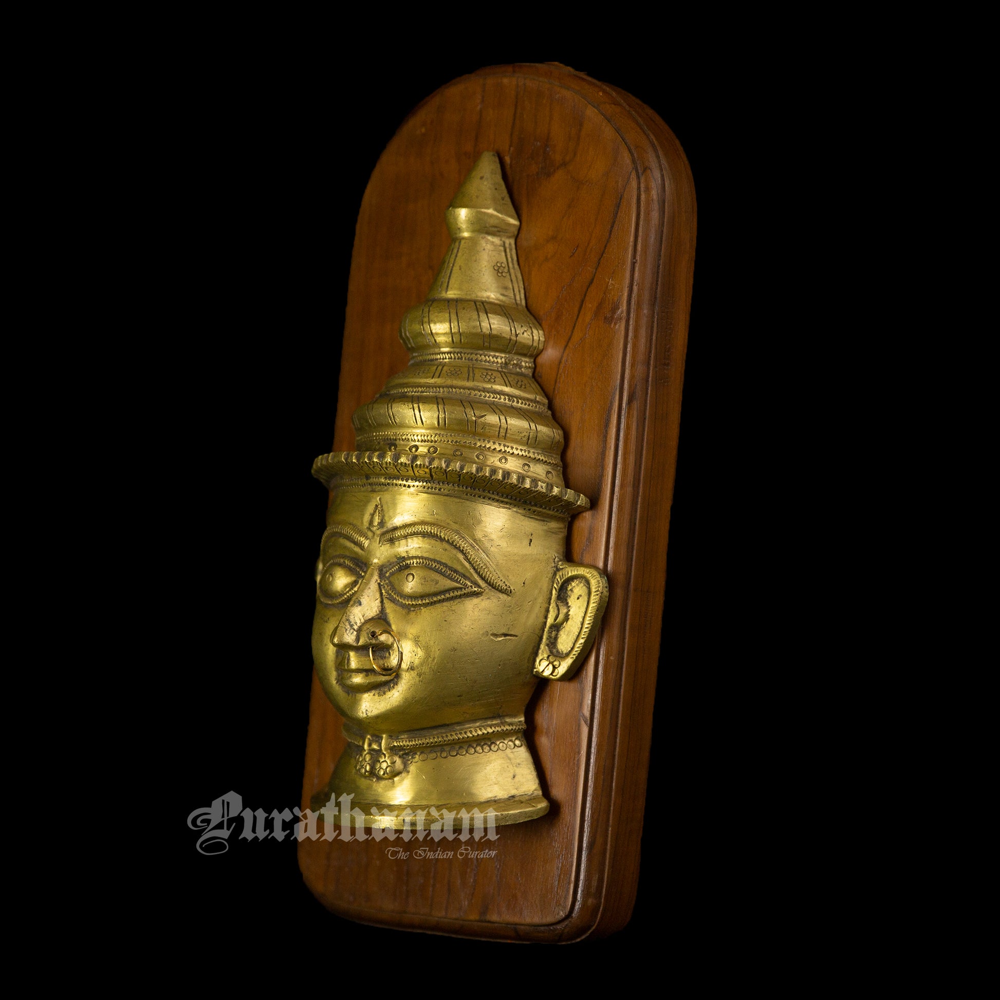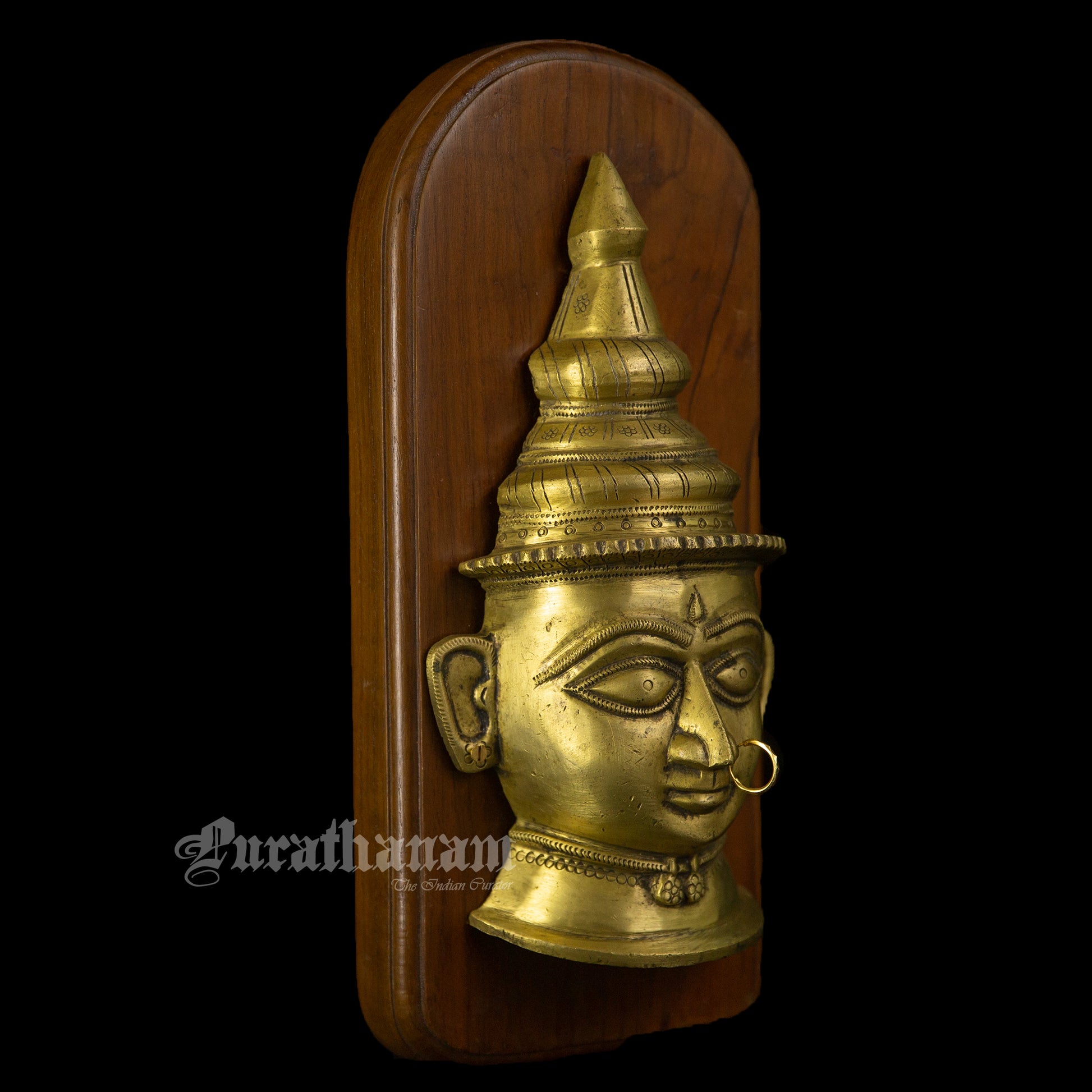 Presenting this gorgeous vintage Gauri Head, crafted from solid brass showcasing impeccable craftsmanship. The vintage Gauri Head has been mounted on a teak wood plaque to create a wall hanging. The head, cast in brass is around 50+ years and originates from the Maharashtra-Karnataka border in India.