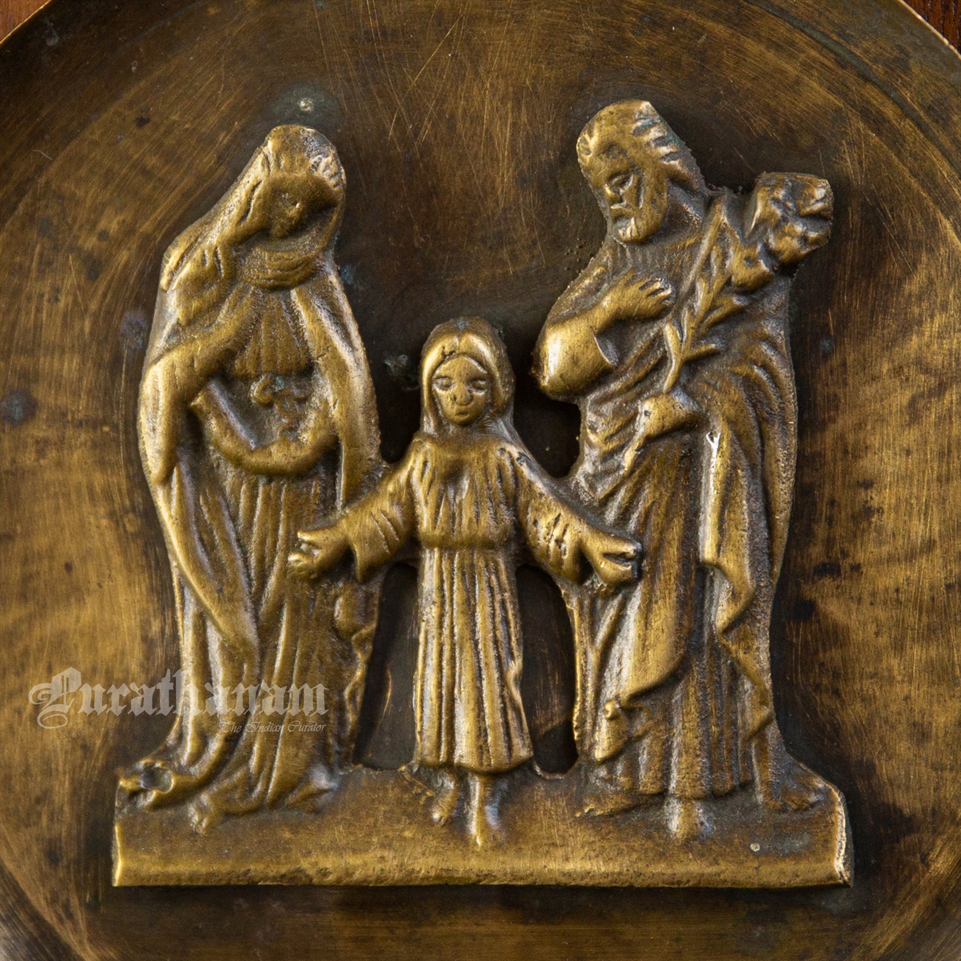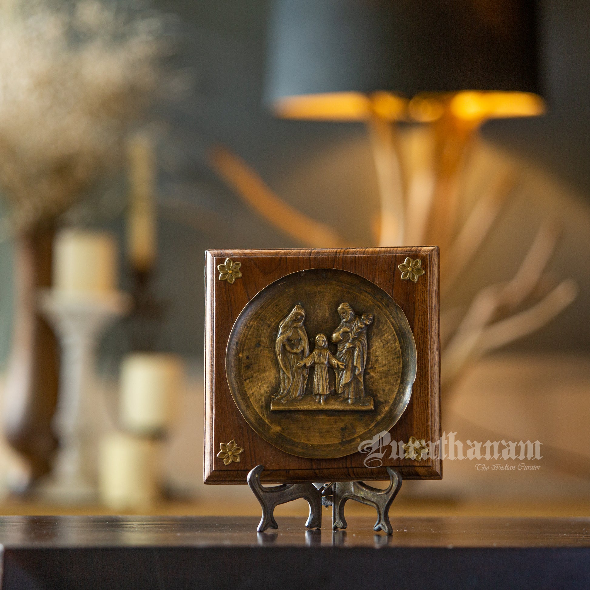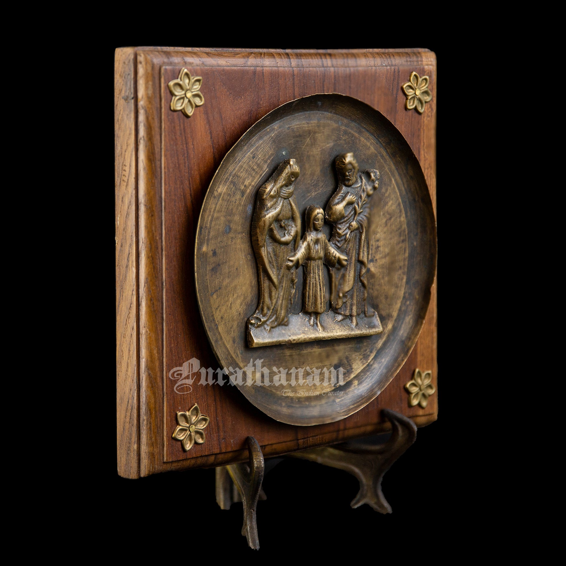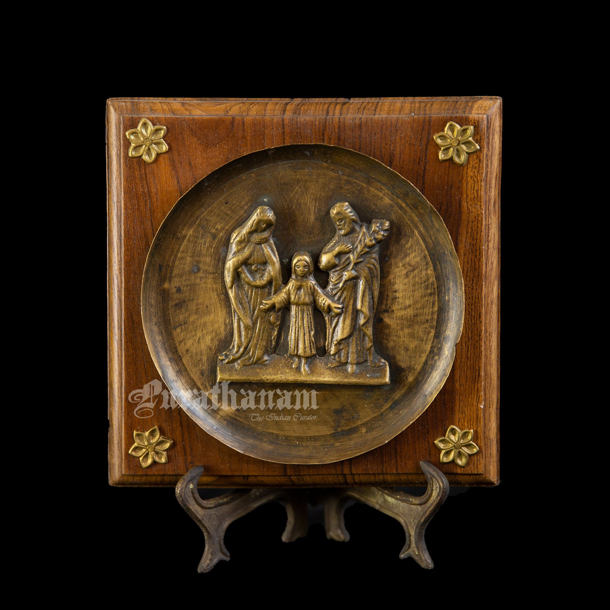 Here is a beautiful brass wall plaque of the Holy Family. This vintage holy family brass plate is approximately 30-40 years old and has been mounted on to the teak wood for enhancement.