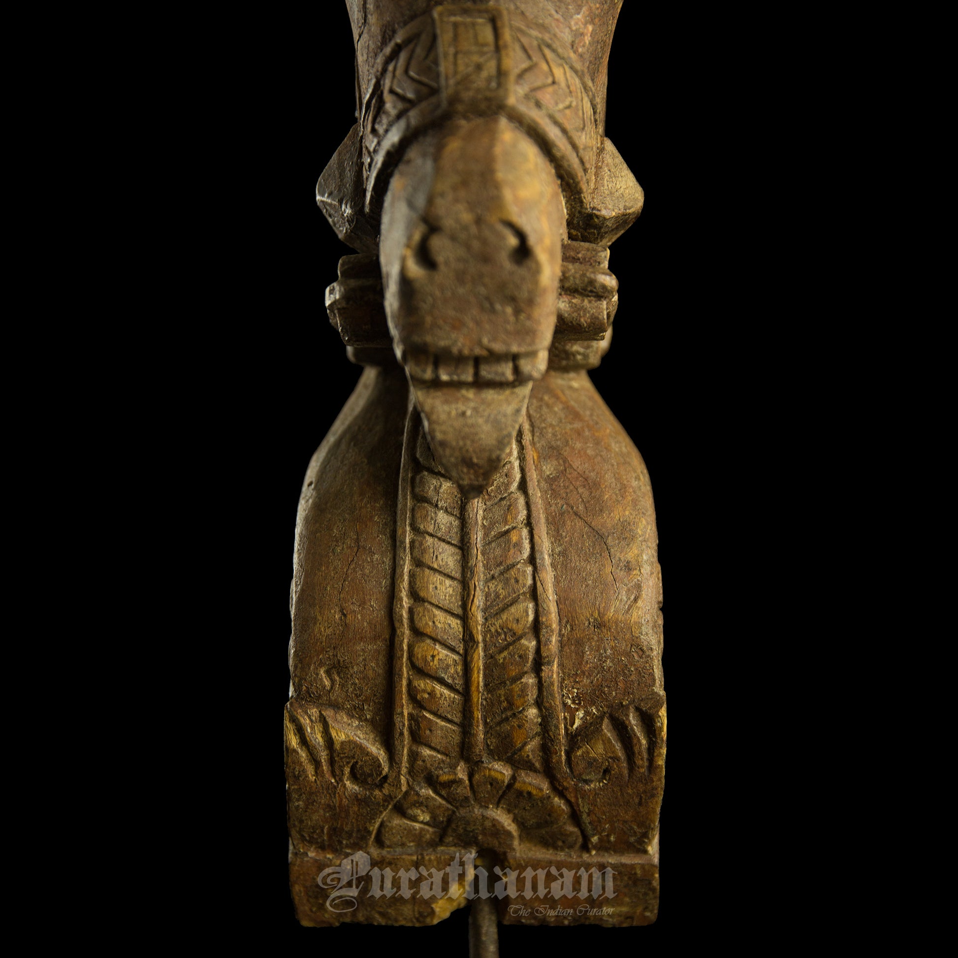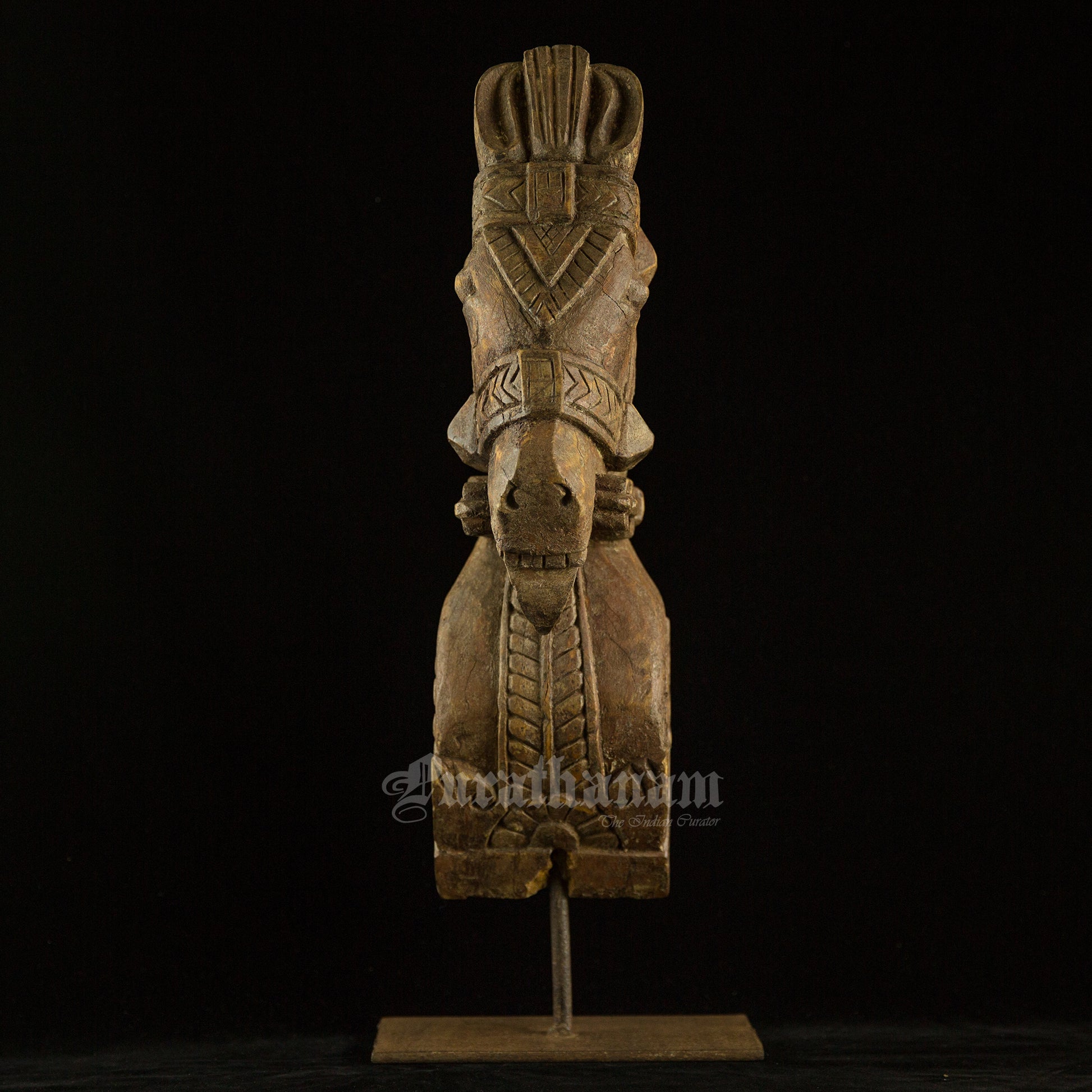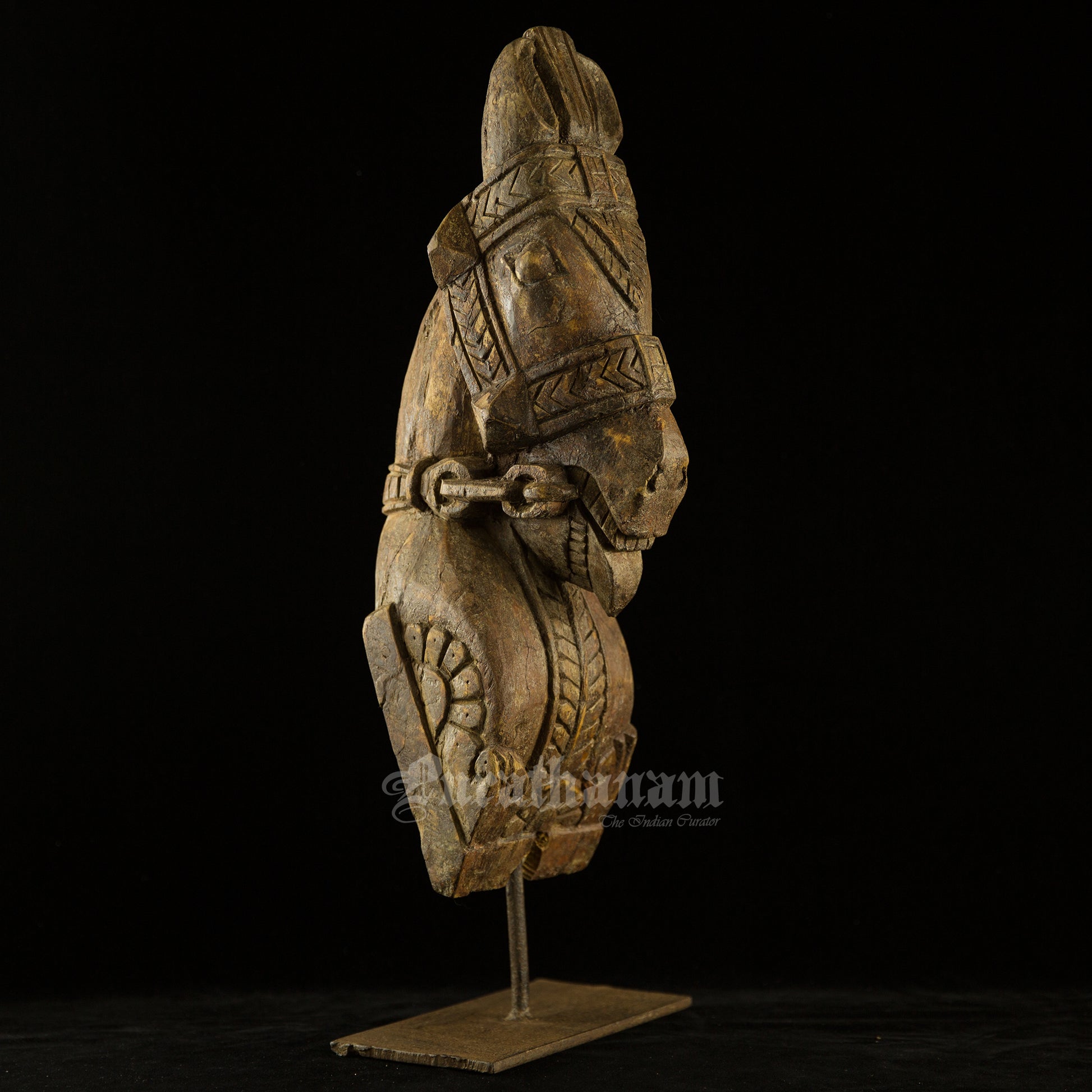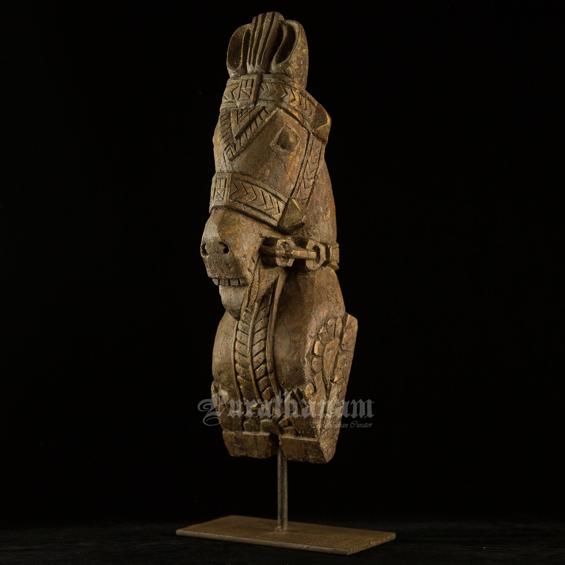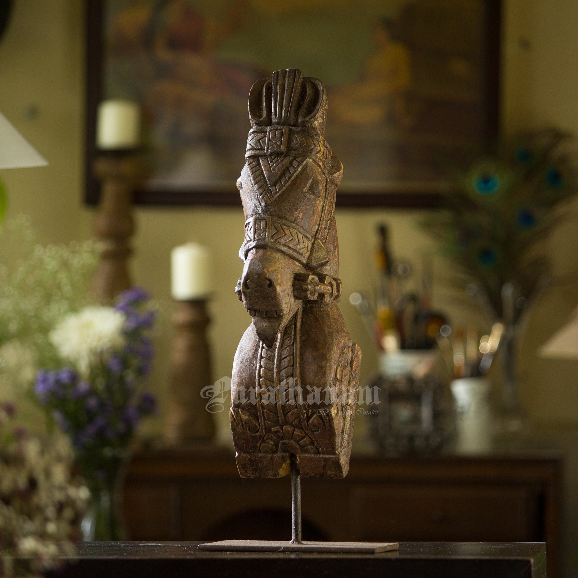 Here is a rustic look antique Horse head from Gujarat, made of Teak wood. Once part of an ornamental entrance door, this horse head has been converted to a decorative piece for your table. This horse appears at the entrance of old doors to fend of evil forces. Hand carved and etched, this is a unique set of horse heads. Even after all these years, he hasn't lost his majesty and is a gift to any space. Just a look and you sense the history of the design and ages it has gone through.