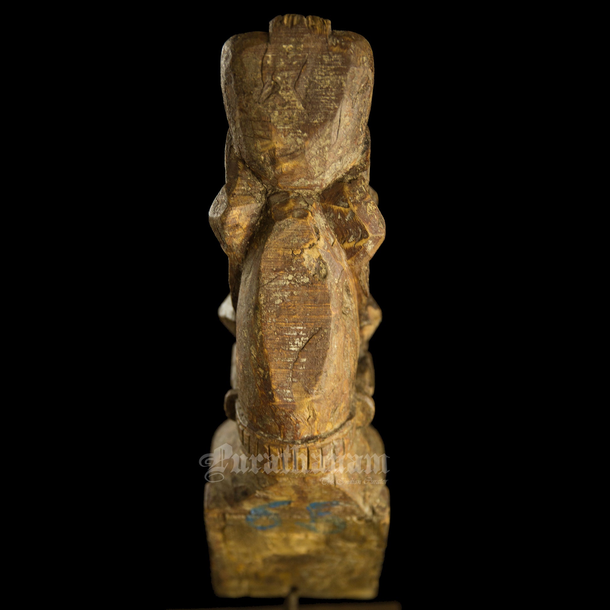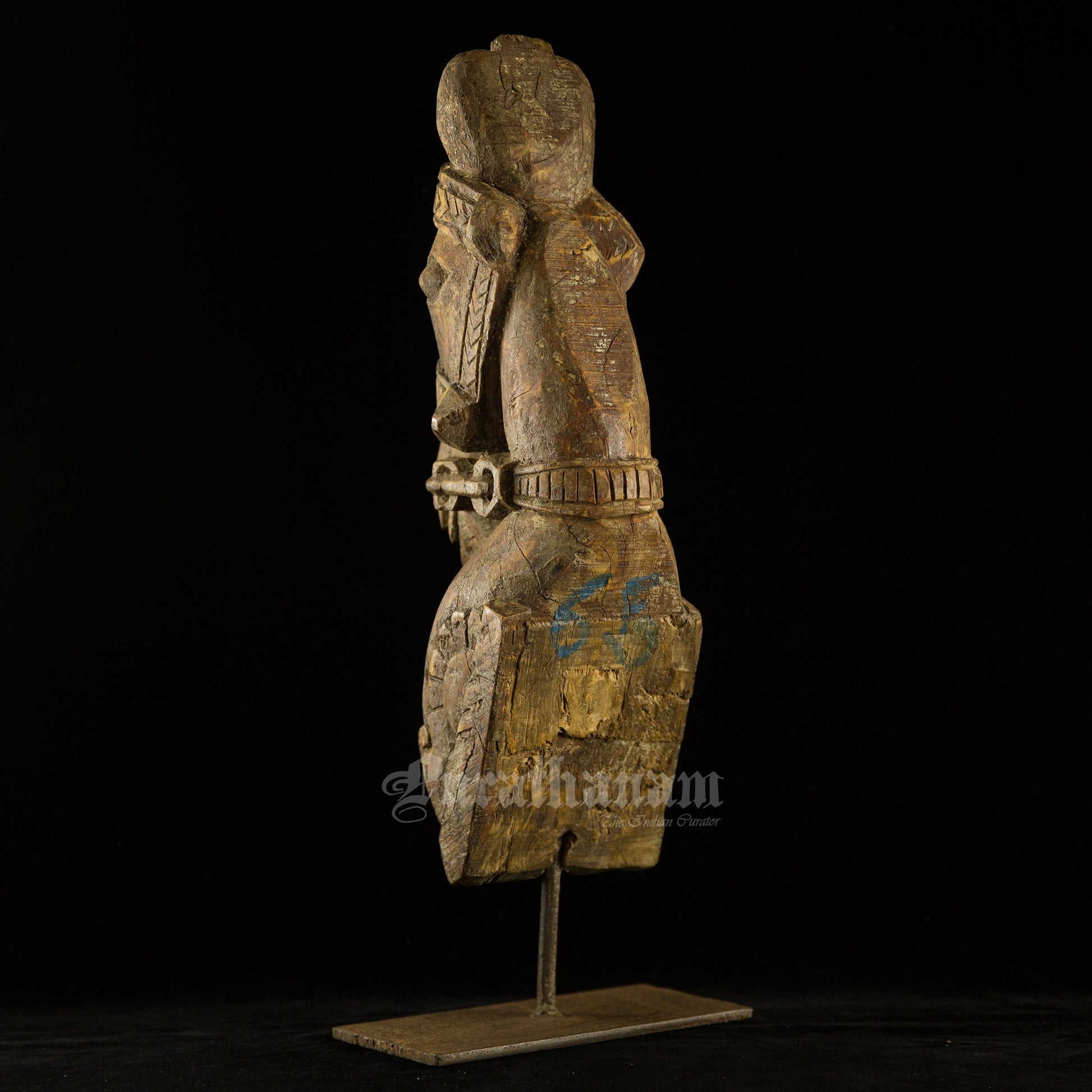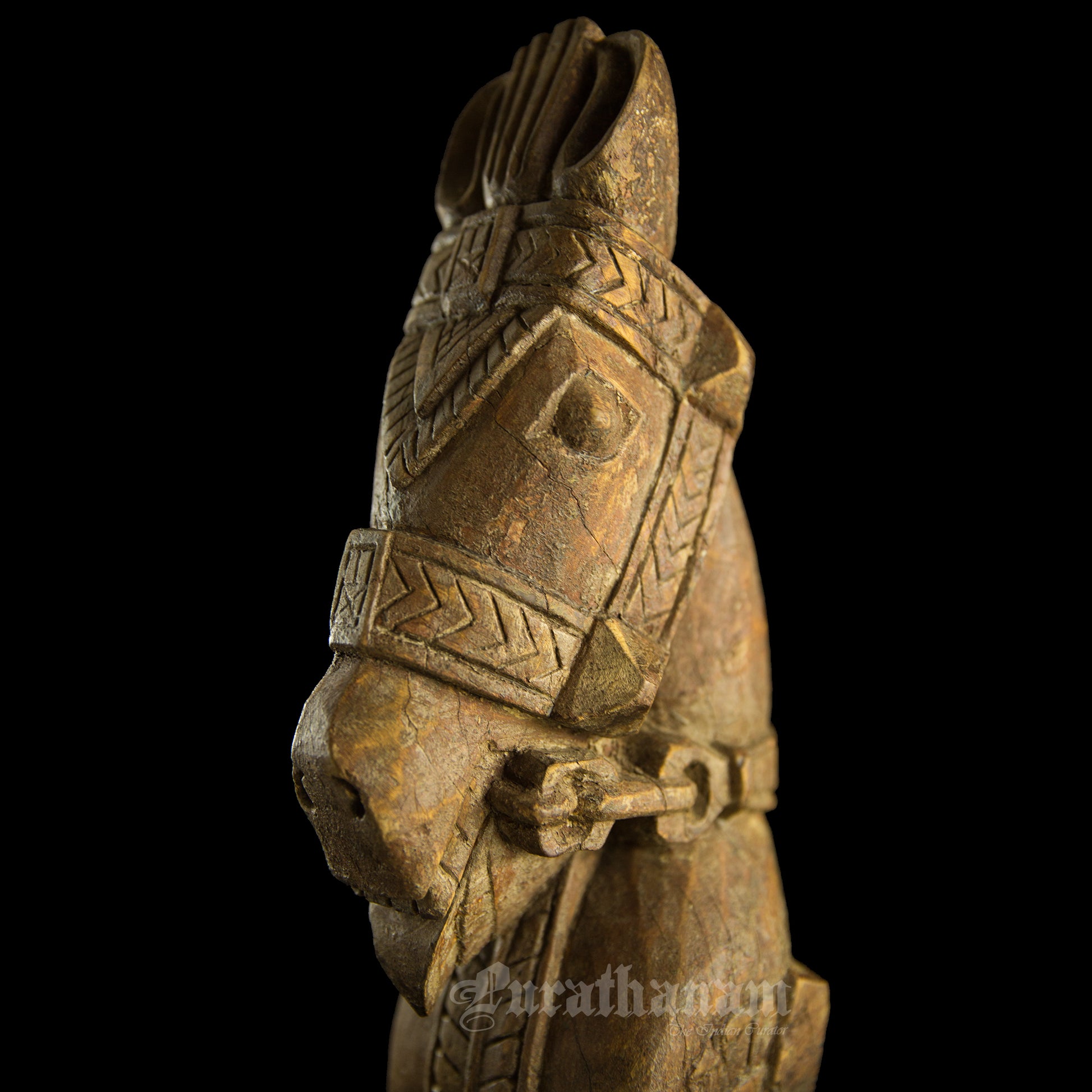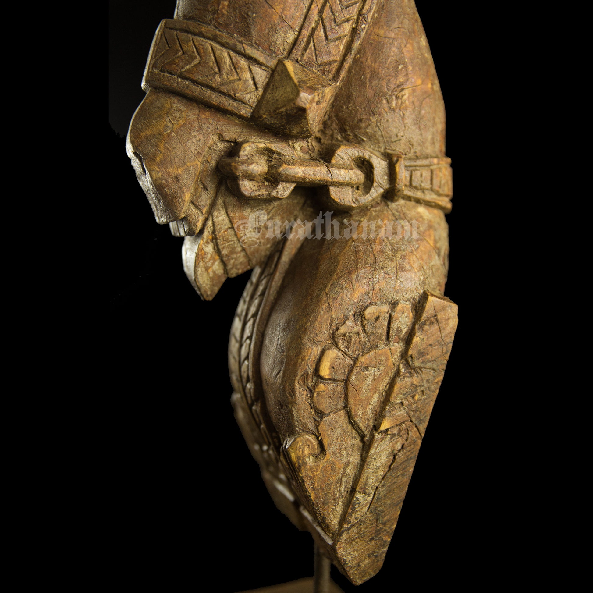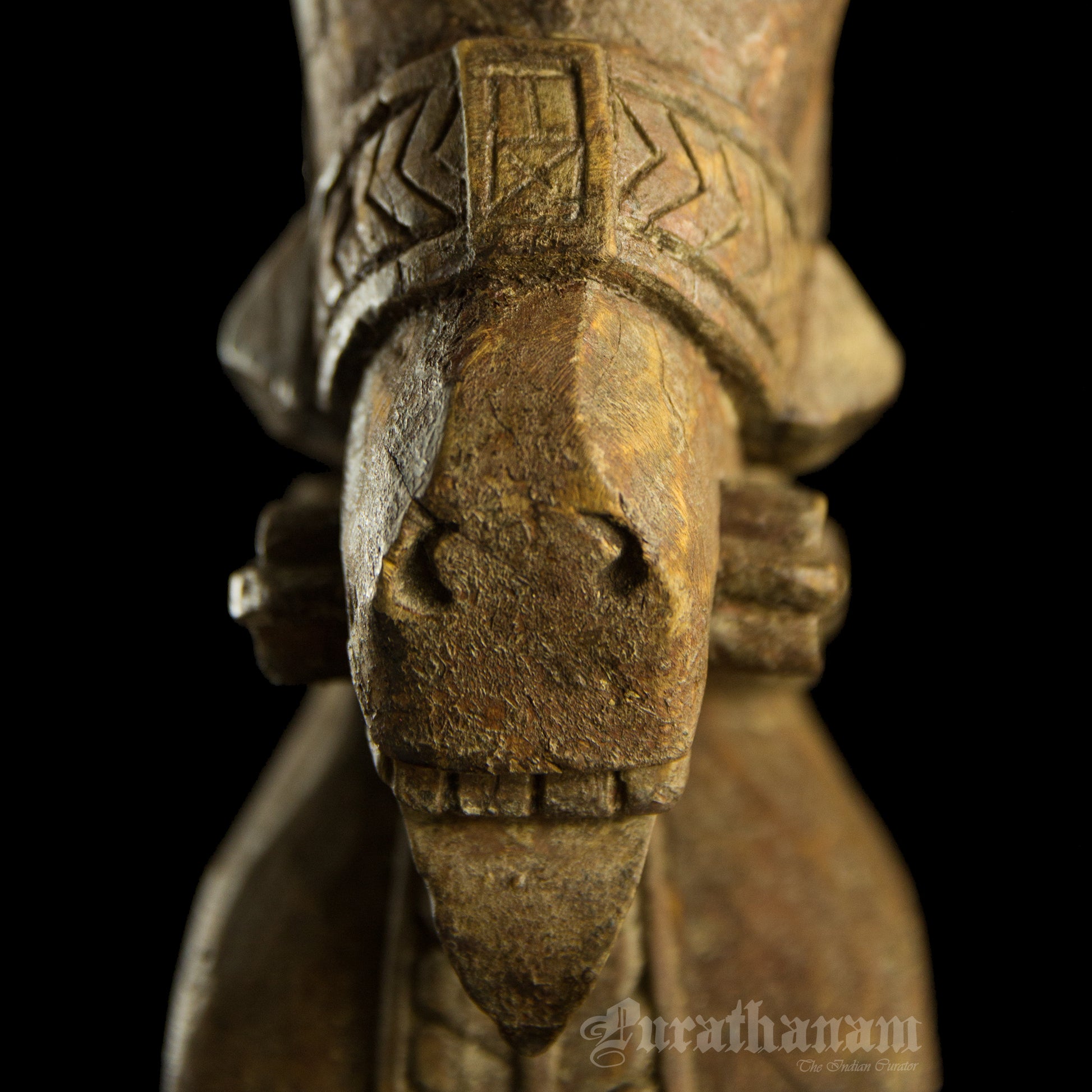 Here is a rustic look antique Horse head from Gujarat, made of Teak wood. Once part of an ornamental entrance door, this horse head has been converted to a decorative piece for your table. This horse appears at the entrance of old doors to fend of evil forces. Hand carved and etched, this is a unique set of horse heads. Even after all these years, he hasn't lost his majesty and is a gift to any space. Just a look and you sense the history of the design and ages it has gone through.