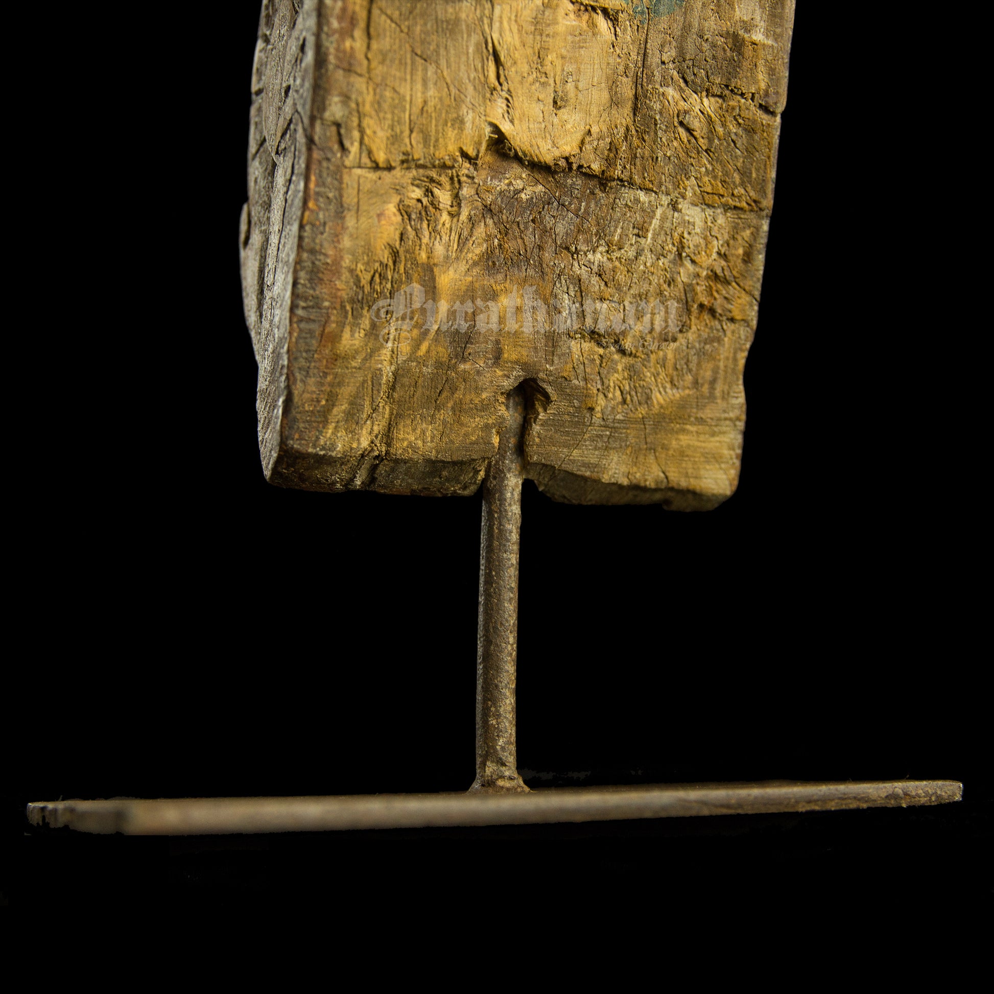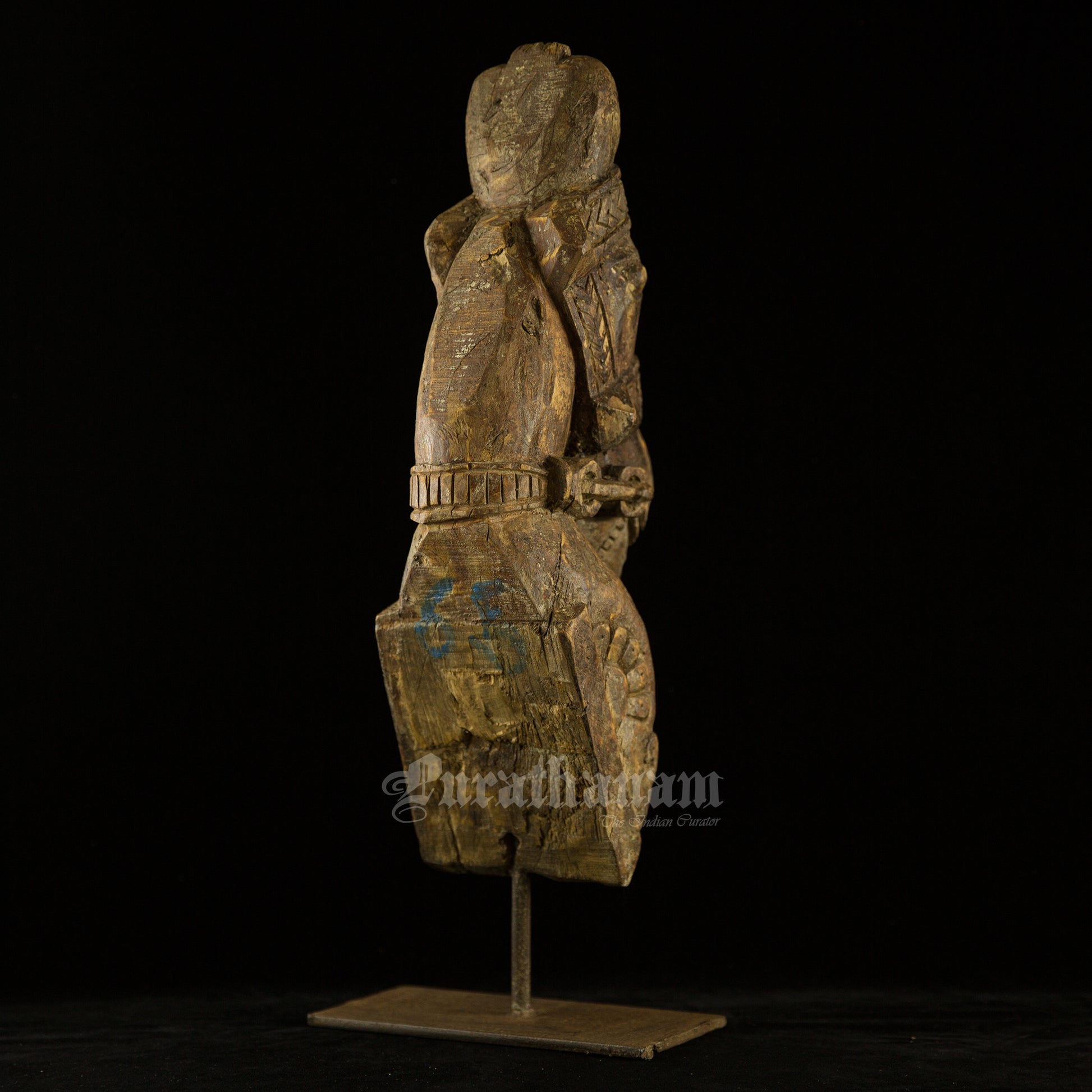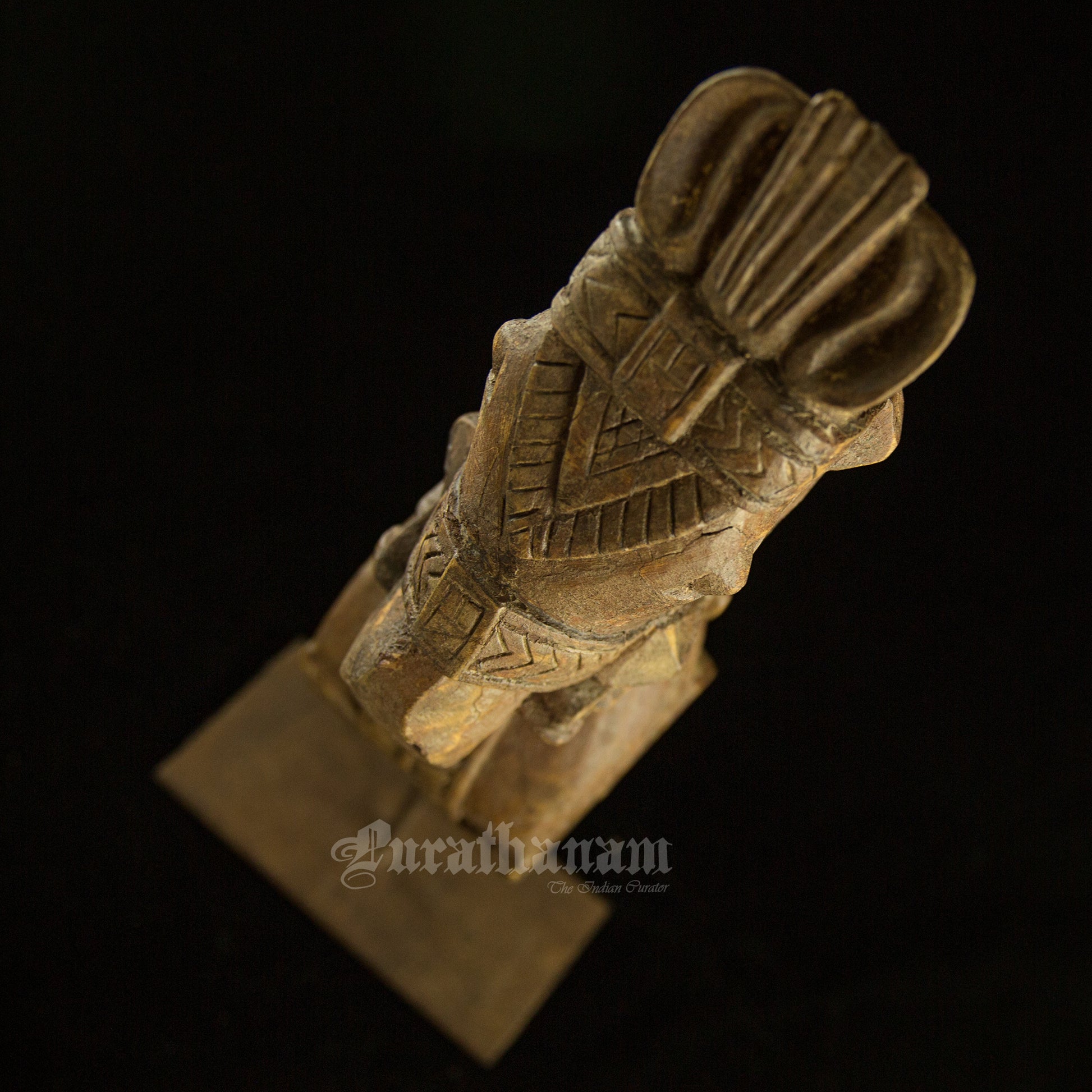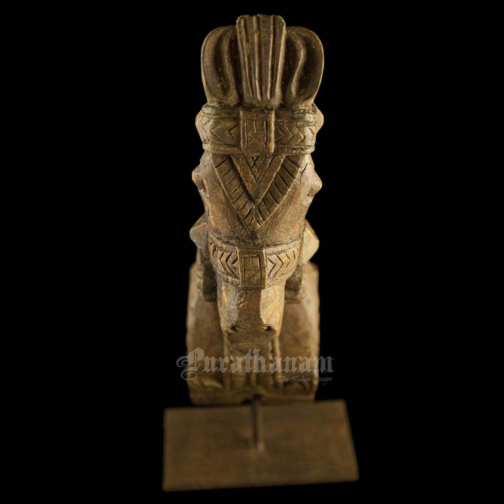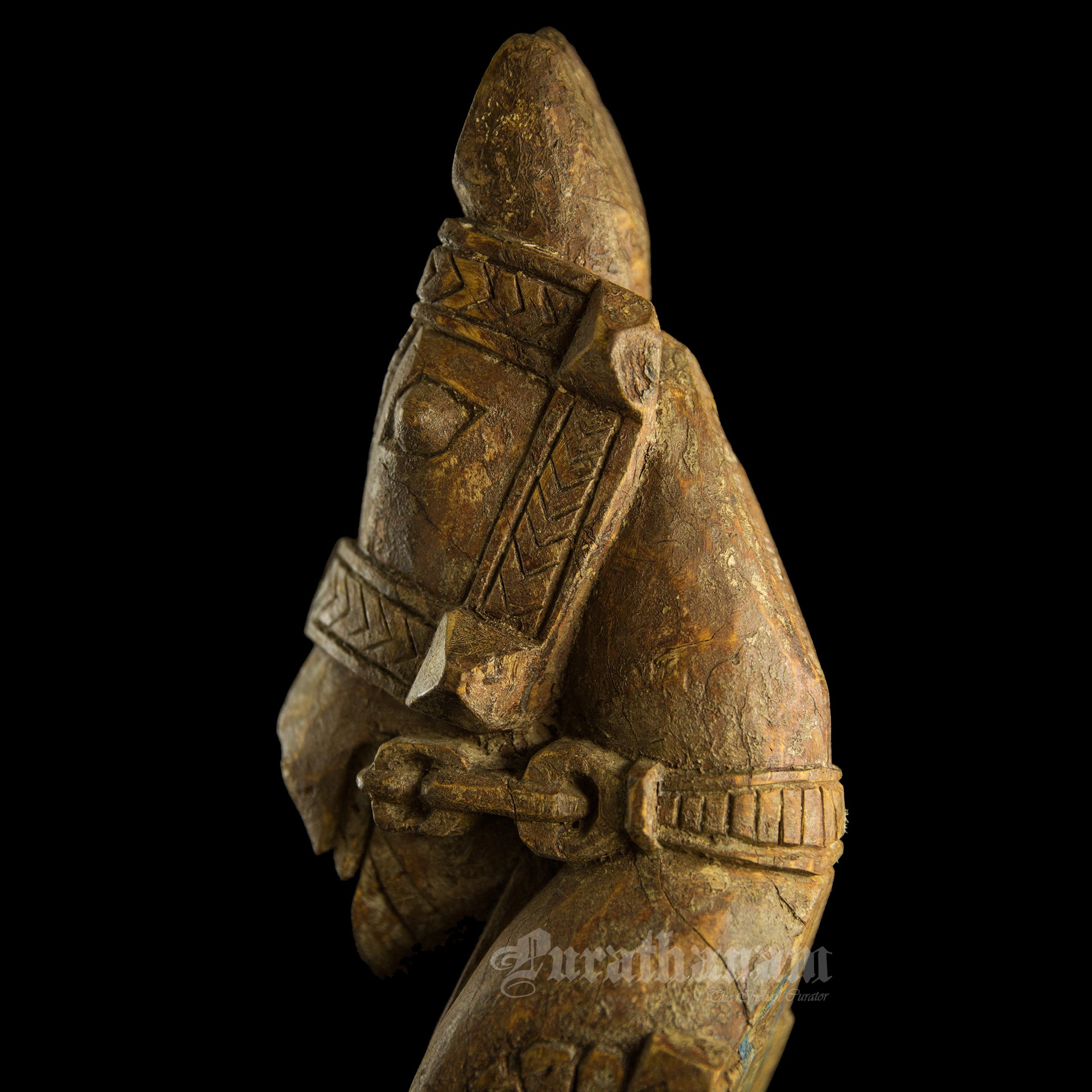 Here is a rustic look antique Horse head from Gujarat, made of Teak wood. Once part of an ornamental entrance door, this horse head has been converted to a decorative piece for your table. This horse appears at the entrance of old doors to fend of evil forces. Hand carved and etched, this is a unique set of horse heads. Even after all these years, he hasn't lost his majesty and is a gift to any space. Just a look and you sense the history of the design and ages it has gone through.