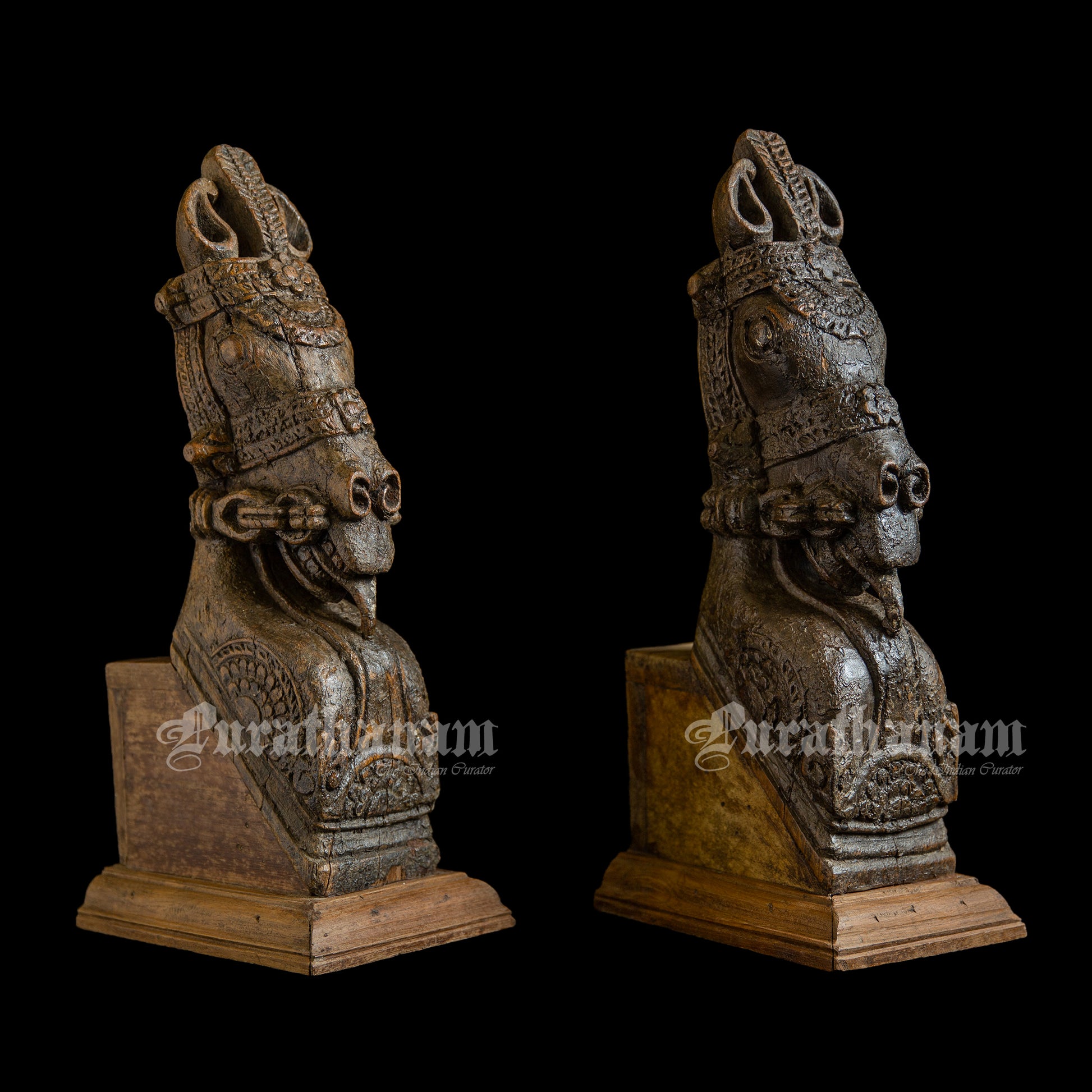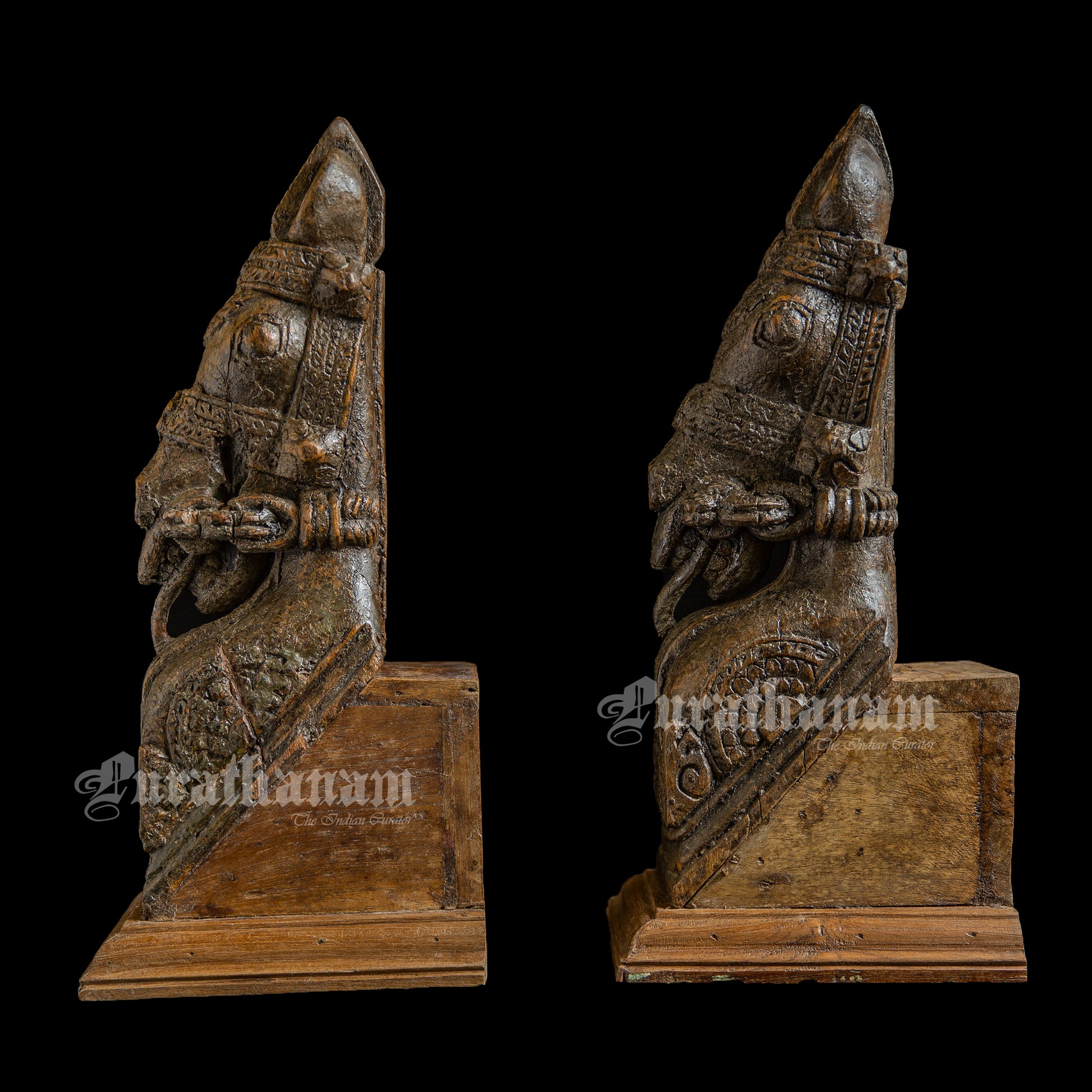 Presented here is a rustic antique Horse head, made of teak wood and over 80 years old, originating all the way from Gujarat. This Wooden Horse bracket pair has been upcycled by adding a wooden base to it. Even after all these years, it hasn't lost its majesty and is a perfect addition to any interior space. With just a glance, you can sense the history of its design and the ages it has gone through.