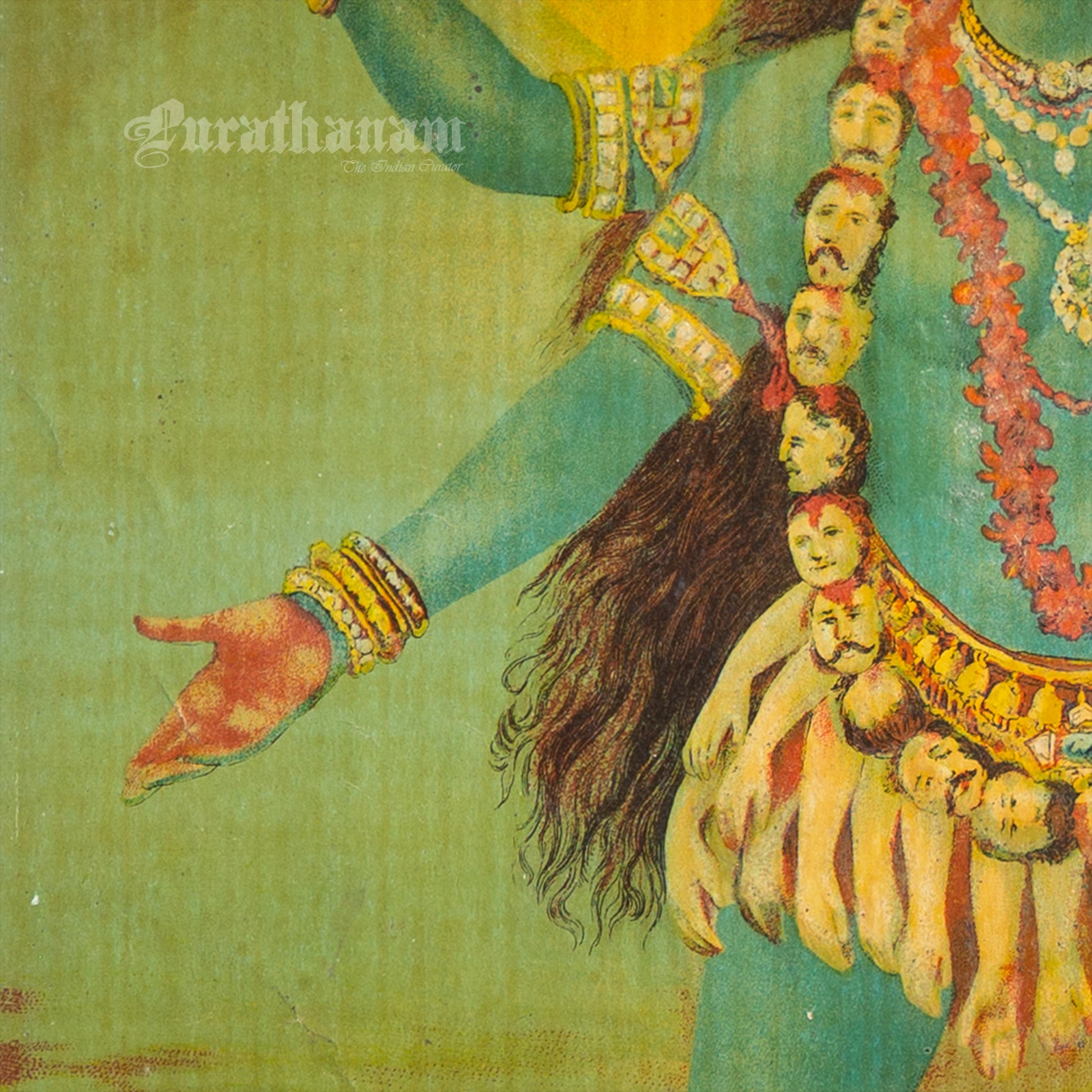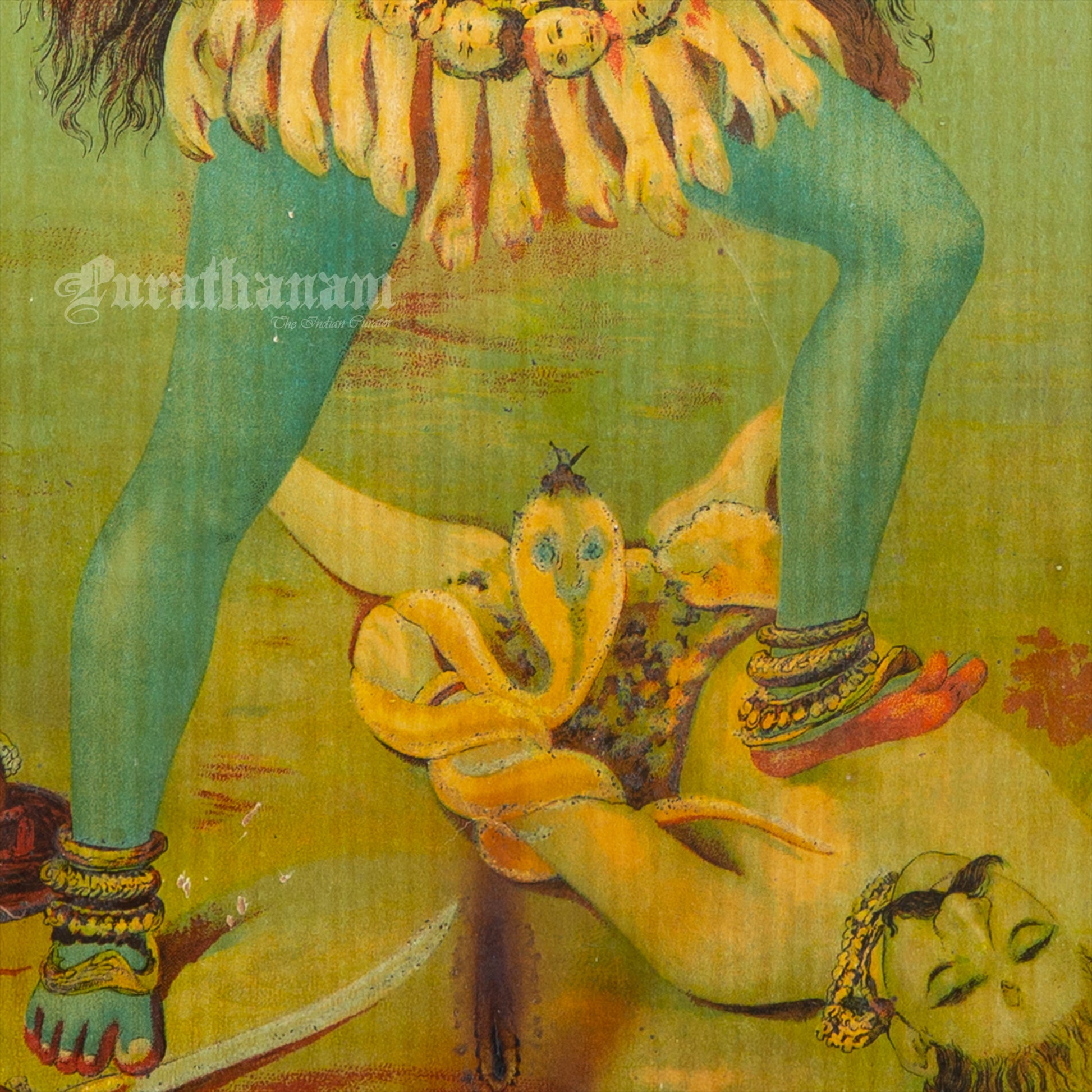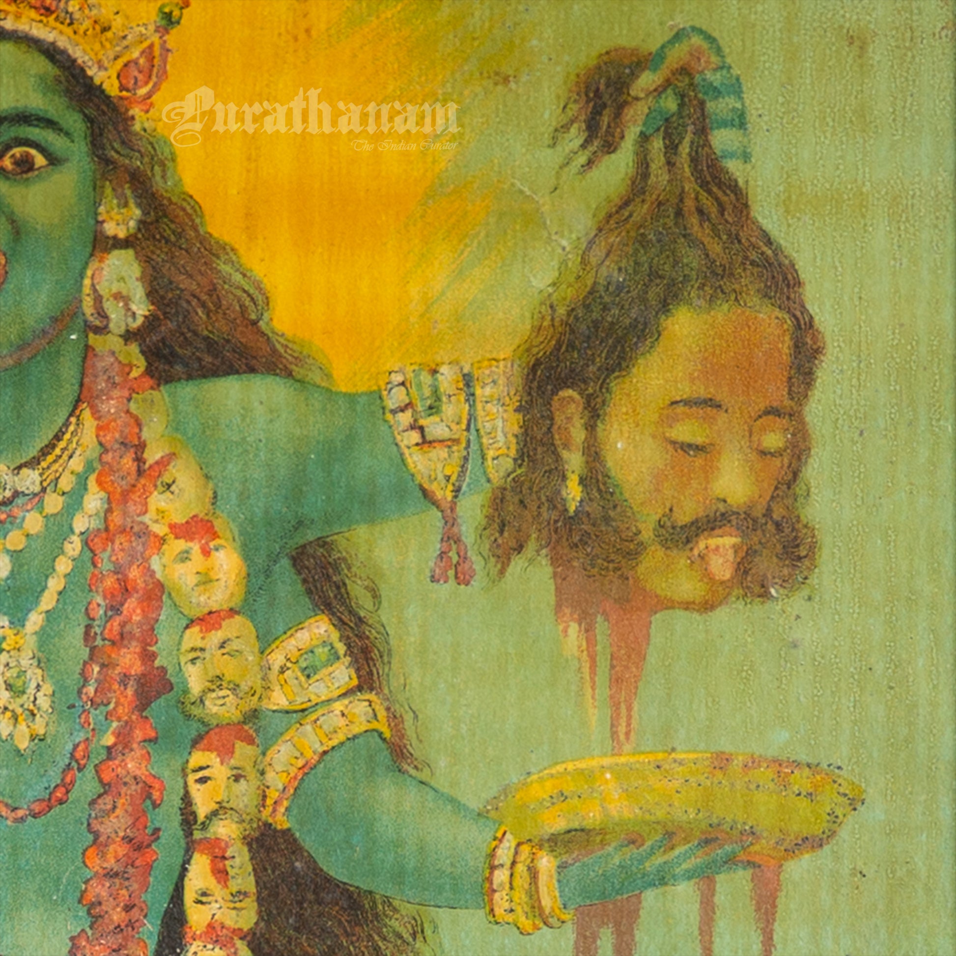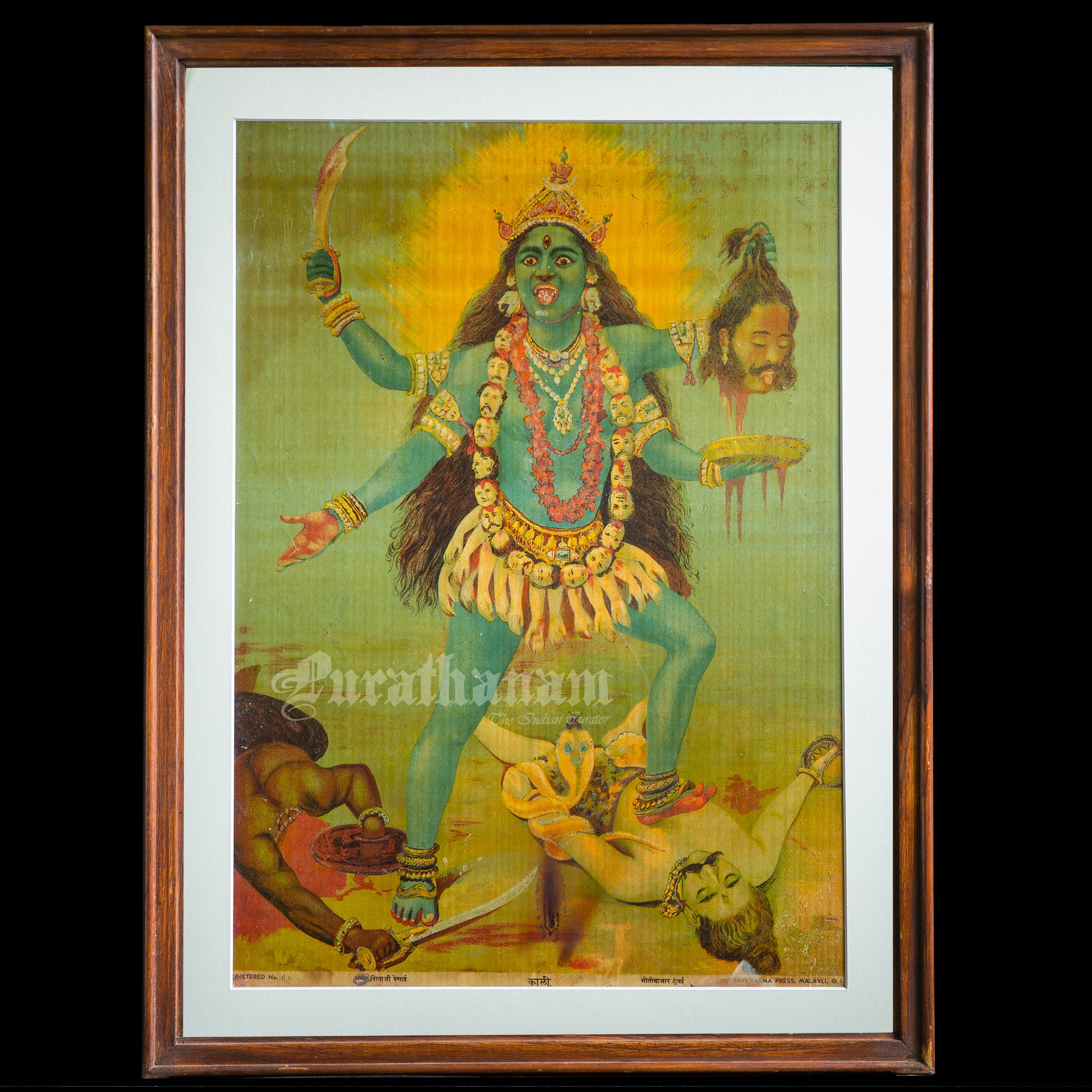 This is an oleograph print from 1920s of Kali by Ravi Varma an Indian who achieved recognition for his depiction of scenes from the epics of the Mahabharata and Ramayana.