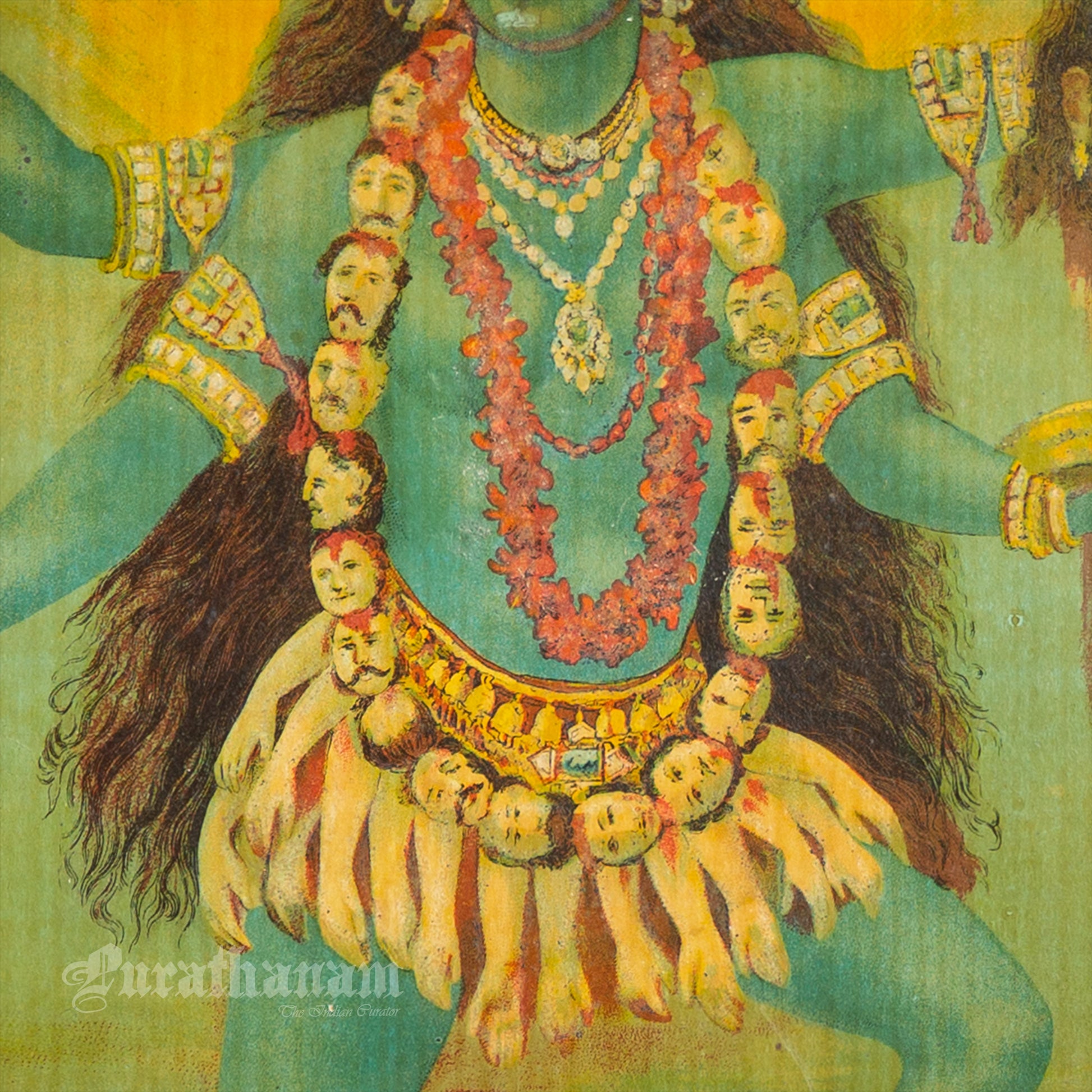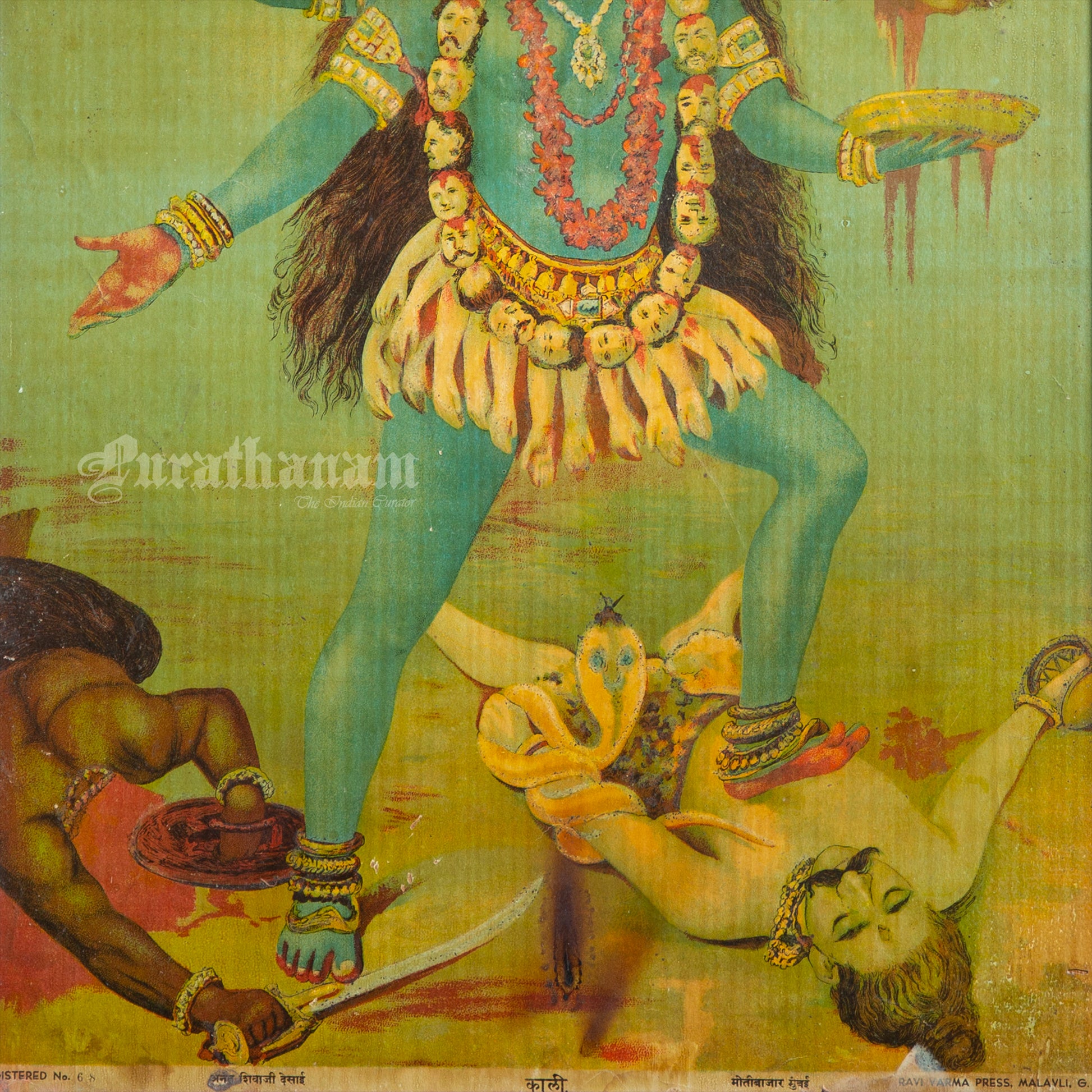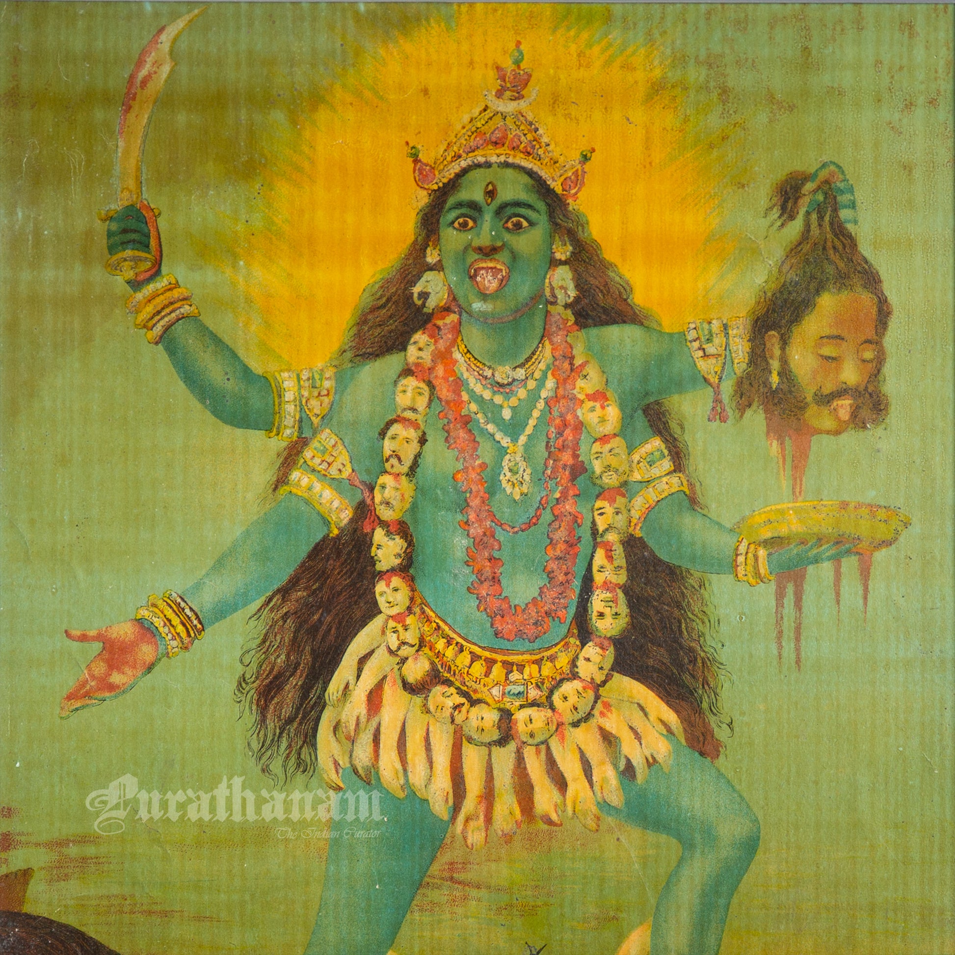 This is an oleograph print from 1920s of Kali by Ravi Varma an Indian who achieved recognition for his depiction of scenes from the epics of the Mahabharata and Ramayana.