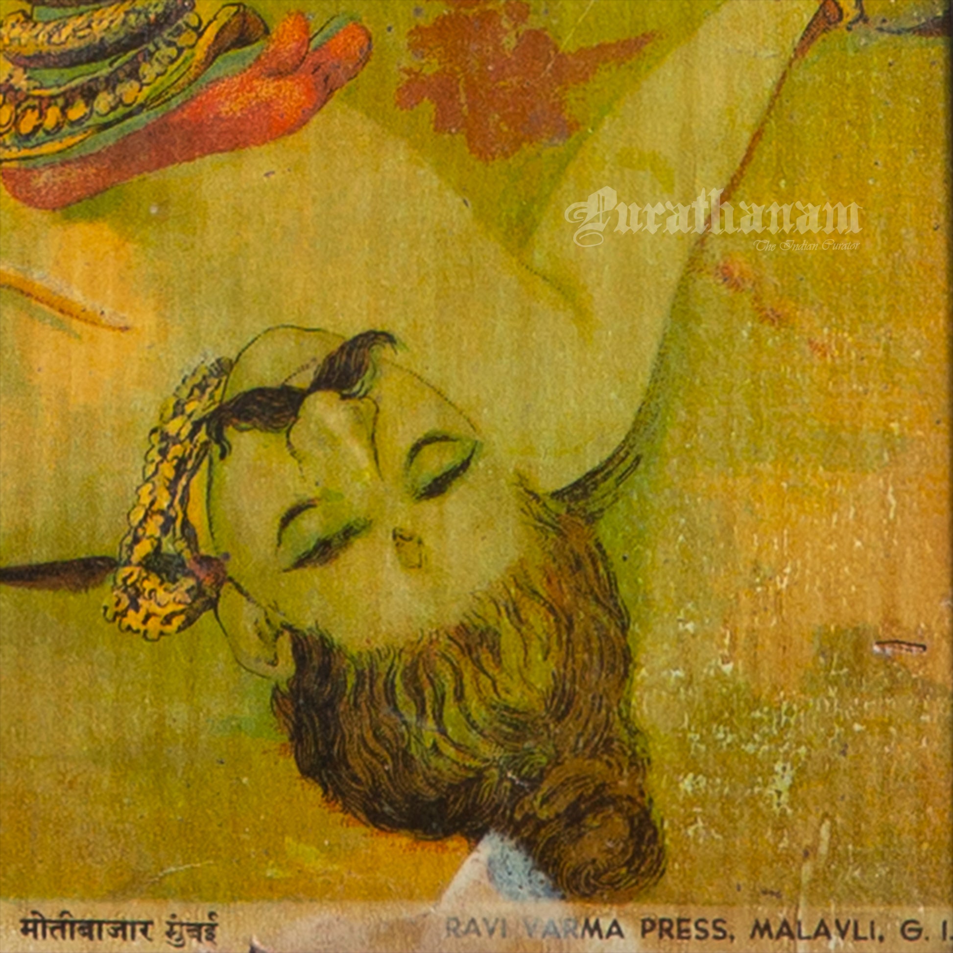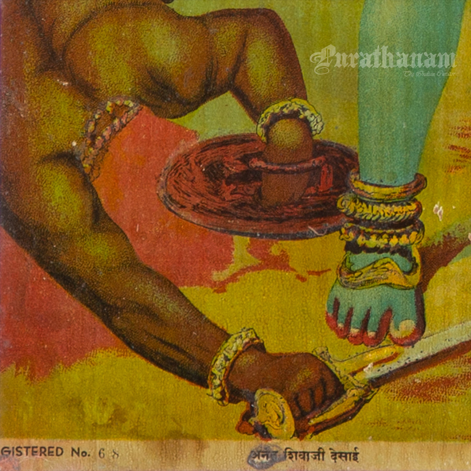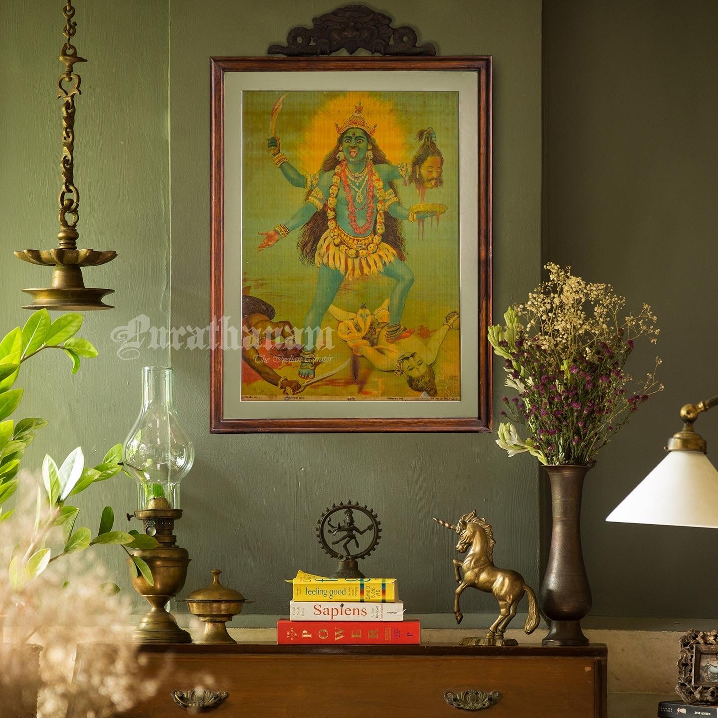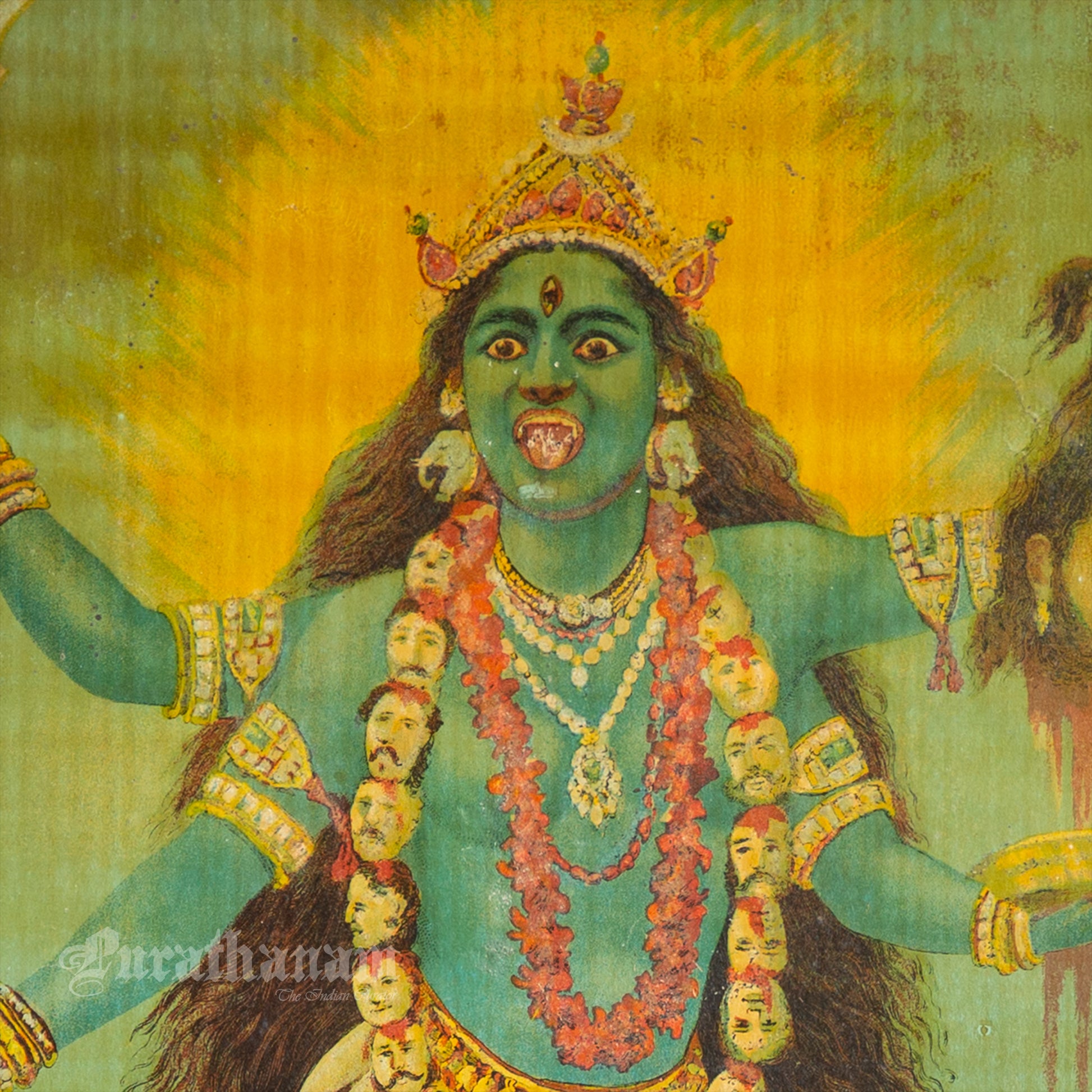 This is an oleograph print from 1920s of Kali by Ravi Varma an Indian who achieved recognition for his depiction of scenes from the epics of the Mahabharata and Ramayana.