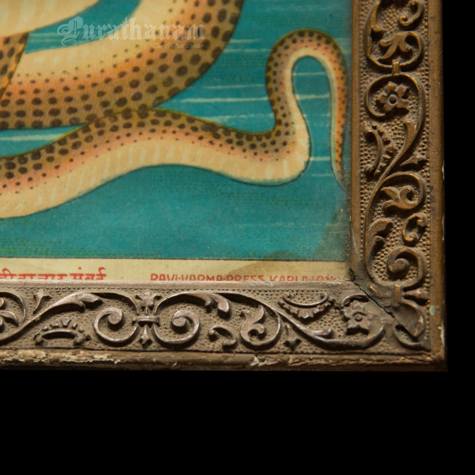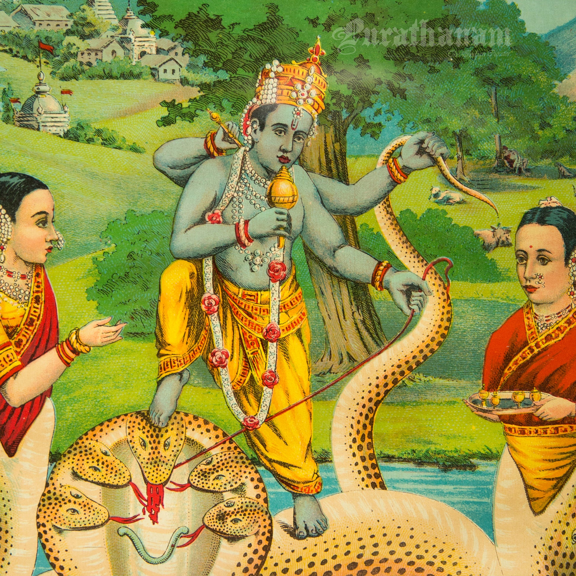 This is an oleograph print from 1920s- 1930s of Kaliyamardhan by Ravi Varma an Indian painter who achieved recognition for his depiction of scenes from the epics of the Mahabharata and Ramayana.