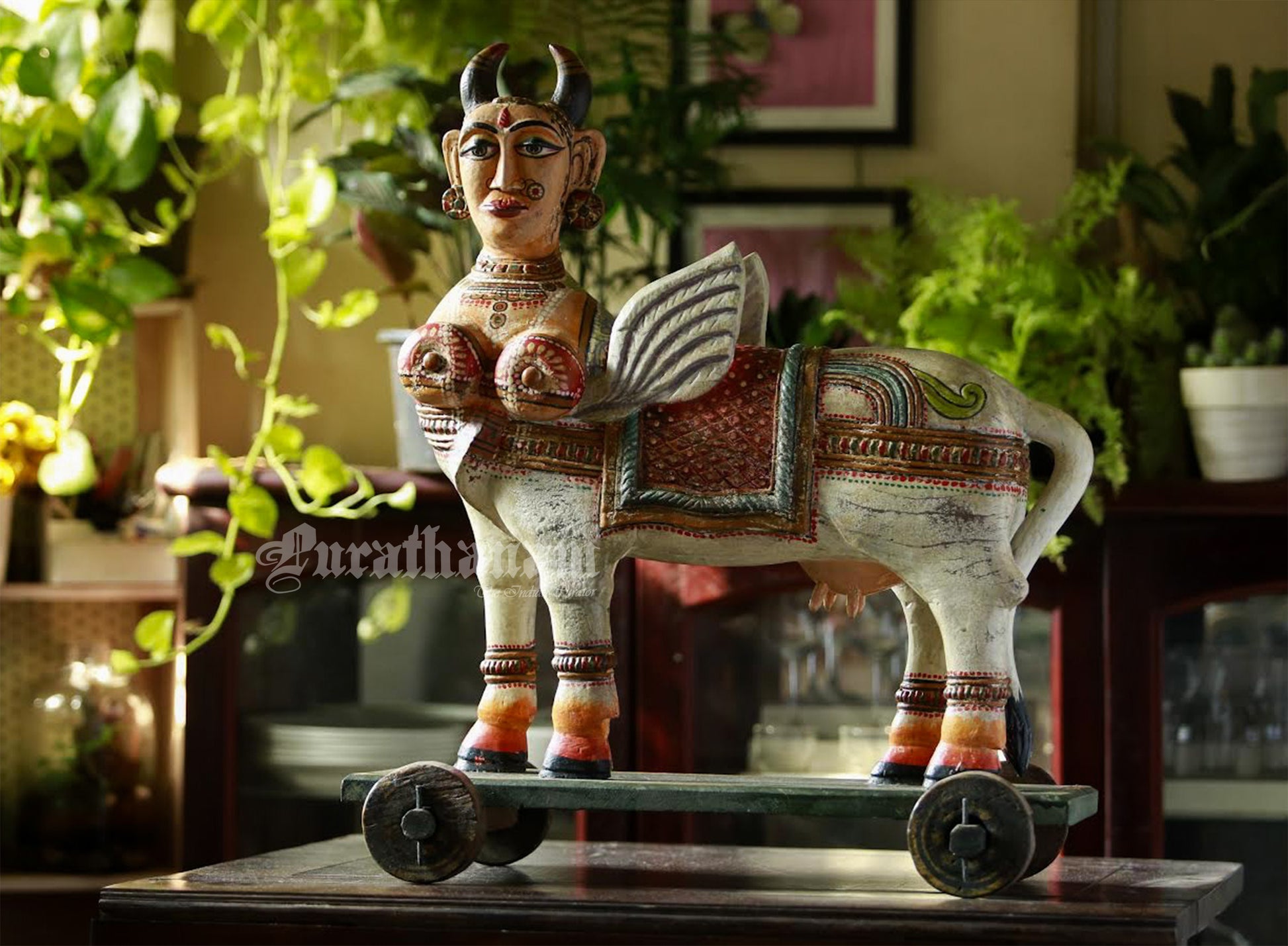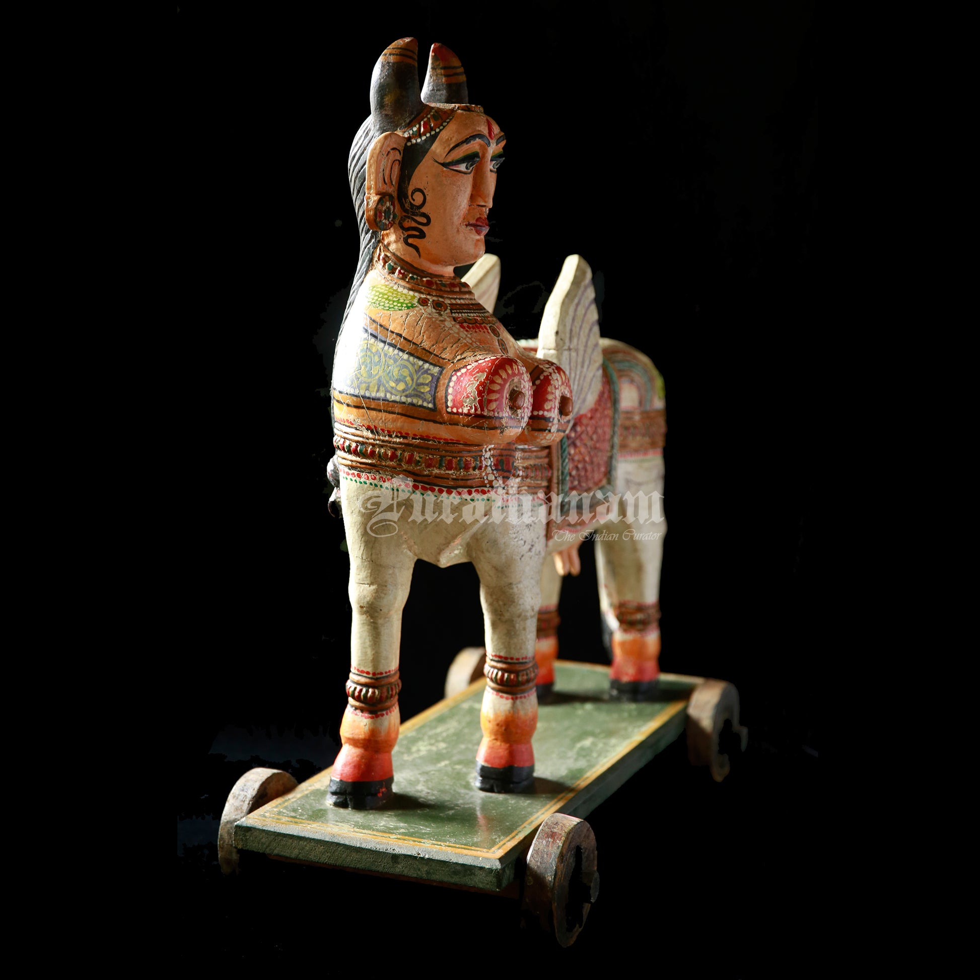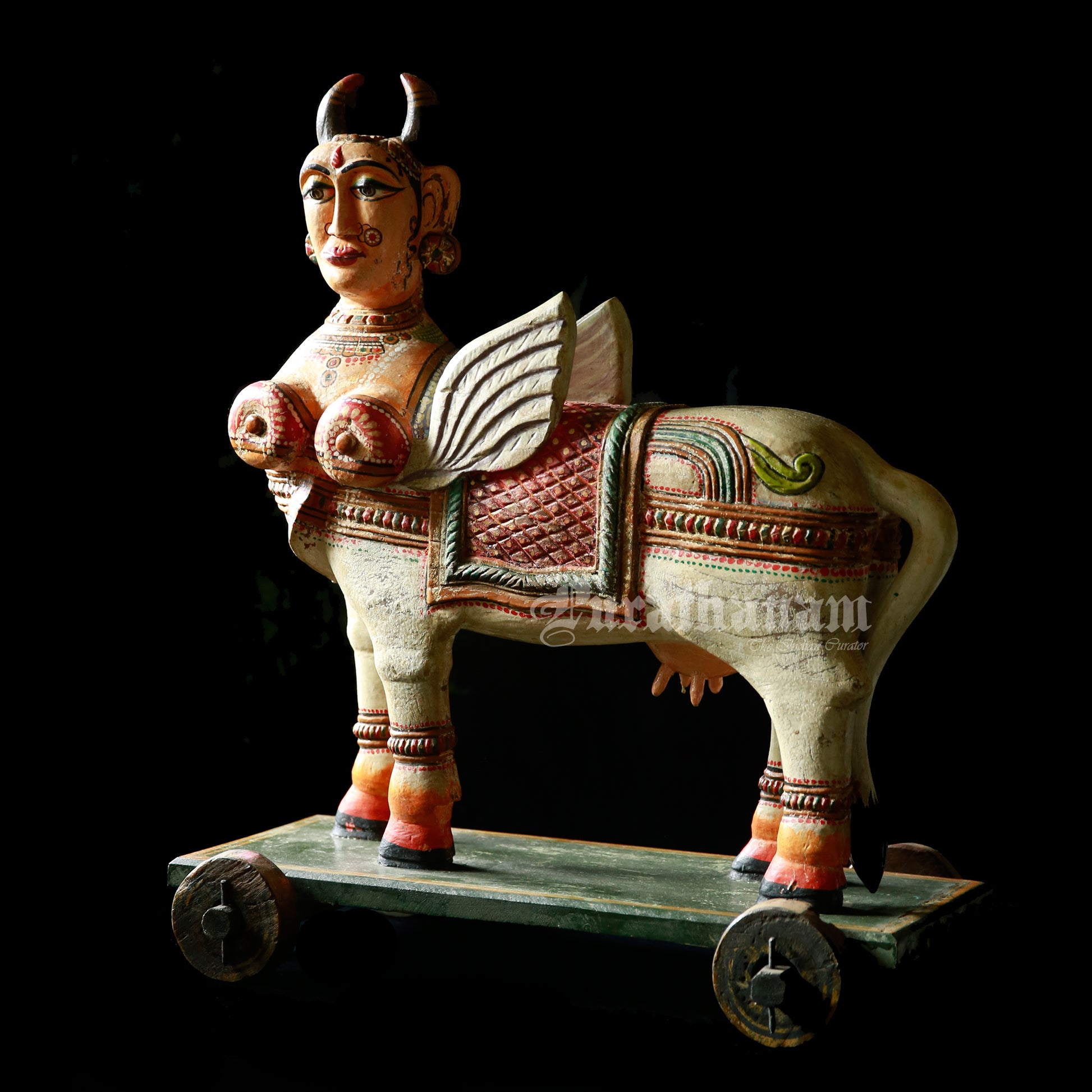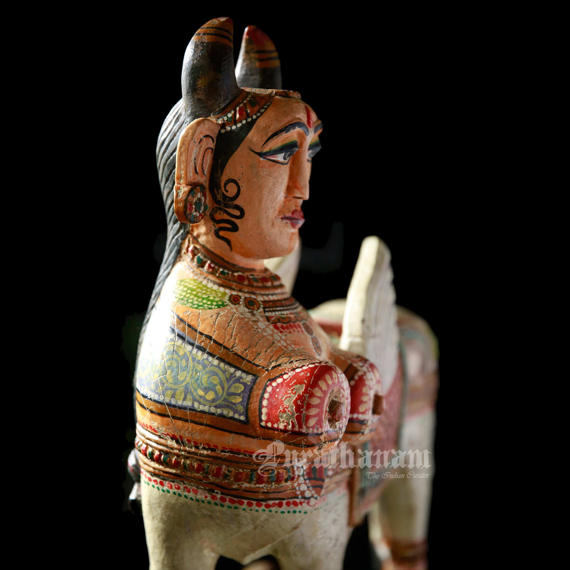 Vintage Wood Polychrome Kamadenu from Tamil Nadu!! The Indian symbol of prosperity is not just a positive charm but also a symbol of the traditional wood polychrome temple art of South. This bold piece can bring the attention to itself and mesmerise you for minutes together. This vintage pice of tradition is a popular choice among collectors. Fall in love with art and tradition everyday.