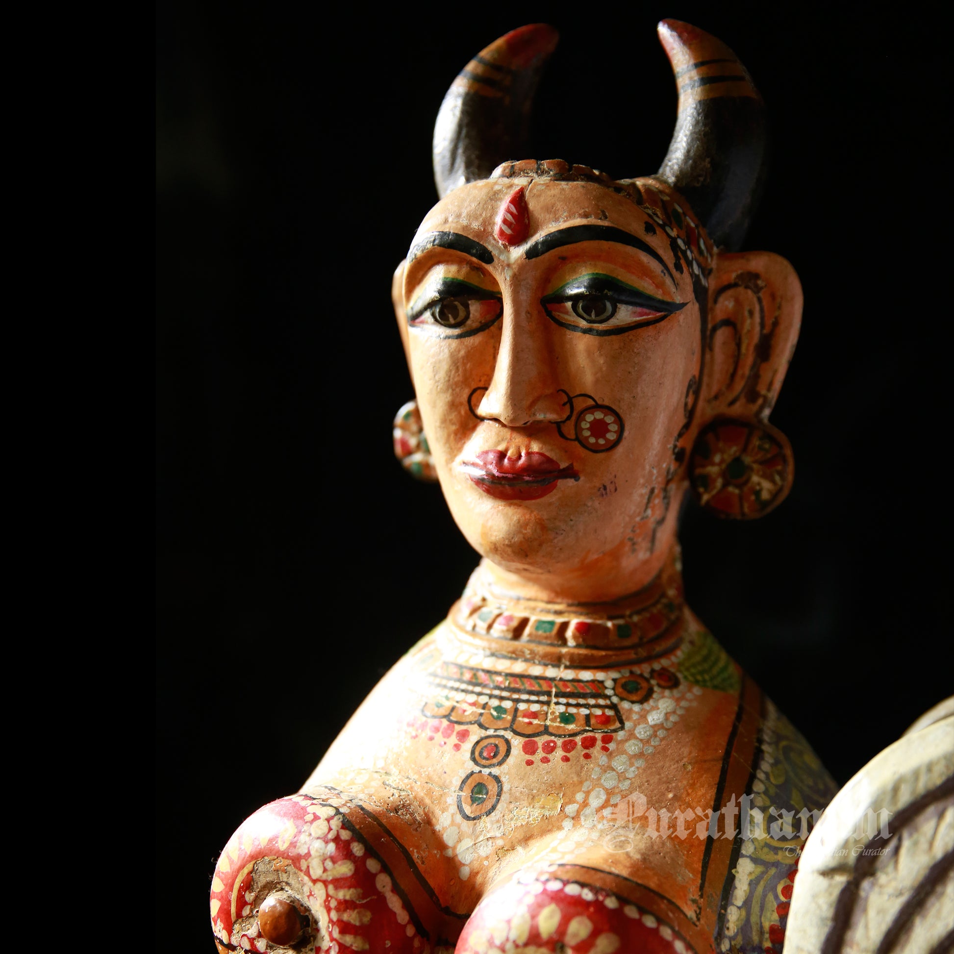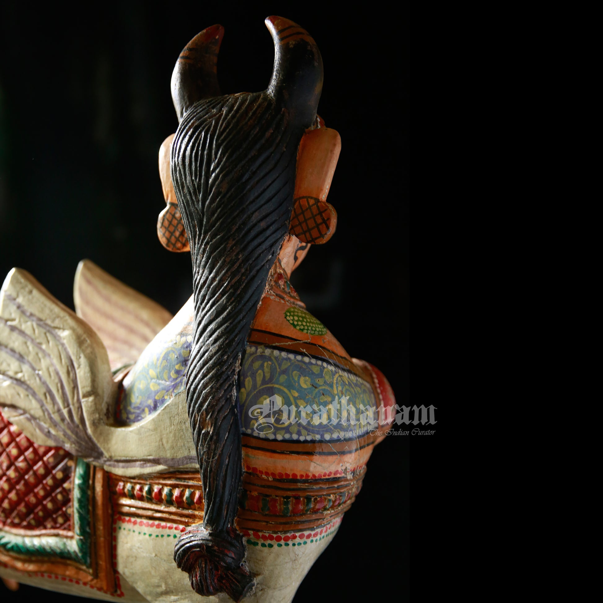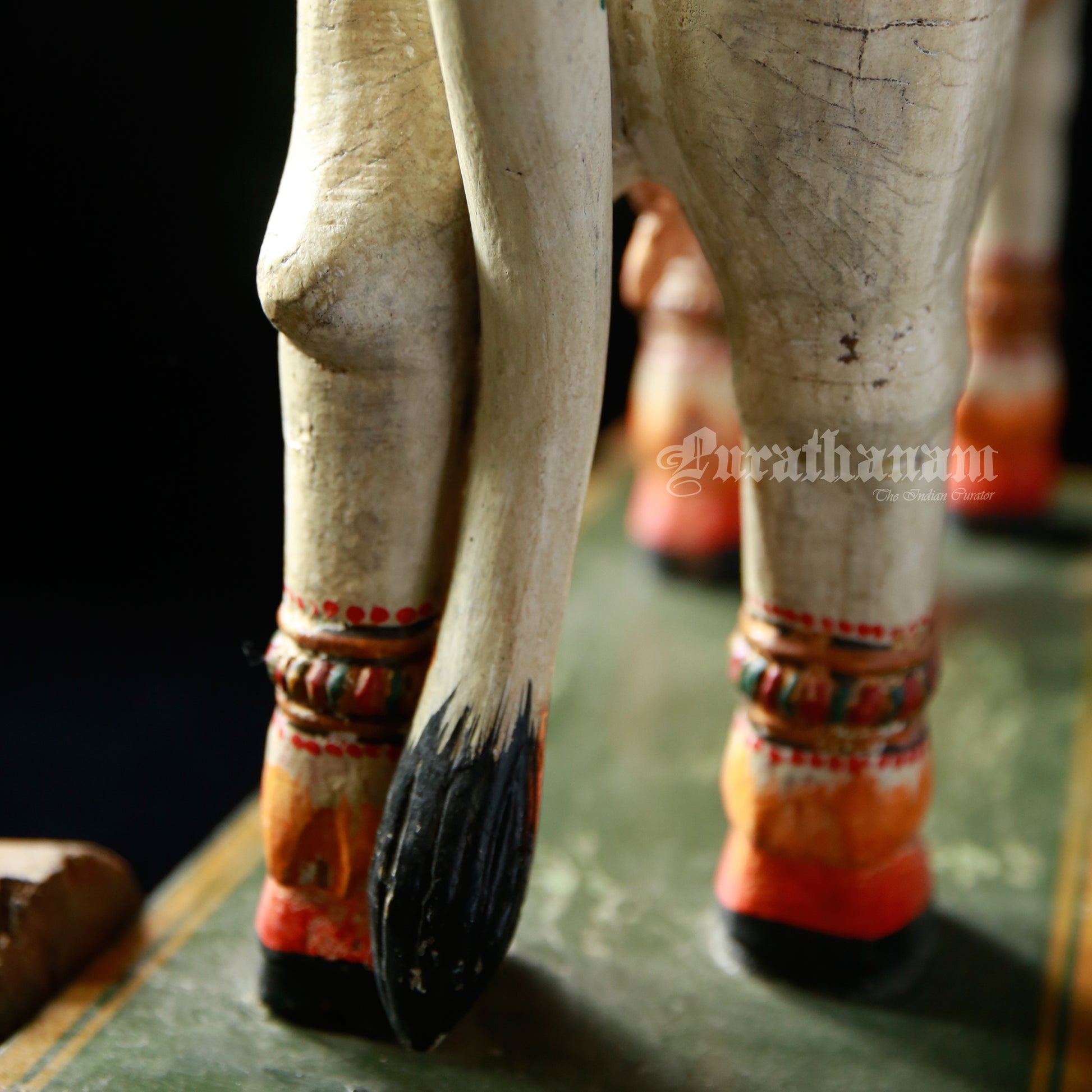 Vintage Wood Polychrome Kamadenu from Tamil Nadu!! The Indian symbol of prosperity is not just a positive charm but also a symbol of the traditional wood polychrome temple art of South. This bold piece can bring the attention to itself and mesmerise you for minutes together. This vintage pice of tradition is a popular choice among collectors. Fall in love with art and tradition everyday.