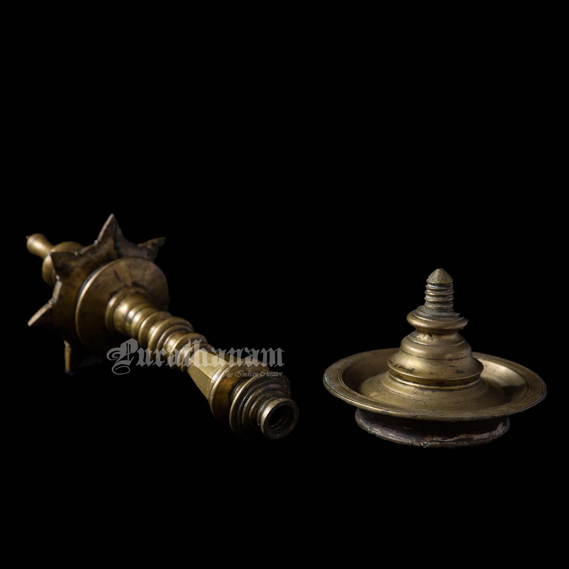 This oil lamp is called Kashi Samai Kuthuvilakku with 7 wick, made of Brass. It is about 80+ years old. This lamp could be dismantled in to 2 parts. These kind of lamps are common in Kerala, Tamilnadu and northern Srilanka as these places have historical connections since 10th century from the time of Chola period.