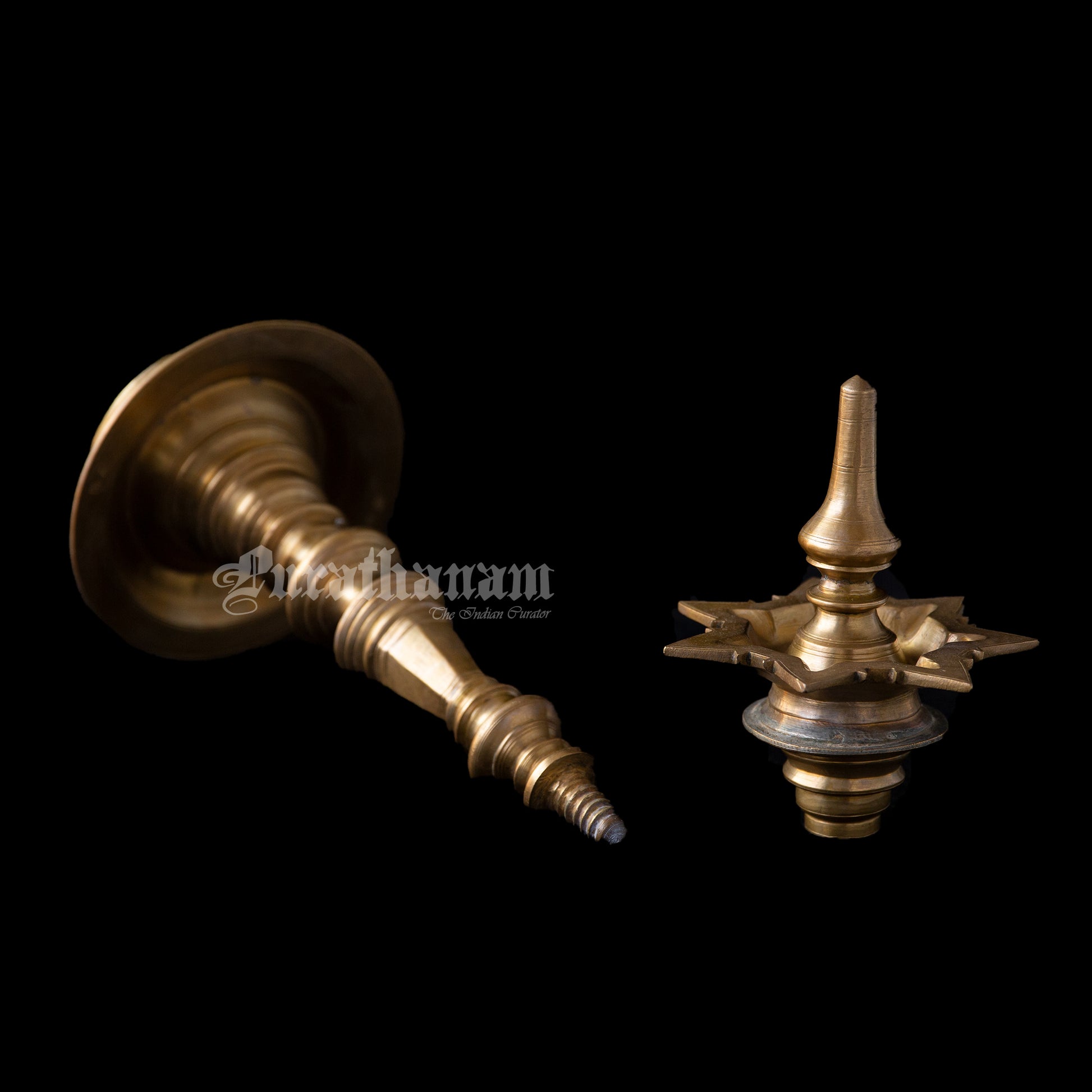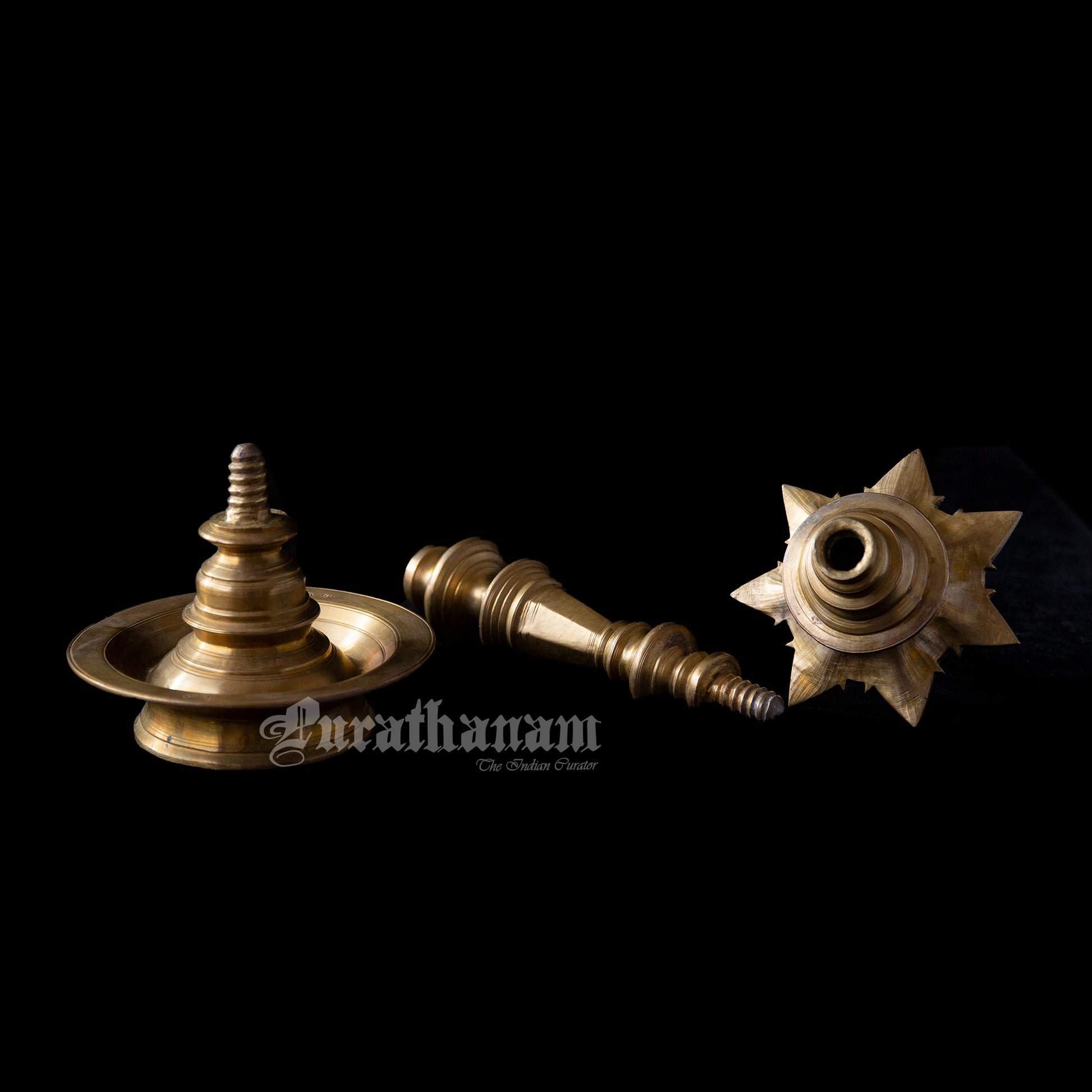 Kuthuvilakku consists of four parts which are screwed together. The base plate is called "Keezhbagam" , the Pivotal pillar is called "kandam", the oil well with five or 7 wicks is called "Thanguli", and the crown is called "Prabhai". Each Kuthu vilakku has different crowns. Eg. Annapakshi (Swan), Peacock, Kashi Samai Kuthuvilaku etc,.