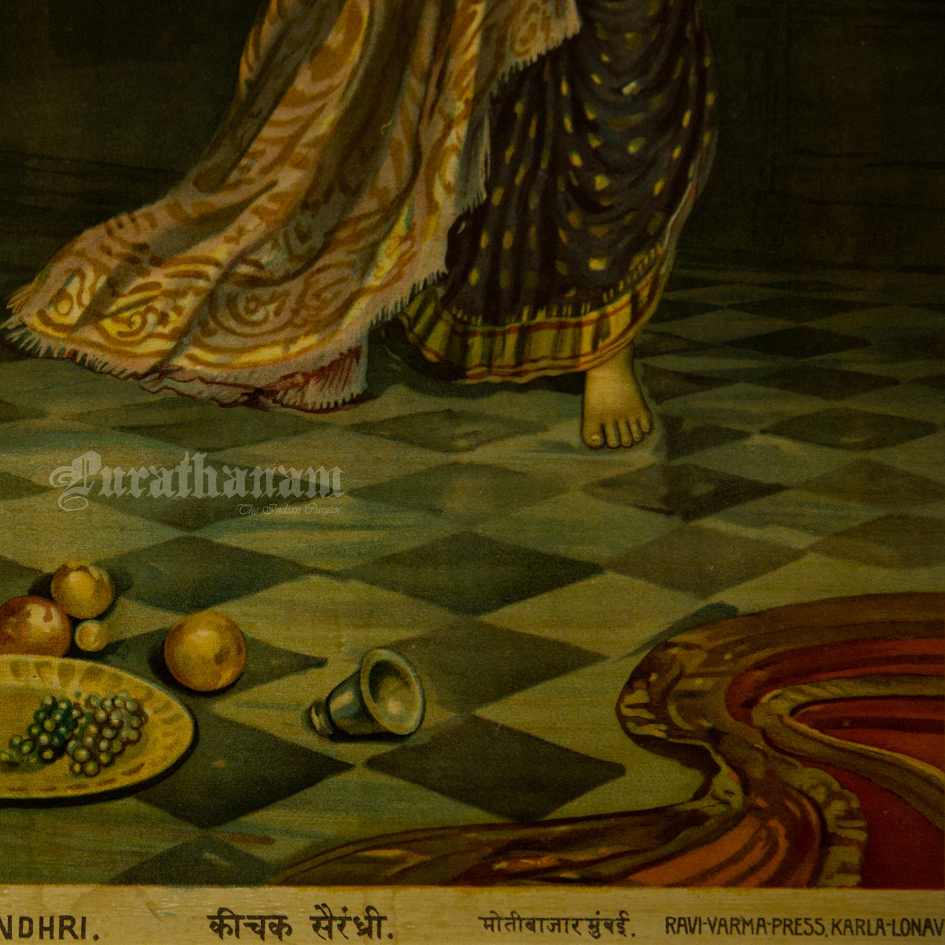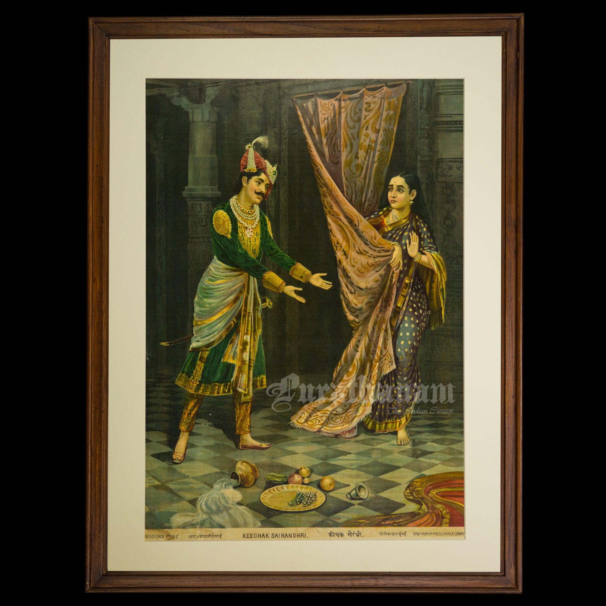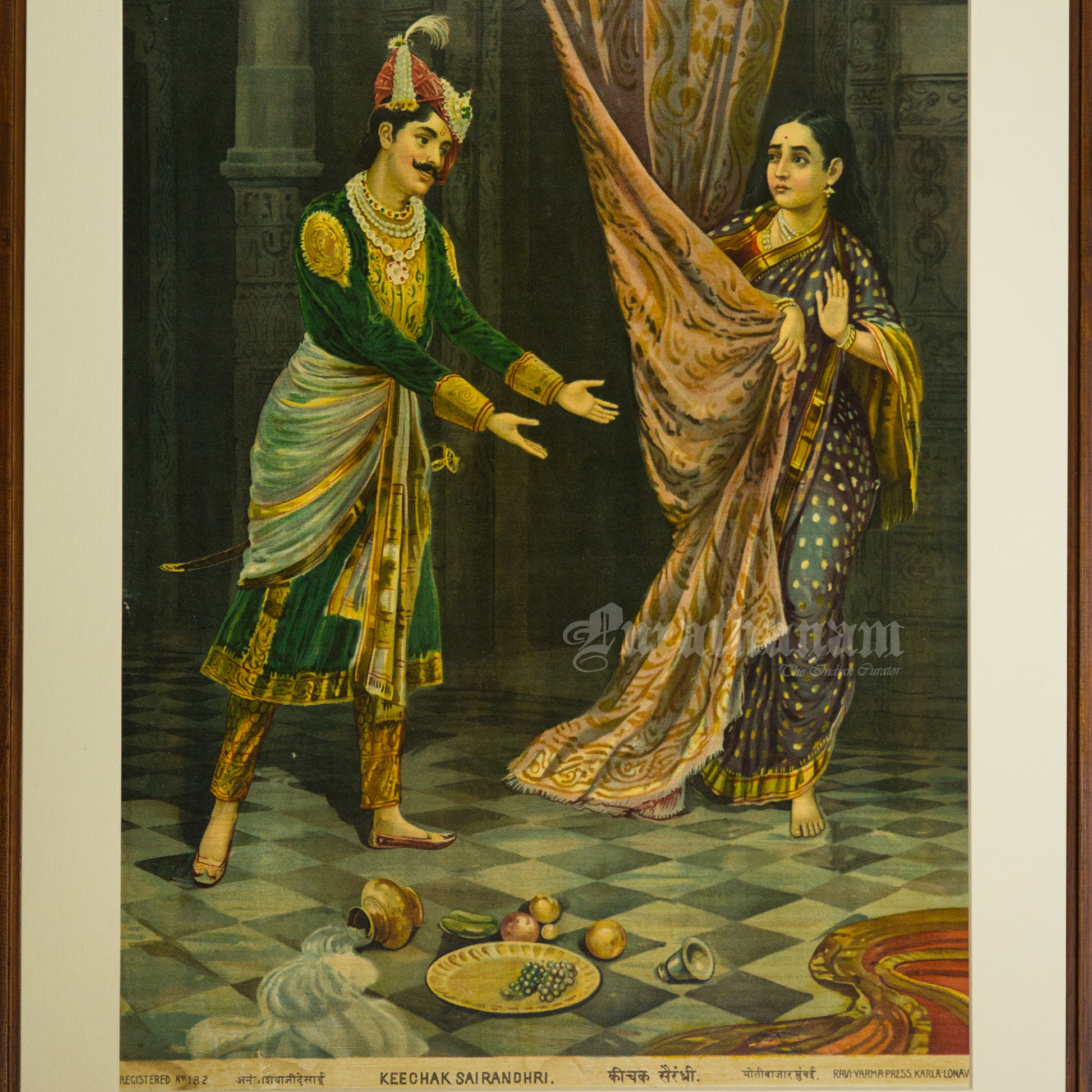 This is an oleograph print from 1920s of Keechak Sairandhri by Ravi Varma an Indian who achieved recognition for his depiction of scenes from the epics of the Mahabharata and Ramayana.What is Oleography?