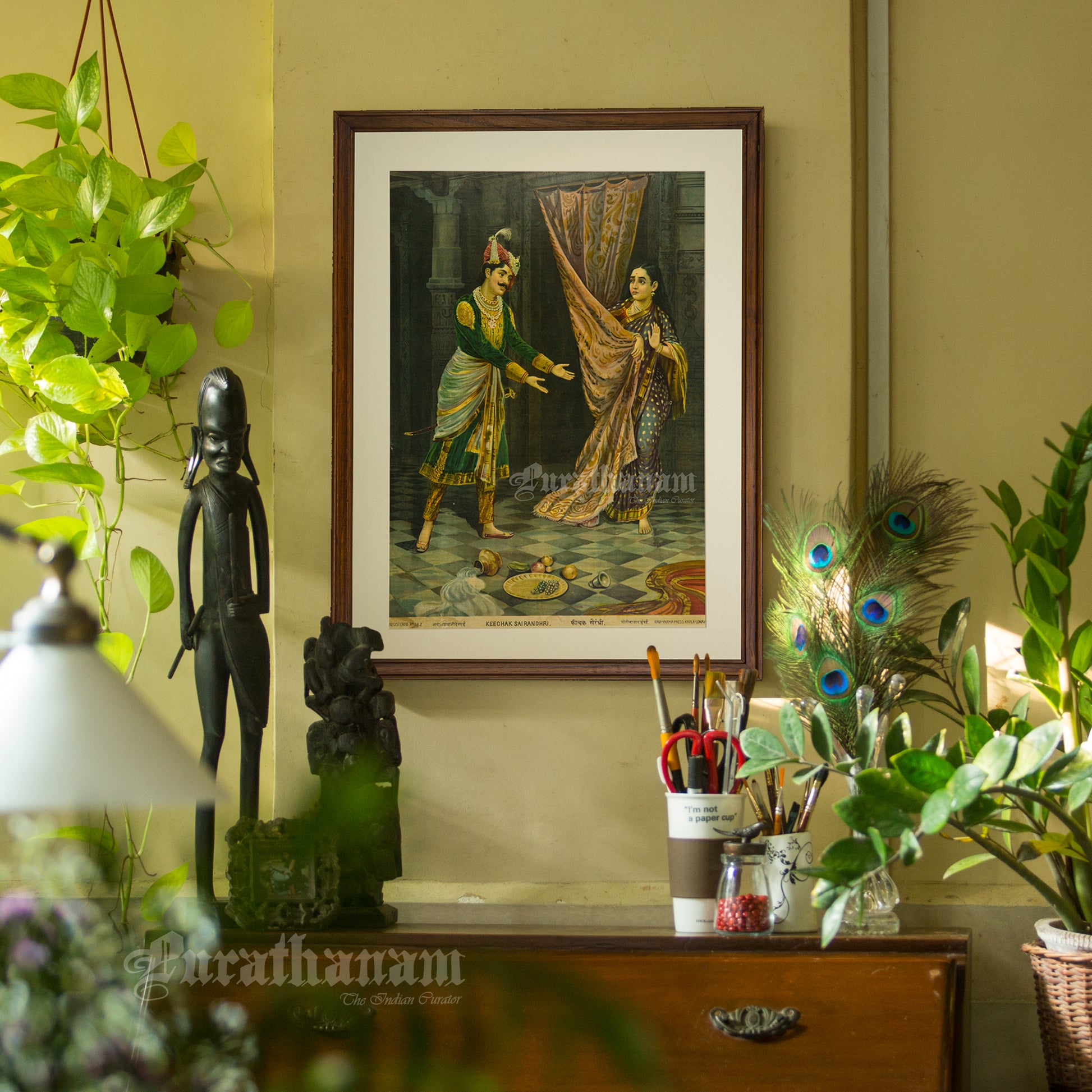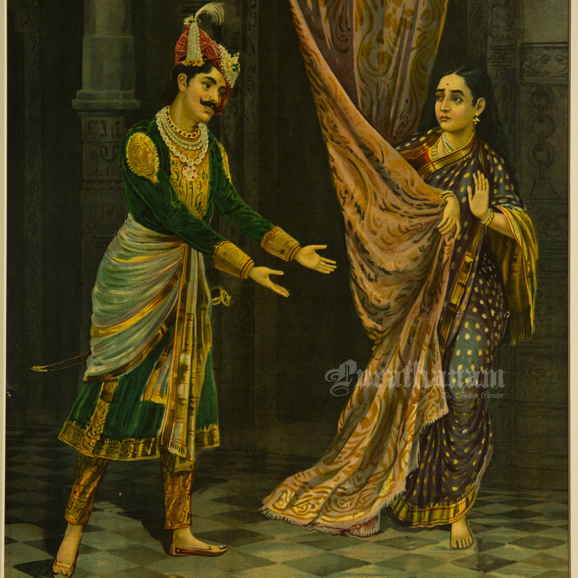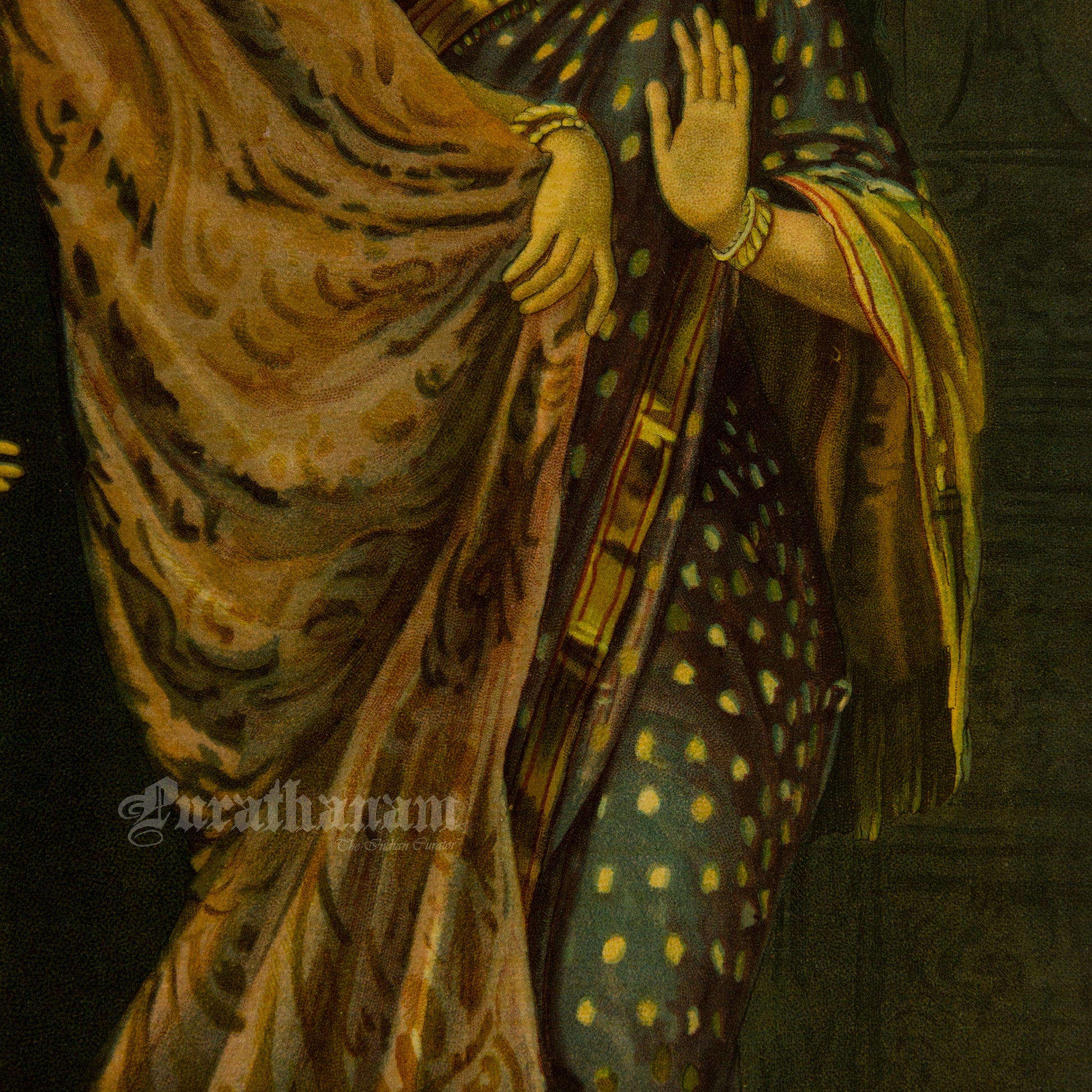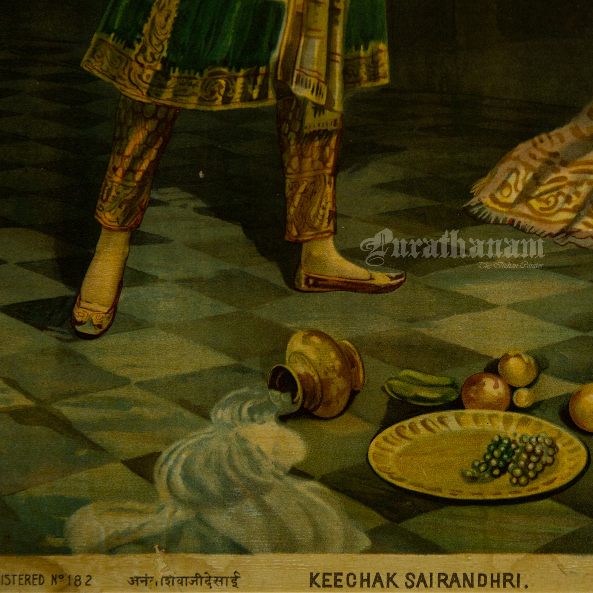 This is an oleograph print from 1920s of Keechak Sairandhri by Ravi Varma an Indian who achieved recognition for his depiction of scenes from the epics of the Mahabharata and Ramayana.What is Oleography?