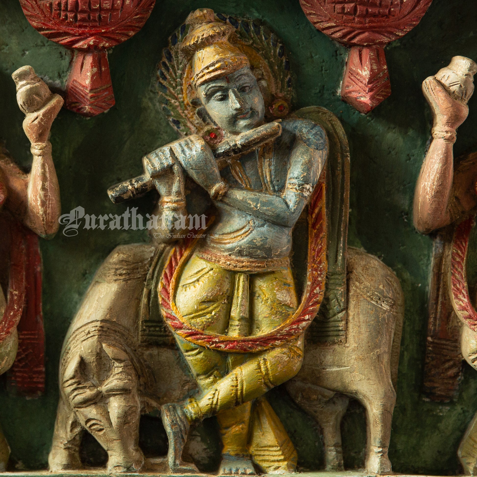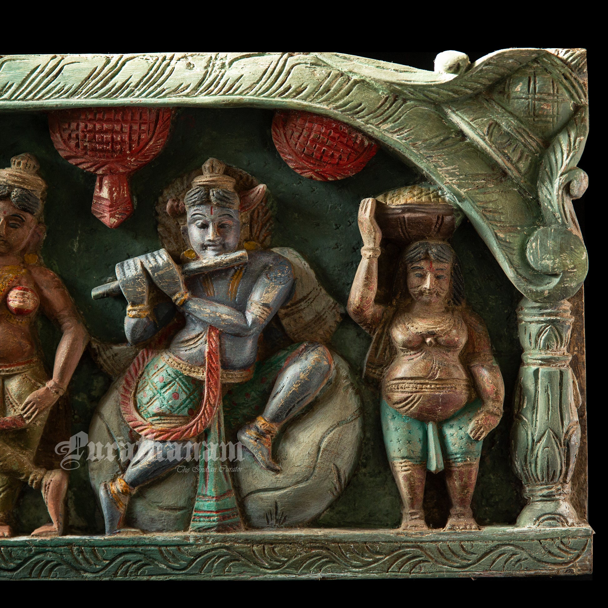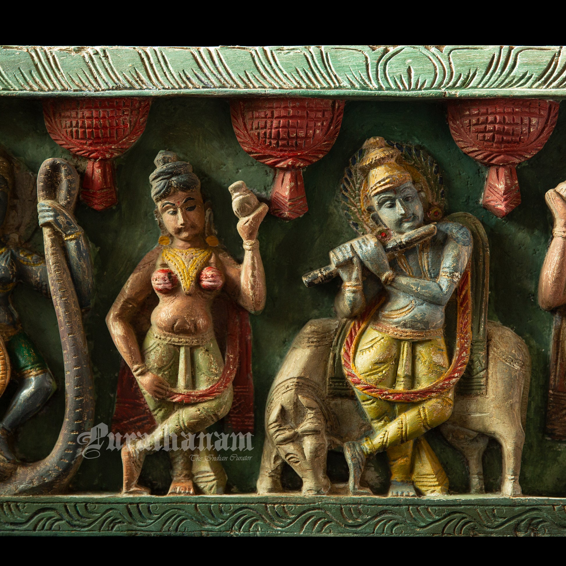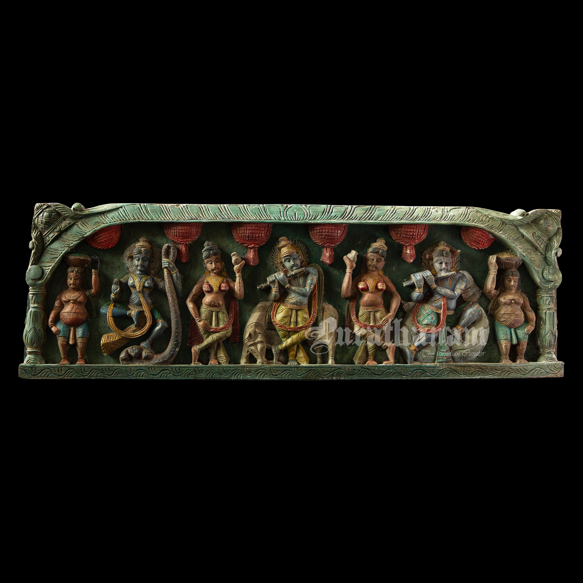 Here is a beautiful Krishna Avatar wooden panel wall hanging called 'Soorya Palagai' which originally goes above the door frames, and now you get to adorn your walls with Surya Palagai as wall decor. It is all the way from South India.