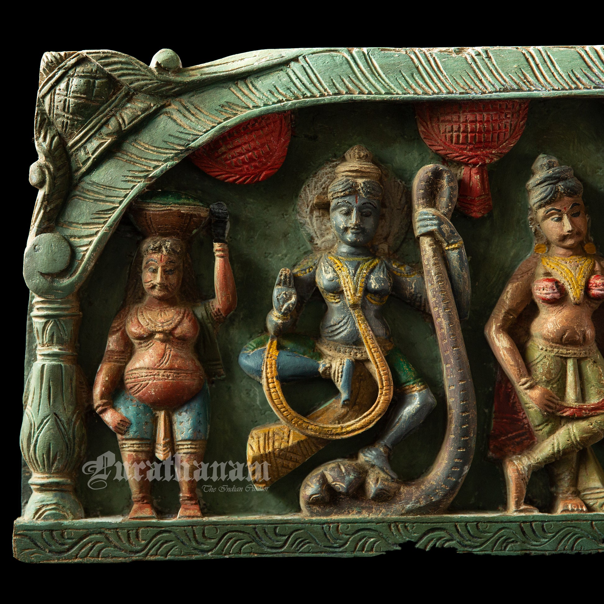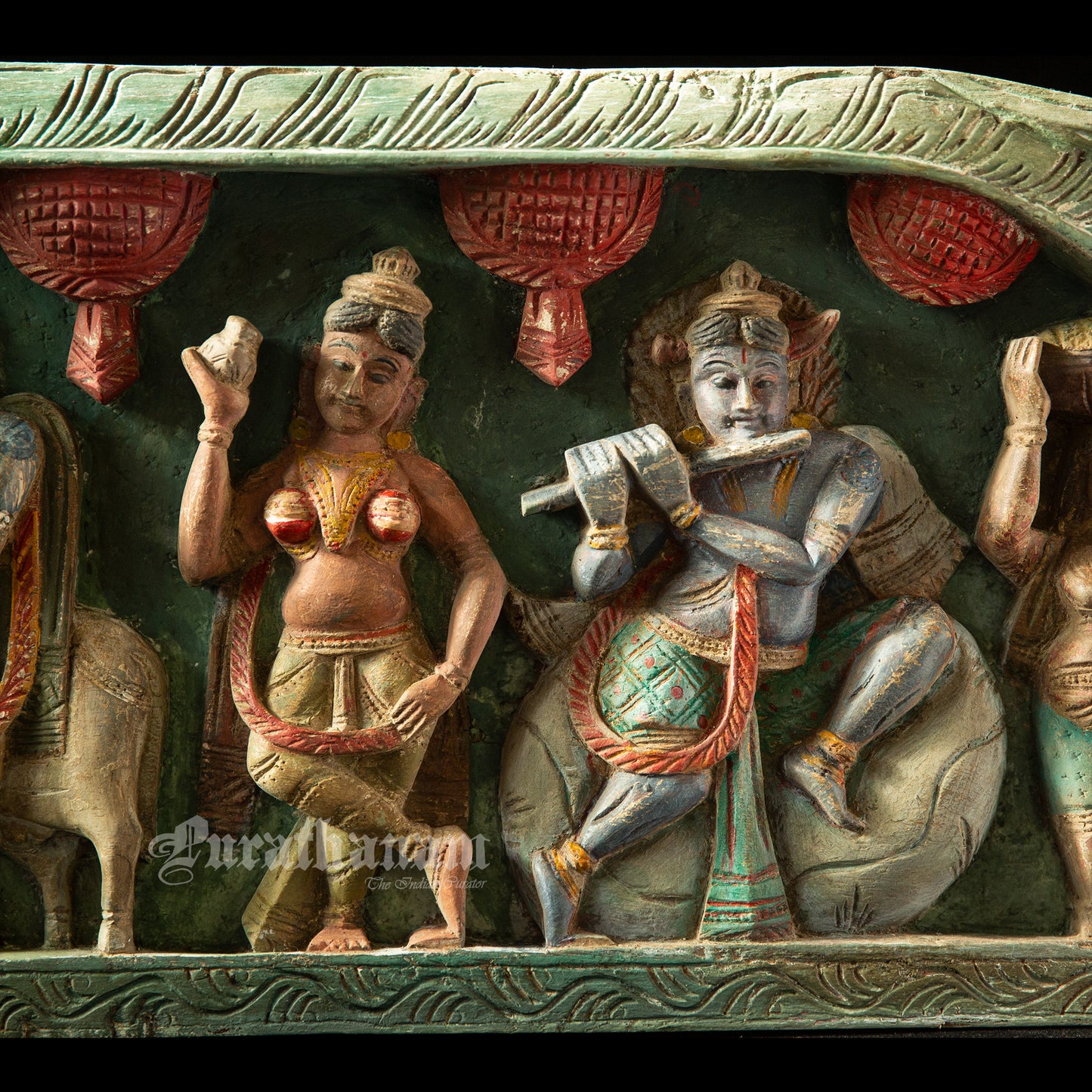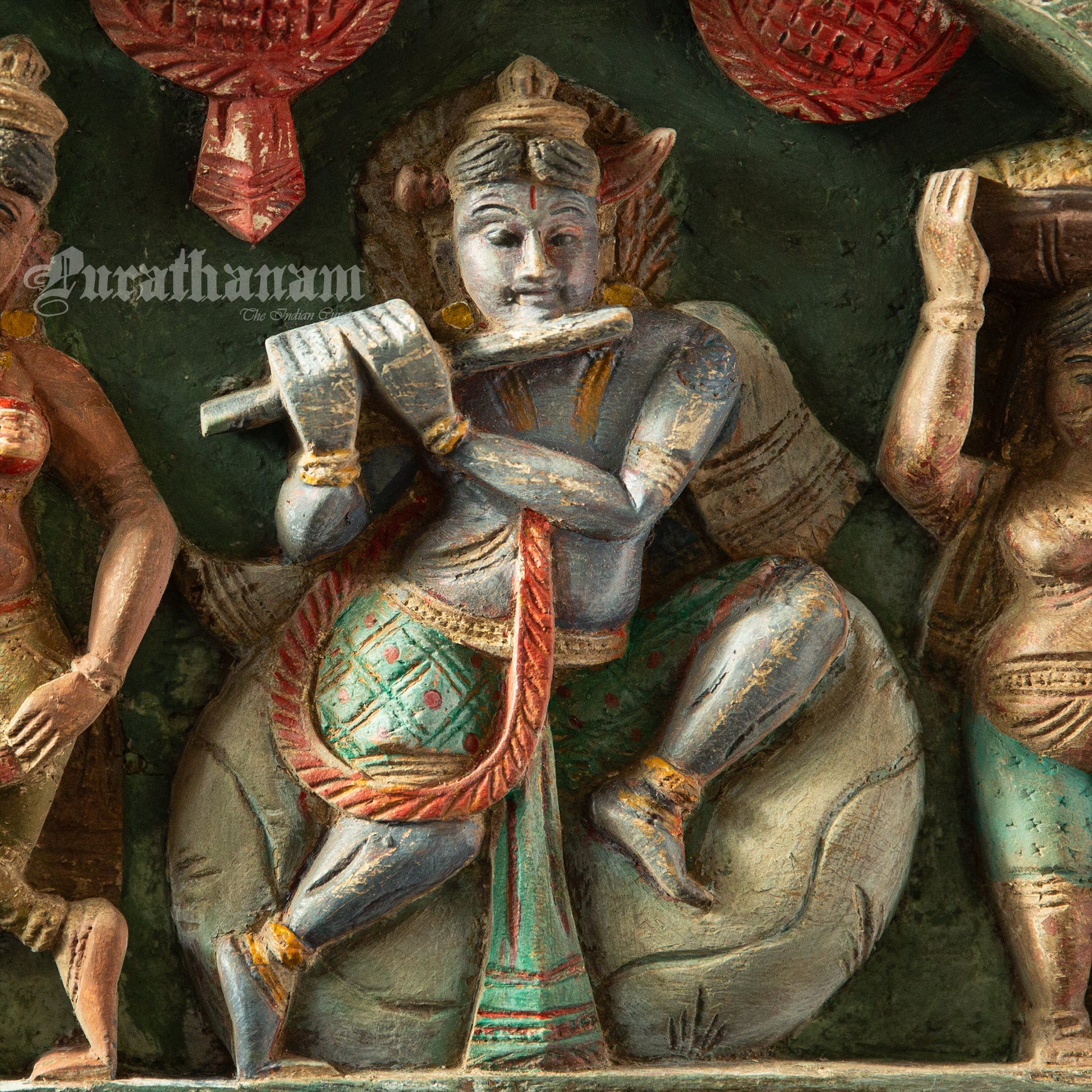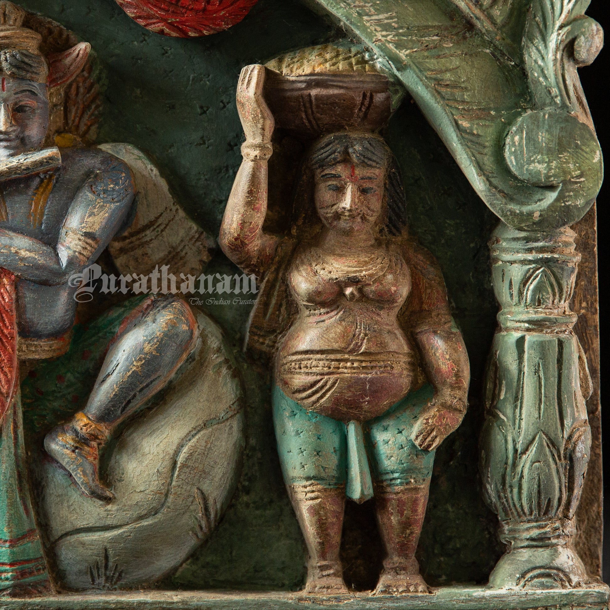 Here is a beautiful Krishna Avatar wooden panel wall hanging called 'Soorya Palagai' which originally goes above the door frames, and now you get to adorn your walls with Surya Palagai as wall decor. It is all the way from South India.