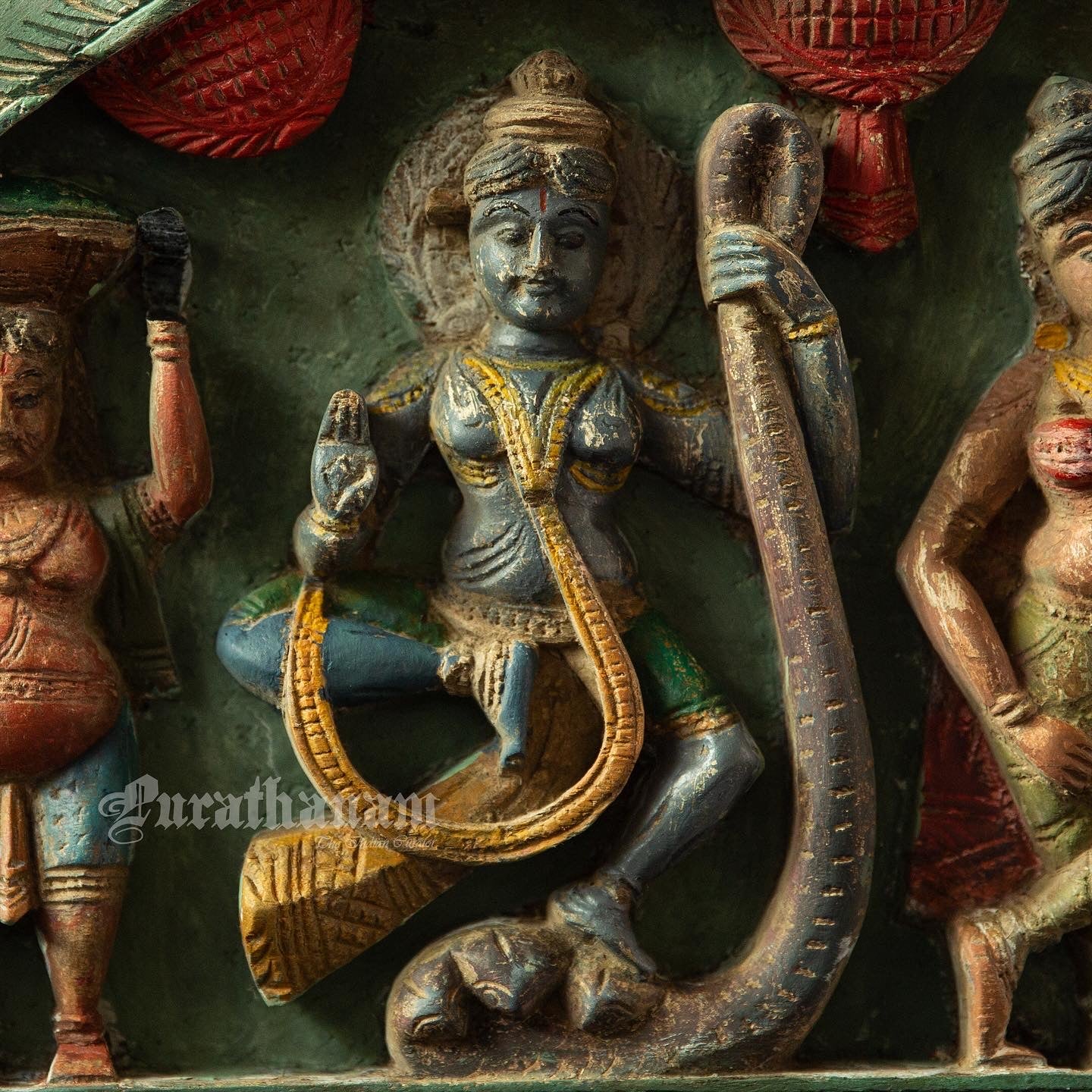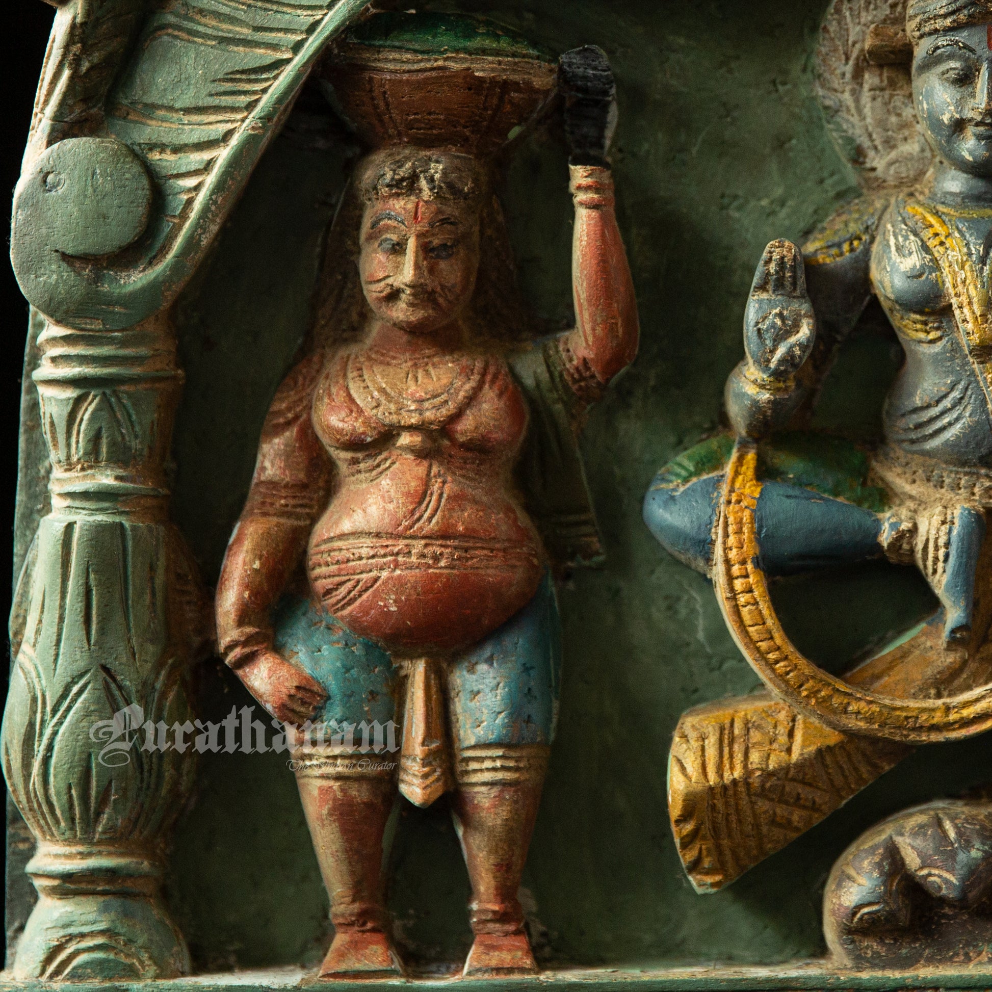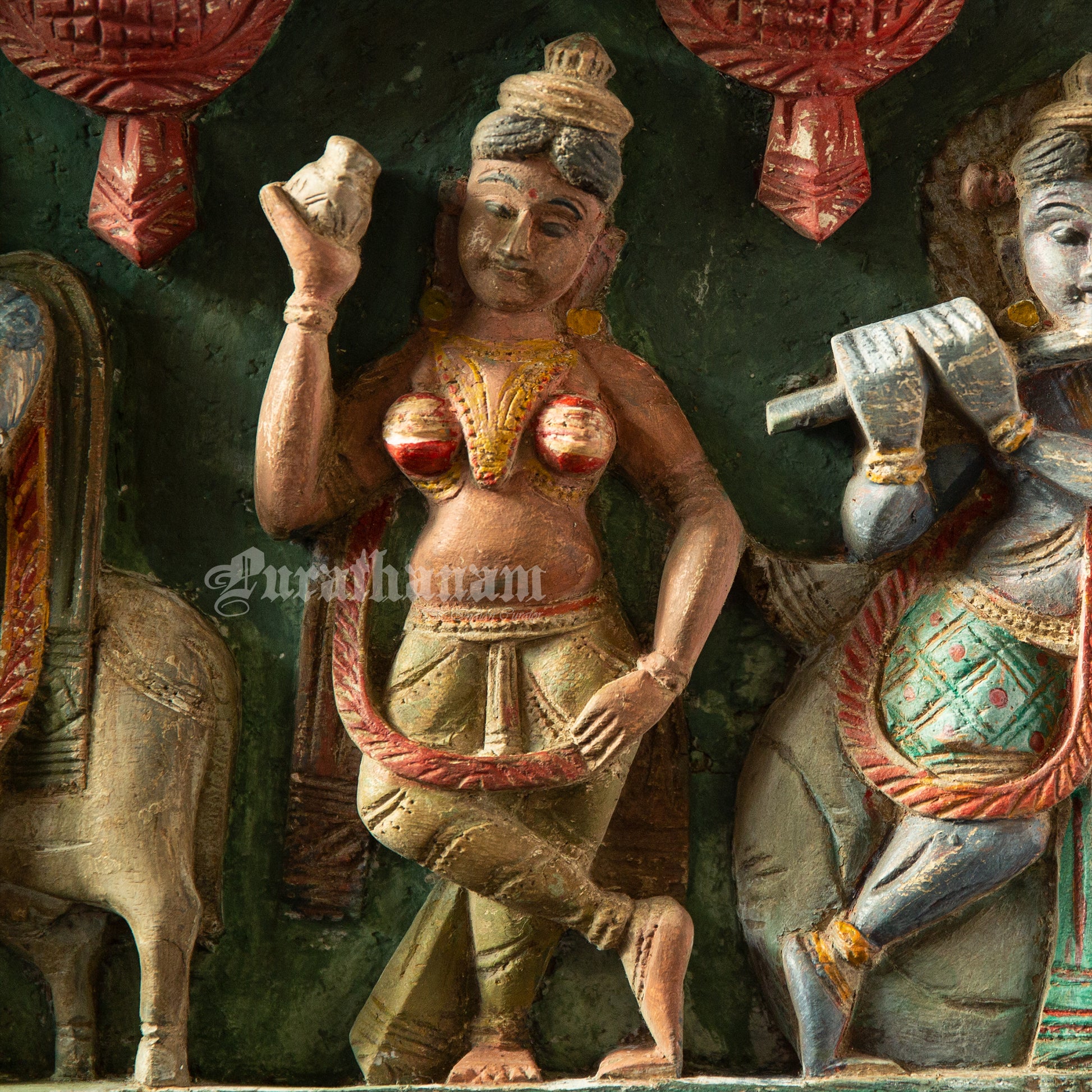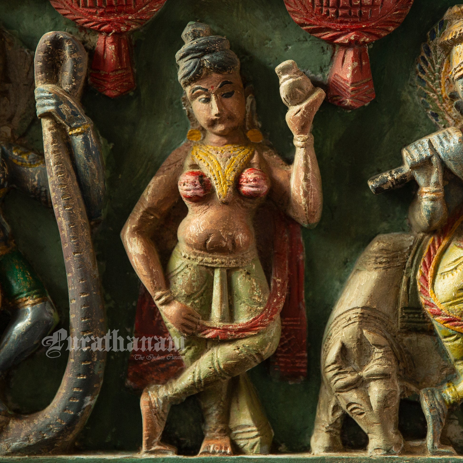 Here is a beautiful Krishna Avatar wooden panel wall hanging called 'Soorya Palagai' which originally goes above the door frames, and now you get to adorn your walls with Surya Palagai as wall decor. It is all the way from South India.