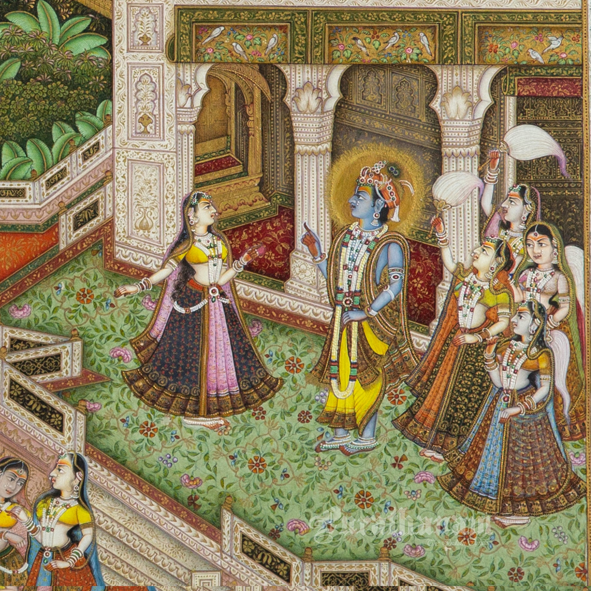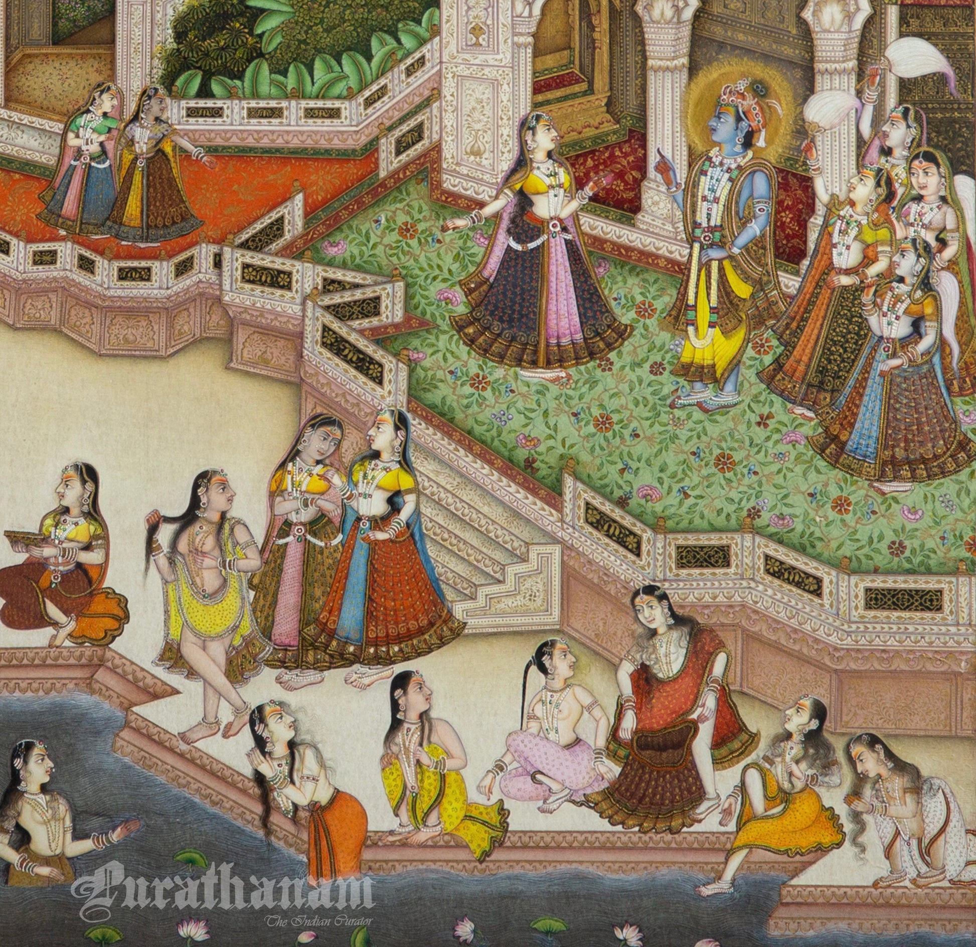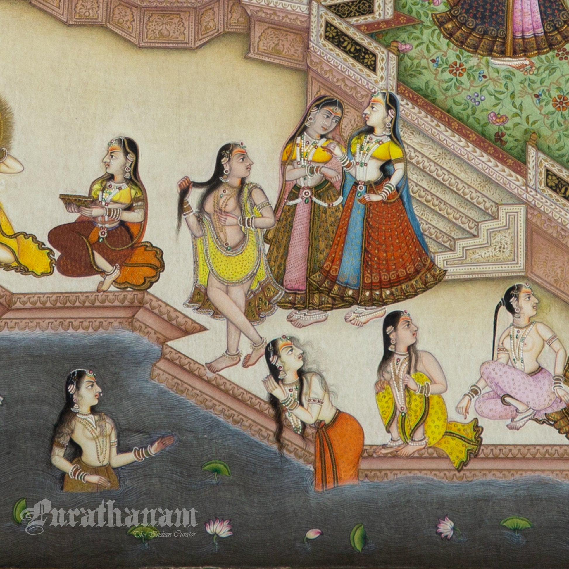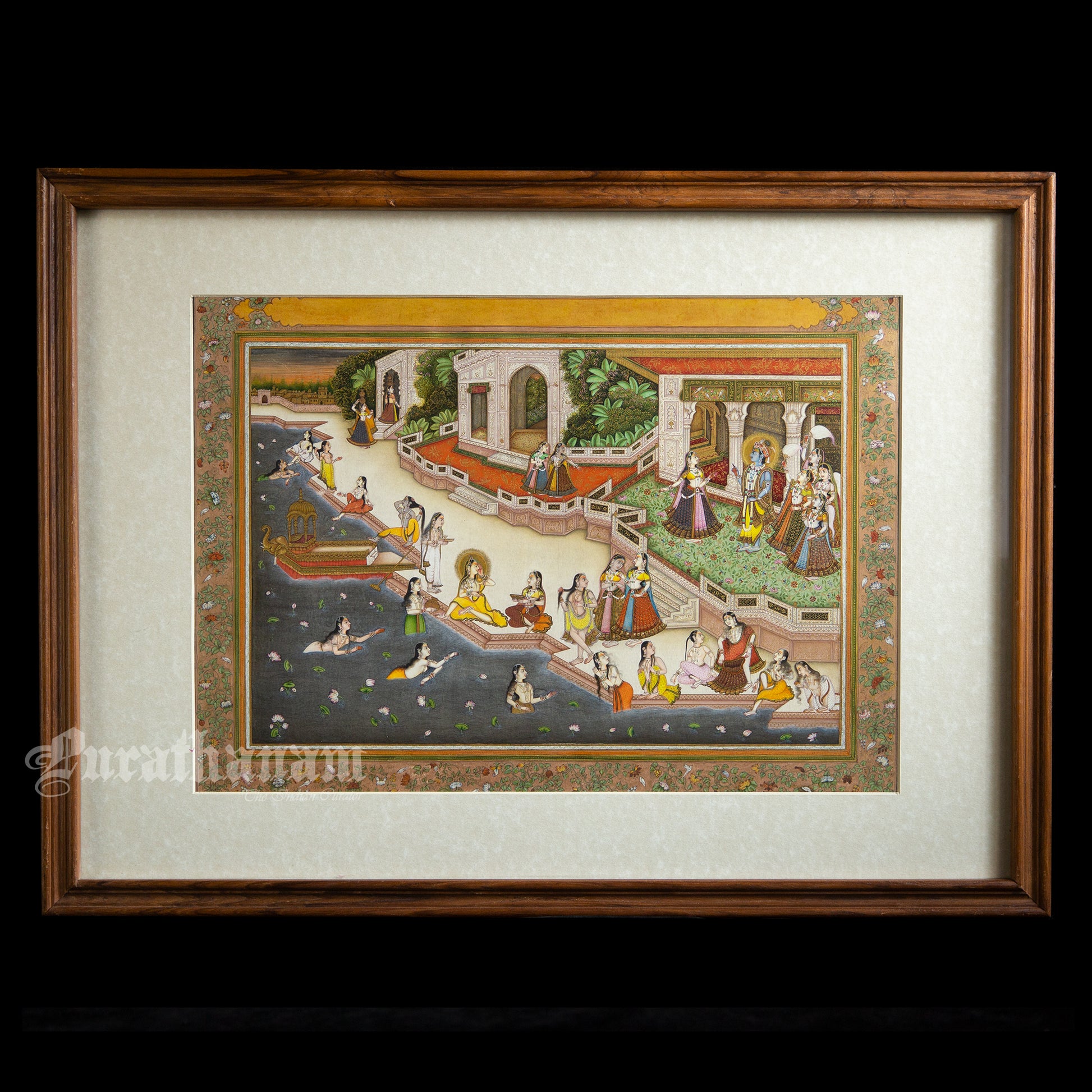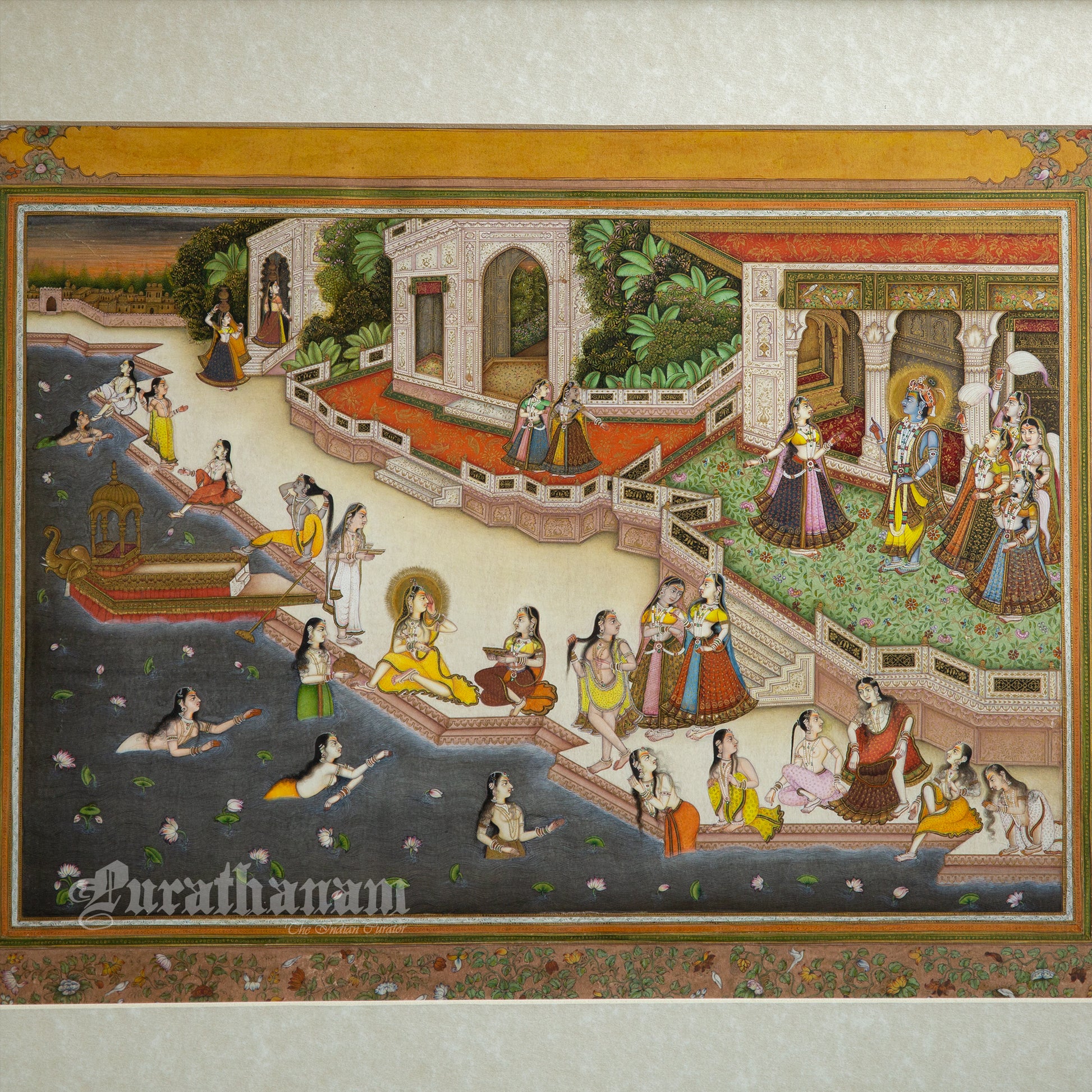 This exquisite miniature painting “Krishna Leela”, which is nearly 50 years old comes from Jaipur. Though created in more recent times, it carries the soul of a tradition that began over a thousand years ago. Made in the Rajasthani or Pahari miniature tradition, it shows a magical world where love, nature, and architecture come together.