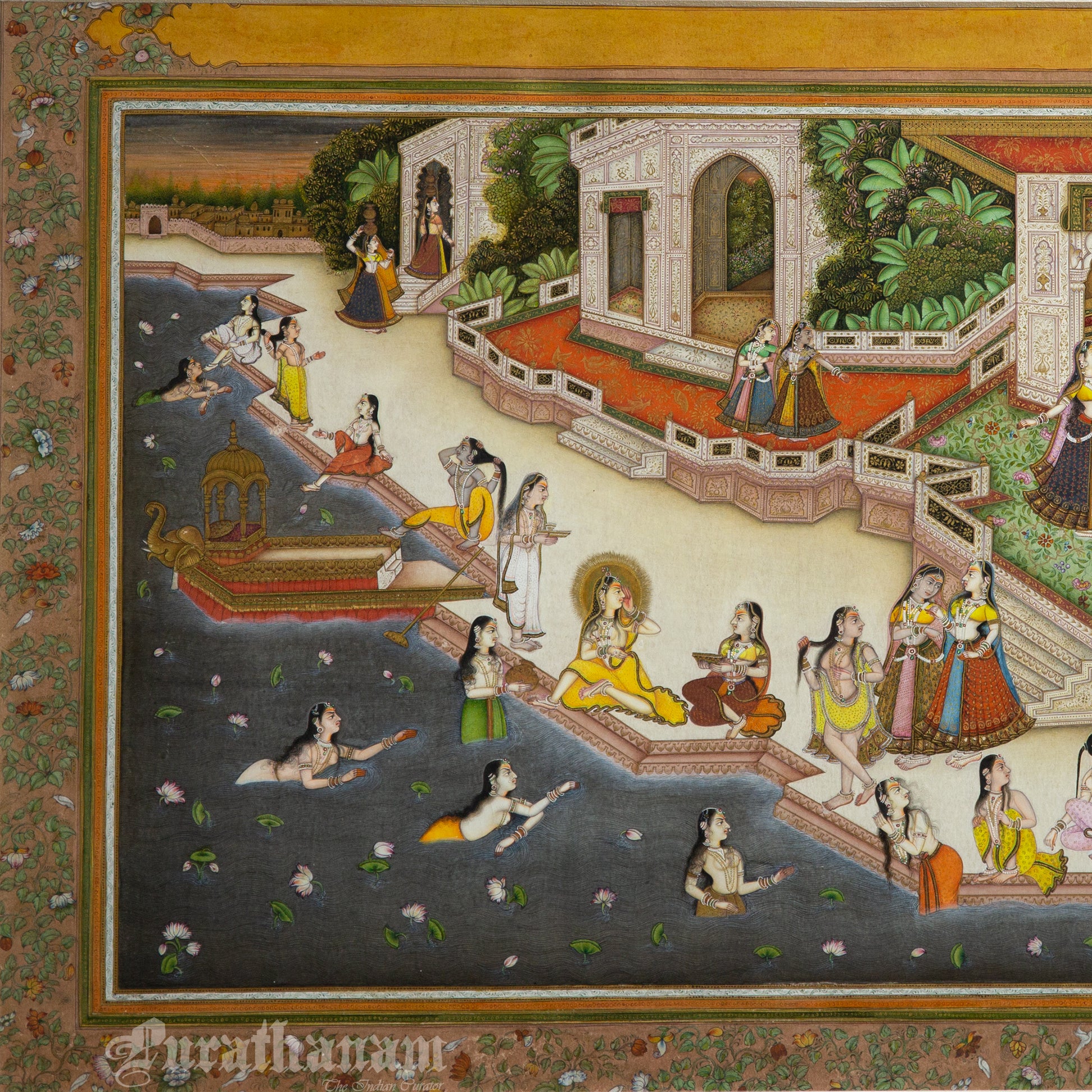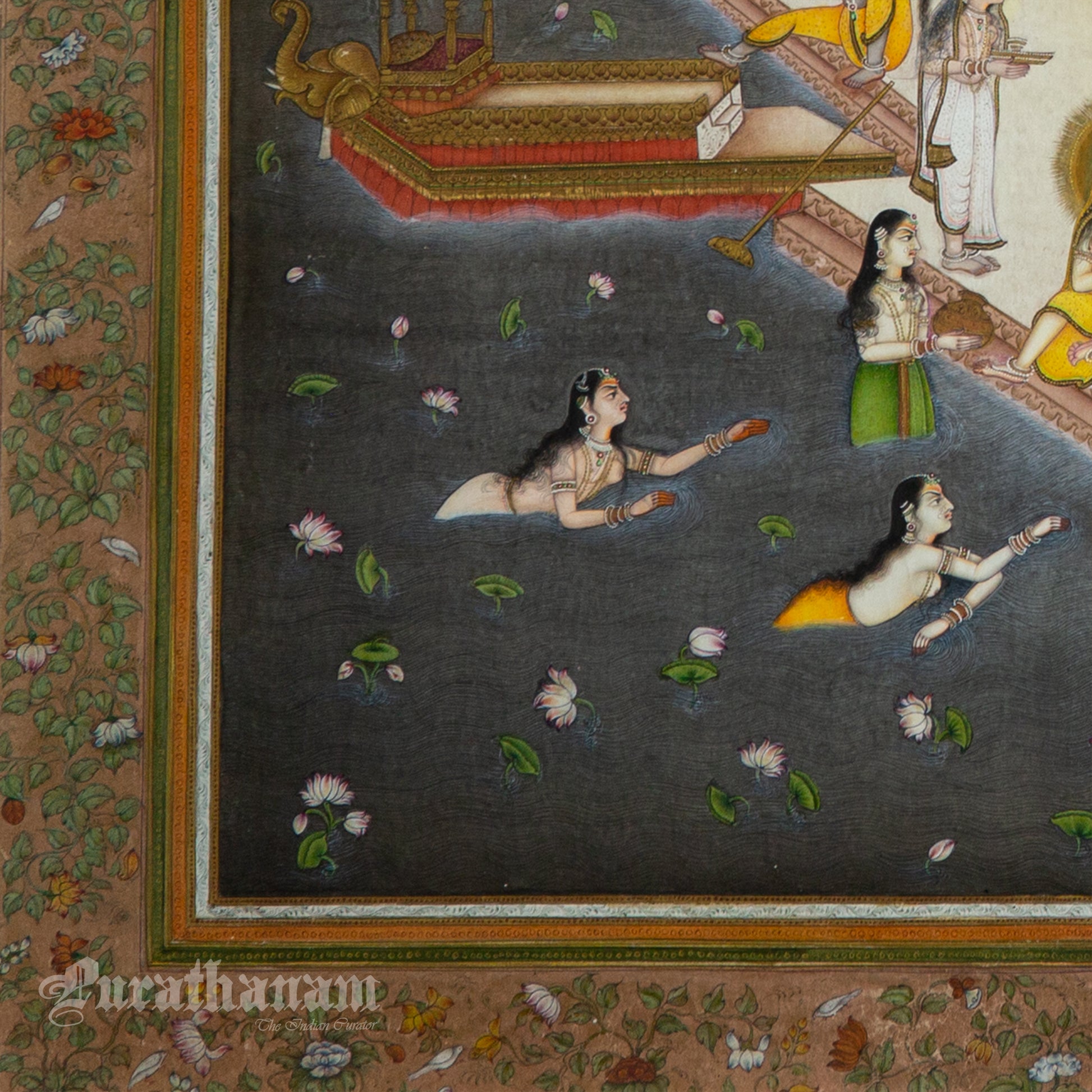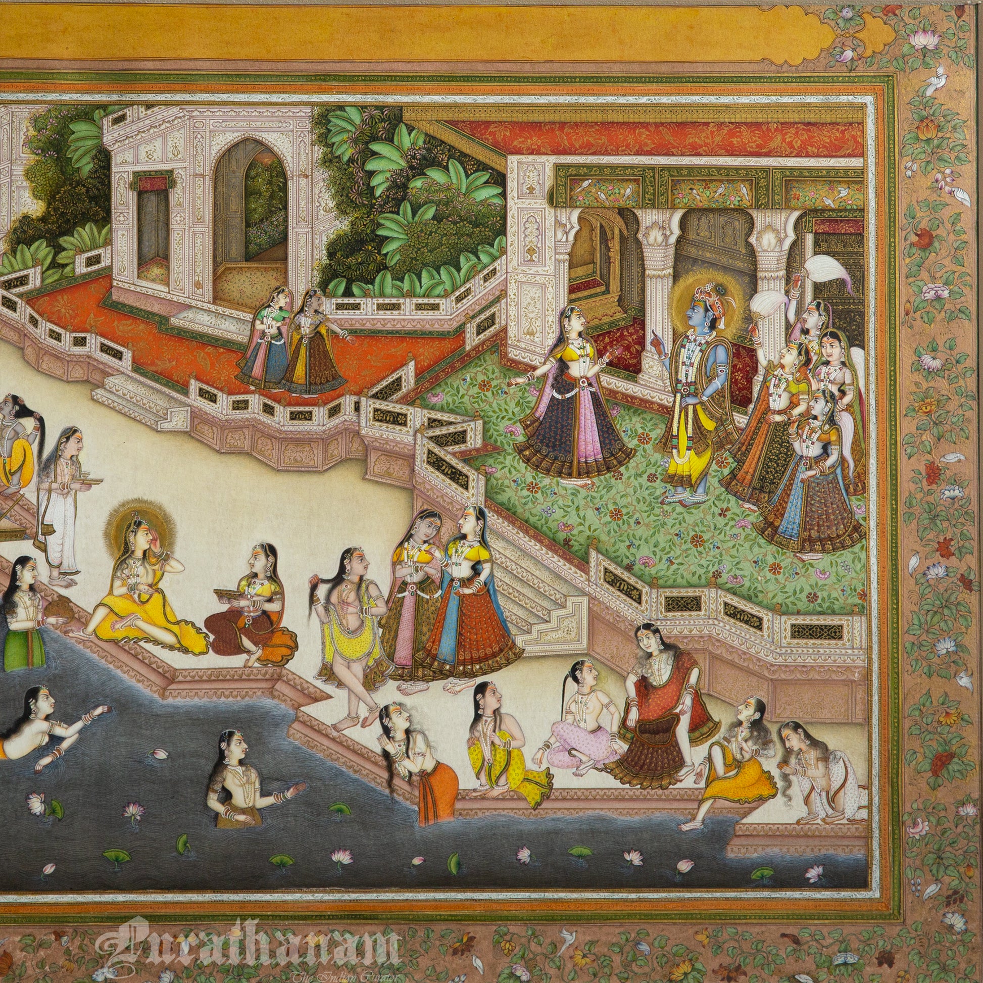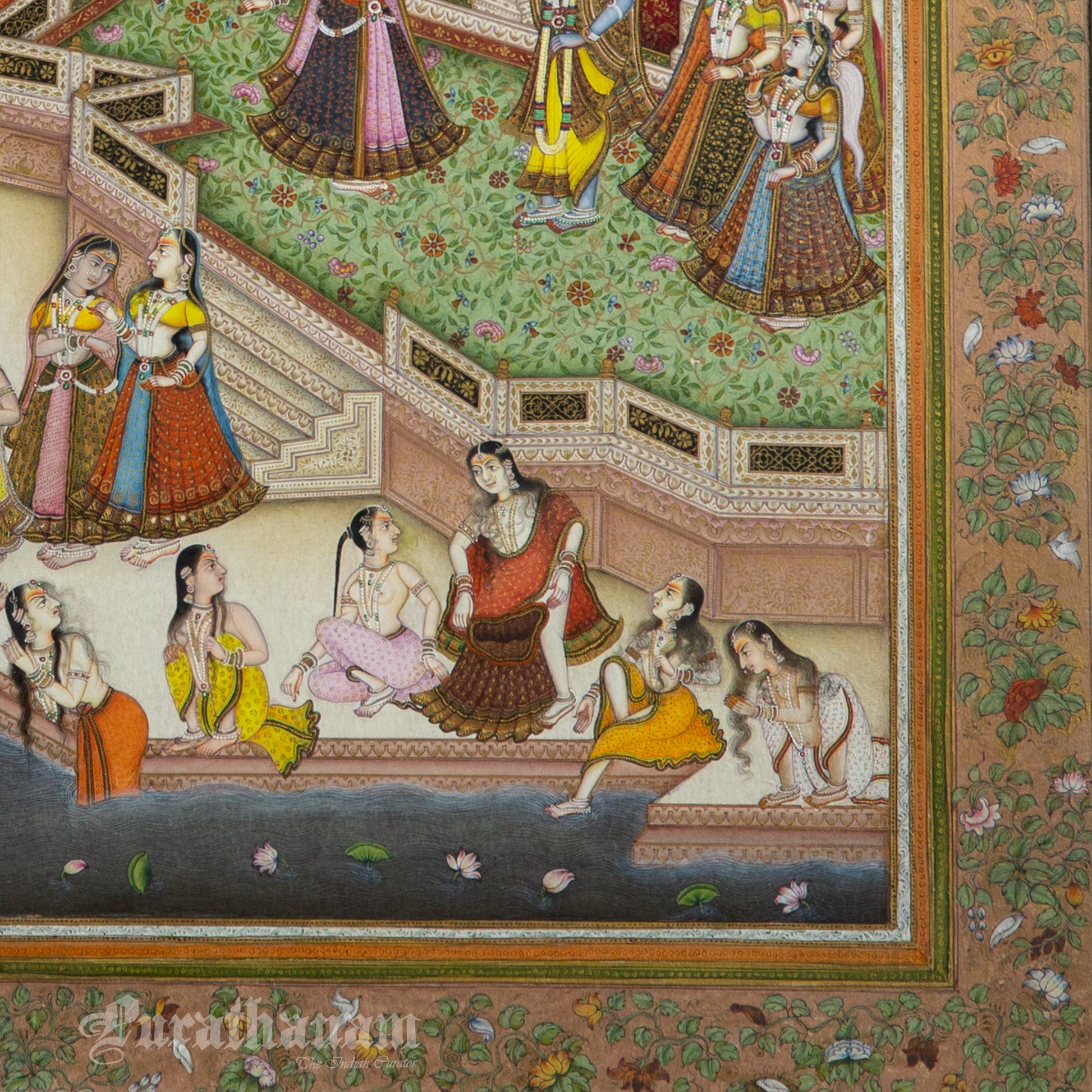 The setting is idyllic, a royal garden beside a serene waterbody blooming with lotuses. The architecture, with its arched pavilions and carved terraces and pillars, is detailed with characteristic Mughal-Rajput finesse. The eye is led from the bustling palace veranda, where Krishna and Radha are surrounded by companions, to the gentle waterside where gopis are playing. Each figure in the painting feels full of life. Their flowing hair, clothes, graceful hand movements, and expressive faces are all painted with great care. The artwork is surrounded by a delicate floral border, adding to its beauty and charm.