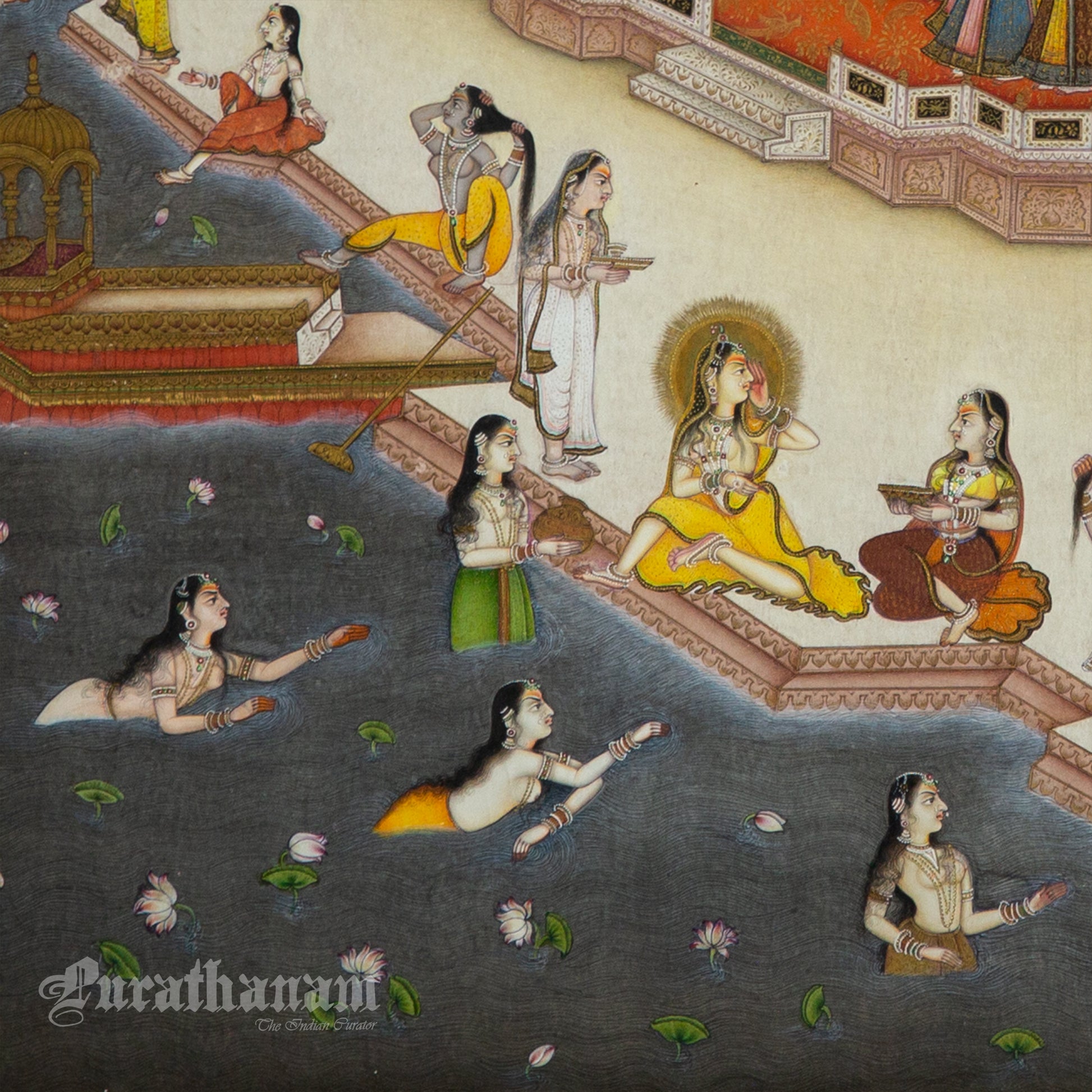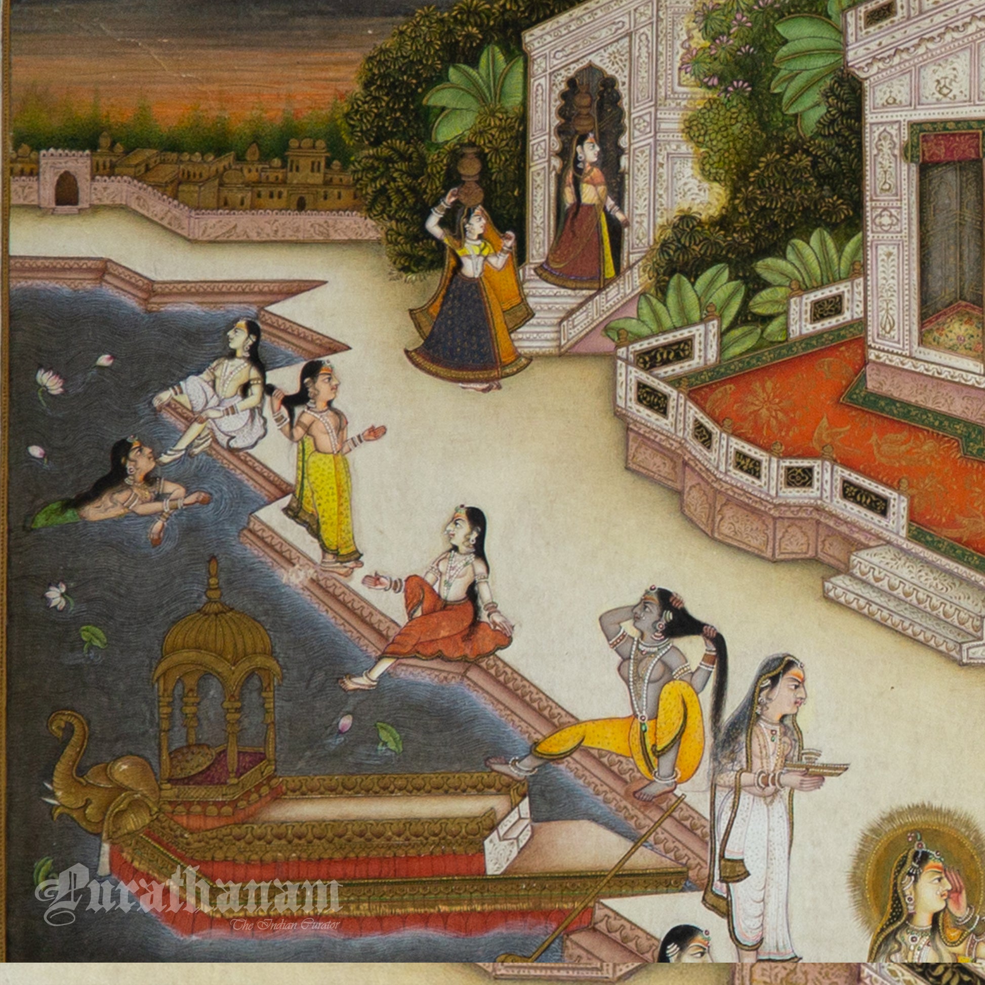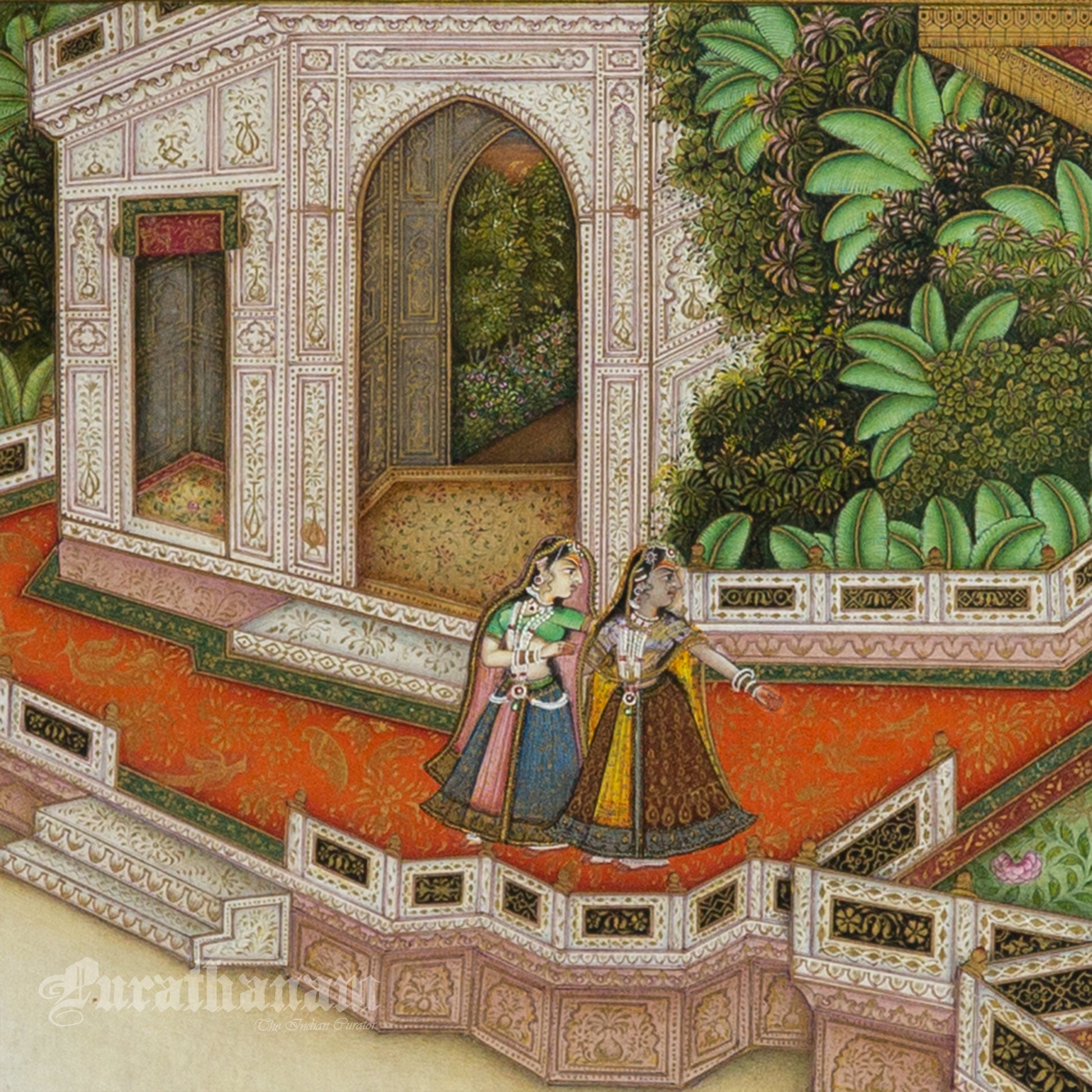 Miniature paintings have a long history in India. They grew under the Mughal, Rajput, Pahari, and Deccan courts, from the 16th to 19th centuries. Artists used natural pigments and brushes made from squirrel hair to paint on paper, palm leaves, or ivory. Miniature paintings are usually small, but they hold big stories about gods, kings, daily life, and devotion. This painting is created in watercolor medium using real gold leaf on paper, and it follows the miniature painting tradition known for its tiny details, fine lines, and delicate features.