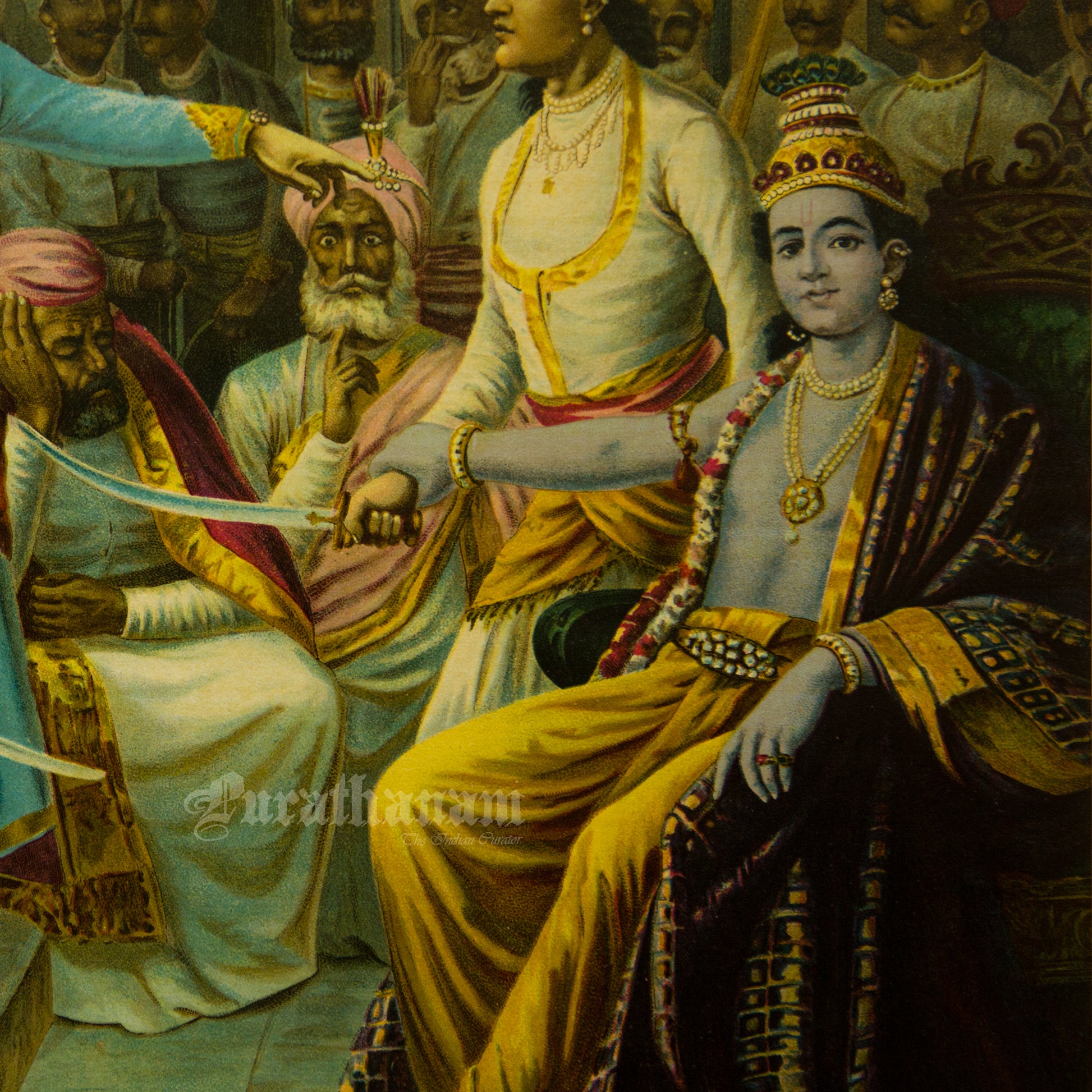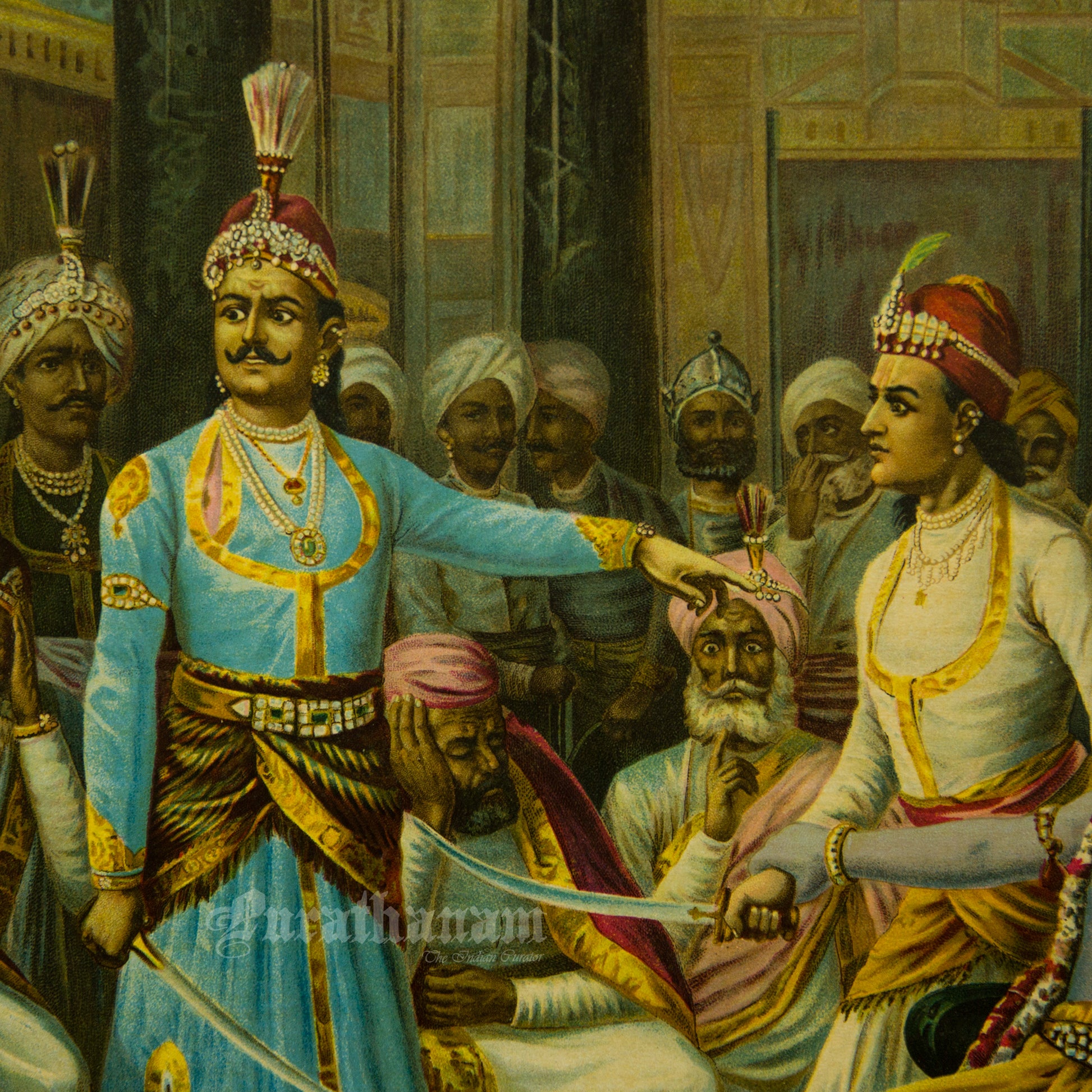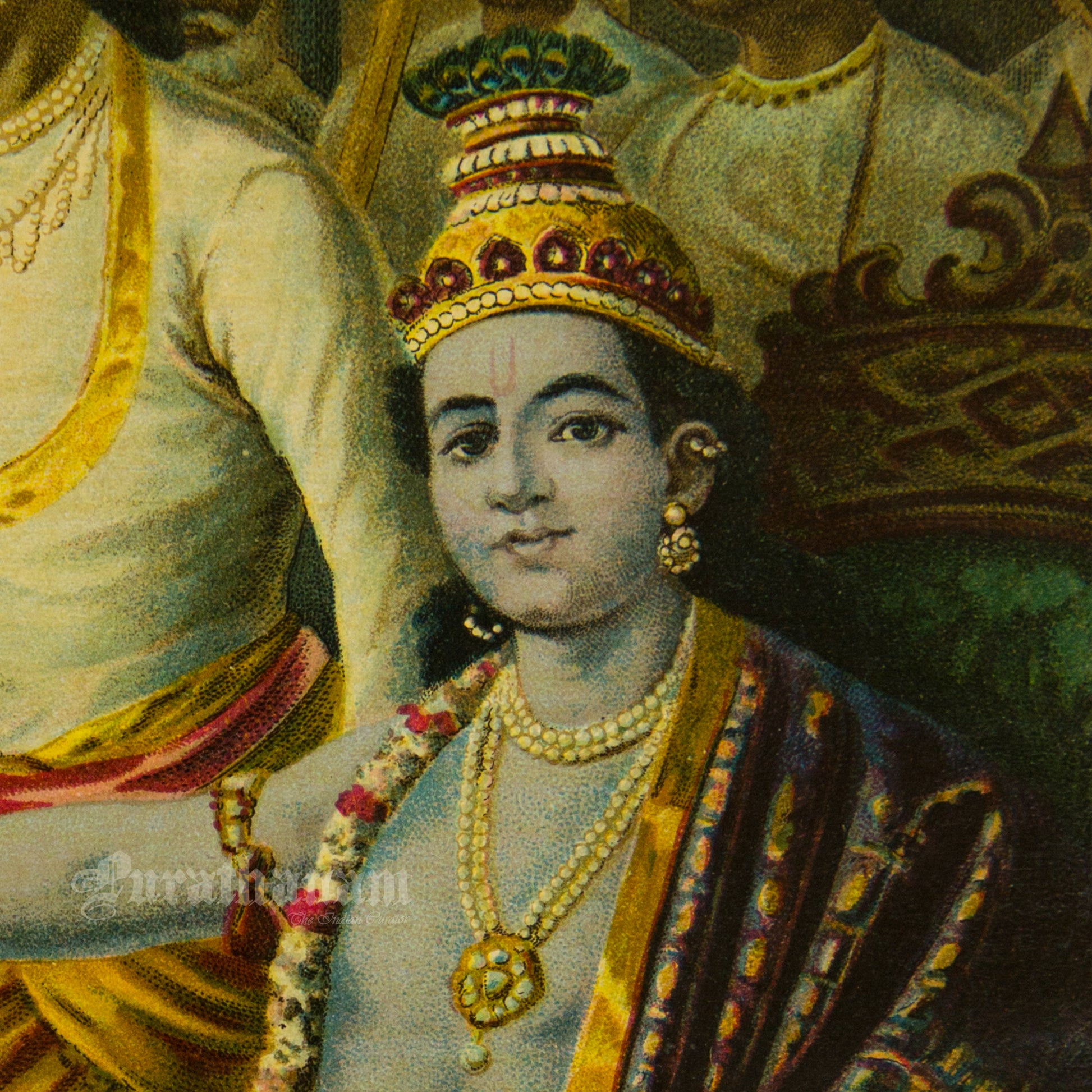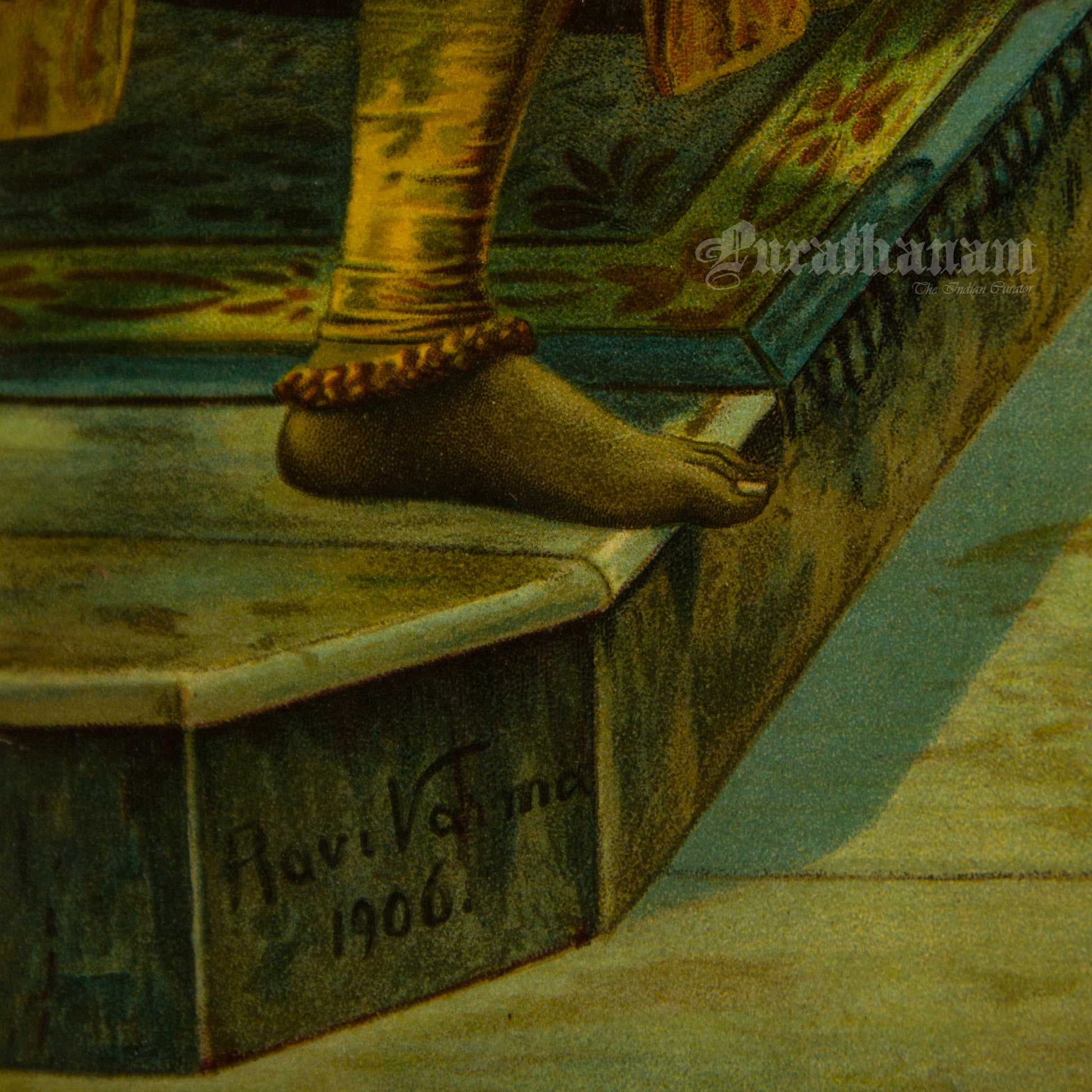 The highlight is, this brocade fabric was originally a gift to Ravi Varma by Maharaja of Mysore (Jatayu Vadham was commissioned by the same Mysore Maharaja). The point is… Ravi Varma has used the same brocade pattern to the costume of Krishna in his “Krishna Shishtai” painting. When we find such personal connections to the artist with the paintings, it adds more value to his creation!