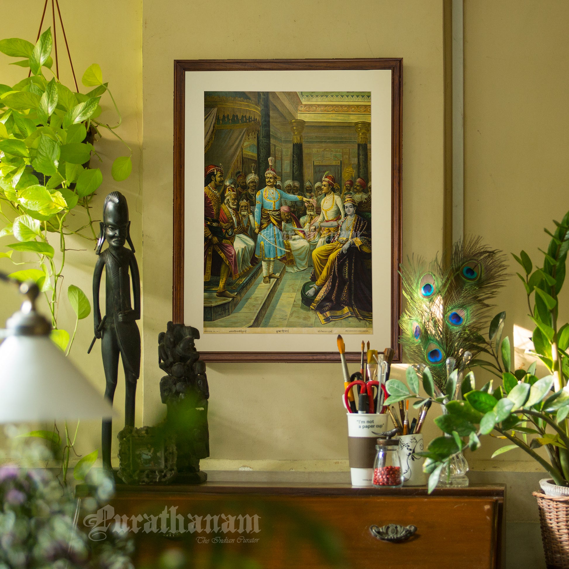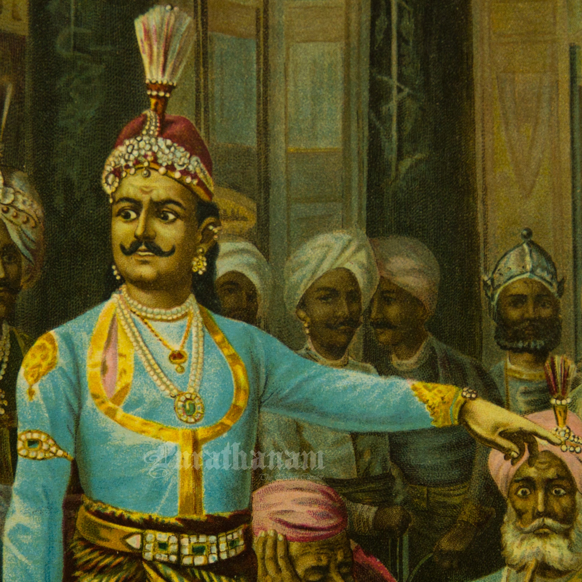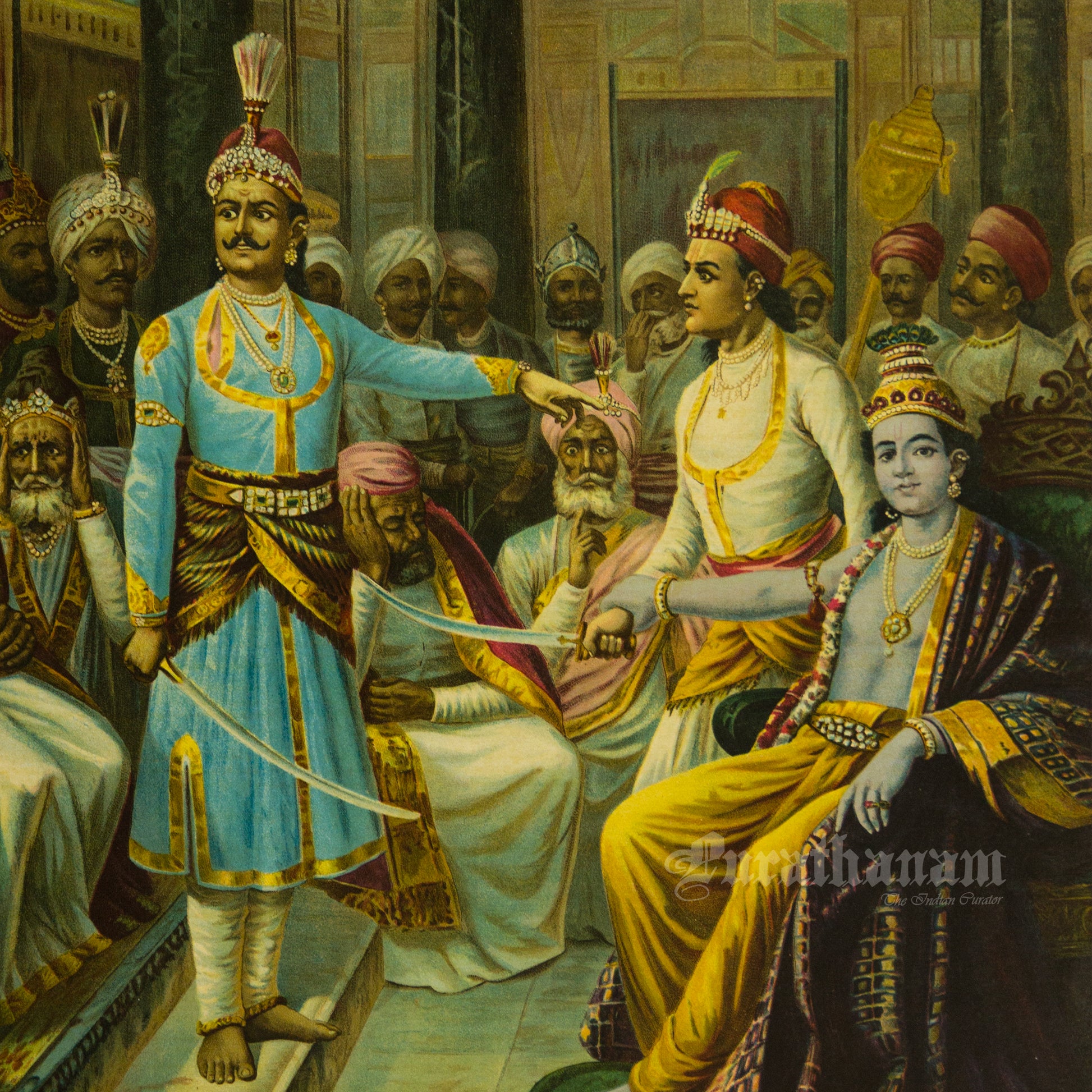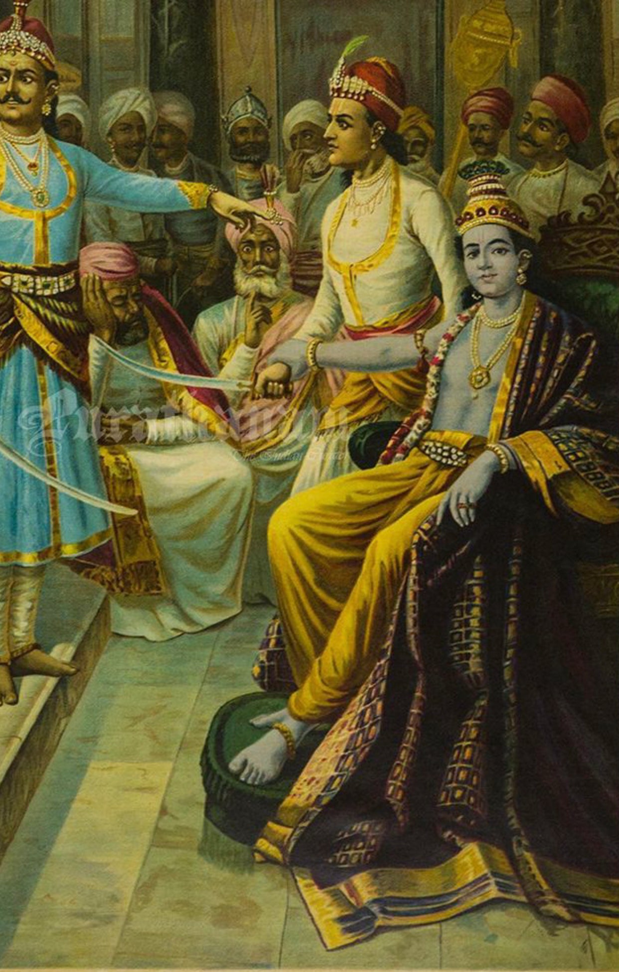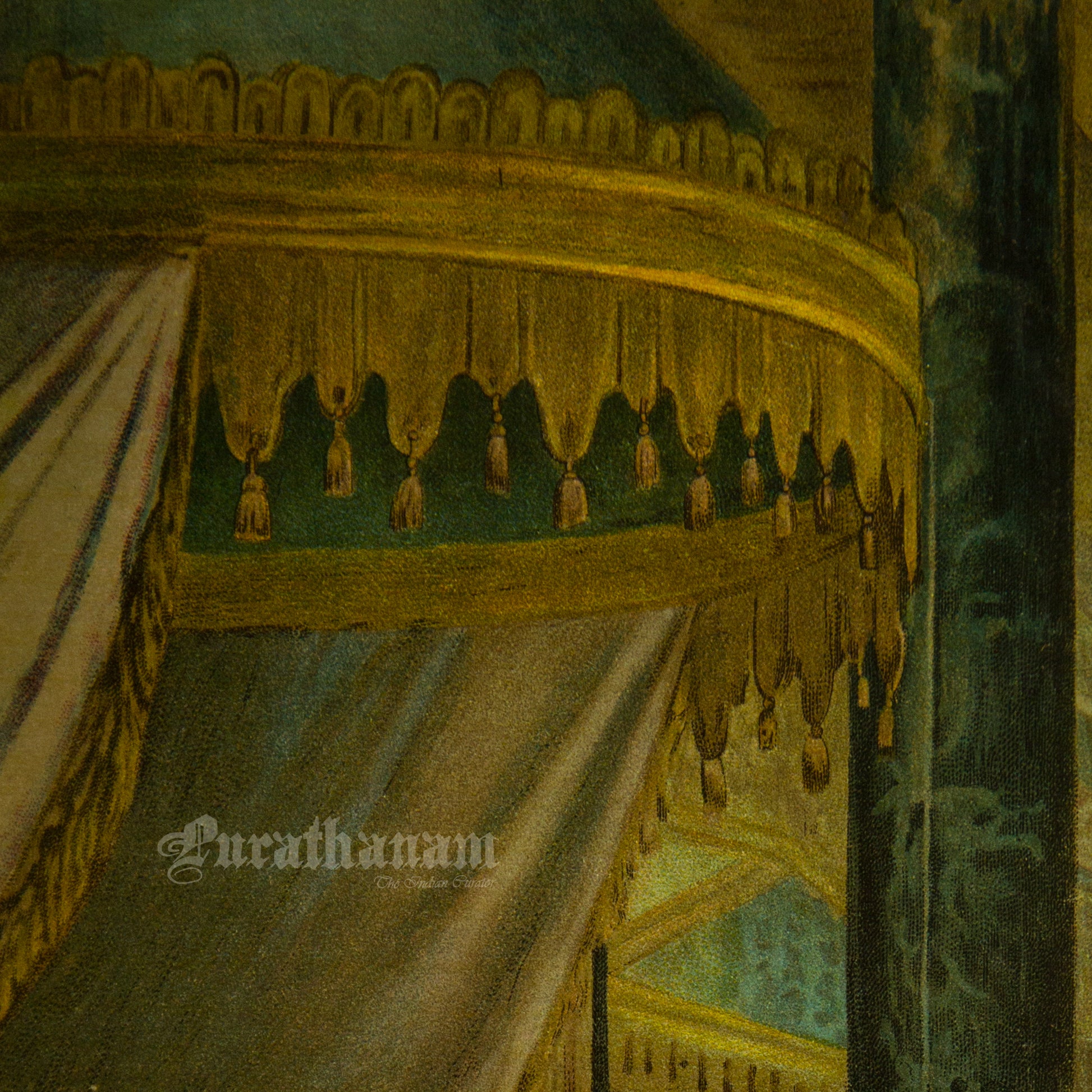 The highlight is, this brocade fabric was originally a gift to Ravi Varma by Maharaja of Mysore (Jatayu Vadham was commissioned by the same Mysore Maharaja). The point is… Ravi Varma has used the same brocade pattern to the costume of Krishna in his “Krishna Shishtai” painting. When we find such personal connections to the artist with the paintings, it adds more value to his creation!