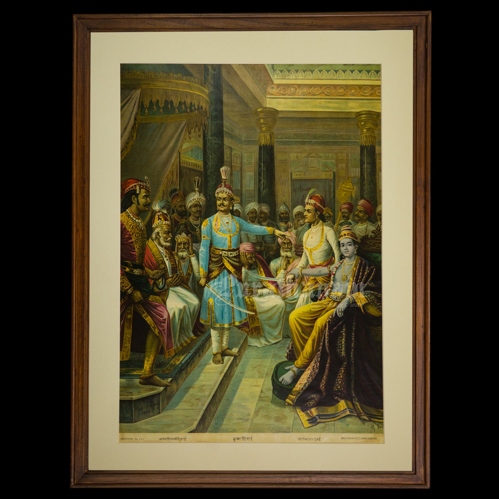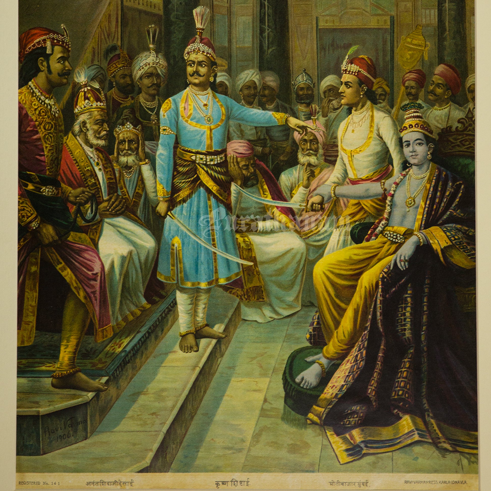 This is an oleograph print from 1906 of Krishna shishtai by Ravi Varma an Indian who achieved recognition for his depiction of scenes from the epics of the Mahabharata and Ramayana.