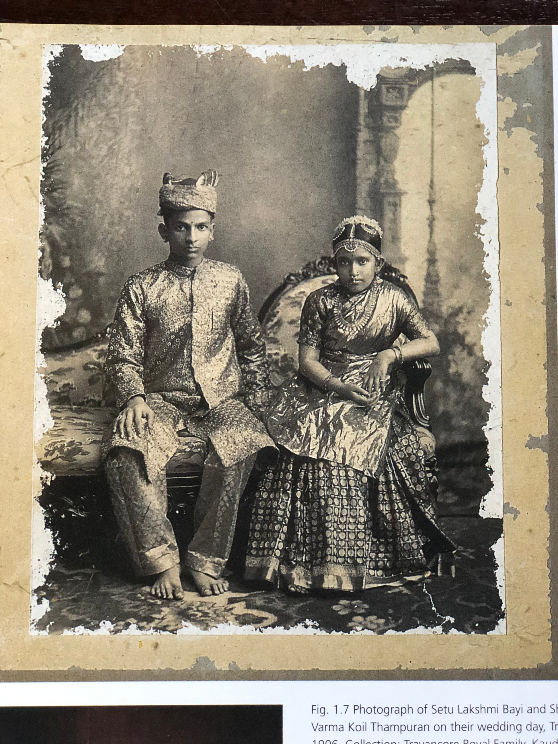 There is a personal connection comes with the artist Ravi Varma with his Painting “Krishna Shishtai”. He once had gifted a grand brocade fabric to his grand daughter, Sethu Lakshmi Bayi, the last queen of Kerala. Here is a picture of Sethu Lakshmi Bayi wearing a long brocade skirt (in pink) which was taken on her wedding day in 1906. This skirt was made from the same brocade fabric her Grand father Ravi Varma had gifted her.
