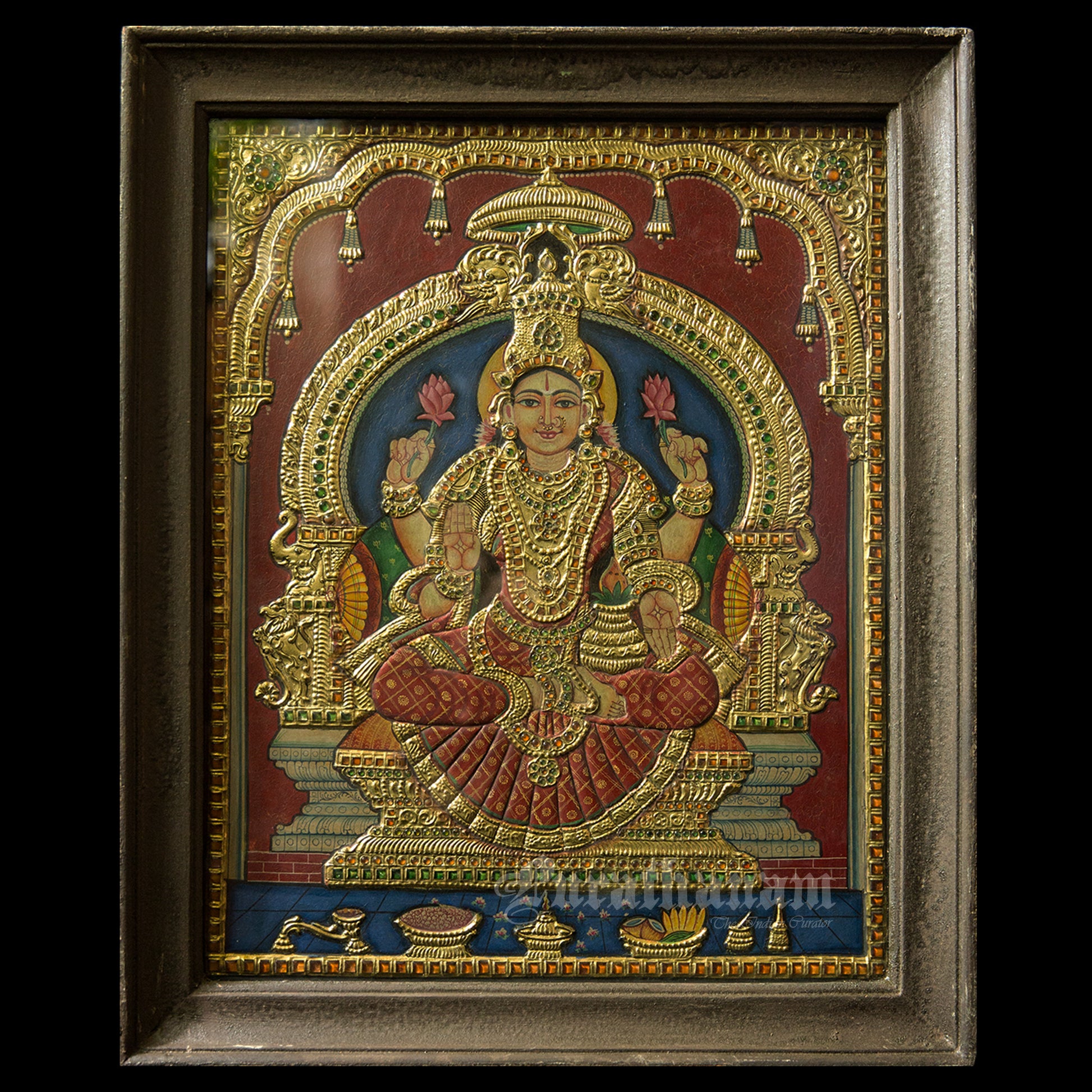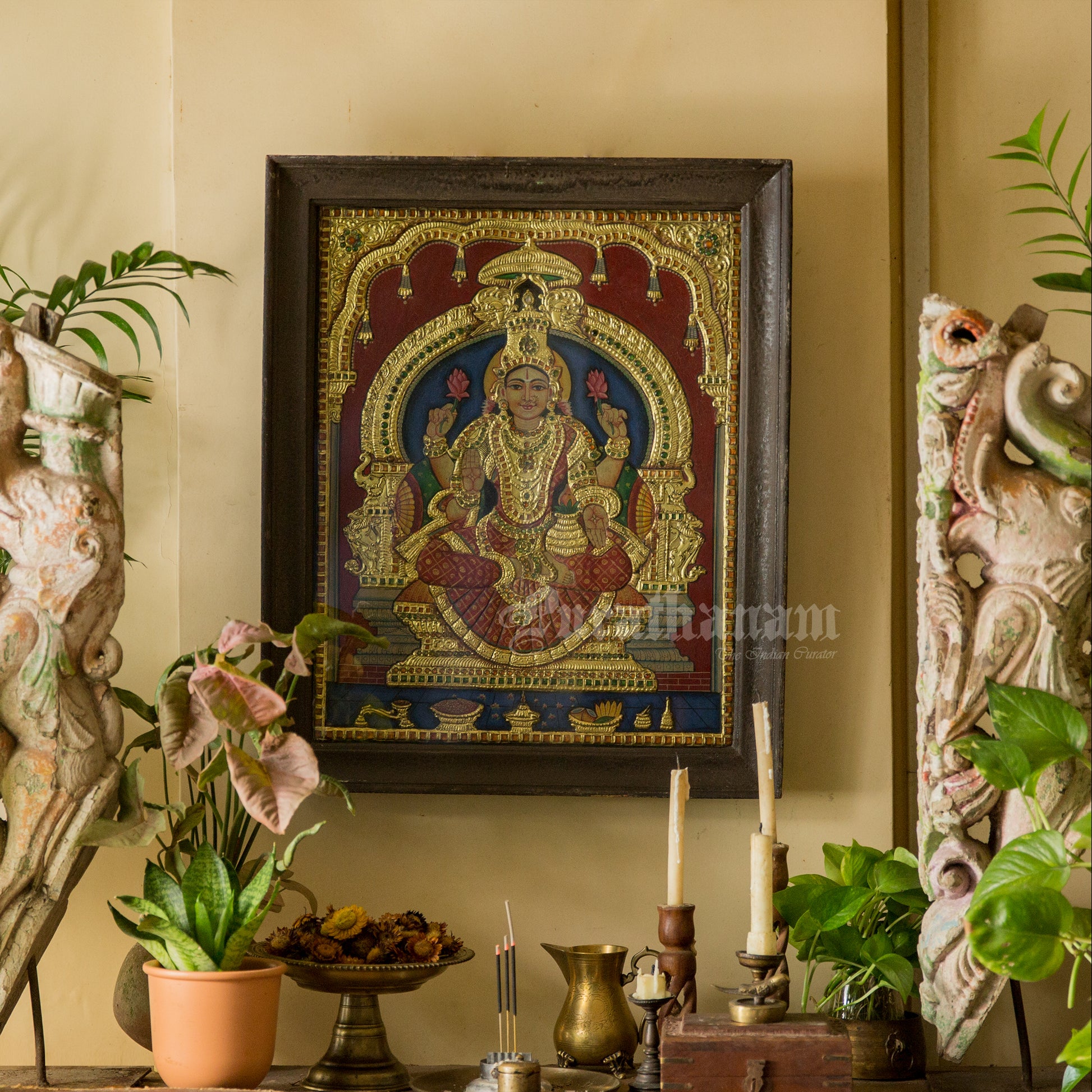 Here is a beautiful Tanjore painting of Lakshmi. Lakshmi is the consort of God Vishnu. She is one of the most popular goddesses of Hindu Mythology and is known as the goddess of wealth and purity.