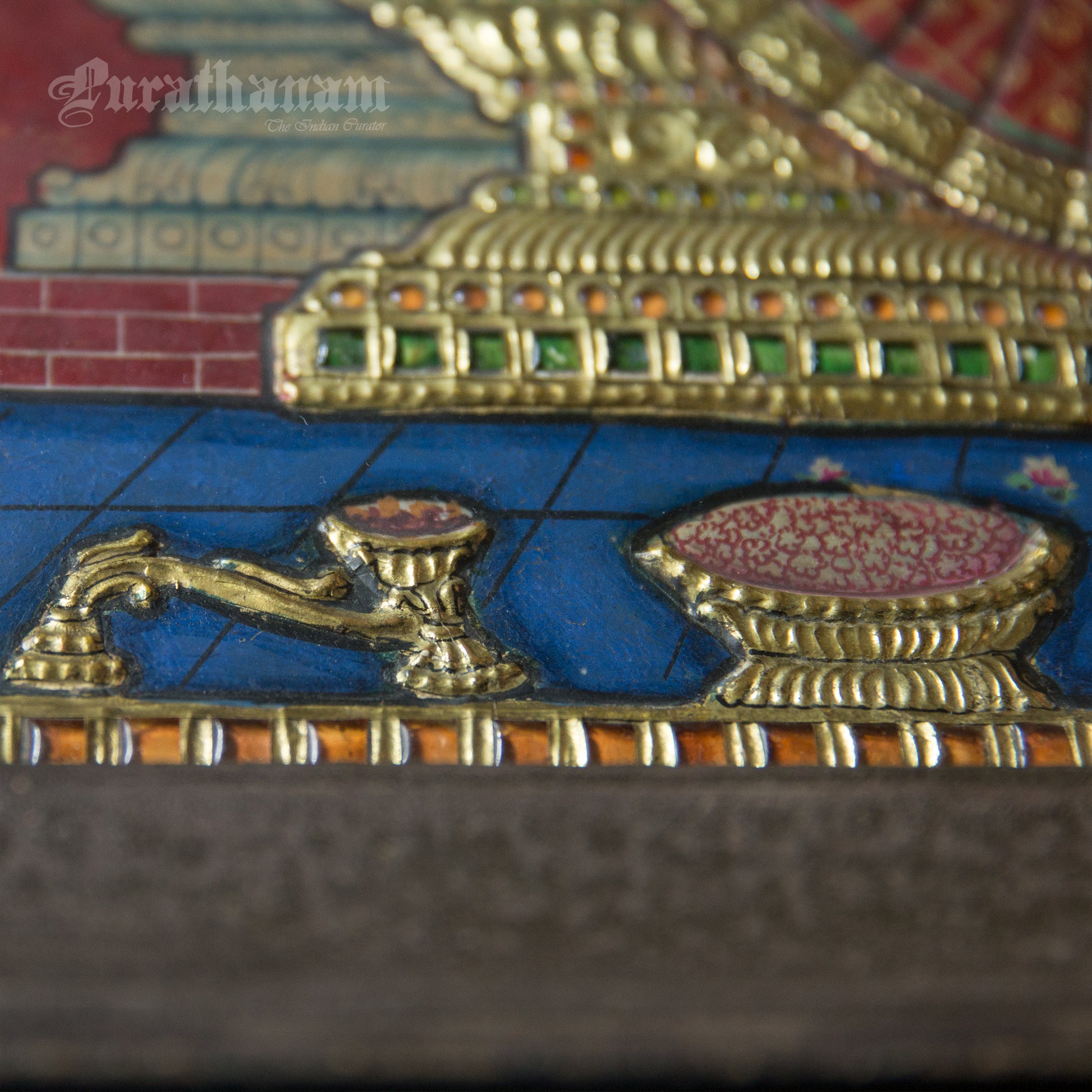 - No Gemstones Initially: There were no gemstones in Tanjore paintings during the Nayakkar period (Vijayanagar Dynasty). Artists used only real gold leaf. It was during the Maratha period that they started adding gems, emeralds, rubies, and other precious stones to enhance the beauty and grandeur of the paintings. Because of this, Tanjore paintings became very expensive and were meant only for rich and royal families back then.