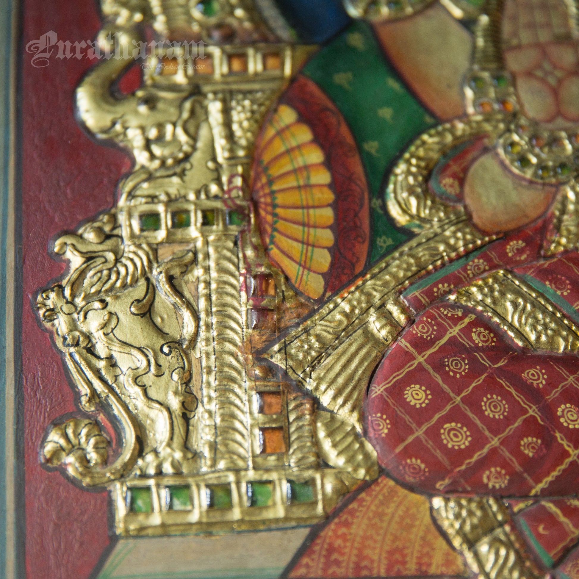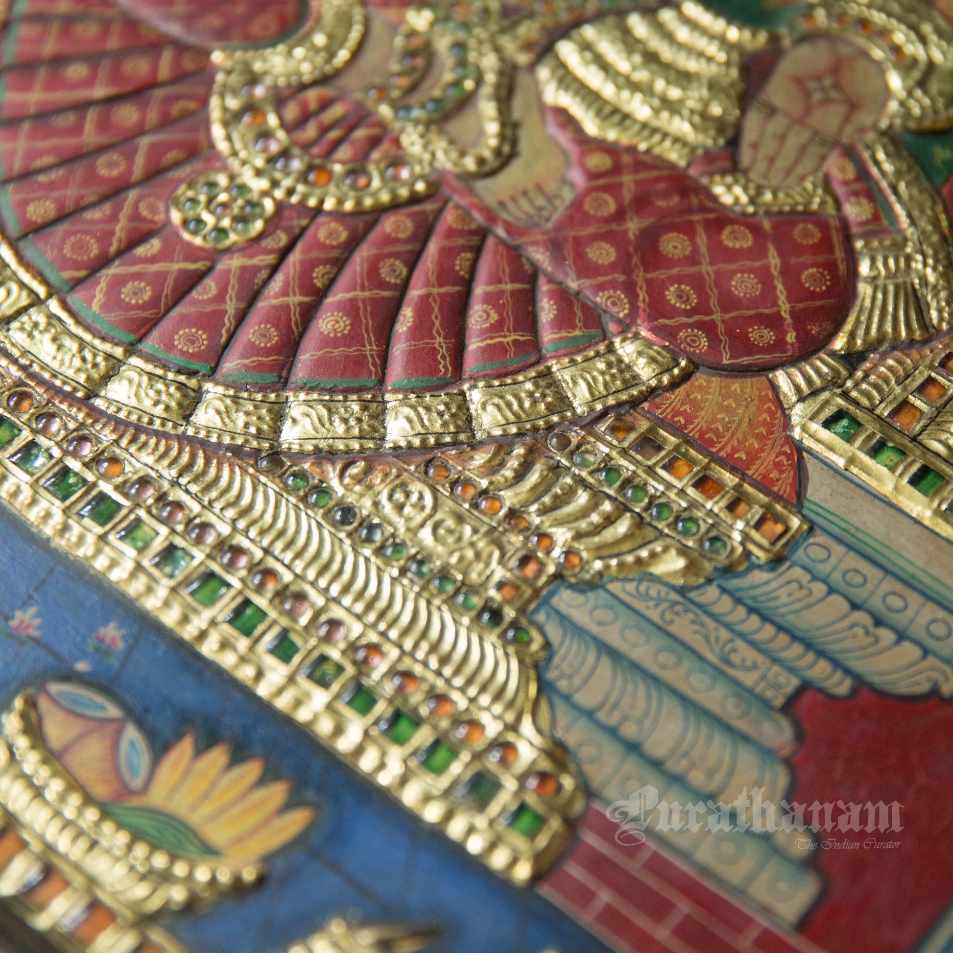 Tanjore Painting (or Tanjavur Painting), as the name suggests, comes from the city of Tanjavur in South India. This style of painting was introduced during the reign of King Raghunatha Nayakkar in the 16th century CE. Until the 13th century, Tanjore was ruled by the Chozhas (Cholas), after which it was captured by the Nayakars of the Vijayanagara Empire. The Tamil region was then divided into three Nayakships — Madurai, Tanjore, and Gingee.
